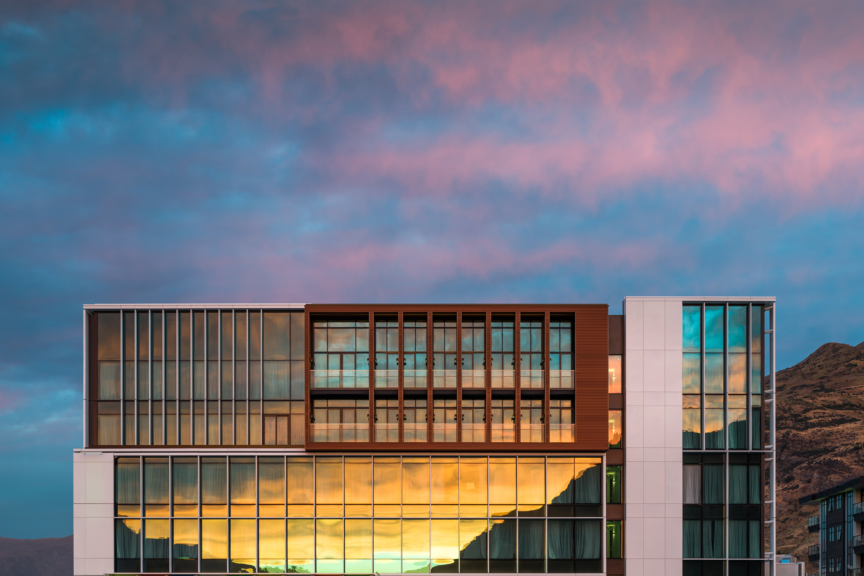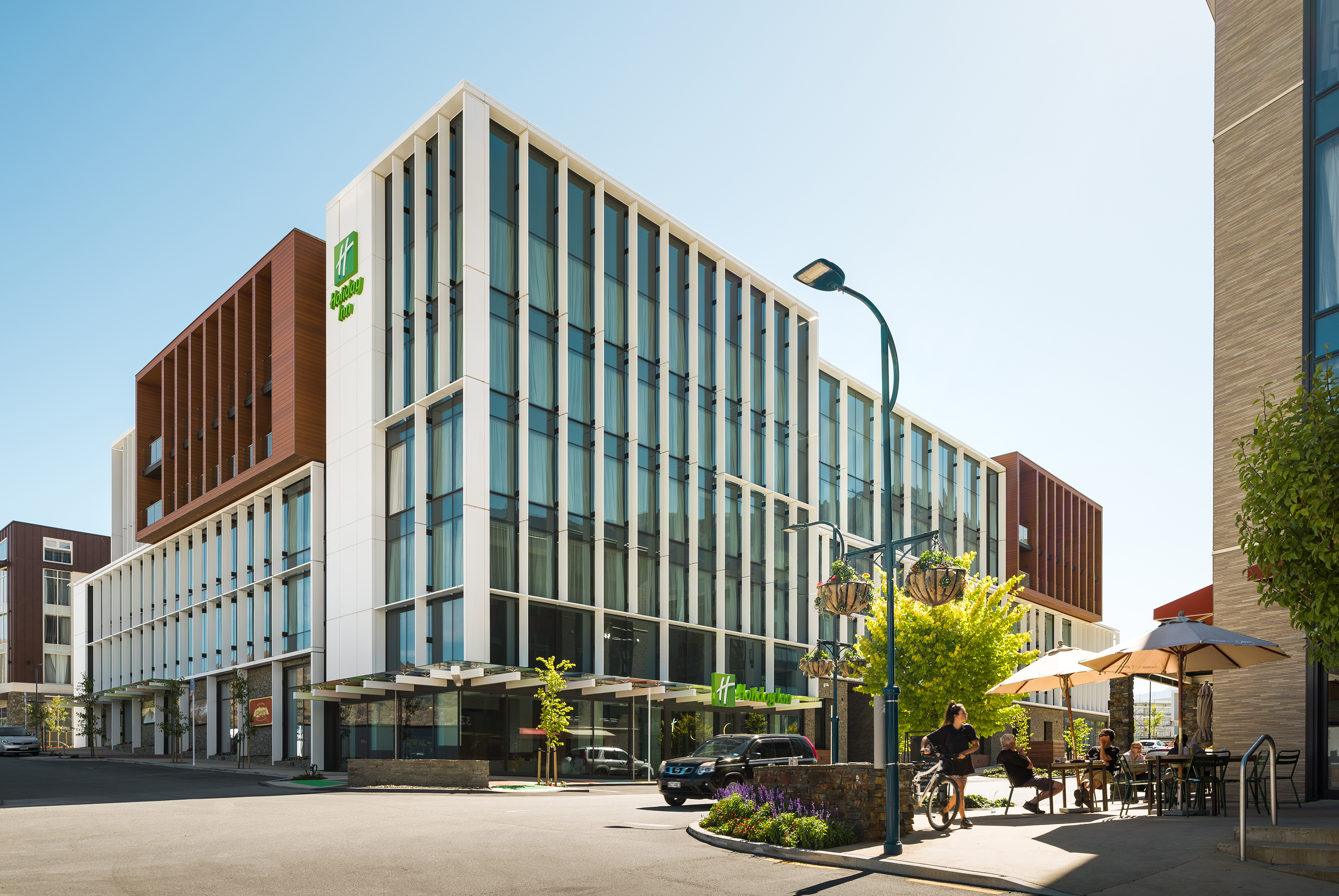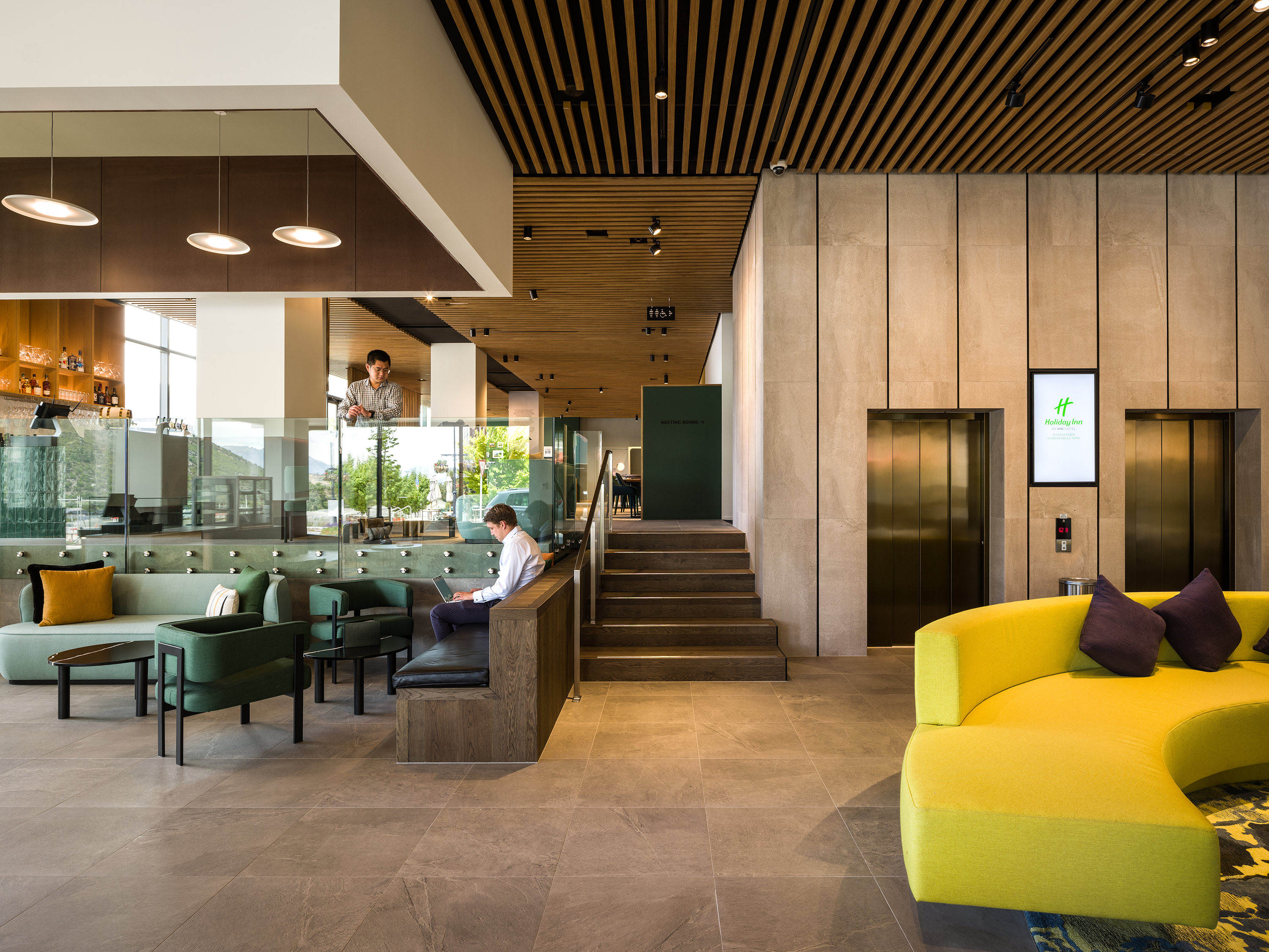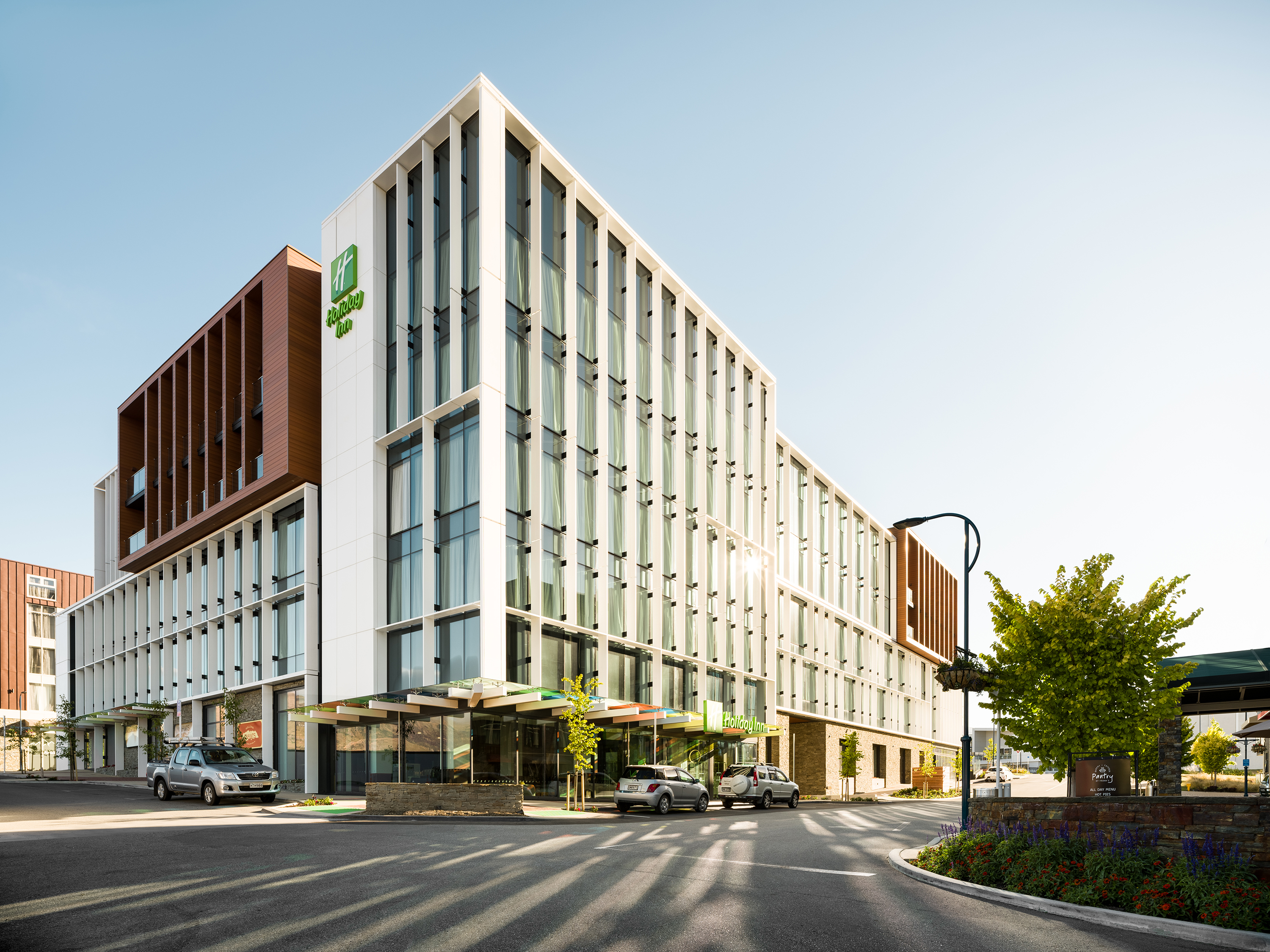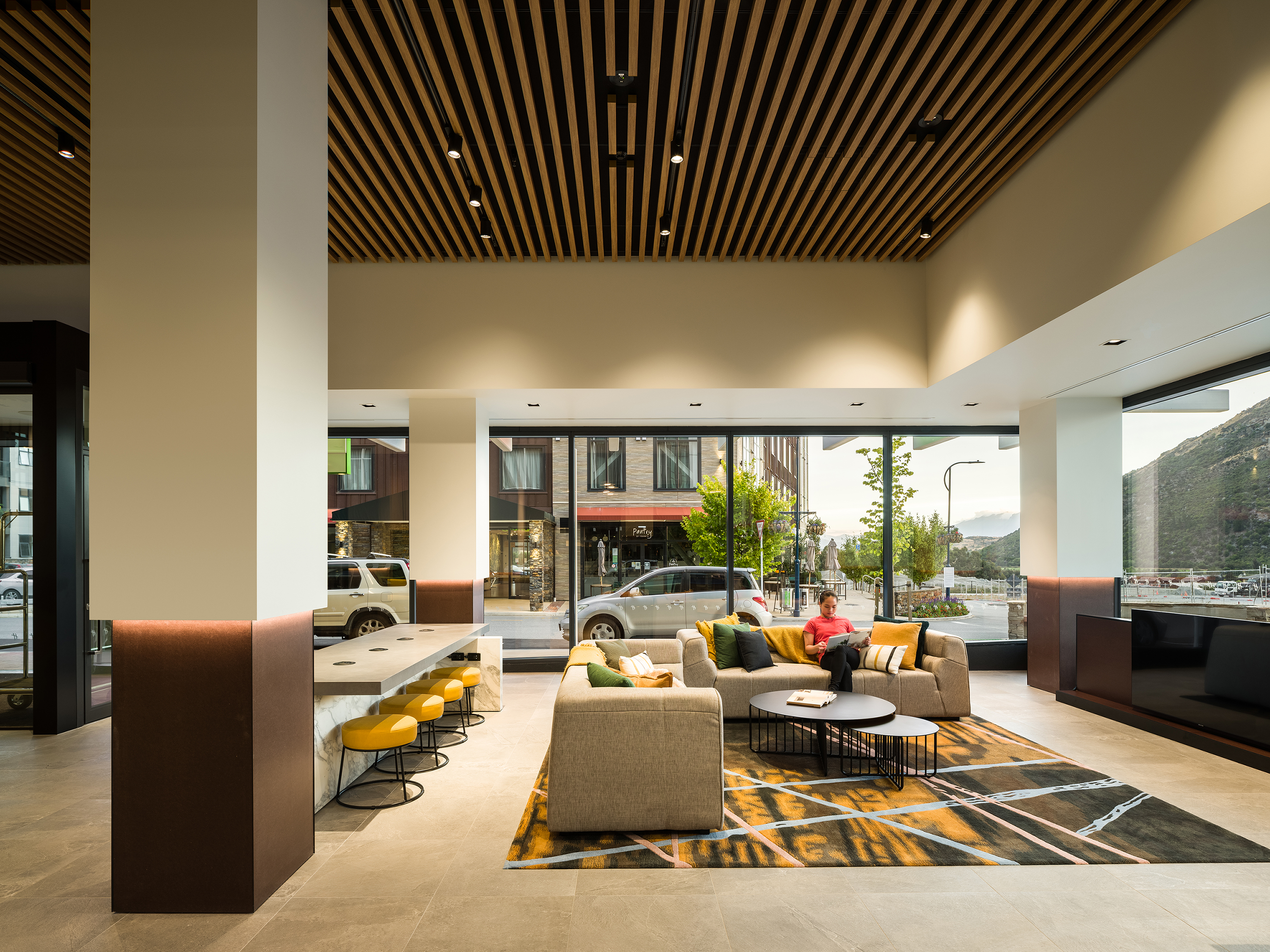 An exercise in considered planning, the architects have created multi-use spaces in this Frankton hotel that are comfortable and inviting in scale. The move to activate the lobby by providing public street access to the bar and restaurant gives the hotel a vibrant atmosphere. This is accentuated by residential-style, cohesive interior design, with pops of bold colour derived from the surrounding landscape, and an exterior façade that is crisp and respectful of the mountains beyond.