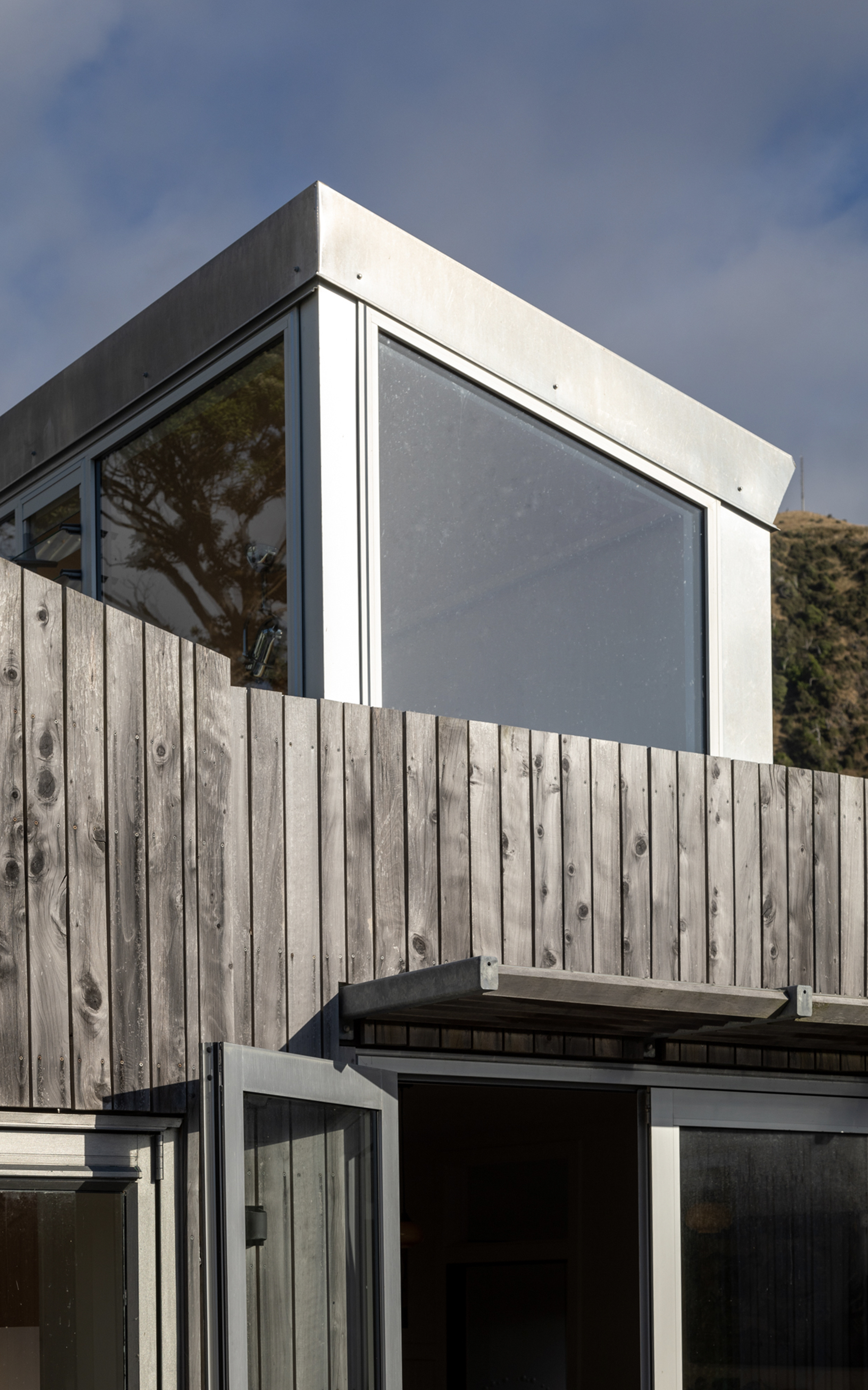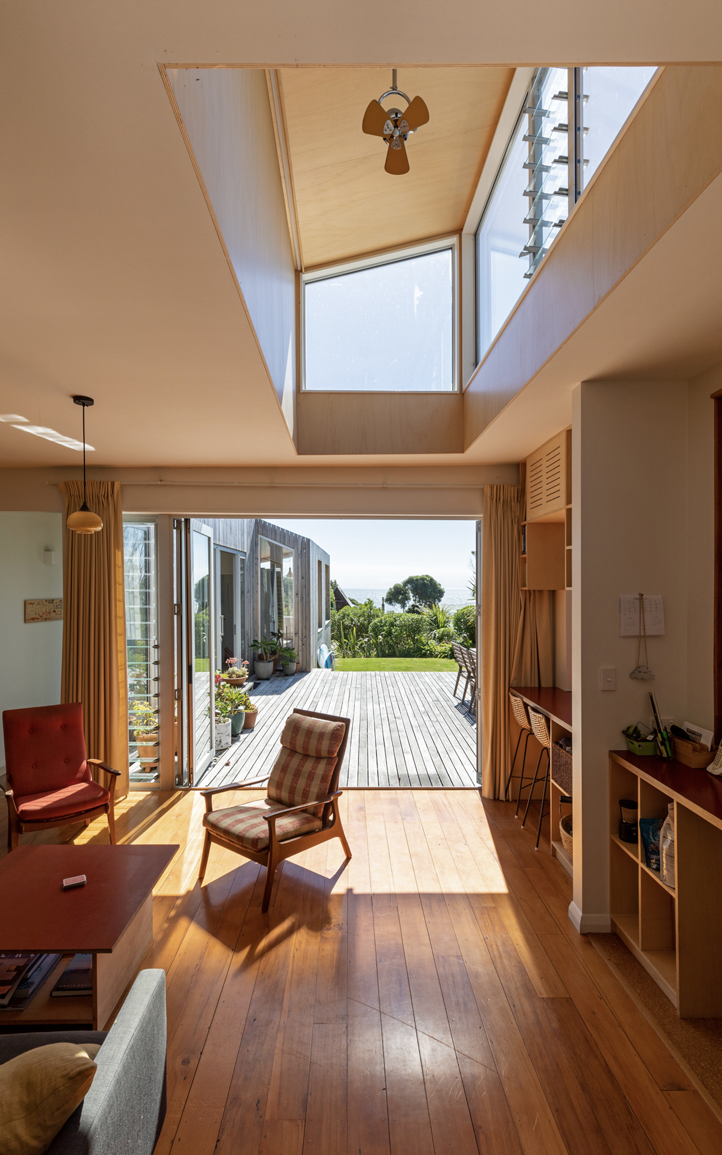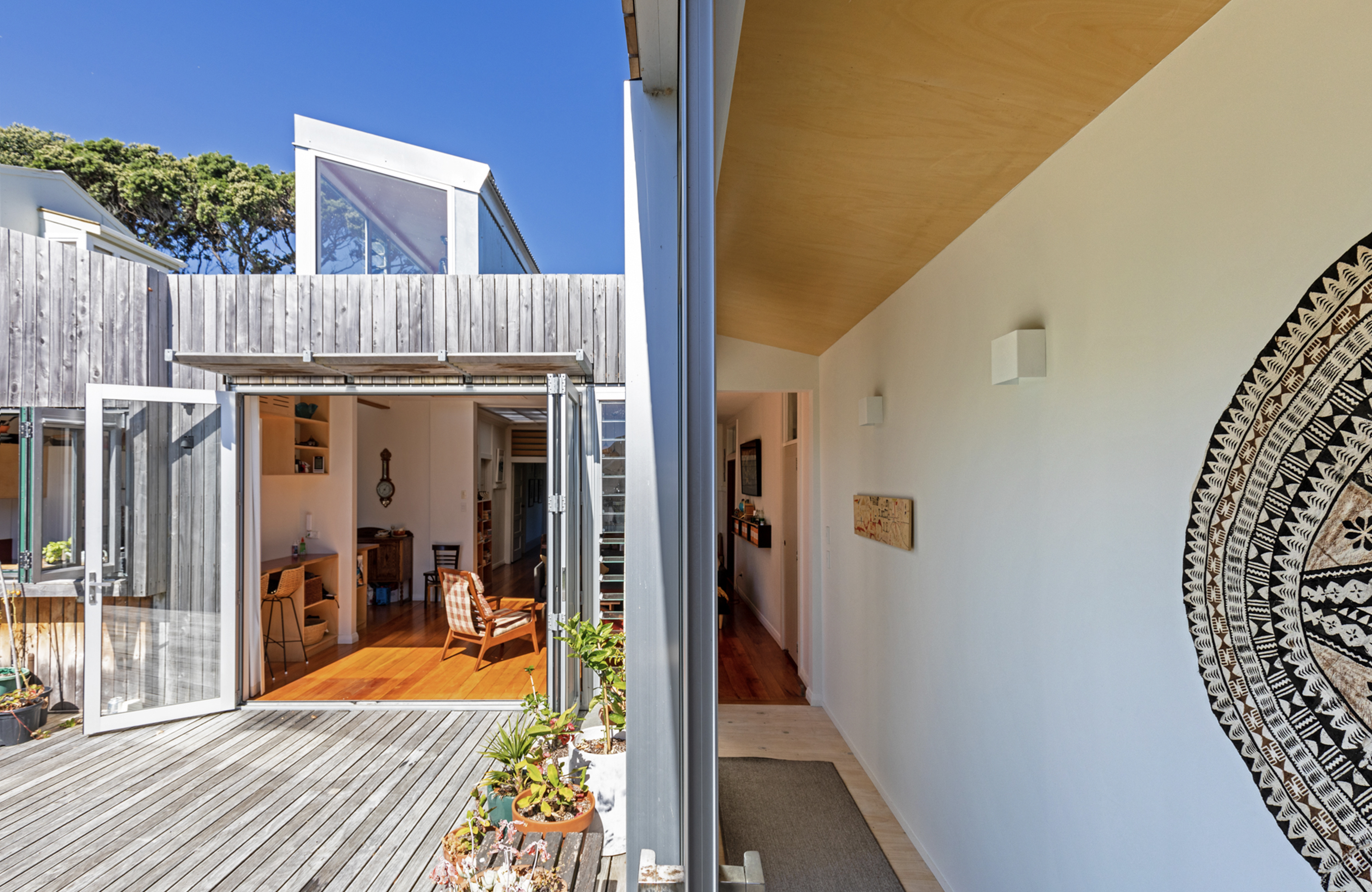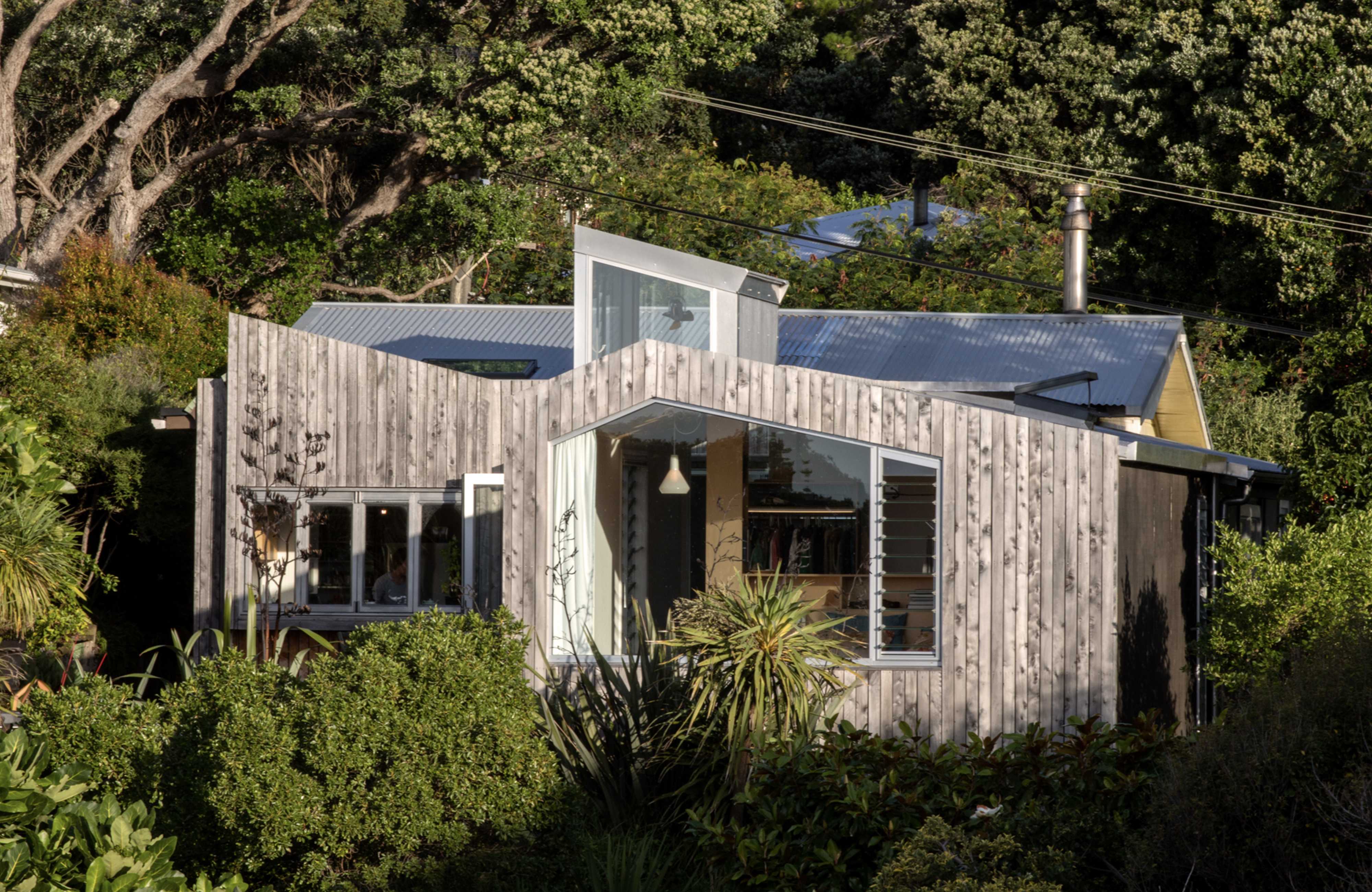 This house is a display of architectural experimentation that rejuvenates the original house to suit modern family life. The west extension elevates the main bedroom as the benefactor of sunset and sea views. The choice of macrocarpa as the rain screen to the garden extension contrasts nicely with the painted street-front formality of the house. The addition of the pop-up clerestory to the rear living room adds much-needed sunlight and height, guiding the eye sea-ward. Extensive glazing to the hall adjacent to the deck transforms this into a light-filled gallery space. The changes have transformed this traditional light-starved bungalow into a bright, modern family home at one in its natural setting.