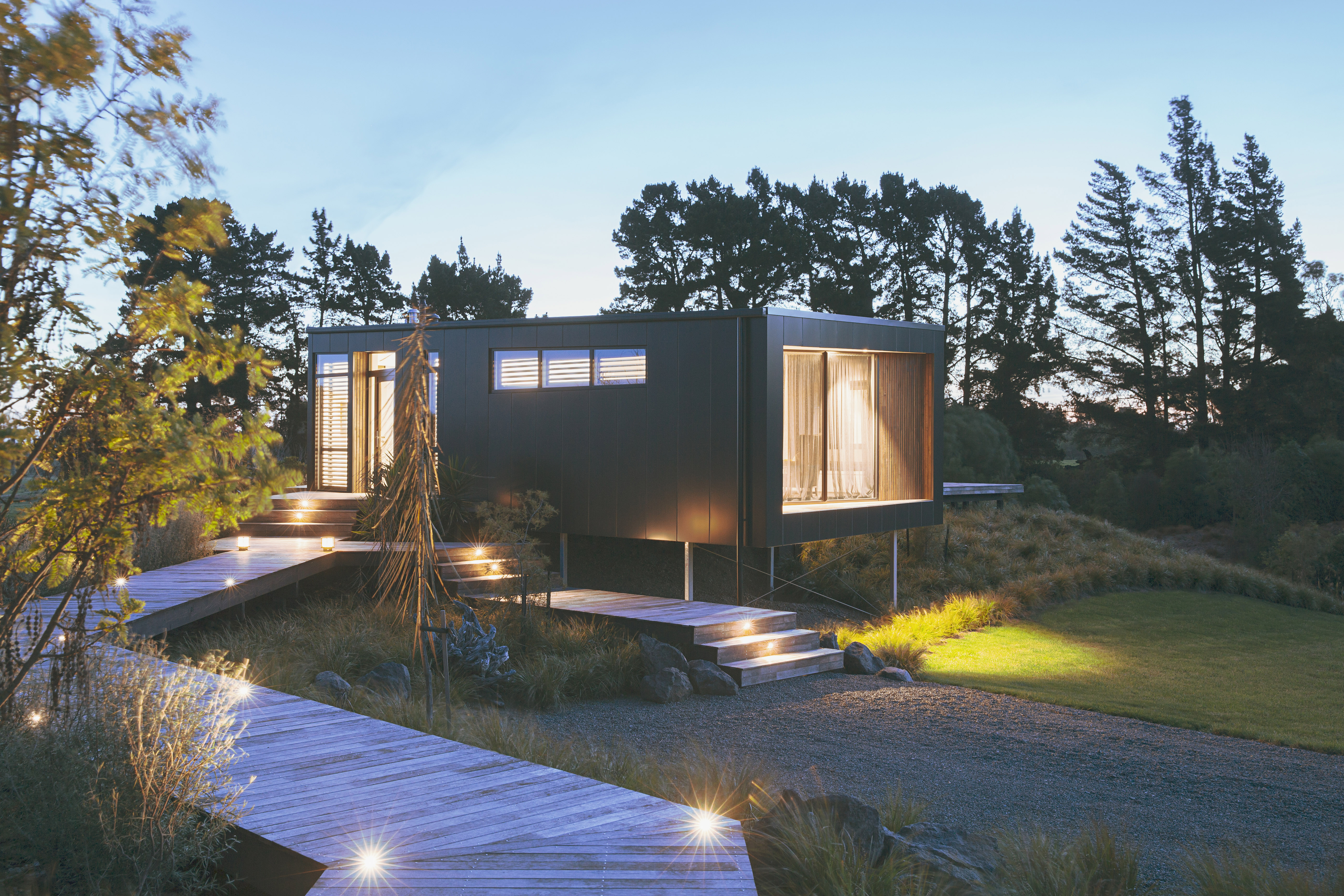 Confidently positioned on the crest of an undulating landscape, this dwelling snakes along its underlying topography. The built form results in a play between mass and transparency, lightly touching the site at the upper level and hunkering in at the lower to create a clear connection to view, landscape and gully. Multiple outdoor living areas are provided by the simple plan, forming shelter from prevailing exposures, while a gentle crank in roof form allows this dwelling to sit unobtrusively within its wider setting. Despite use of prefabricated and modular construction elements, this building feels anything but off-the-shelf. A simple, well-considered architectural response that provides a new model for living more sympathetically within our grand landscapes.