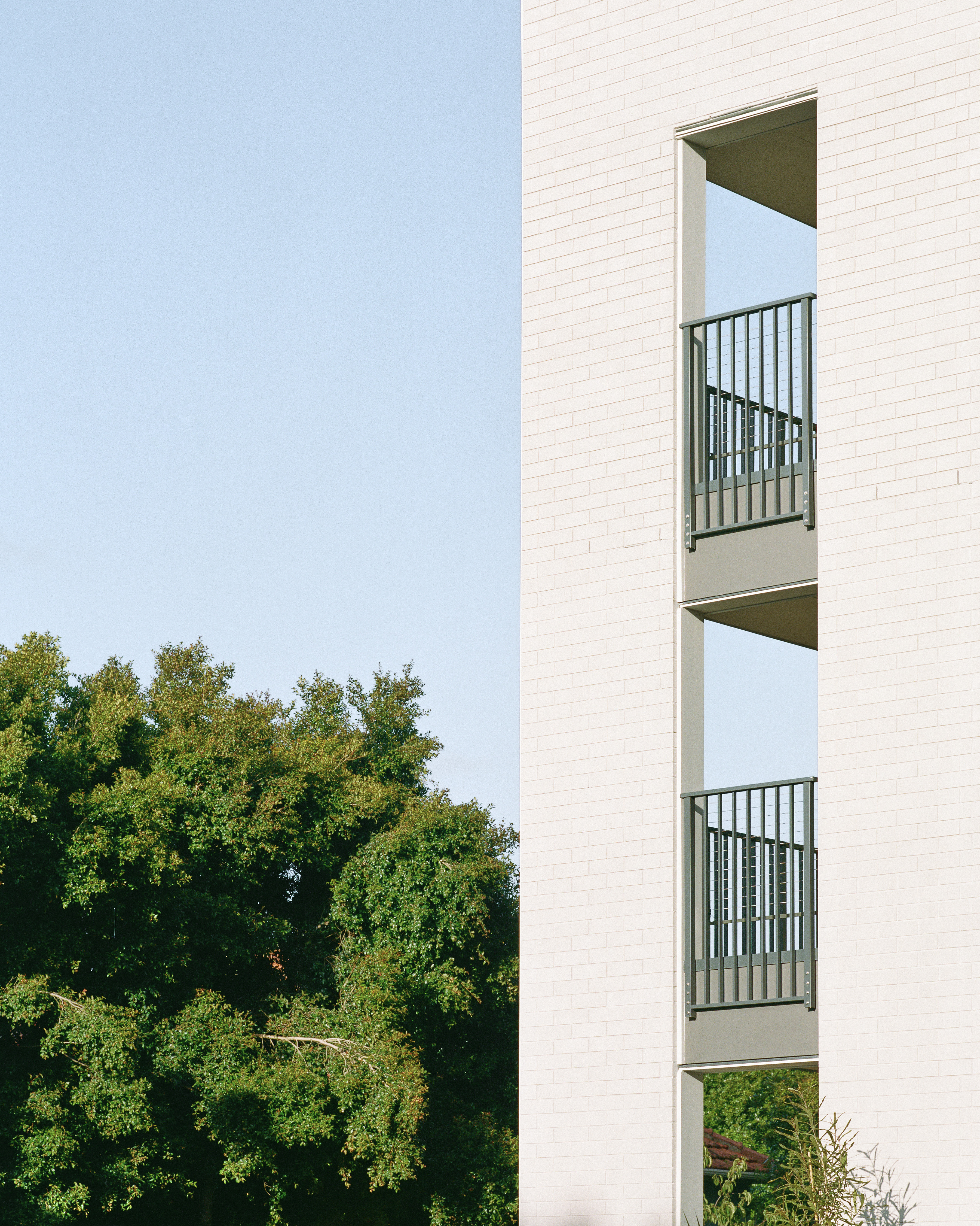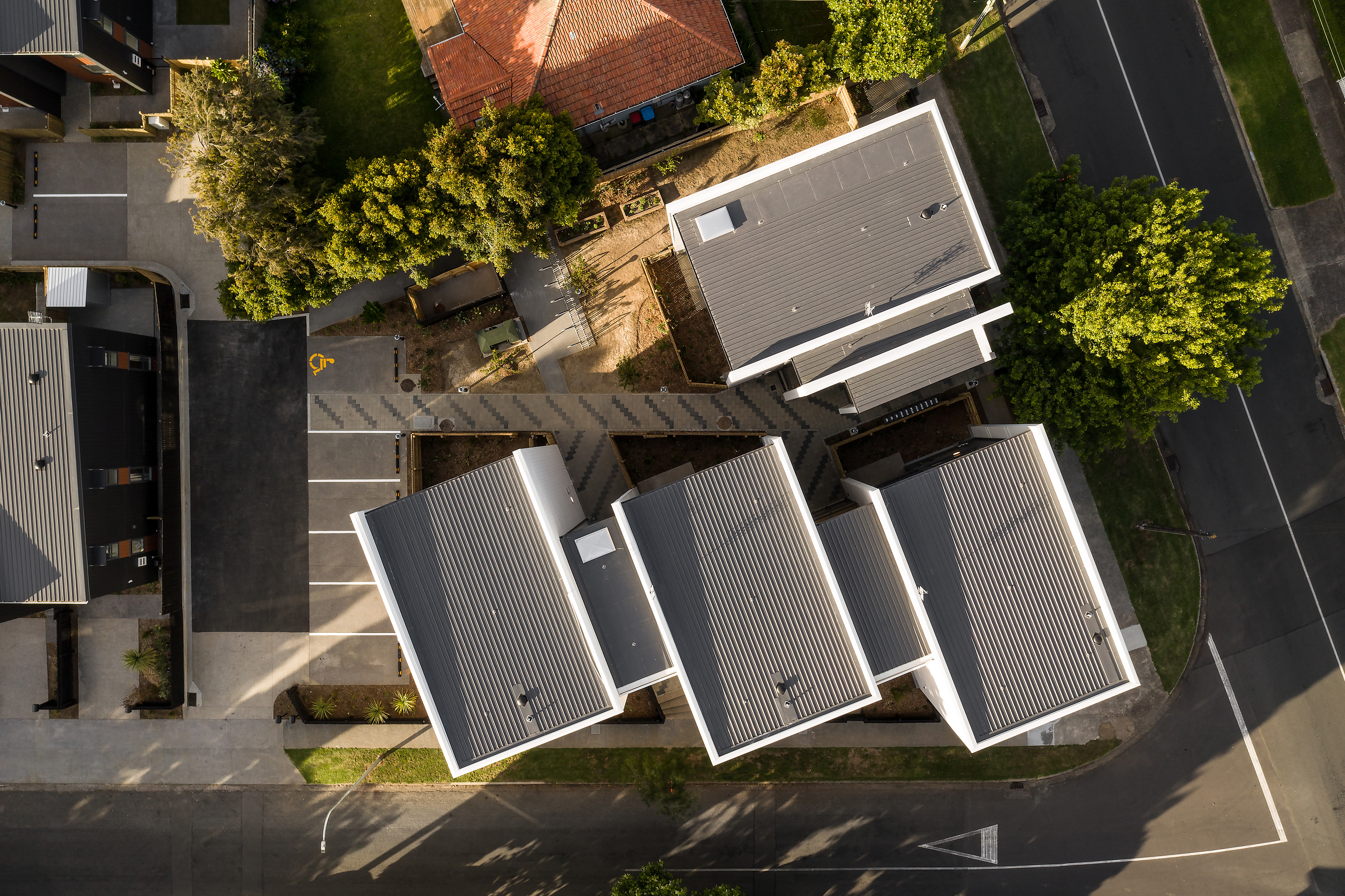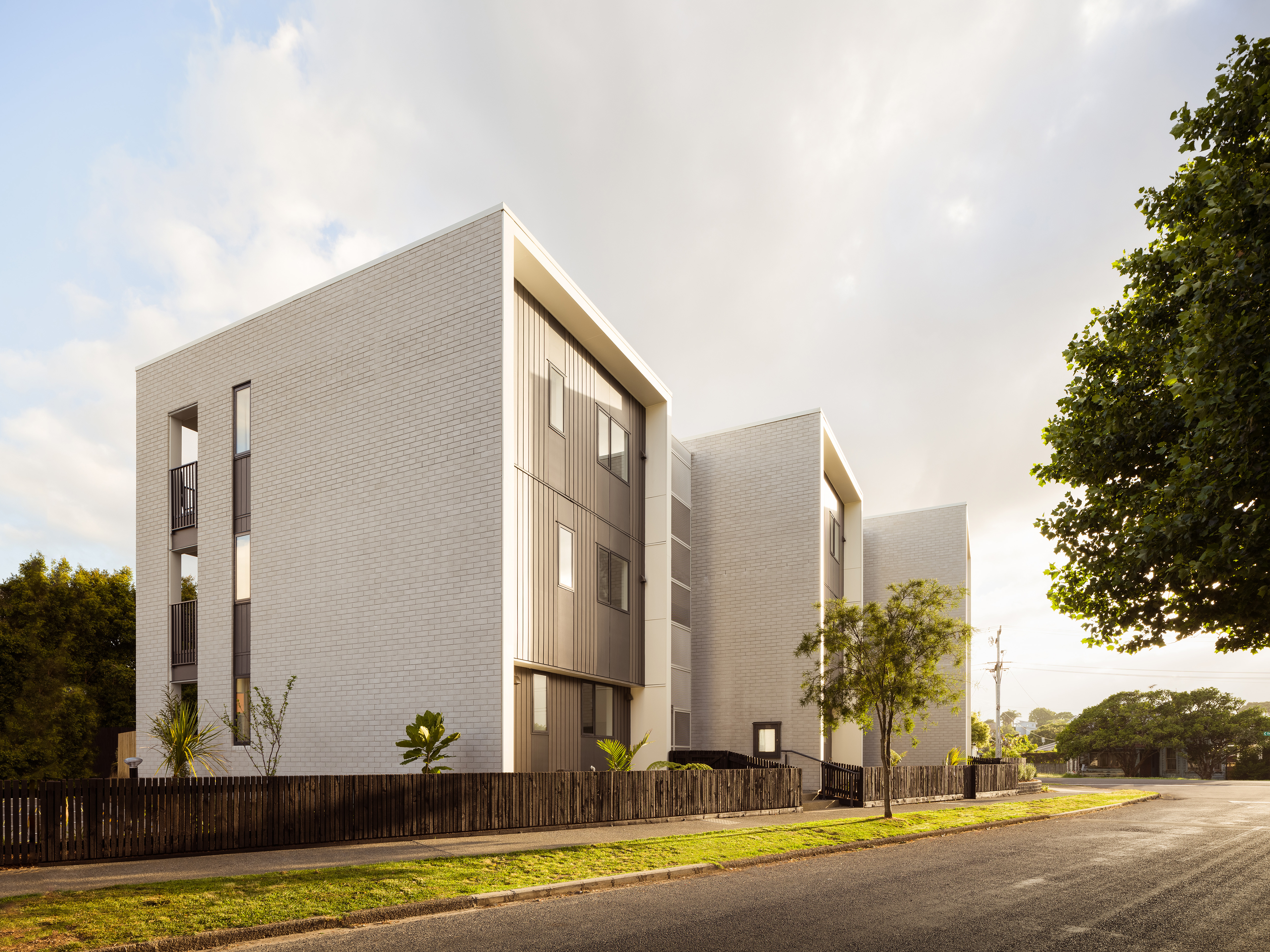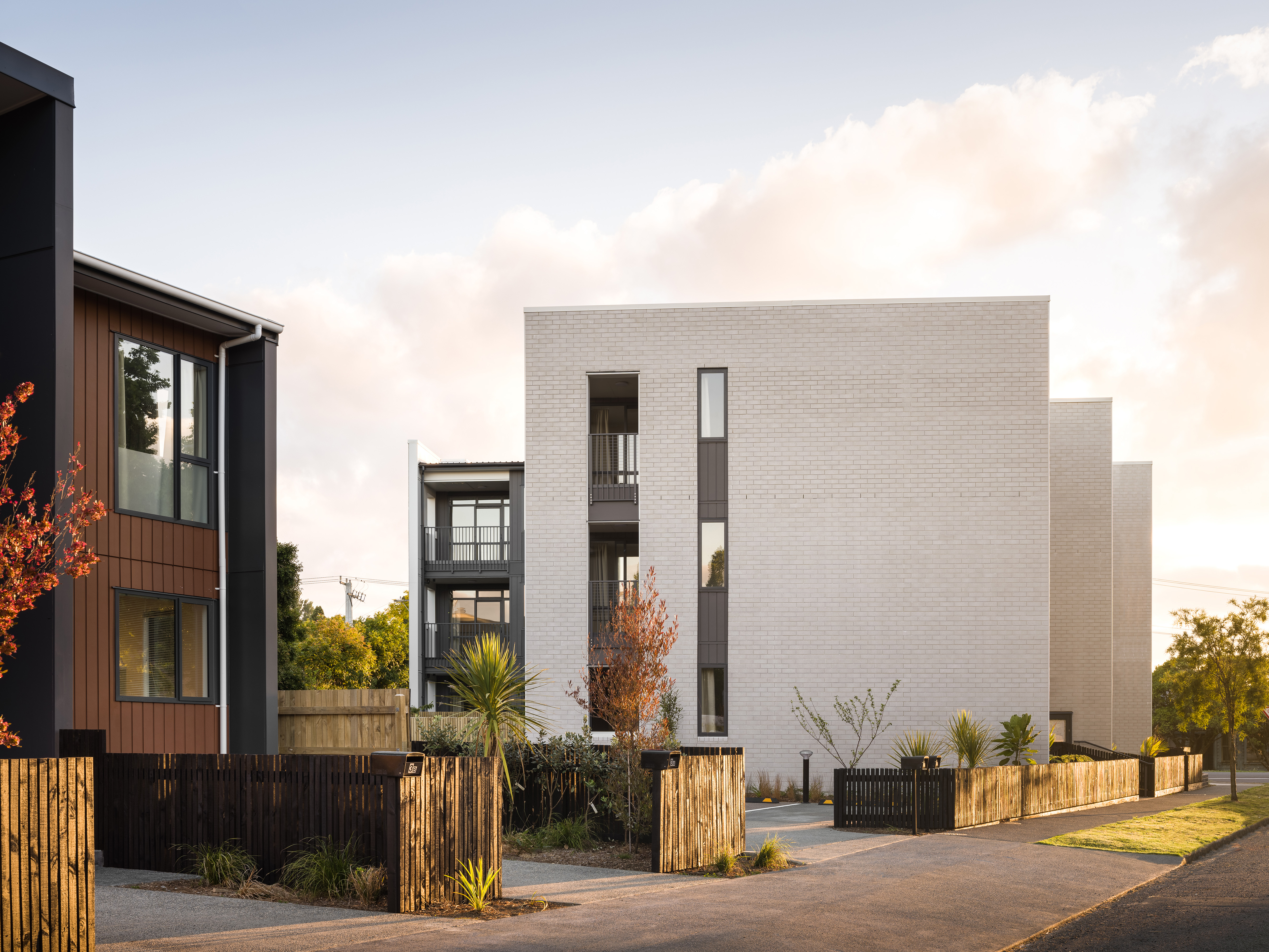 This Kāinga Ora housing development is well positioned and holds the corner of a busy road with confidence. The buildings are arranged around a northern landscape aspect overlooked by sunny decks. By staggering the buildings, the architect has skilfully created visual interest and broken down the mass of the development within its low-density context. A cleverly restrained material palette will stand the test of time with brick offering a familiar materiality and sense of quality. A finer and more contemporary mesh detail adds interest to circulation cores. This project demonstrates the importance of good design and material choices when offering high-quality design to multi-unit developments.