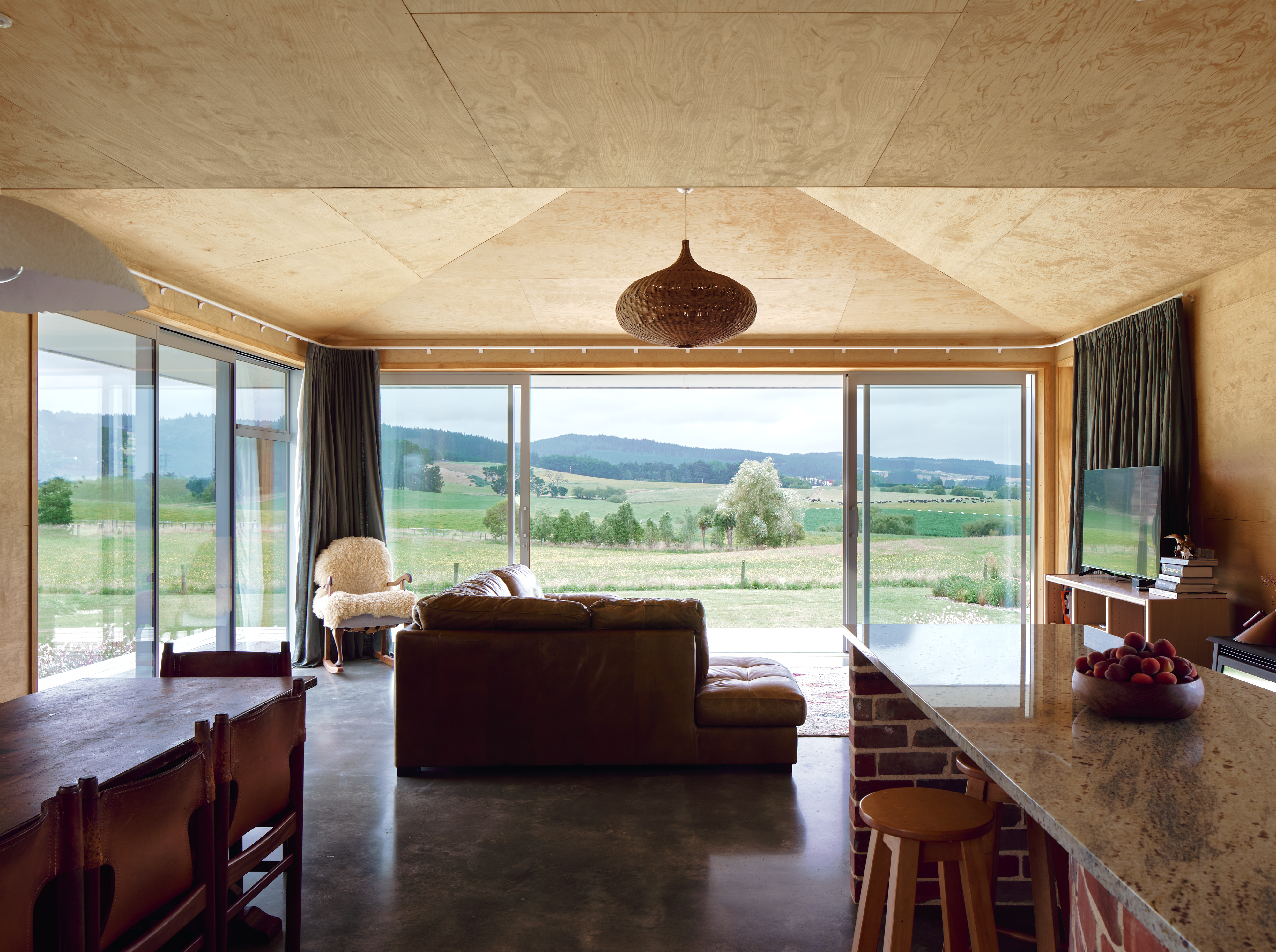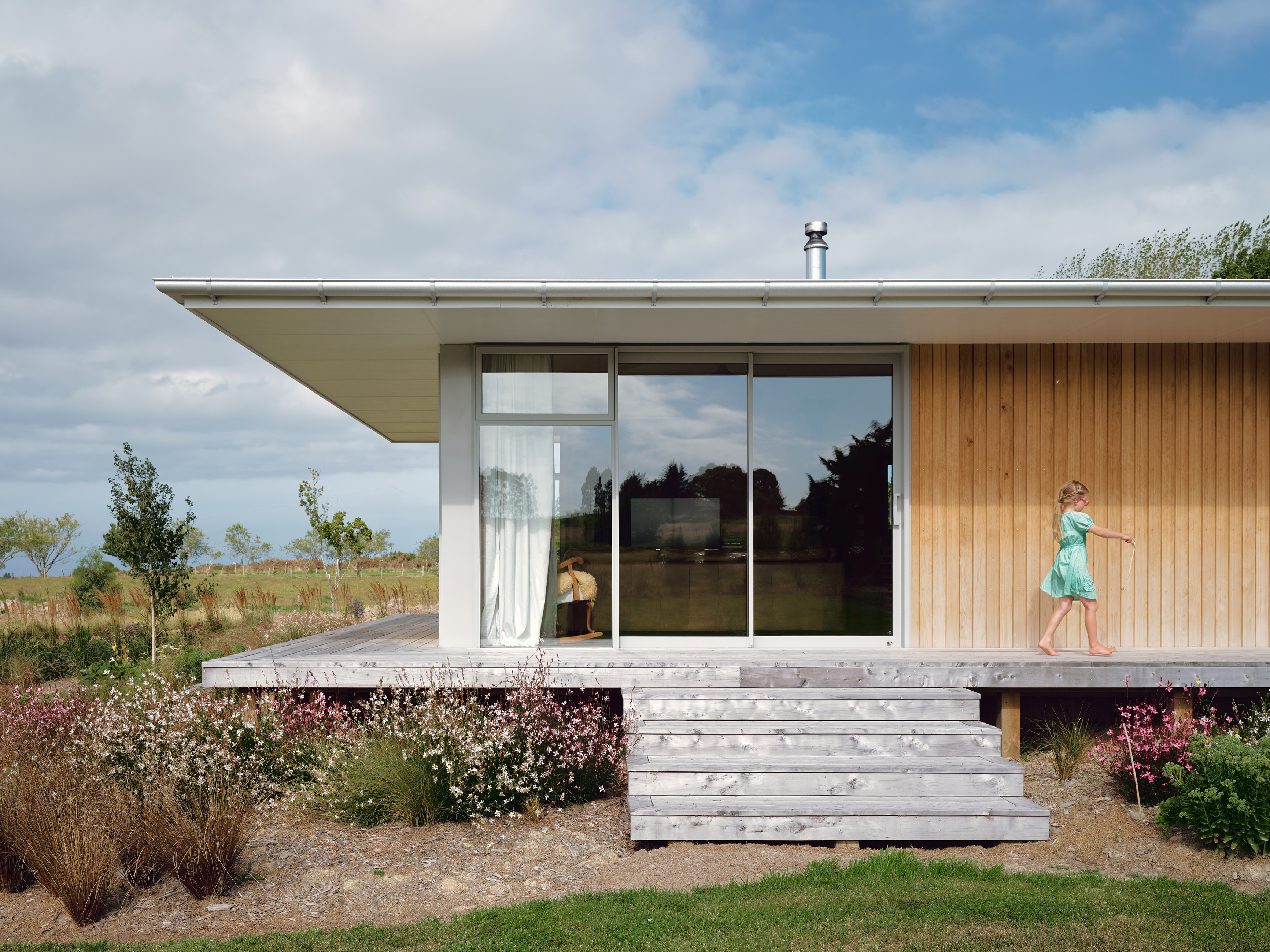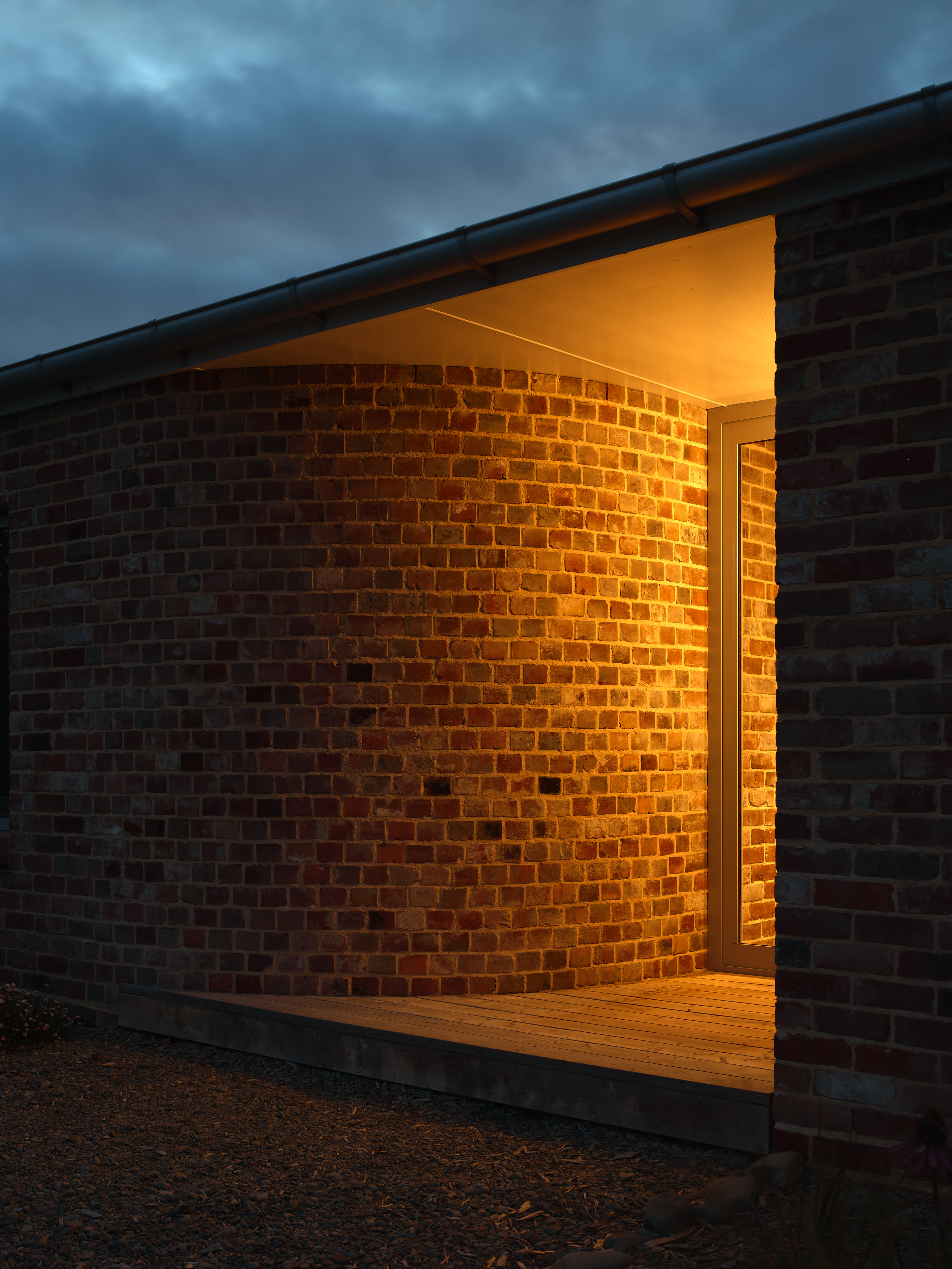 A modern home for a young farming family on a budget, Kapua Farm House was created though a collaborative effort of family and friends. Embracing passive design principles, the design is anchored by a recycled brick bedroom wing at the rear of the site. A curved brick entry opens up to a warm, birch ply kitchen and living area projecting out to views of the landscape under a low-slung zinc roof. Interiors are whimsical and personal. Local macrocarpa decking wraps the home, offering multiple outdoor zones that respond to the conditions. This home speaks clearly to its natural environment in the North Canterbury landscape.