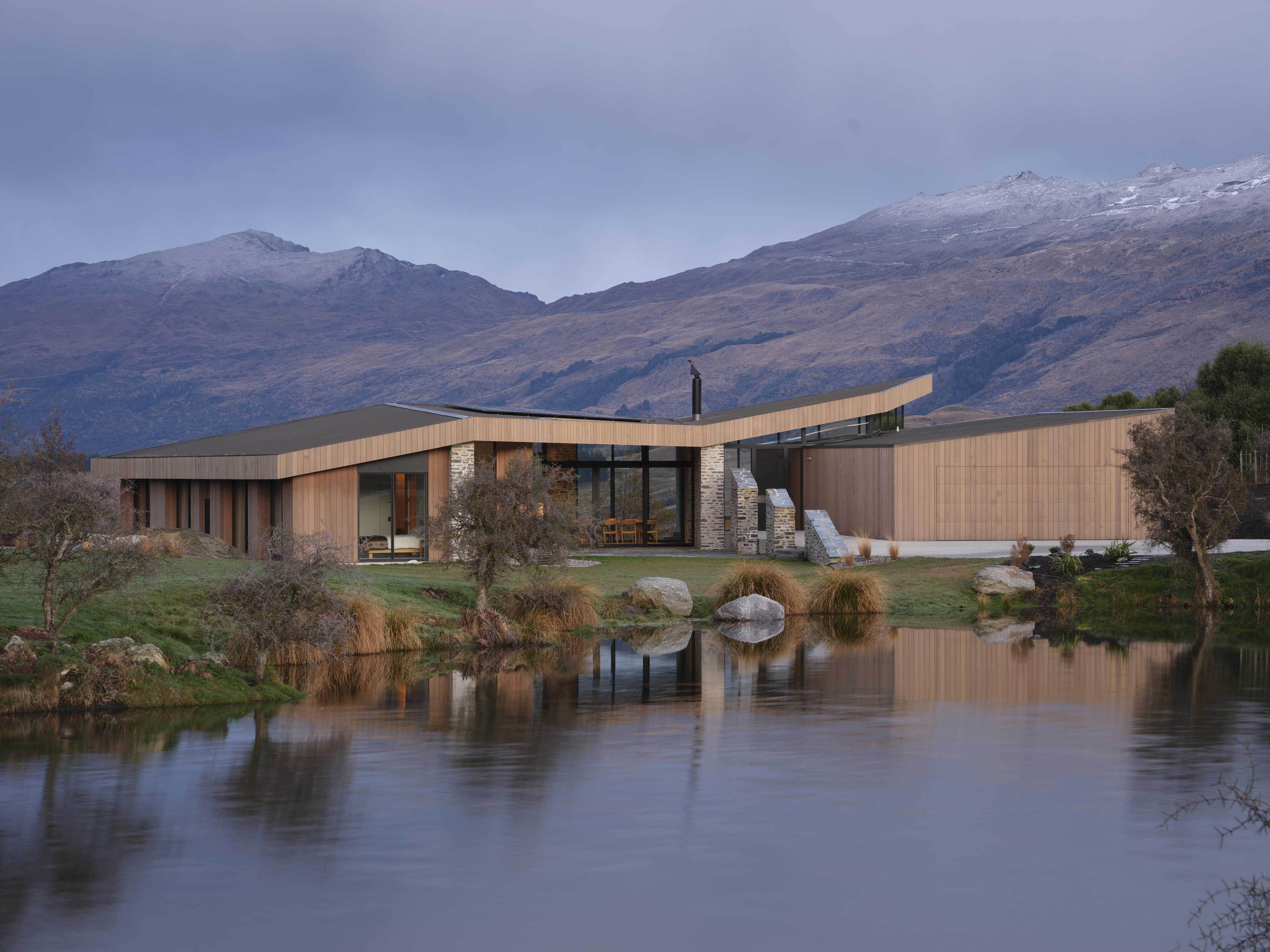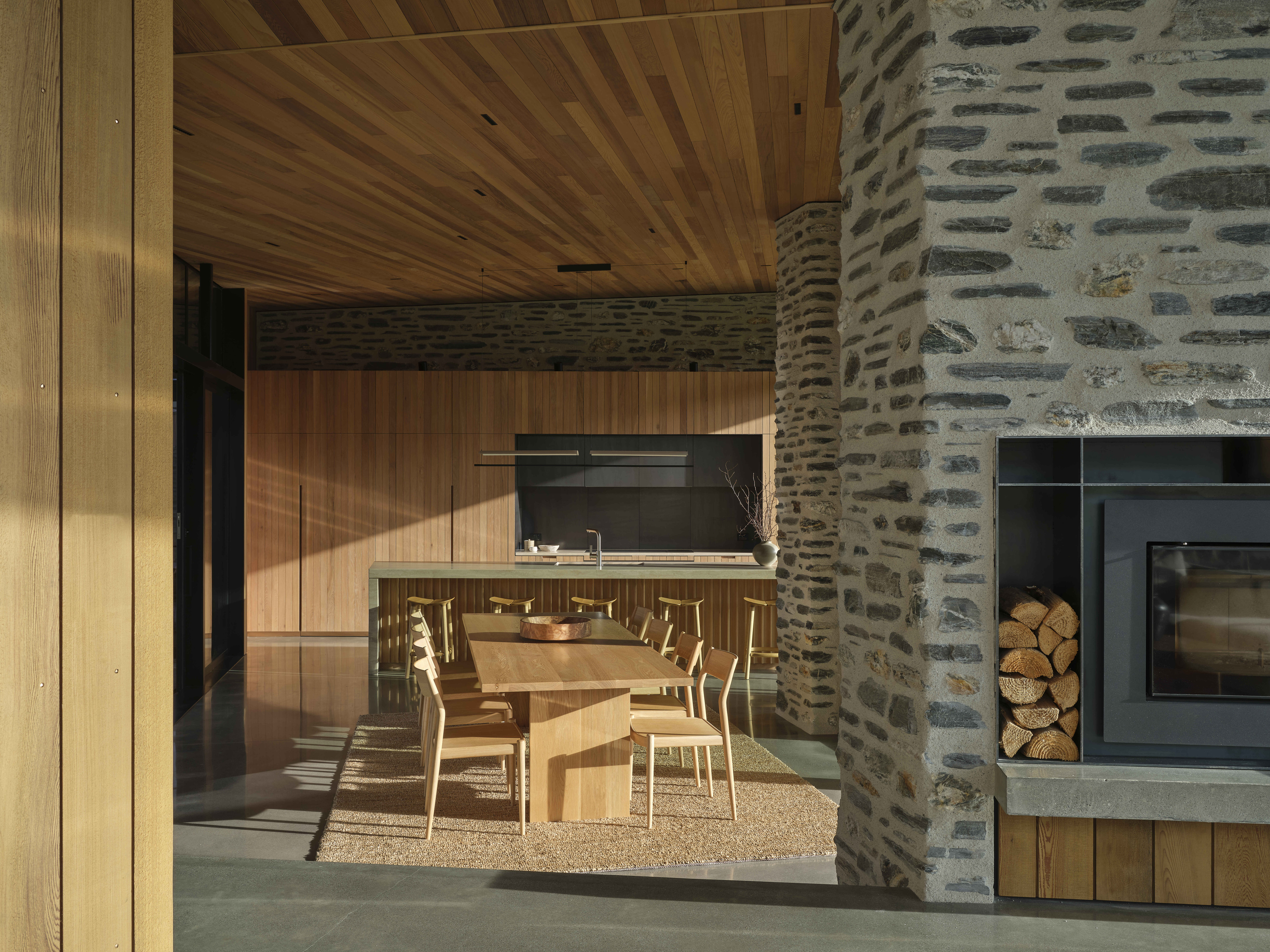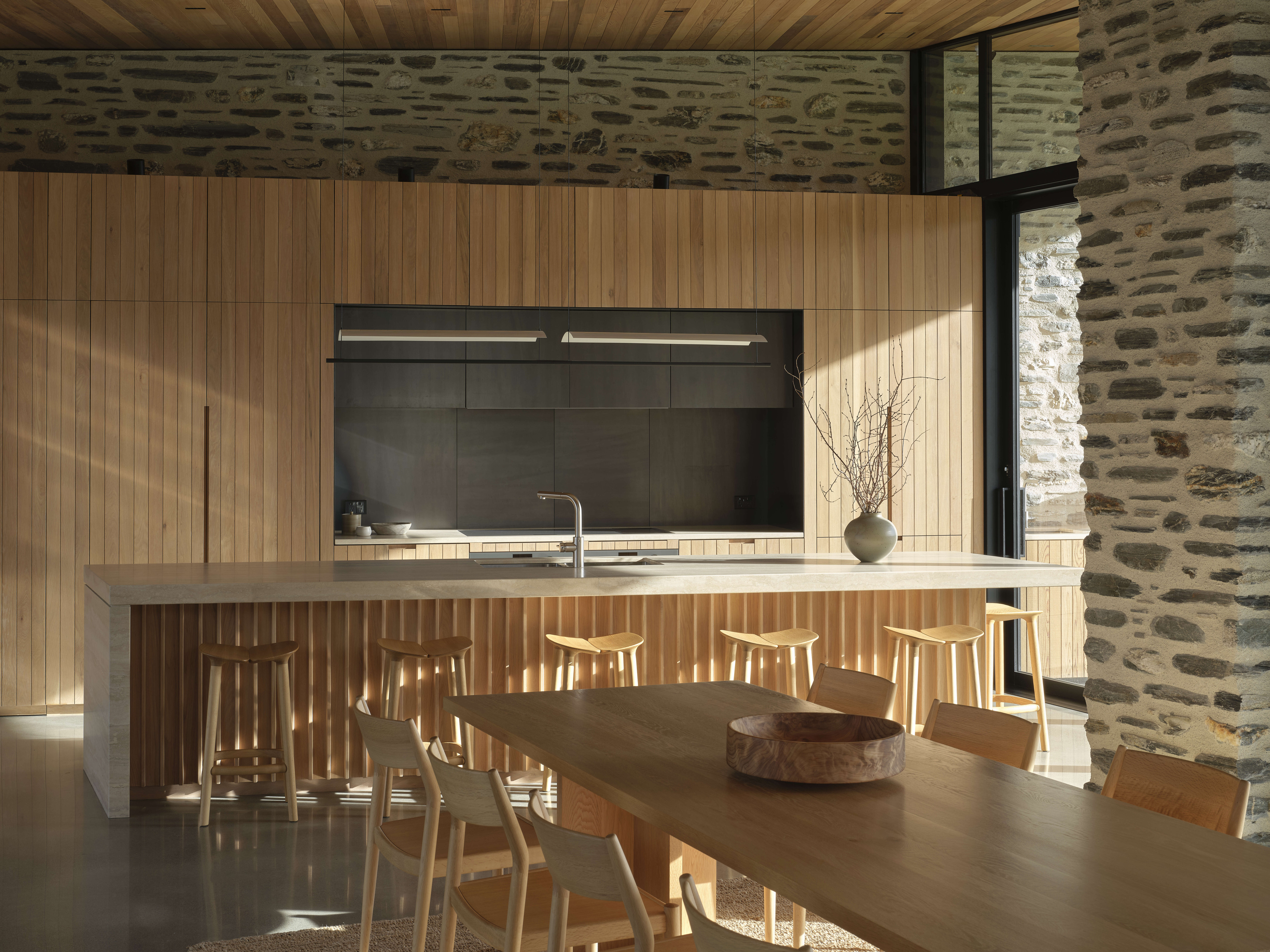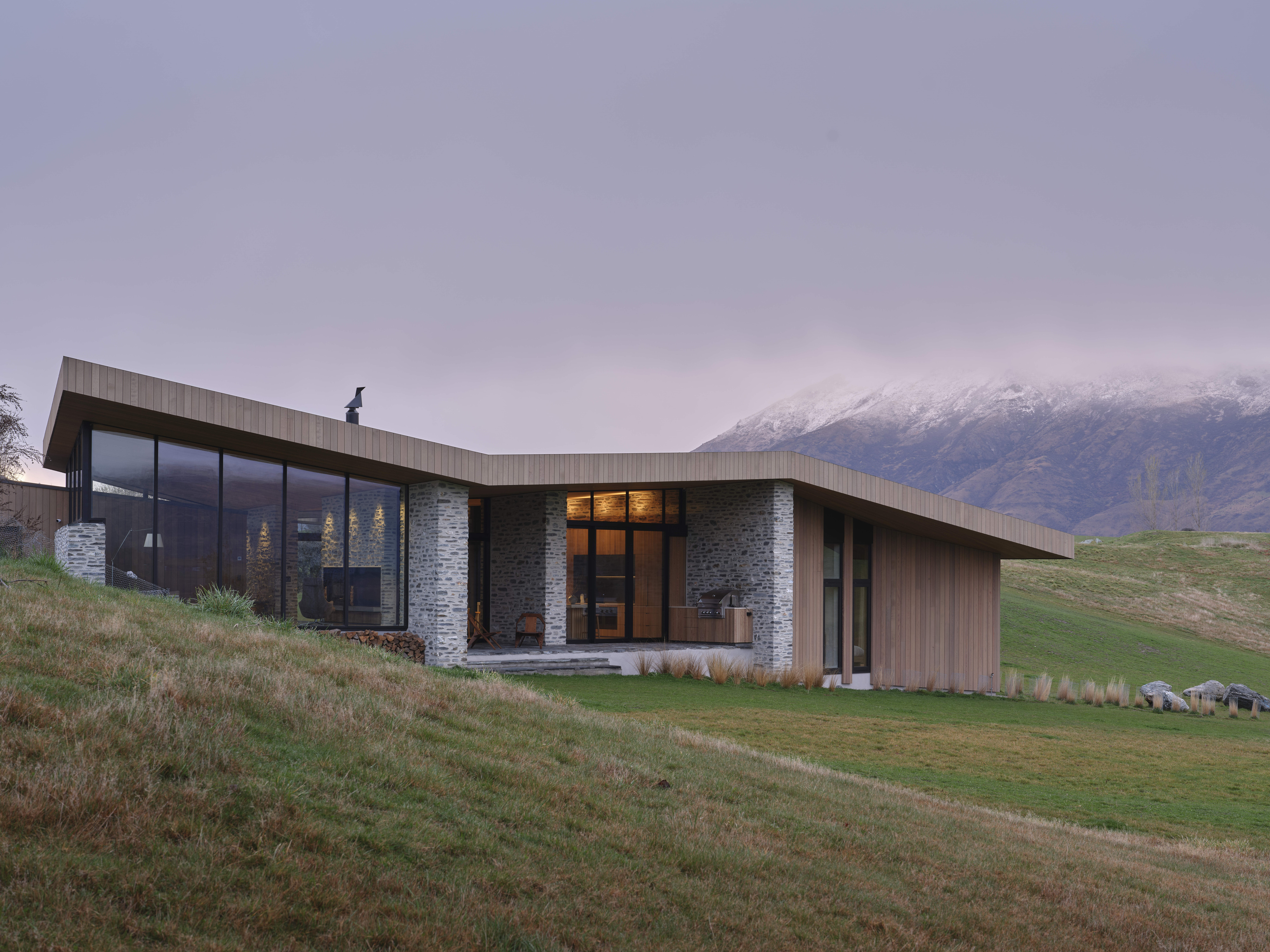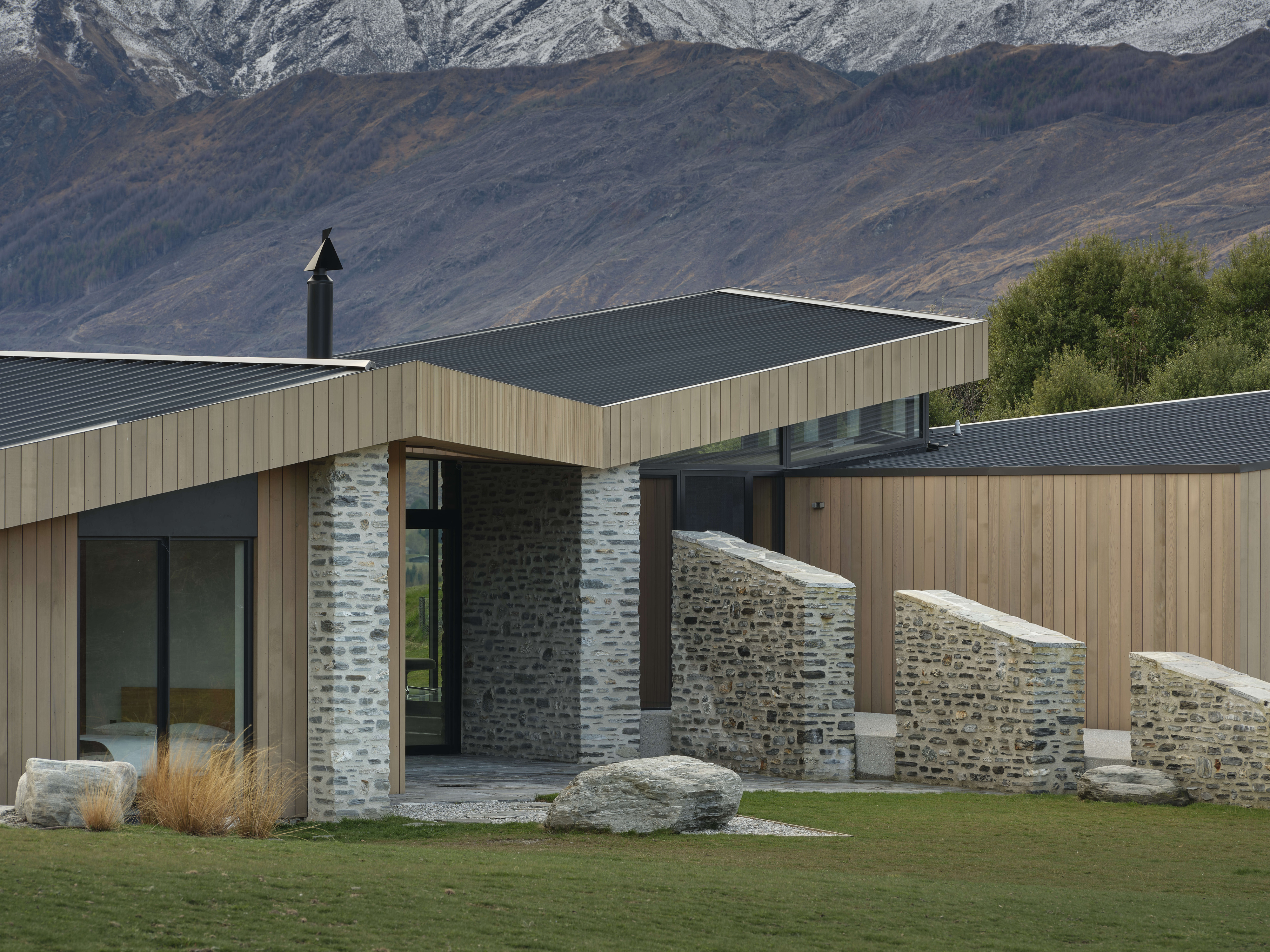 Kārearea House manipulates linear plan and form to create a dynamic architectural expression. Interior spaces are refined and sophisticated, the overall form creating intriguing variations in the volume of interior spaces. Extended stone walls strengthen the visual connection between enclosed space and the wider landscape. A minimal aesthetic elevates the restrained palette of natural materials, the masonry a refreshing combination of local schist and river stone. Detailing and joinery throughout the home has been thoughtfully detailed and expertly crafted.