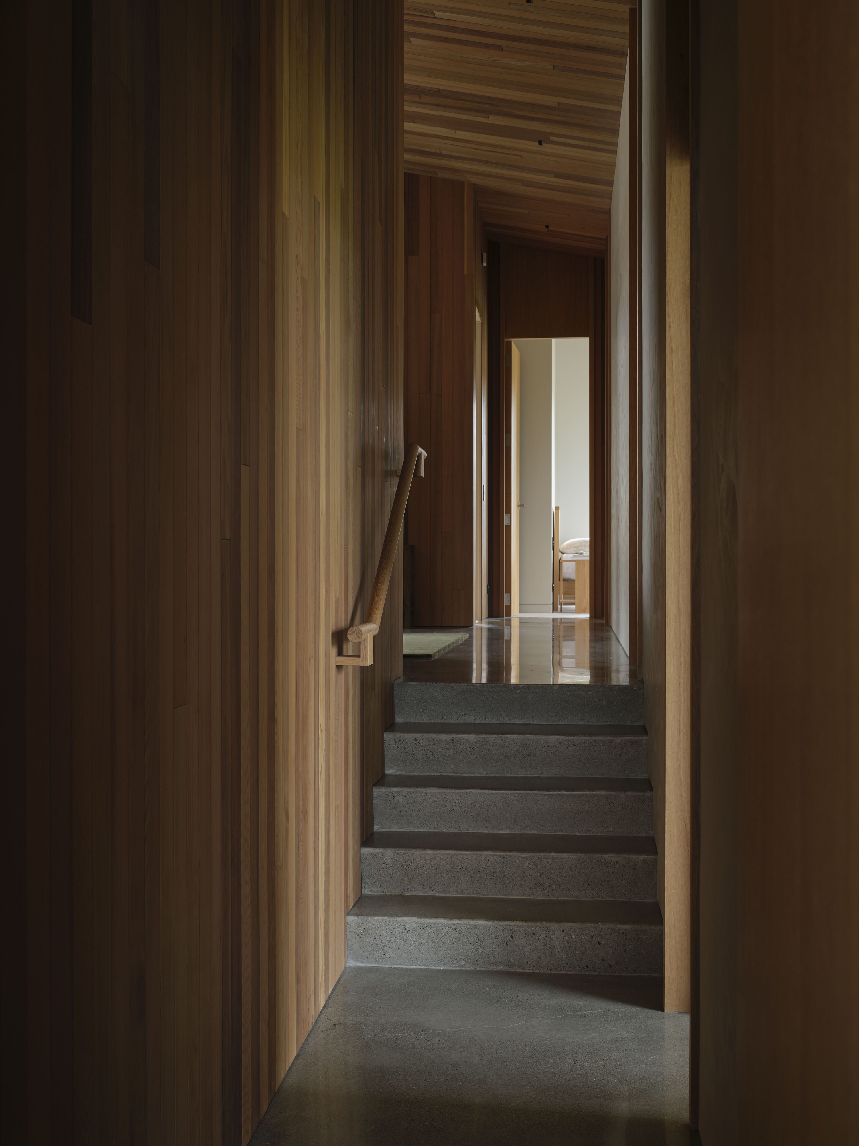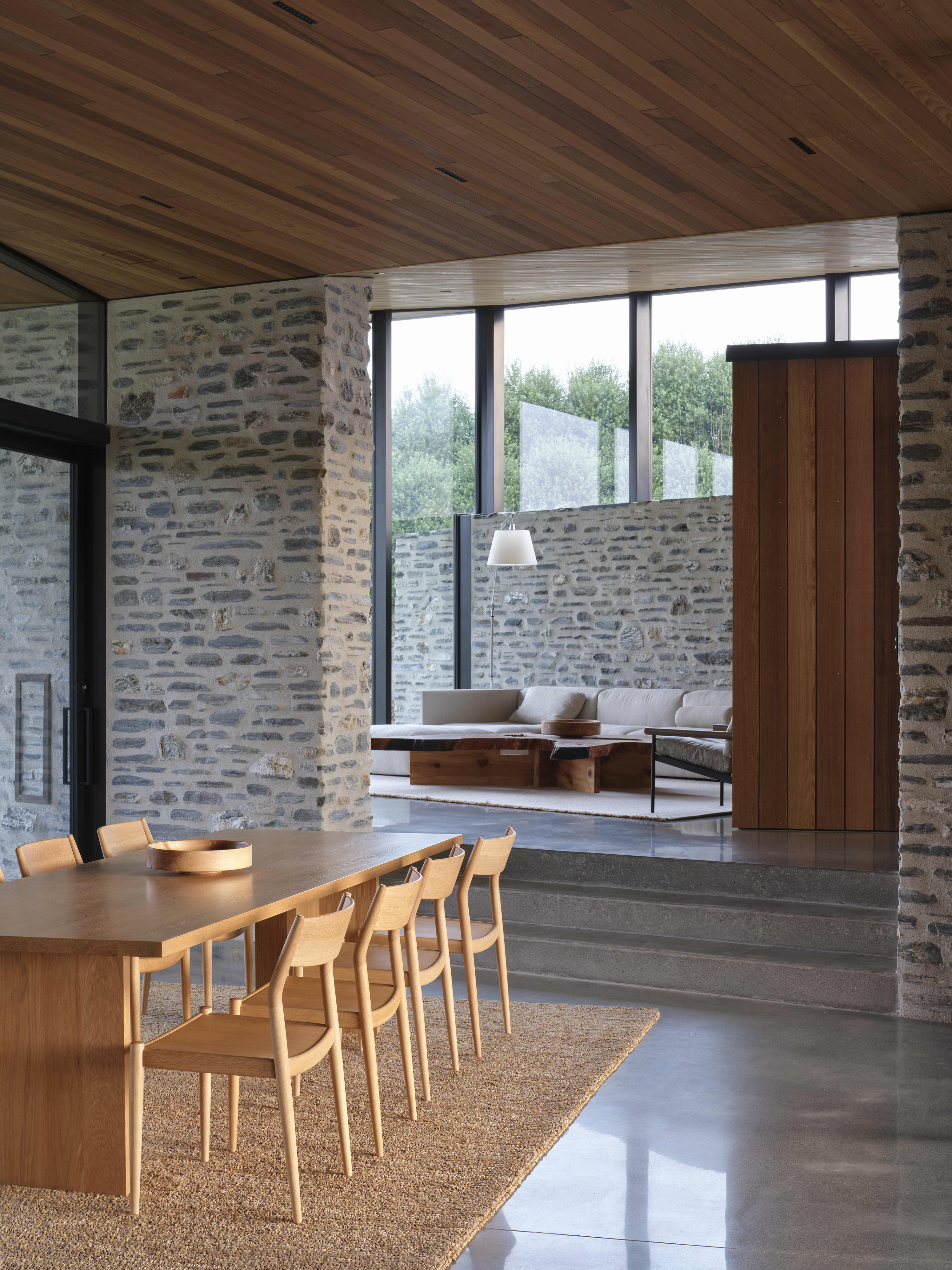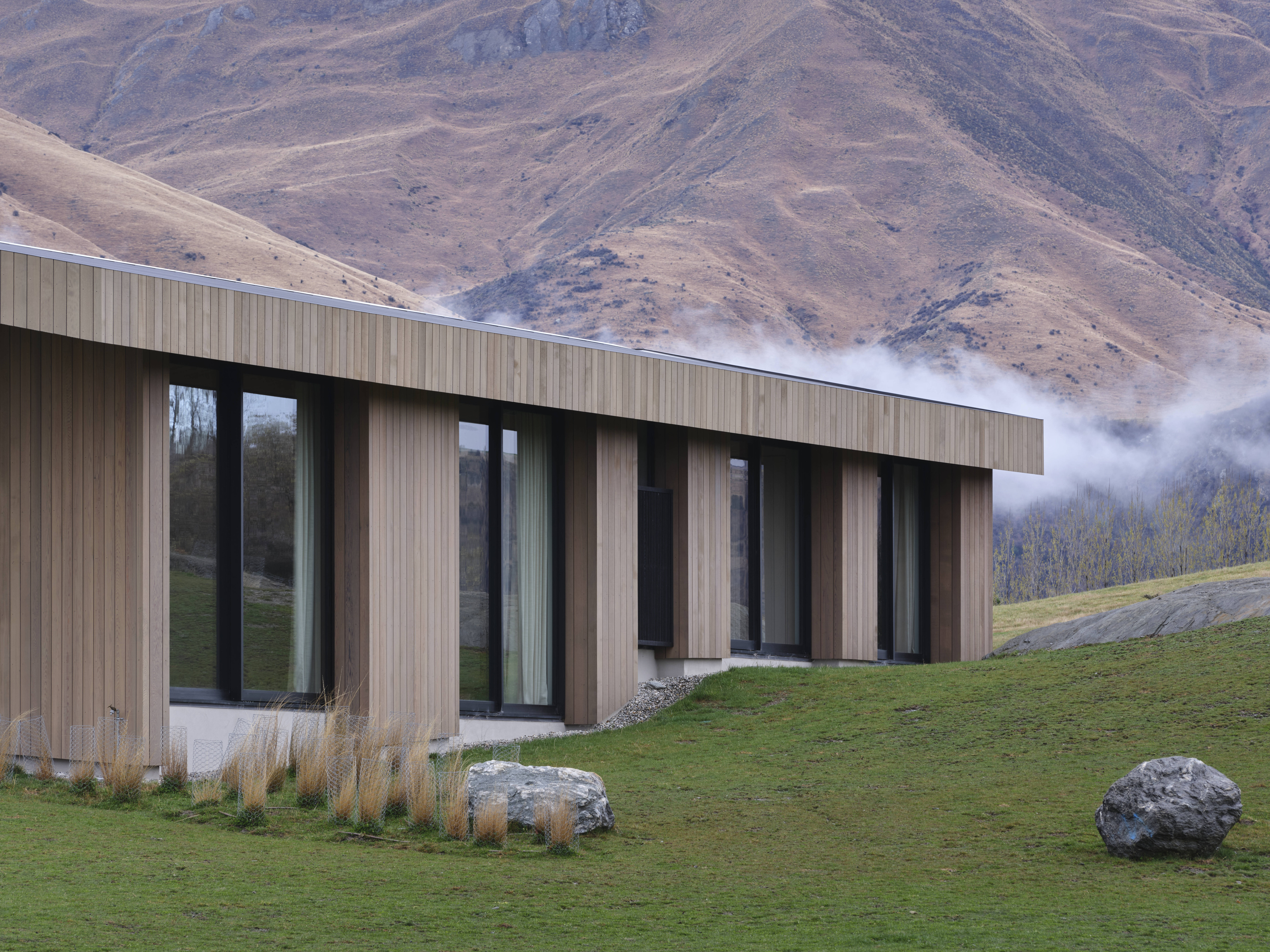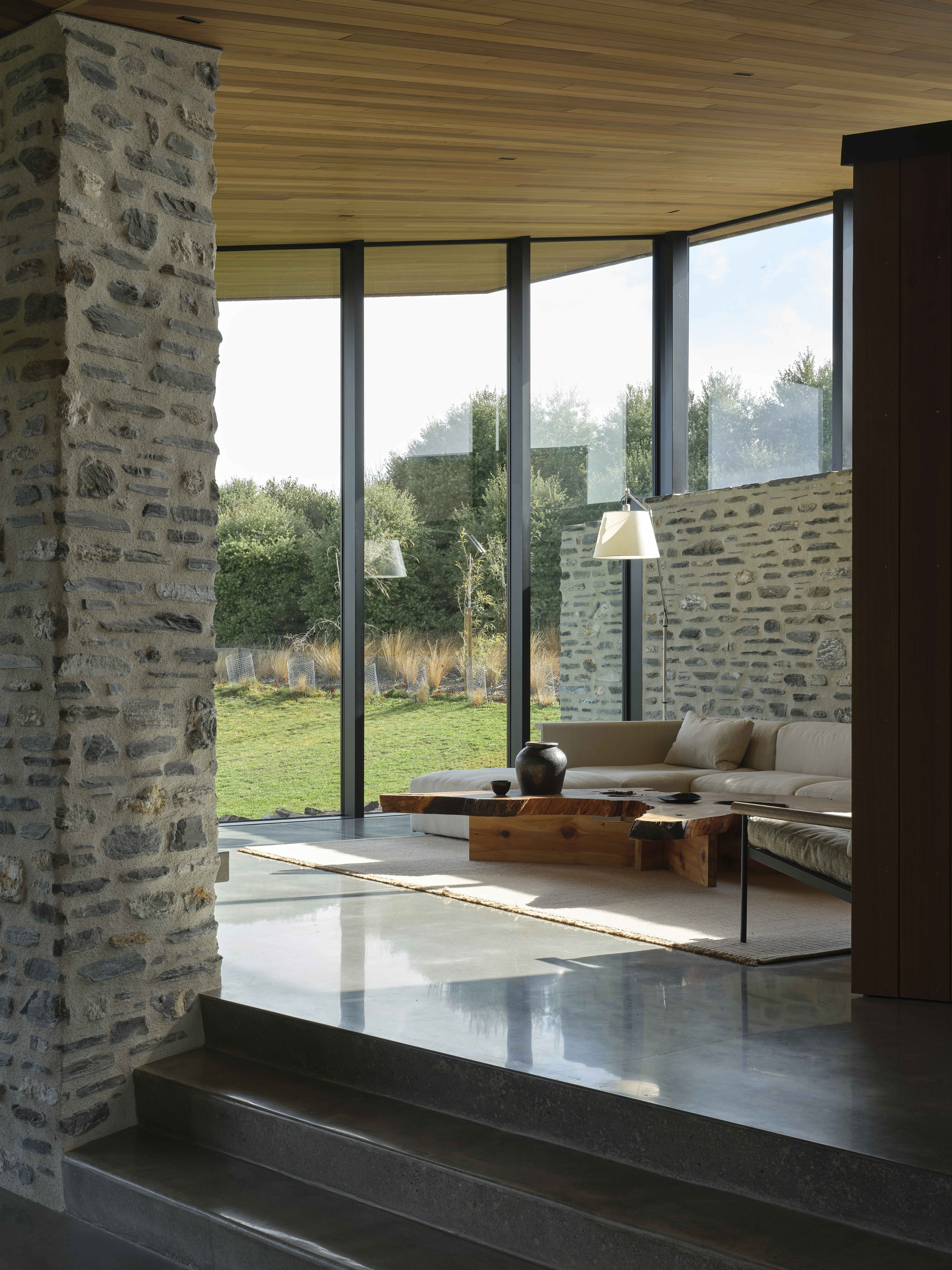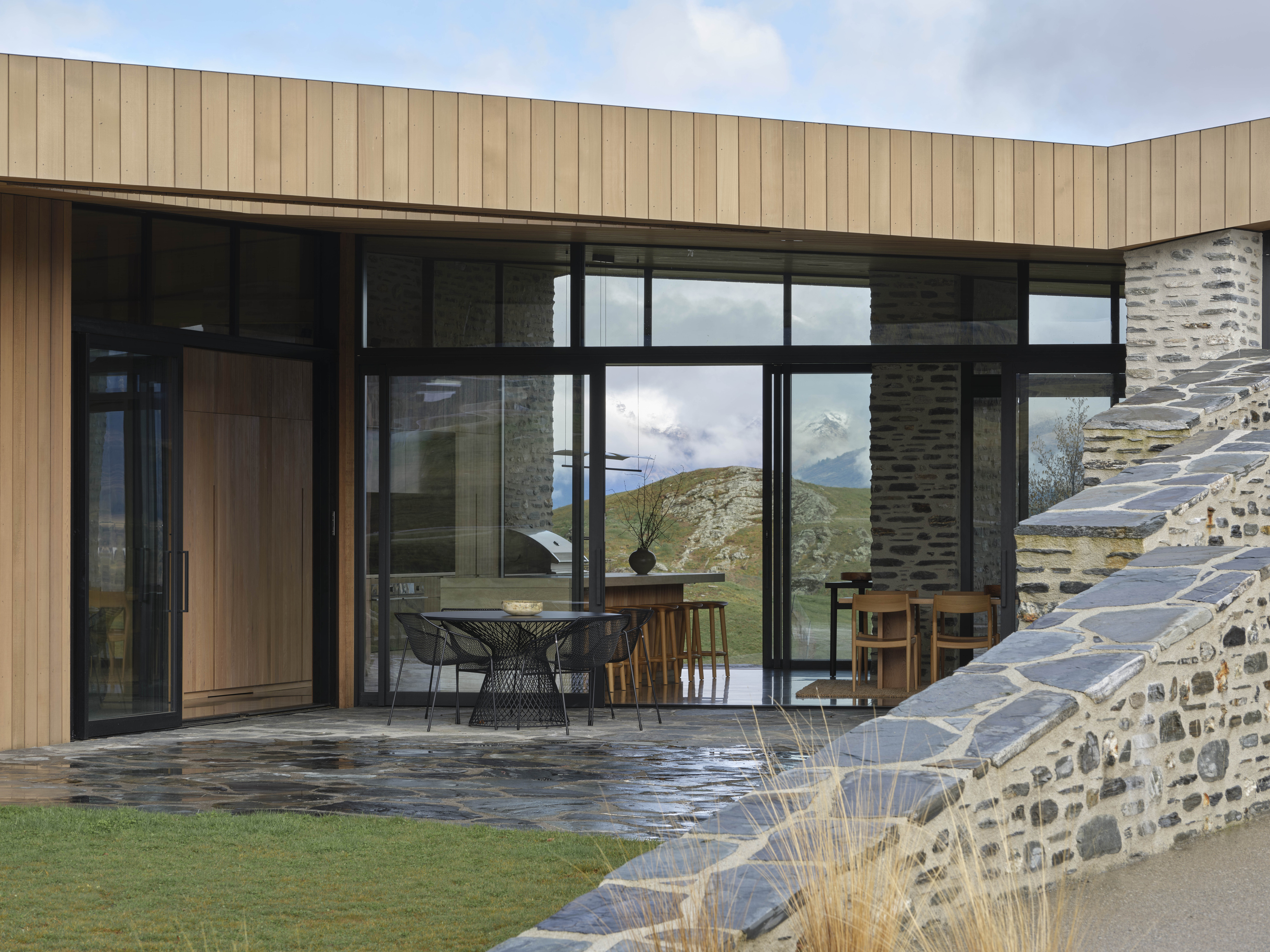 Kārearea House manipulates linear plan and form to create a dynamic architectural expression. Interior spaces are refined and sophisticated, the overall form creating intriguing variations in the volume of interior spaces. Extended stone walls strengthen the visual connection between enclosed space and the wider landscape. A minimal aesthetic elevates the restrained palette of natural materials, the masonry a refreshing combination of local schist and river stone. Detailing and joinery throughout the home has been thoughtfully detailed and expertly crafted.