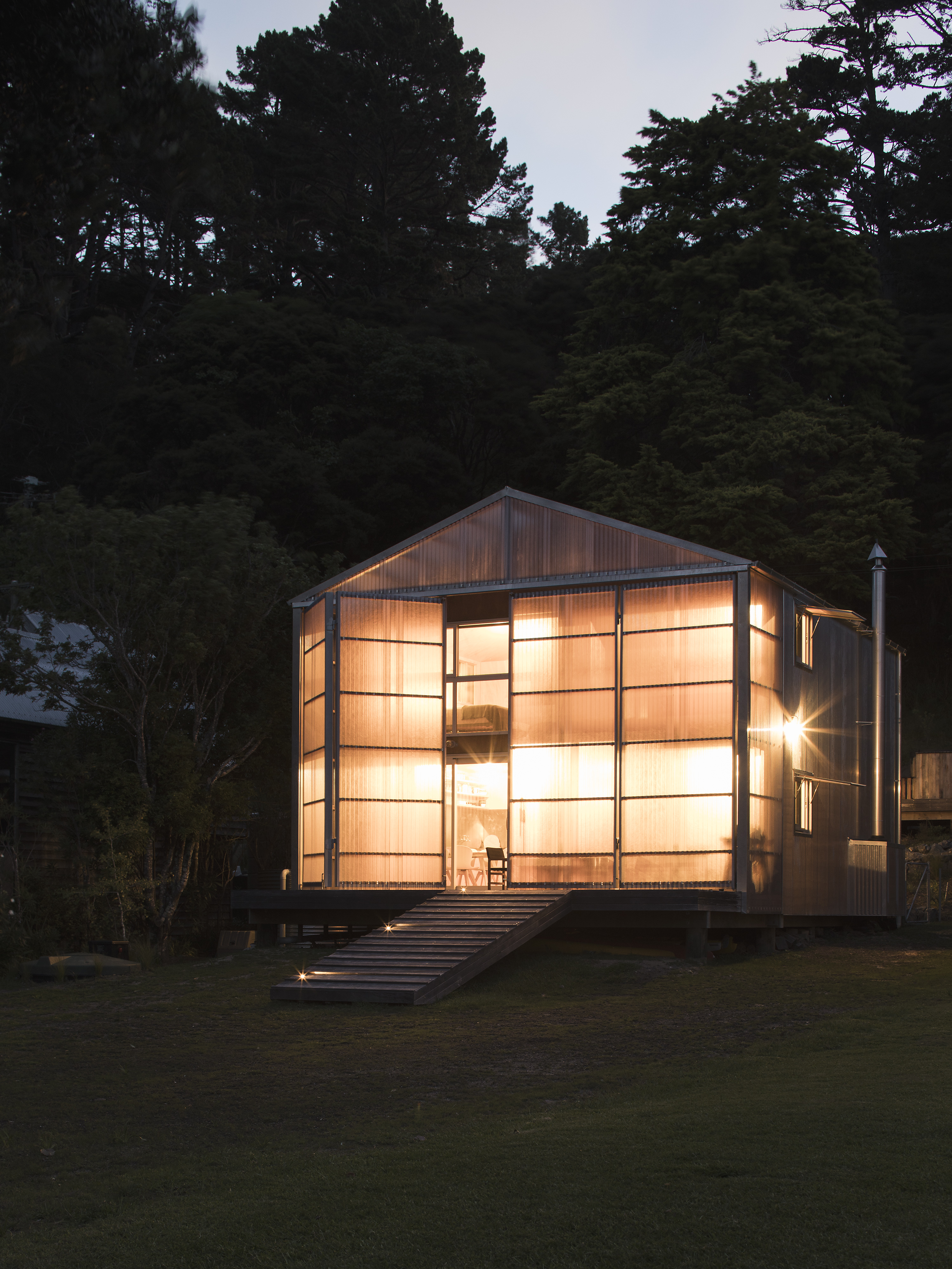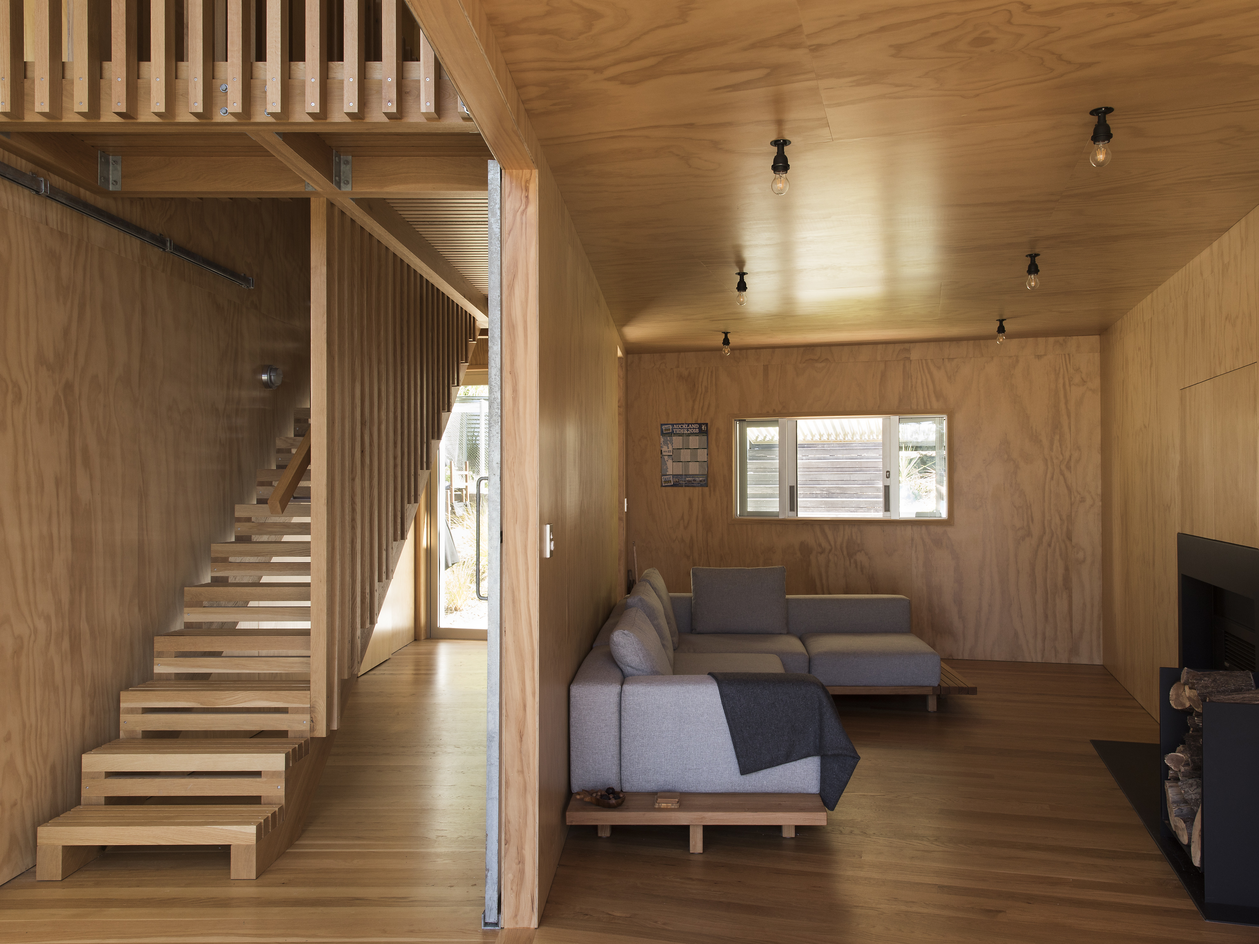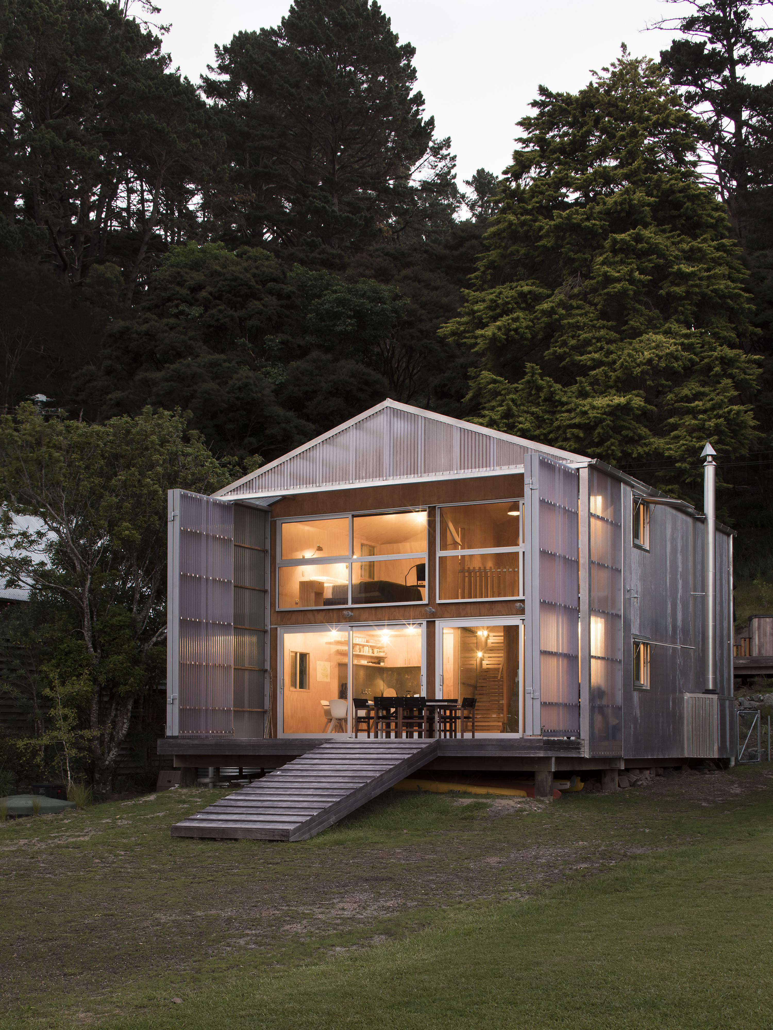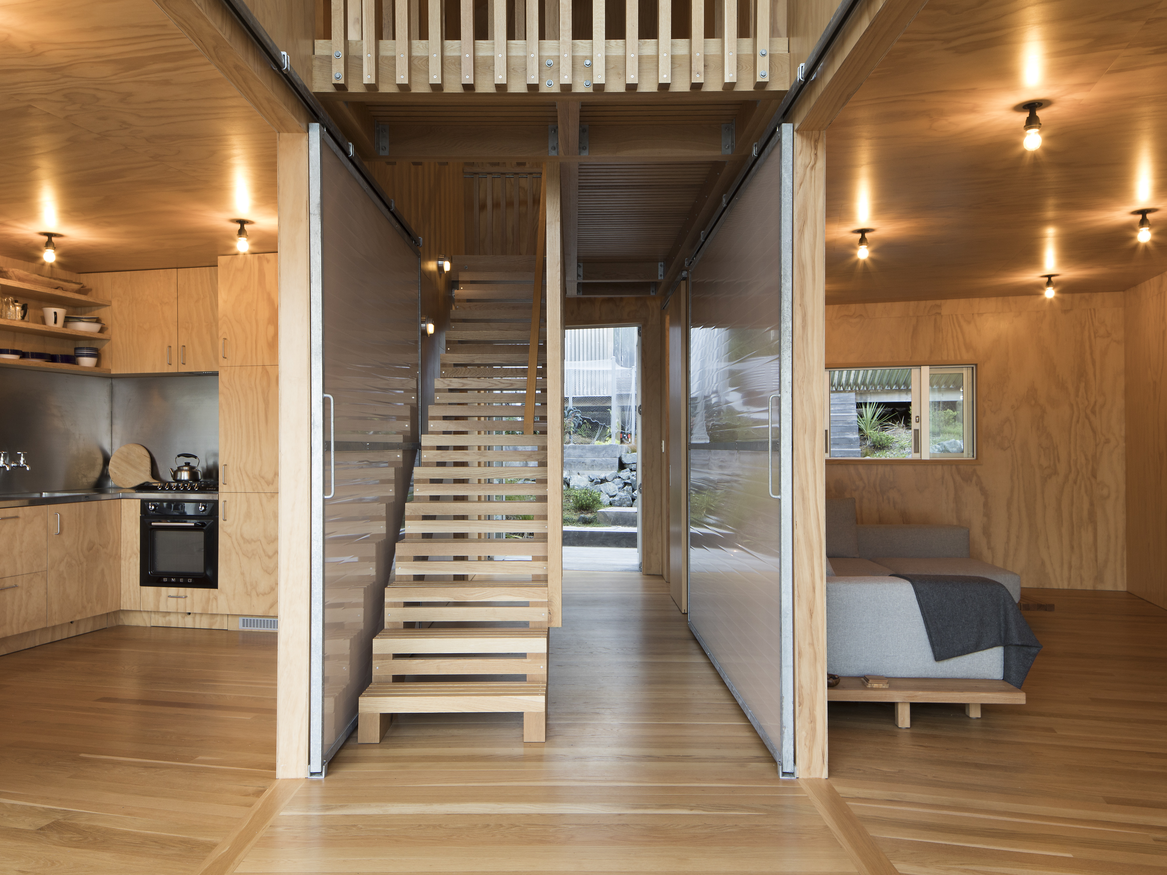 This ‘elegant shed’ is a quintessential bach with a boatshed aesthetic. Sympathetic in scale and situation to nearby dwellings, it benefits from a simple square plan that has been enlivened by a diagonal stair. Through massive folding front doors clad in translucent polycarbonate, it also fully embodies the lock-and-leave ideal.