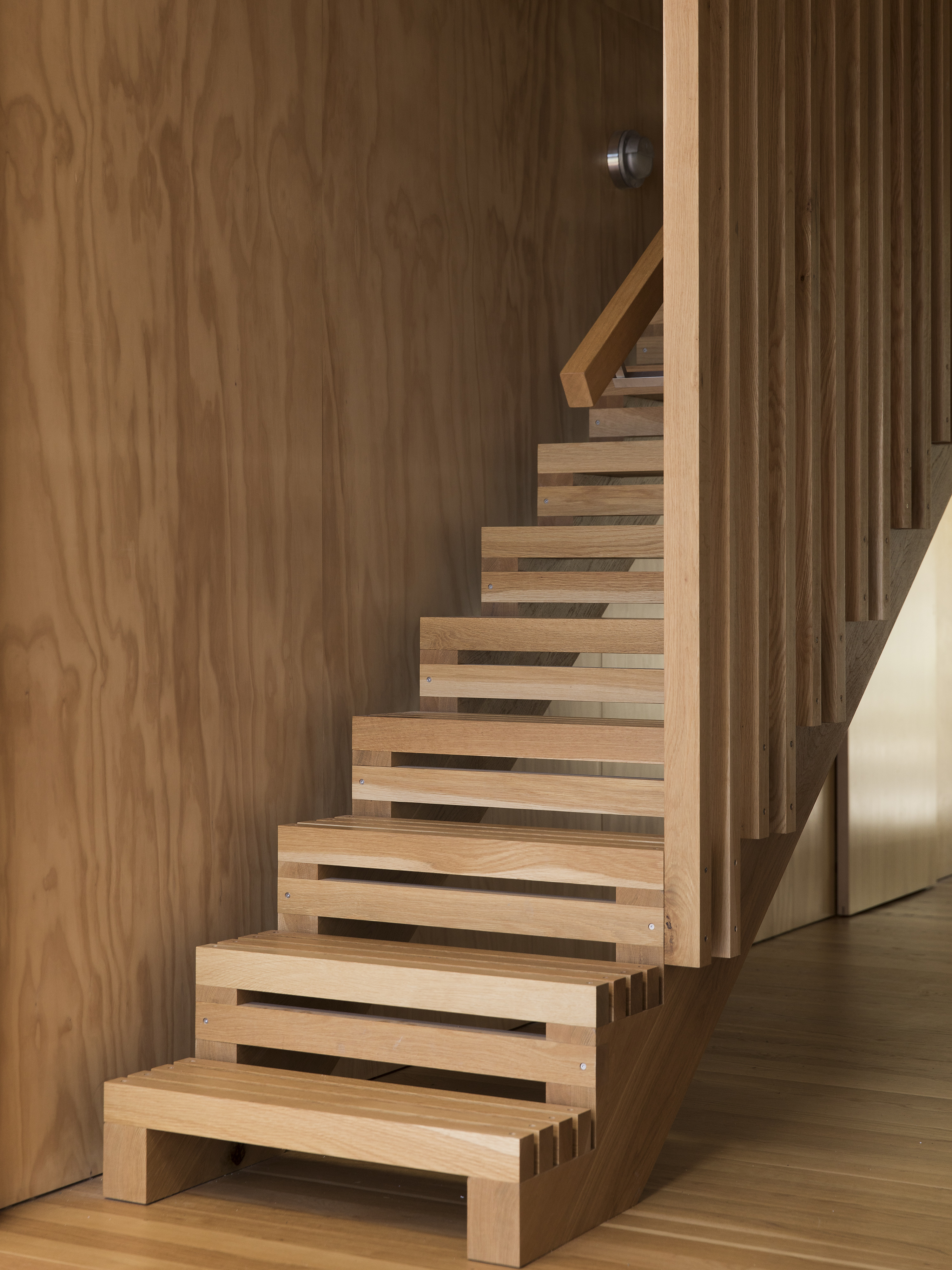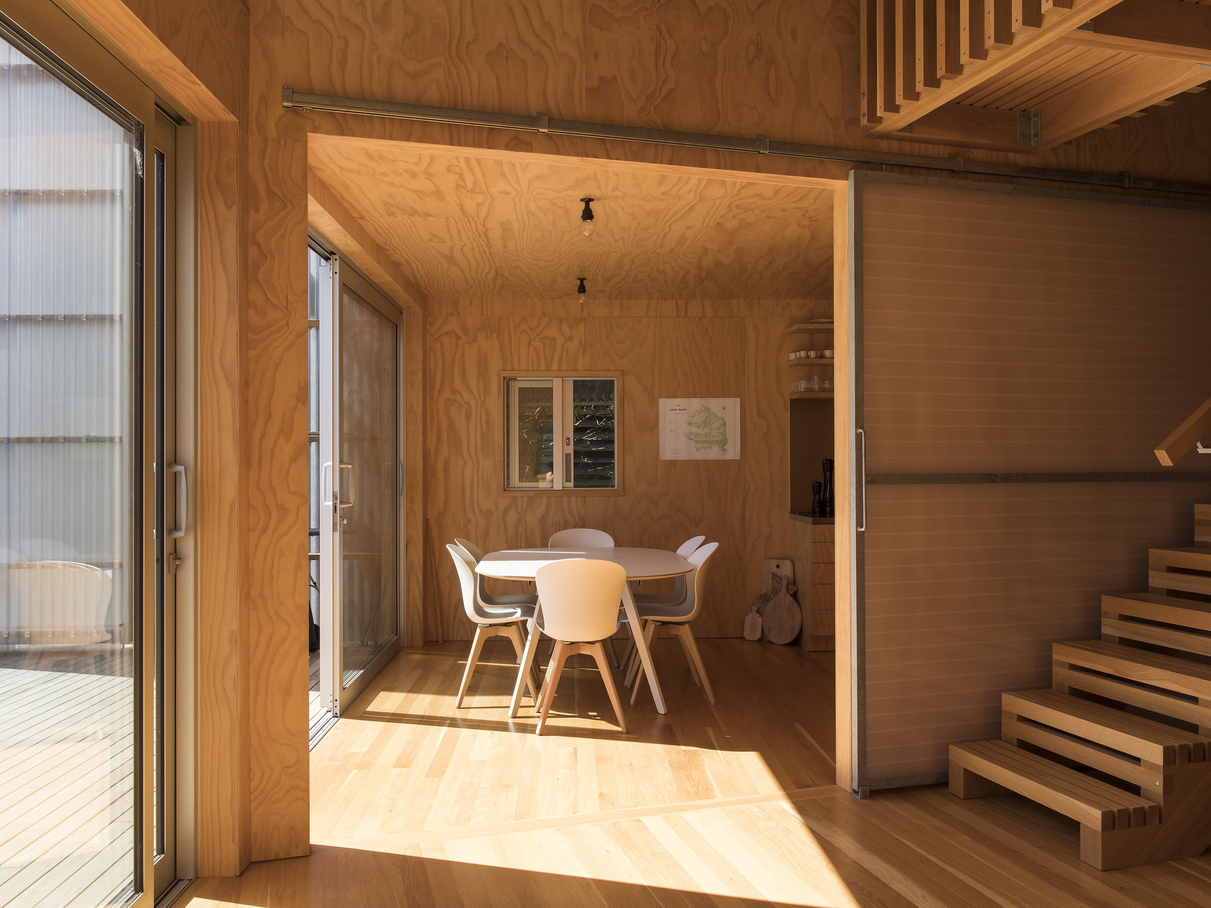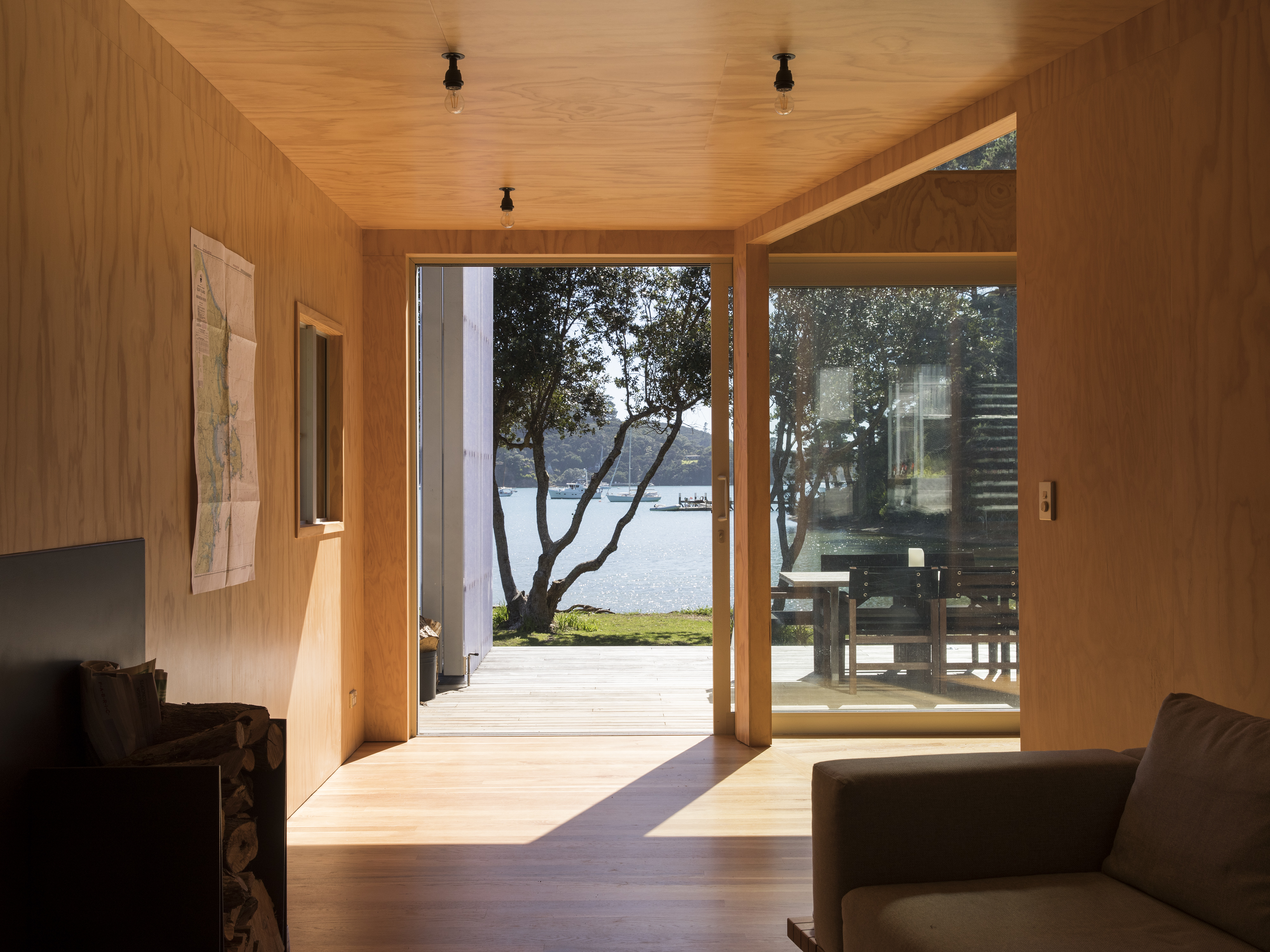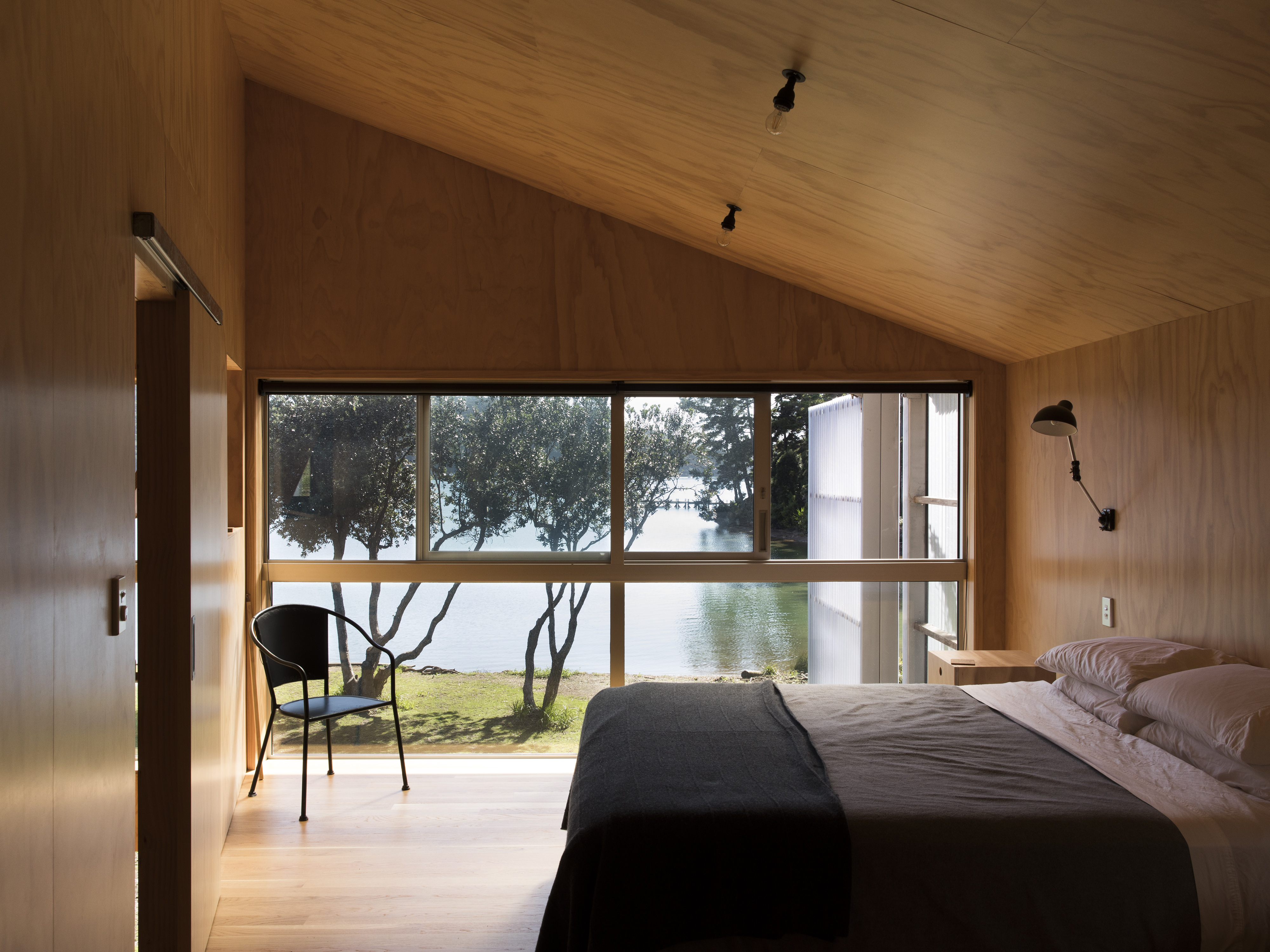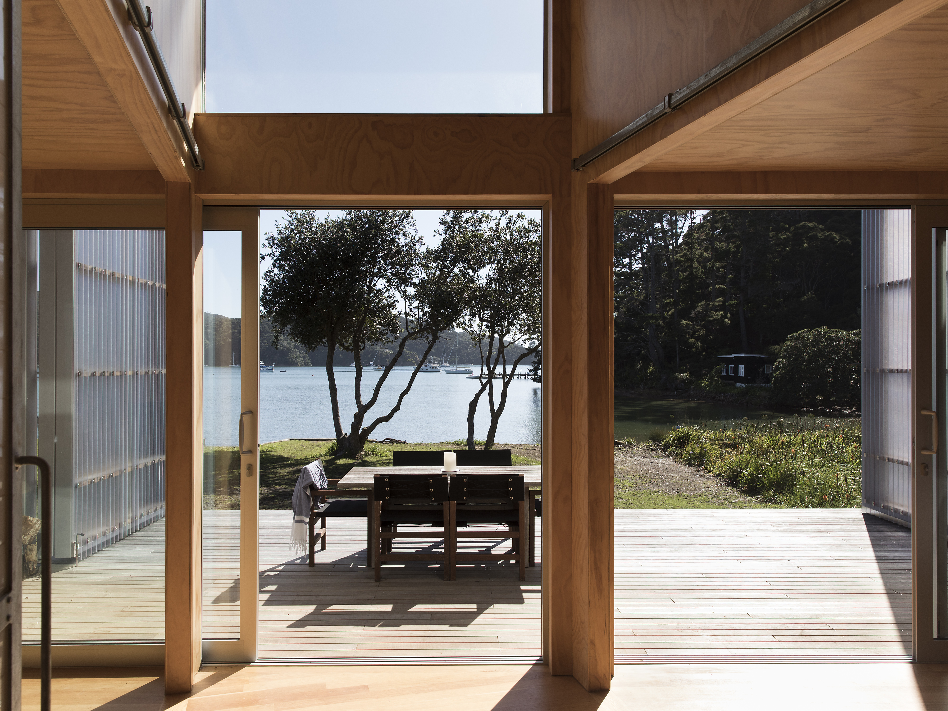 This ‘elegant shed’ is a quintessential bach with a boatshed aesthetic. Sympathetic in scale and situation to nearby dwellings, it benefits from a simple square plan that has been enlivened by a diagonal stair. Through massive folding front doors clad in translucent polycarbonate, it also fully embodies the lock-and-leave ideal.