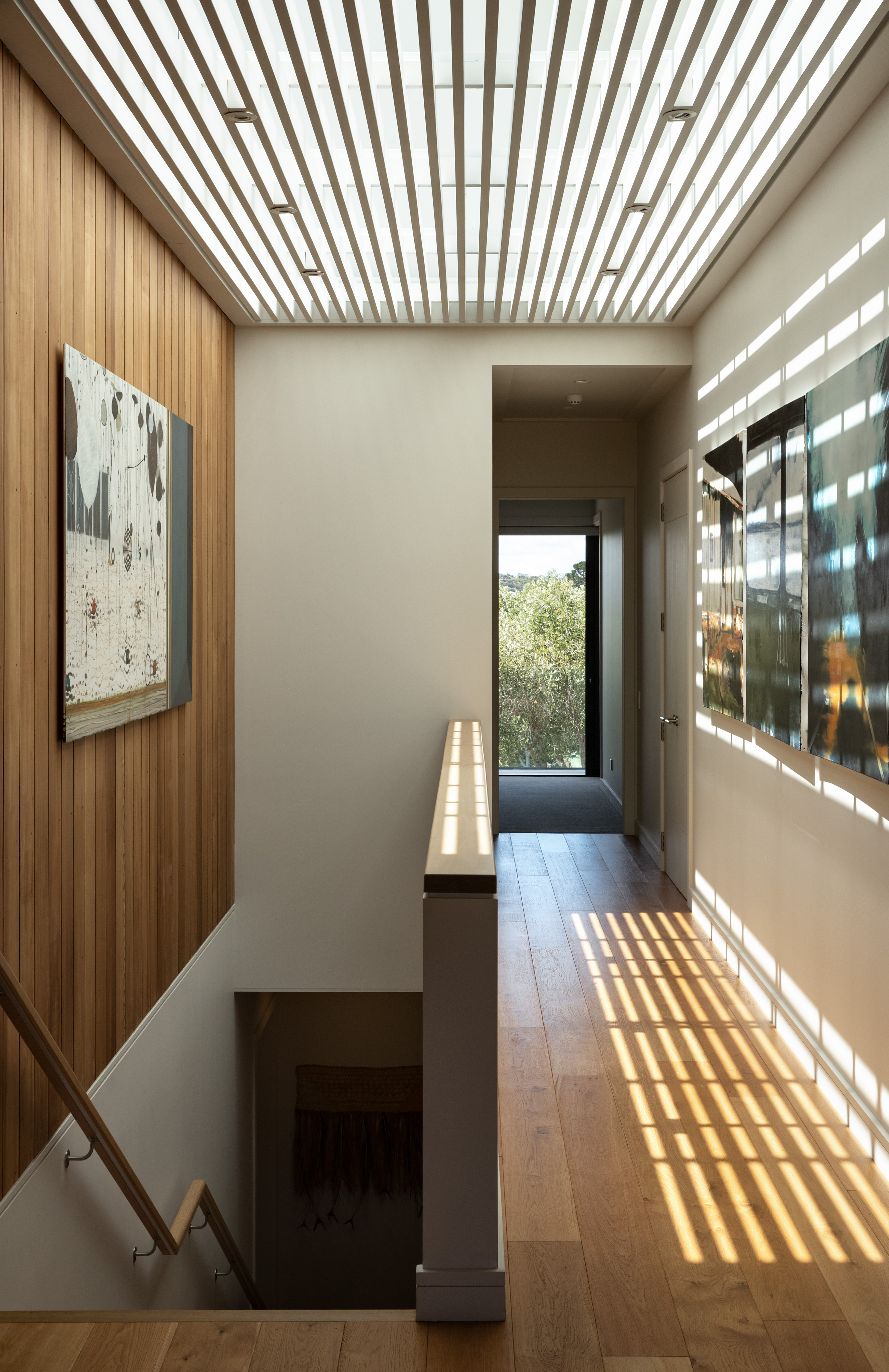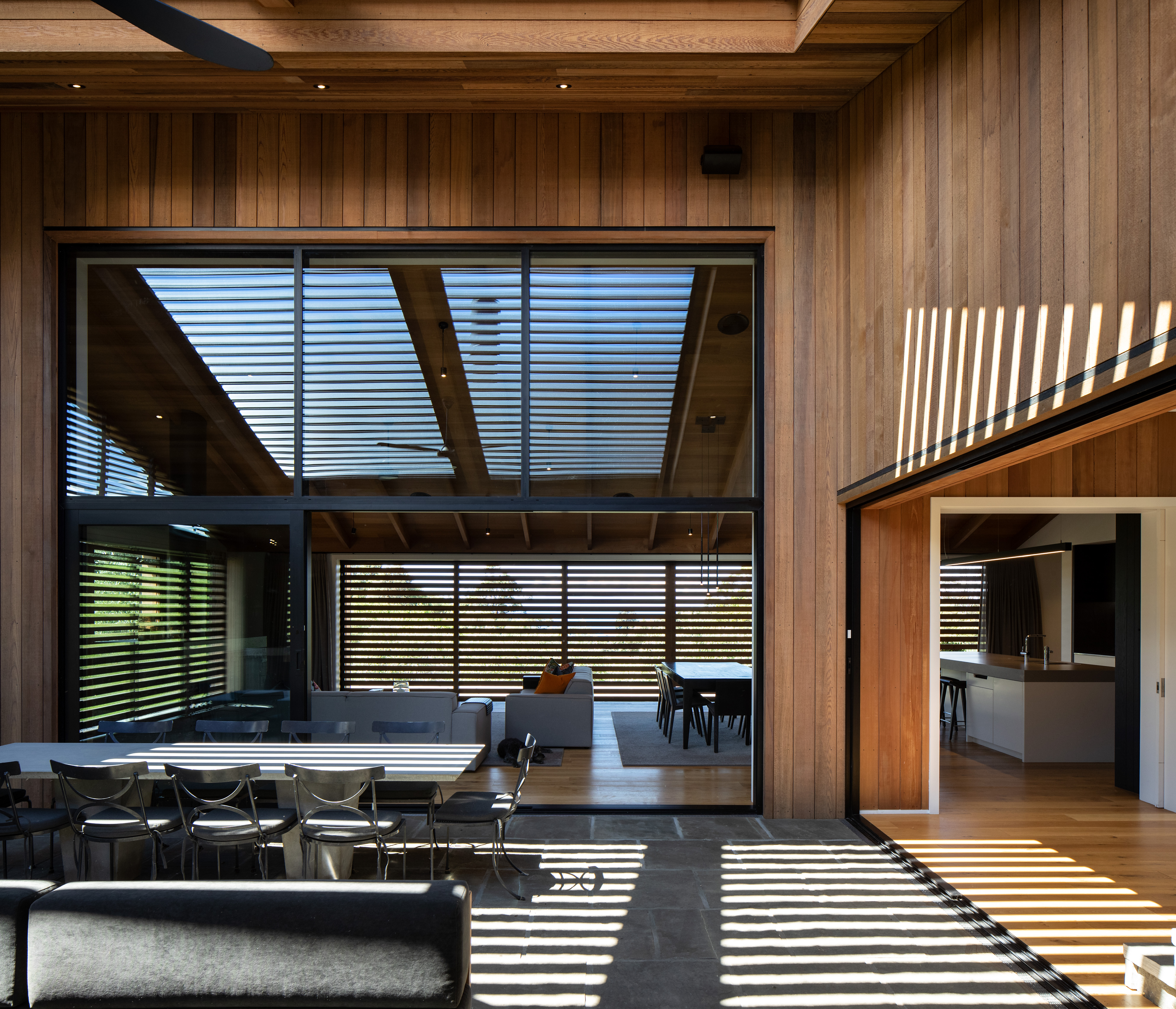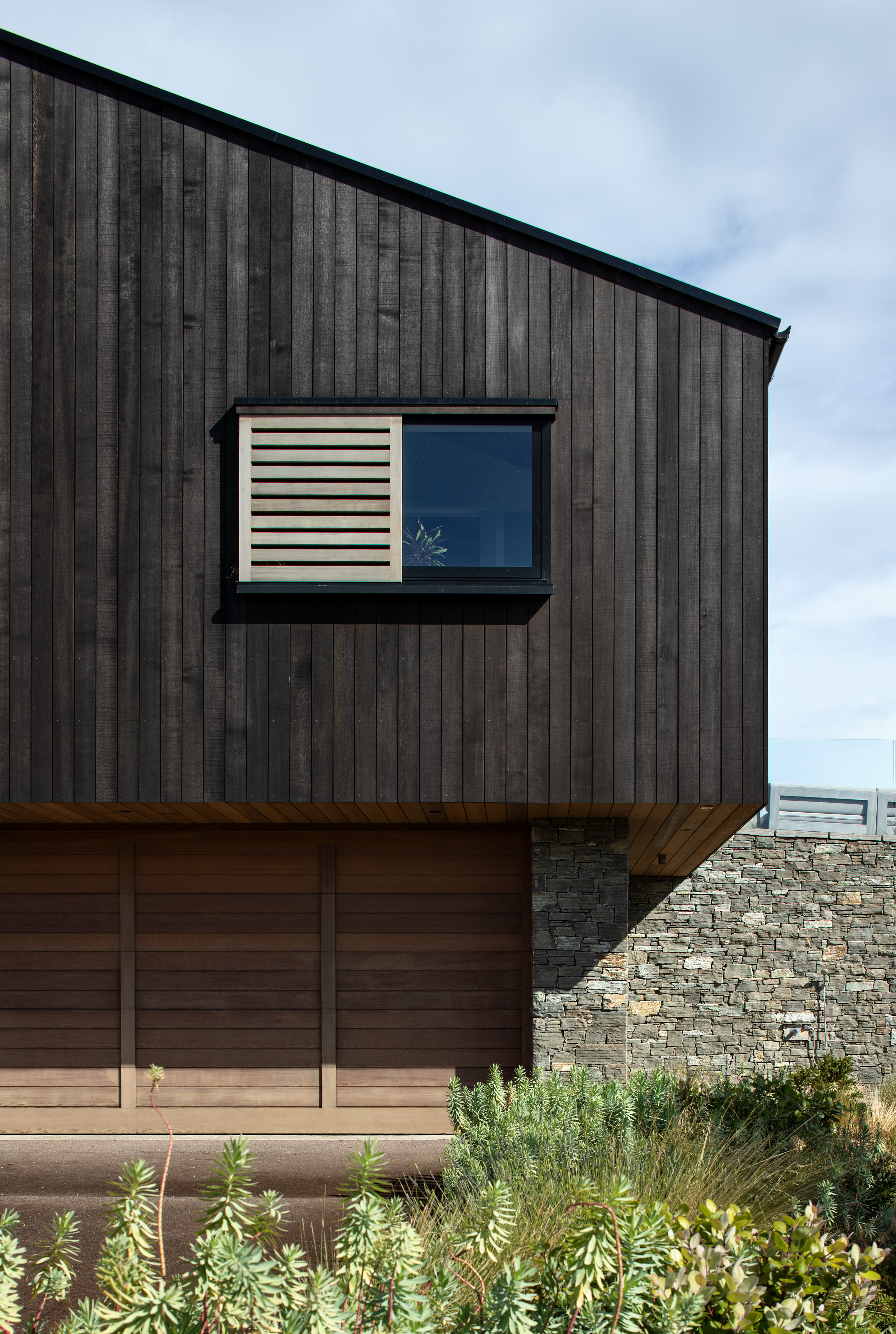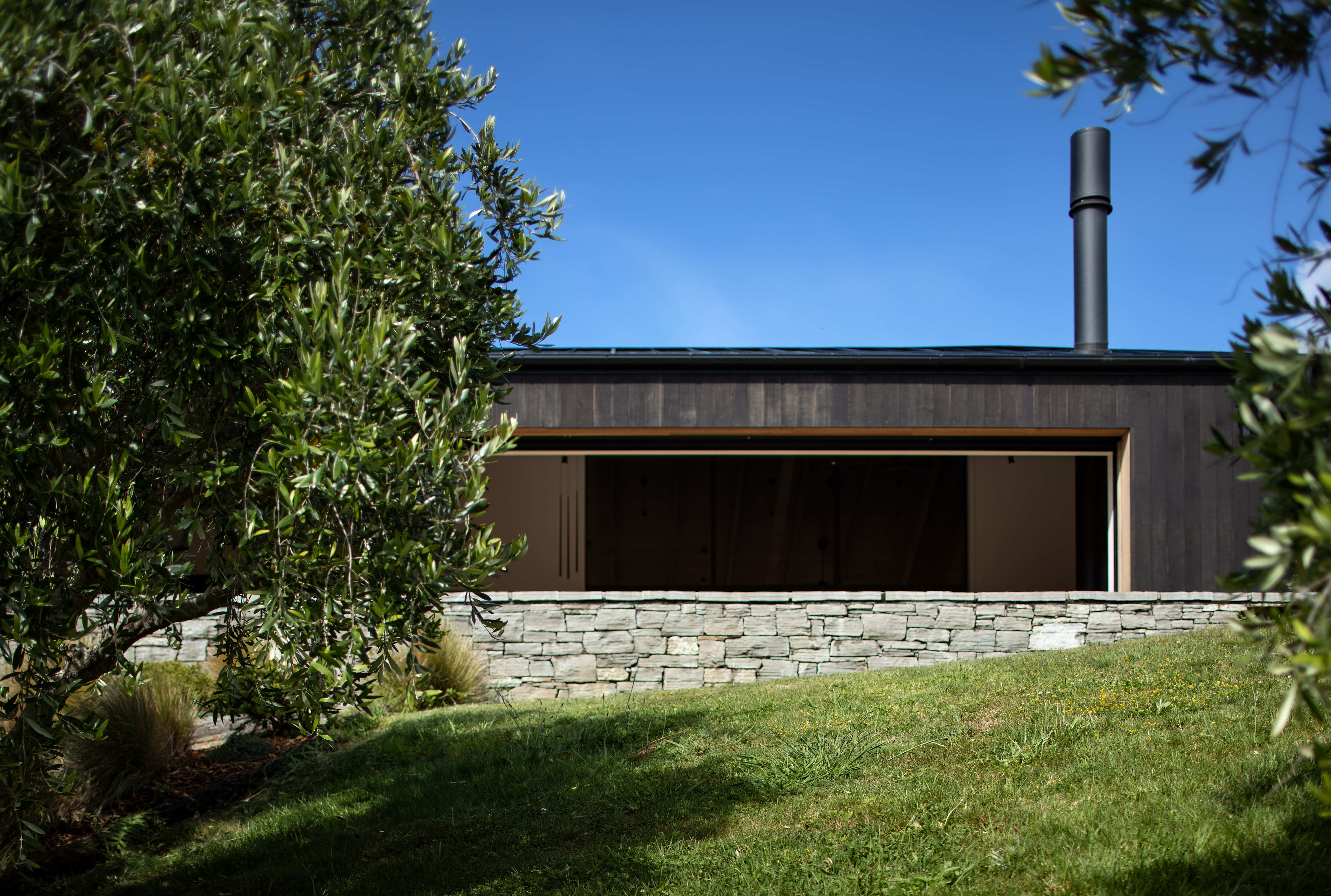 Many architects work with the vernacular: pitched roof, a weatherboard sheath, not too many windows, unfussy in every particular. Few achieve a comfortable luxury with it as well as Sumich Chaplin has with this house on Waiheke Island. You enter stepping down into the house, to discover a gorgeous letterboxed view through on the other side: the Hauraki Gulf, headlands, above a fringe of olive trees. As you move towards it, you discover the rest of the olive grove sloping away, and in the house itself a very generous living/kitchen space. To the left there’s a large outdoor area with fire; it’s screened with cedar battens on the outer wall, but able to be opened wide, as is the louvred roof. Everywhere, black and natural cedar offset each other, with featured stonework too, all of it enhancing the simple form. Bedrooms at the other side of the house have their own pleasing outlook across the olive groves and rolling hills. Achieving a house for the good life that doesn’t feel the need to get shouty about it is a lot harder than it looks.