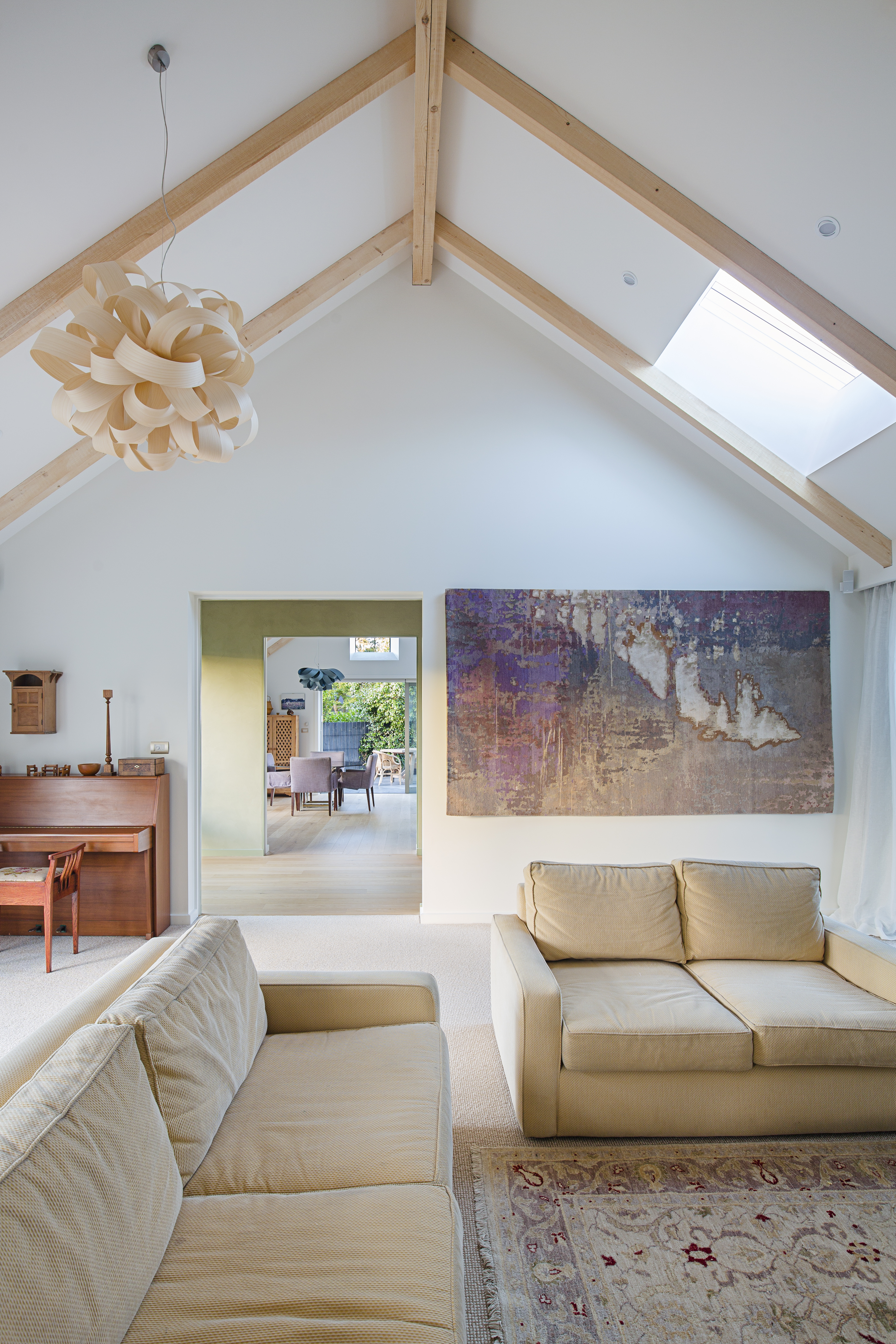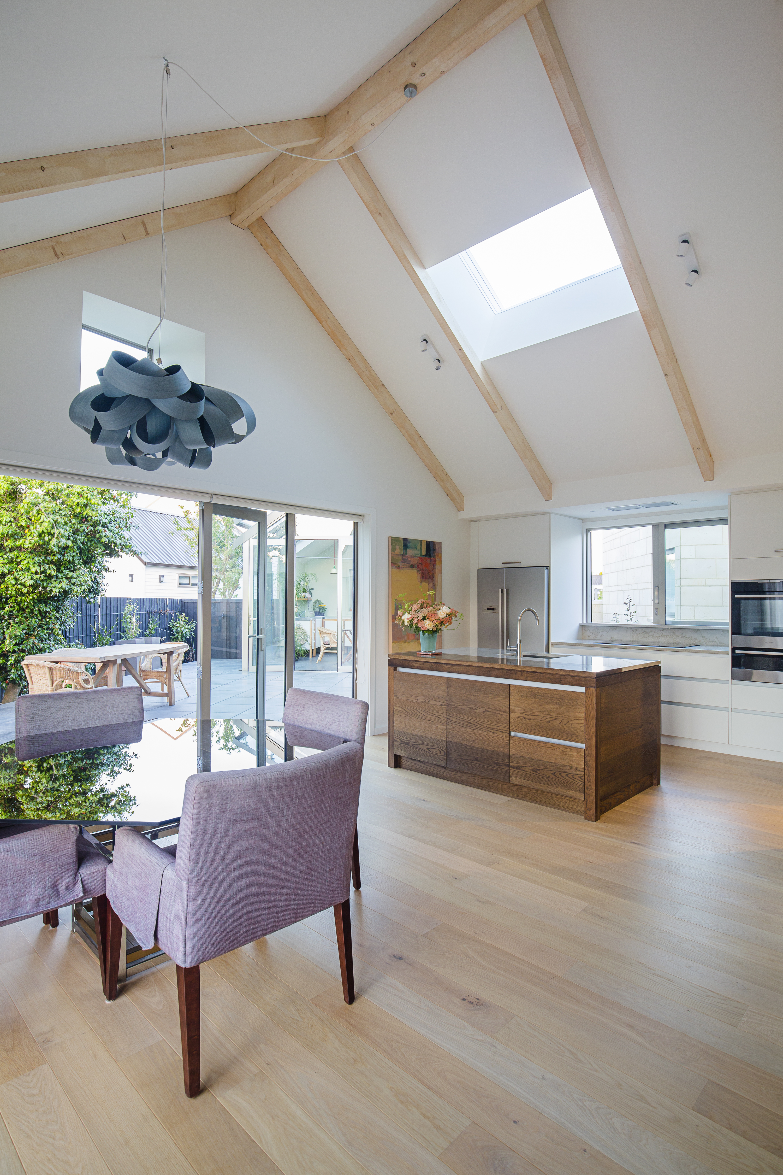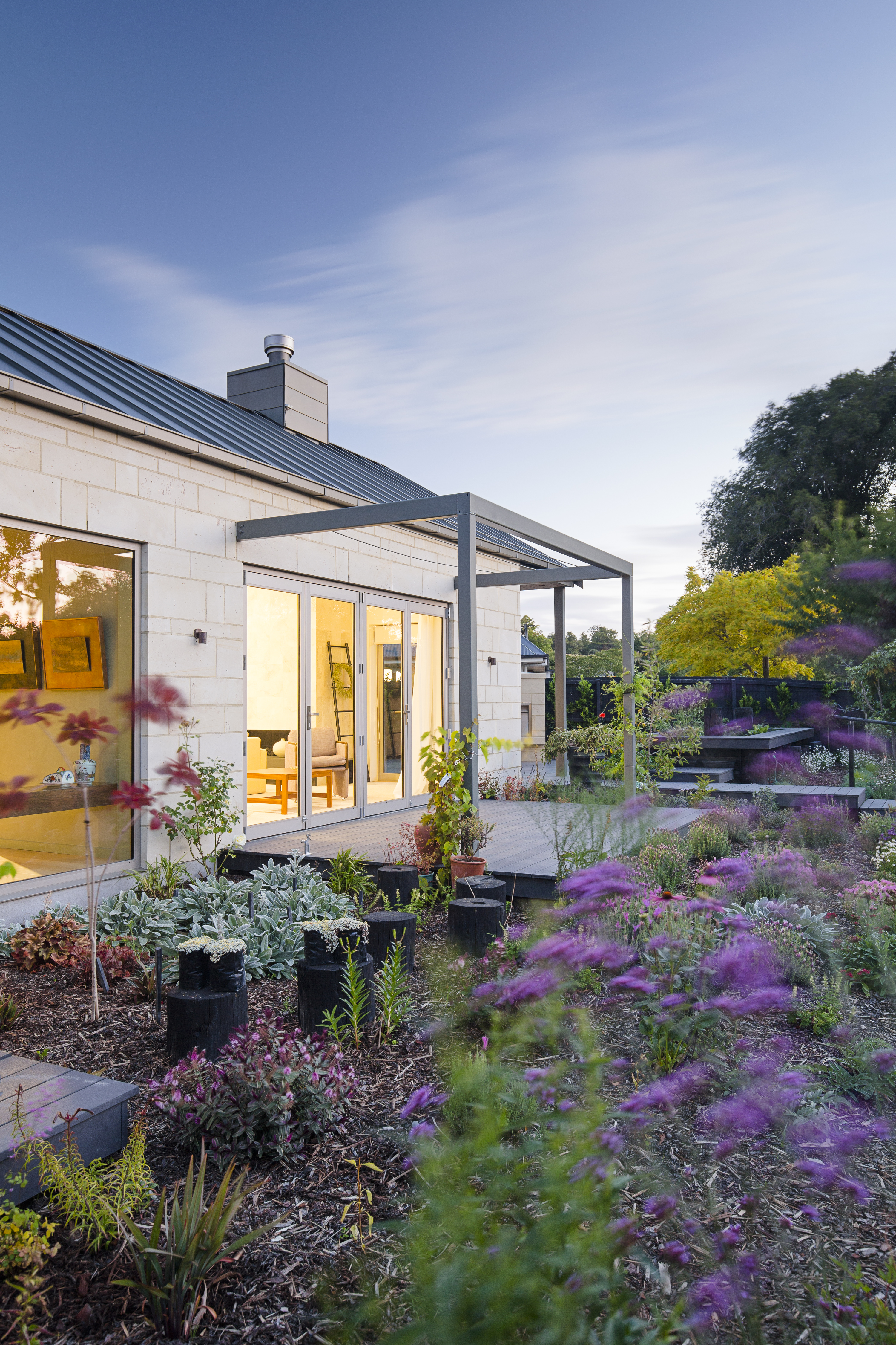 Upon arrival at Kotare Street one is greeted by the first glimpse of the garden and ‘gatehouse’. This small studio-cum-greenhouse forms the first in the collection of gabled forms, enticing visitors into the property. The main living space sits alongside the river, while the bedroom wing encloses the central courtyard, providing privacy. Once inside, the arrangement of forms allows occupants visual connections between the different spaces, out into the garden and river beyond. Open gables provide a sense of volume and roof windows allow light into the spaces and views out to neighbouring trees, while pergolas encourage the home to sink into the garden. House, garden and clients will grow together in this calming riverside masterpiece.