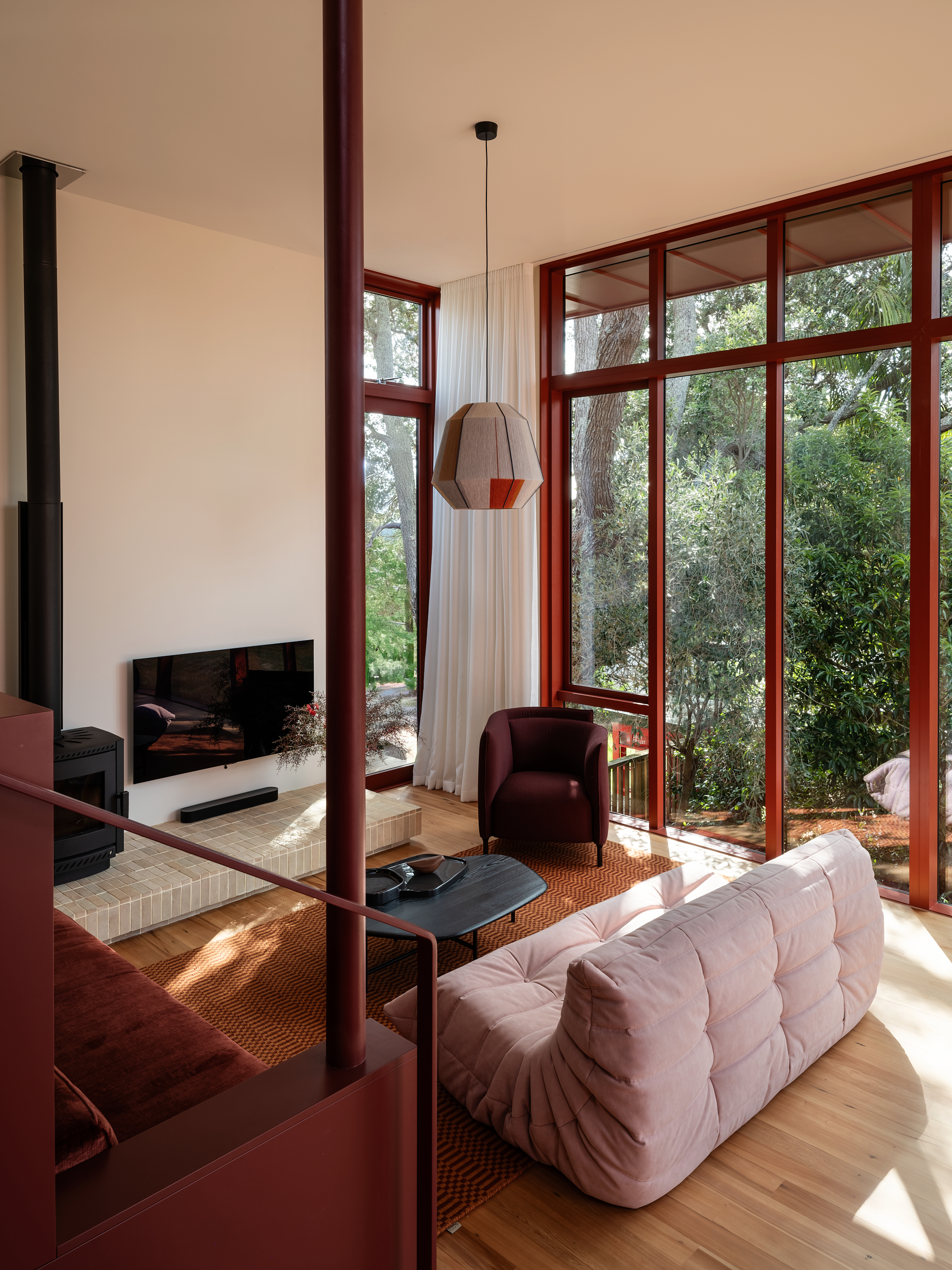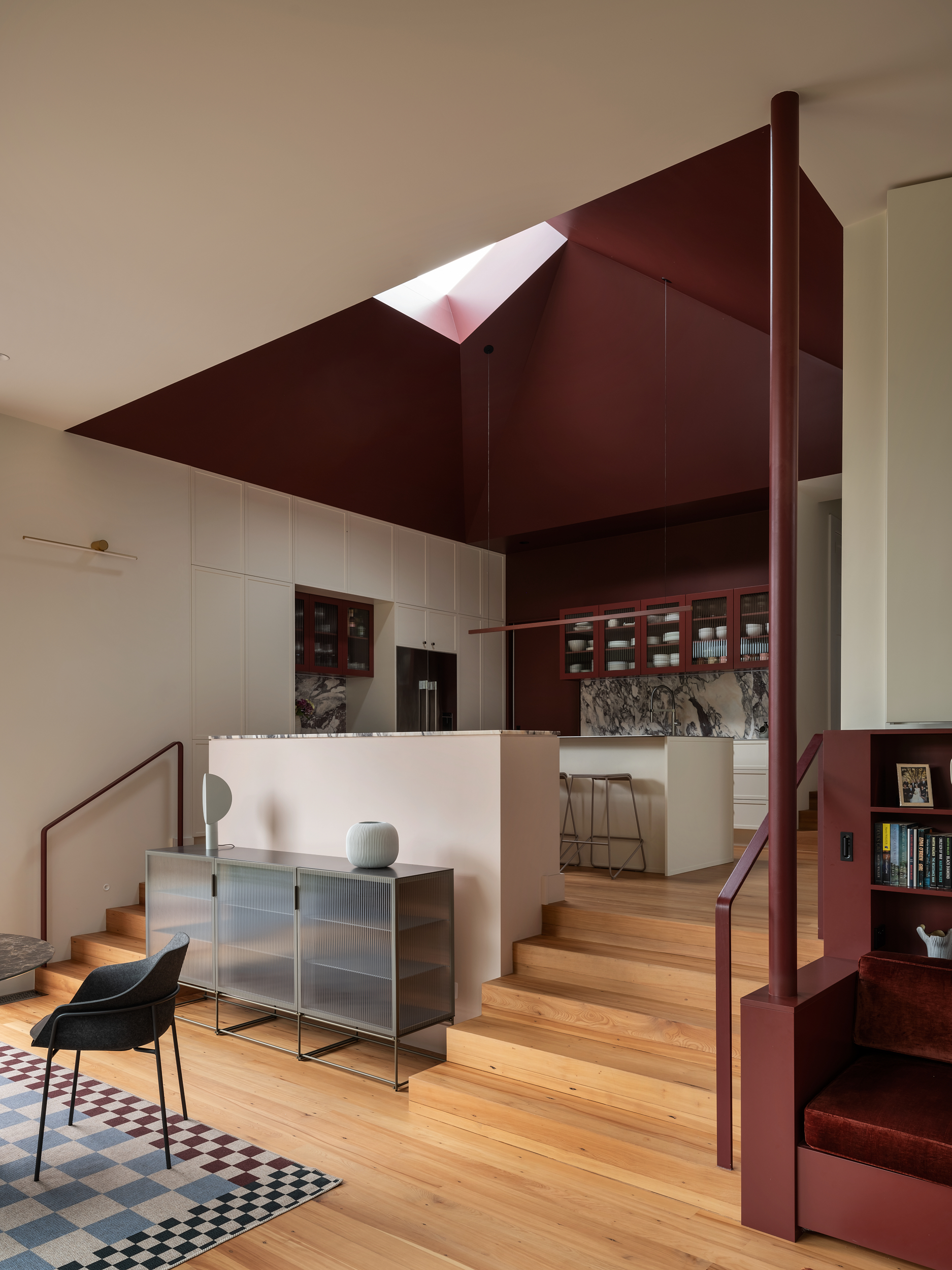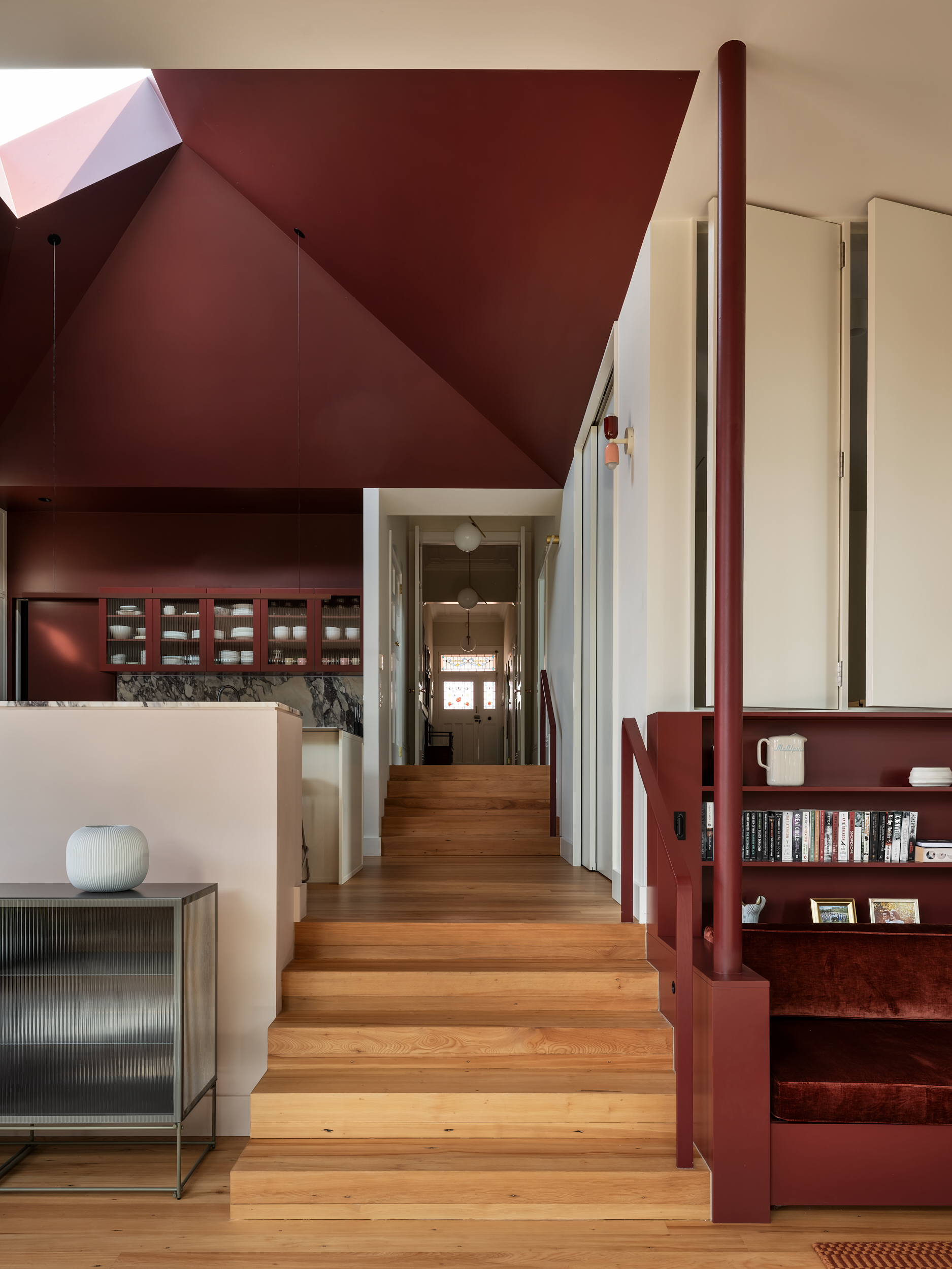 Perched on the edge of a volcanic precipice, this villa extension reclaims a once-disconnected home with grace and ingenuity. Stepping down through three levels, it follows the site’s steep terrain to reconnect with the land and open into a canopy of mature trees. A pyramid roof and sculpted skylight draw in shifting light, while a volcanic colour palette grounds the design in place and personality. Sensitive to heritage, light on carbon and rich in spatial storytelling, this project balances old and new with confidence and care.