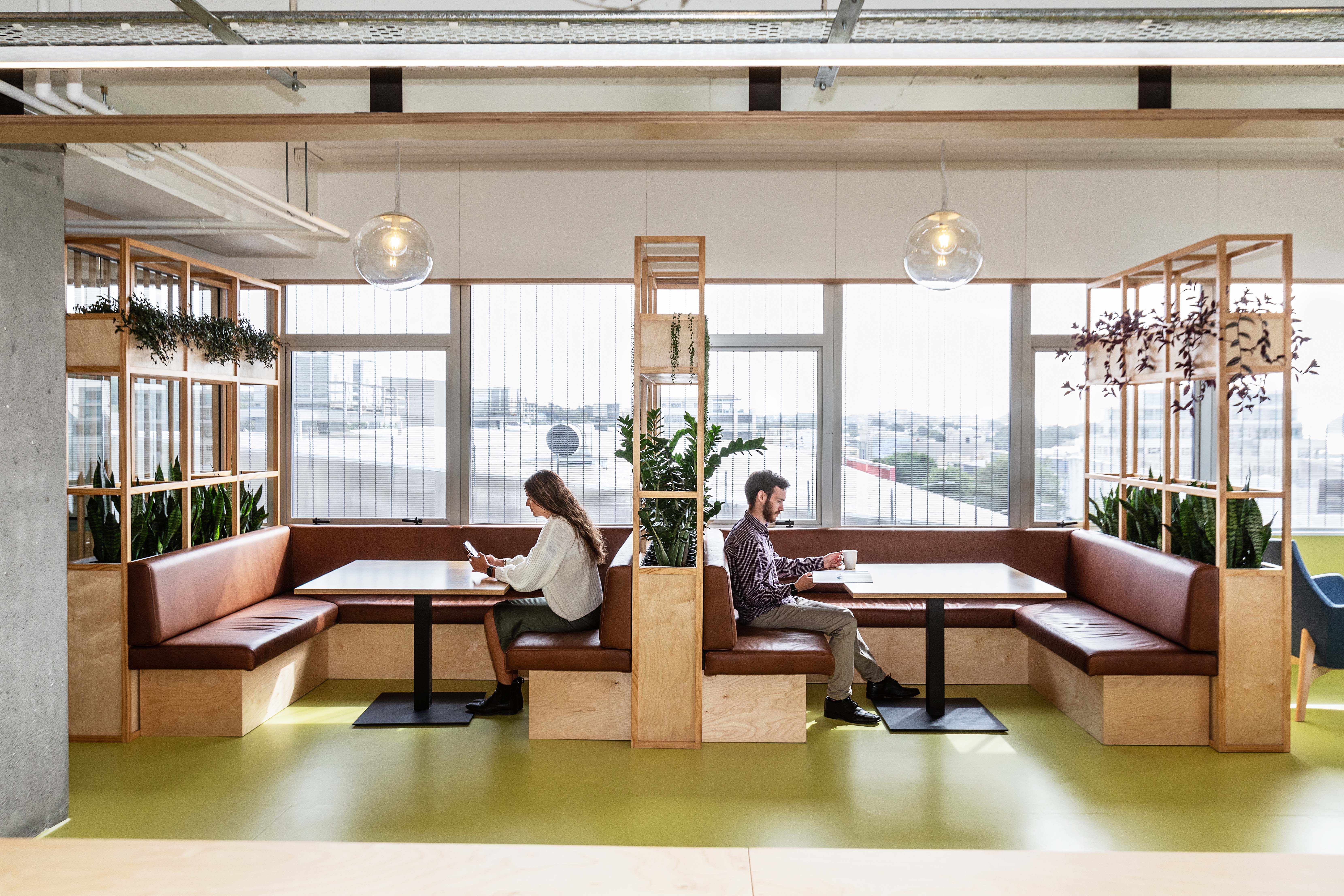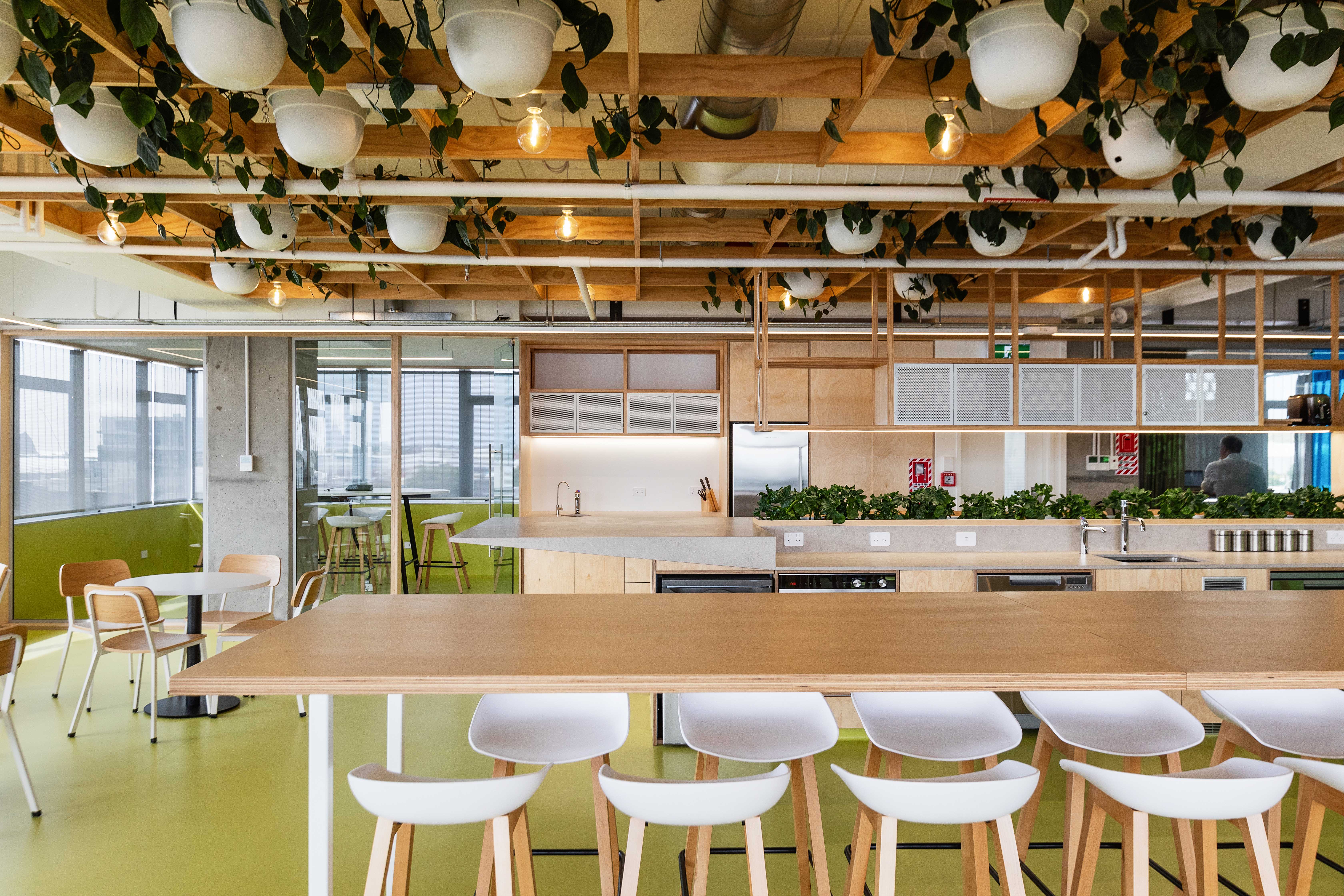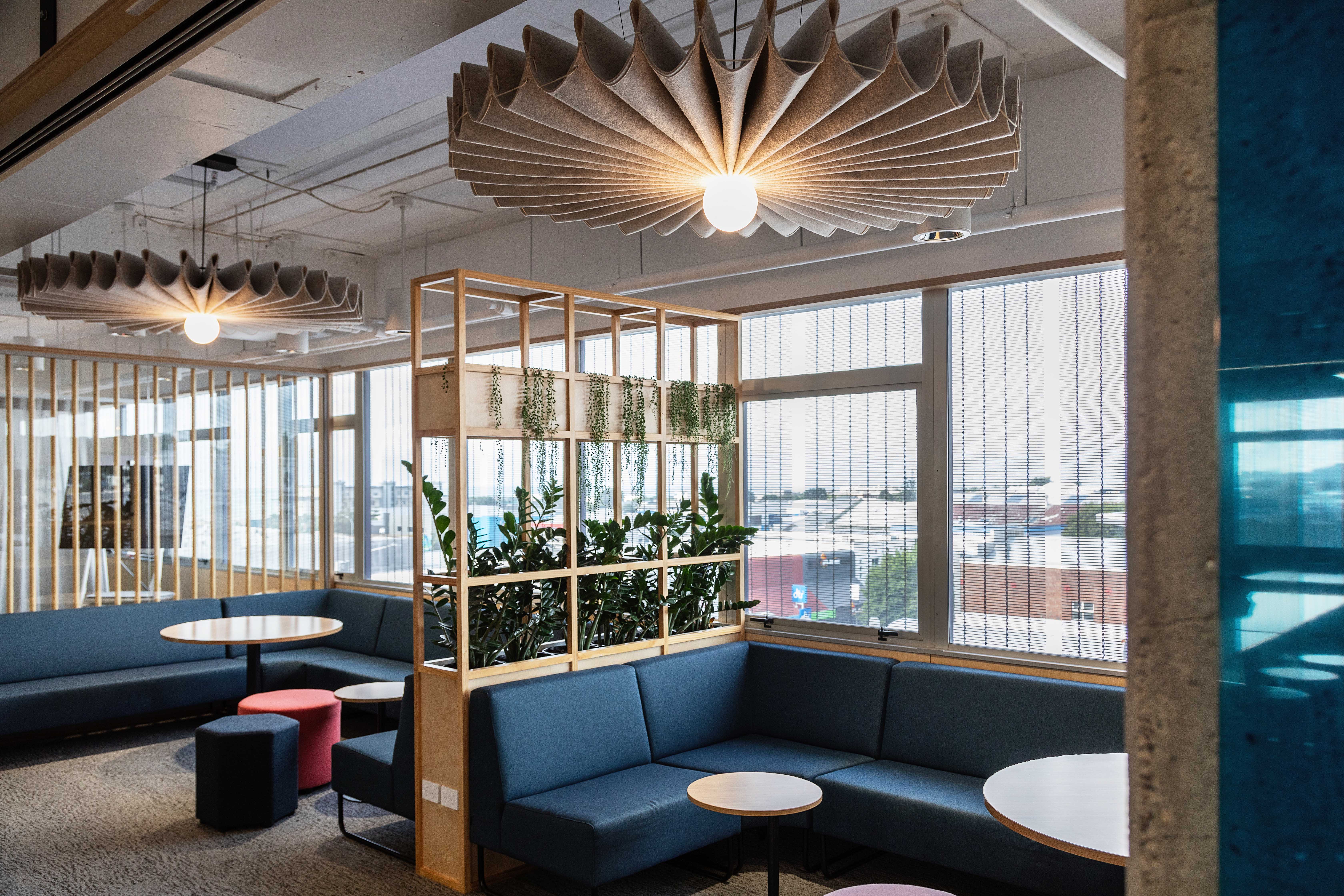 This vibrant and engaging space has transformed an ageing corporate interior into one that encourages a culture of connection, growth, and collaboration. The open office layout is carefully curated, with specialised ‘focus zones’ throughout; these areas successfully divide the space using colour and materiality, while maintaining a sense of transparency. The abundance of indoor plants and natural materials including timber, New Zealand wool and natural rubber, as well as glass to admit natural light, stimulates a sense of productivity and celebrates wellbeing.