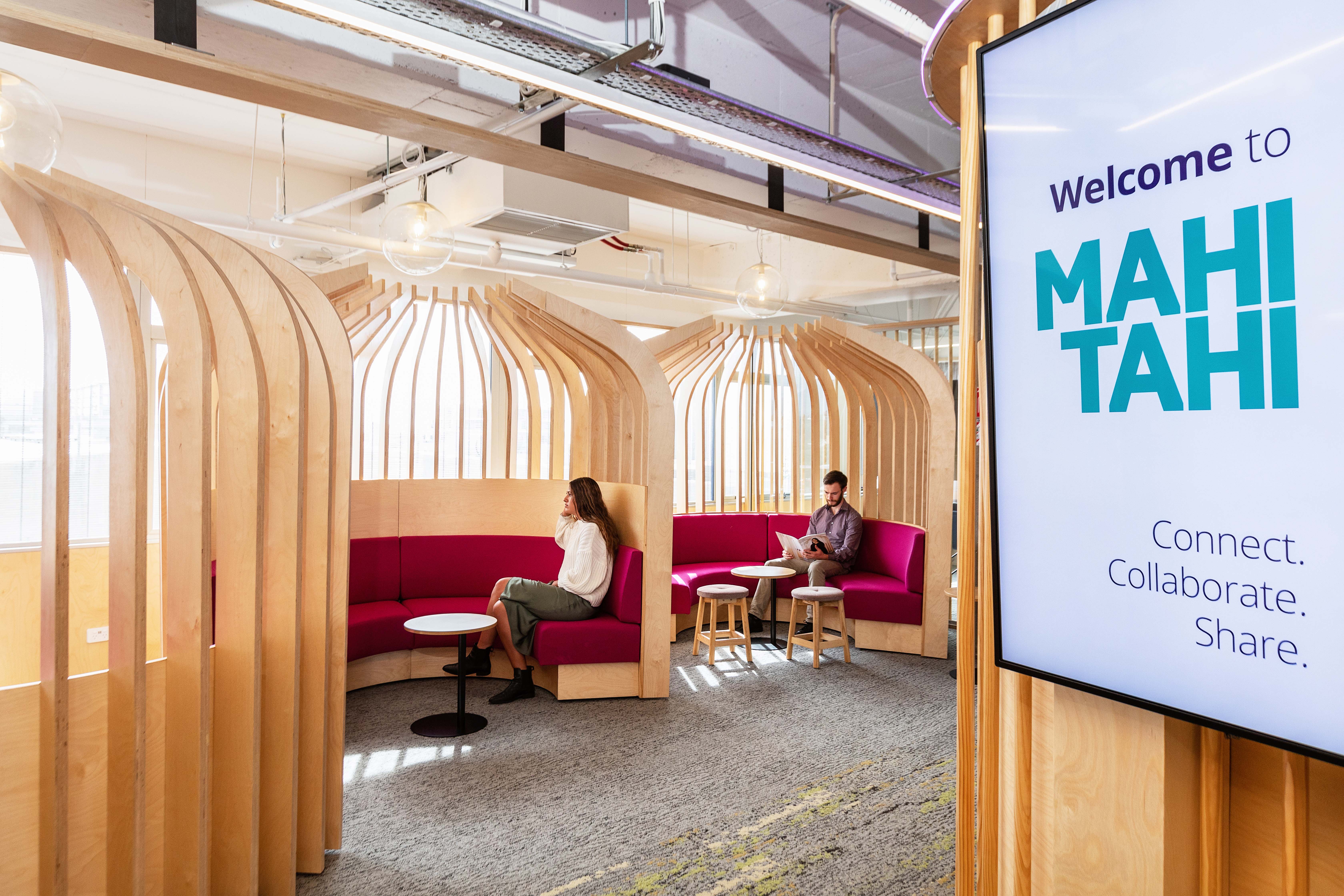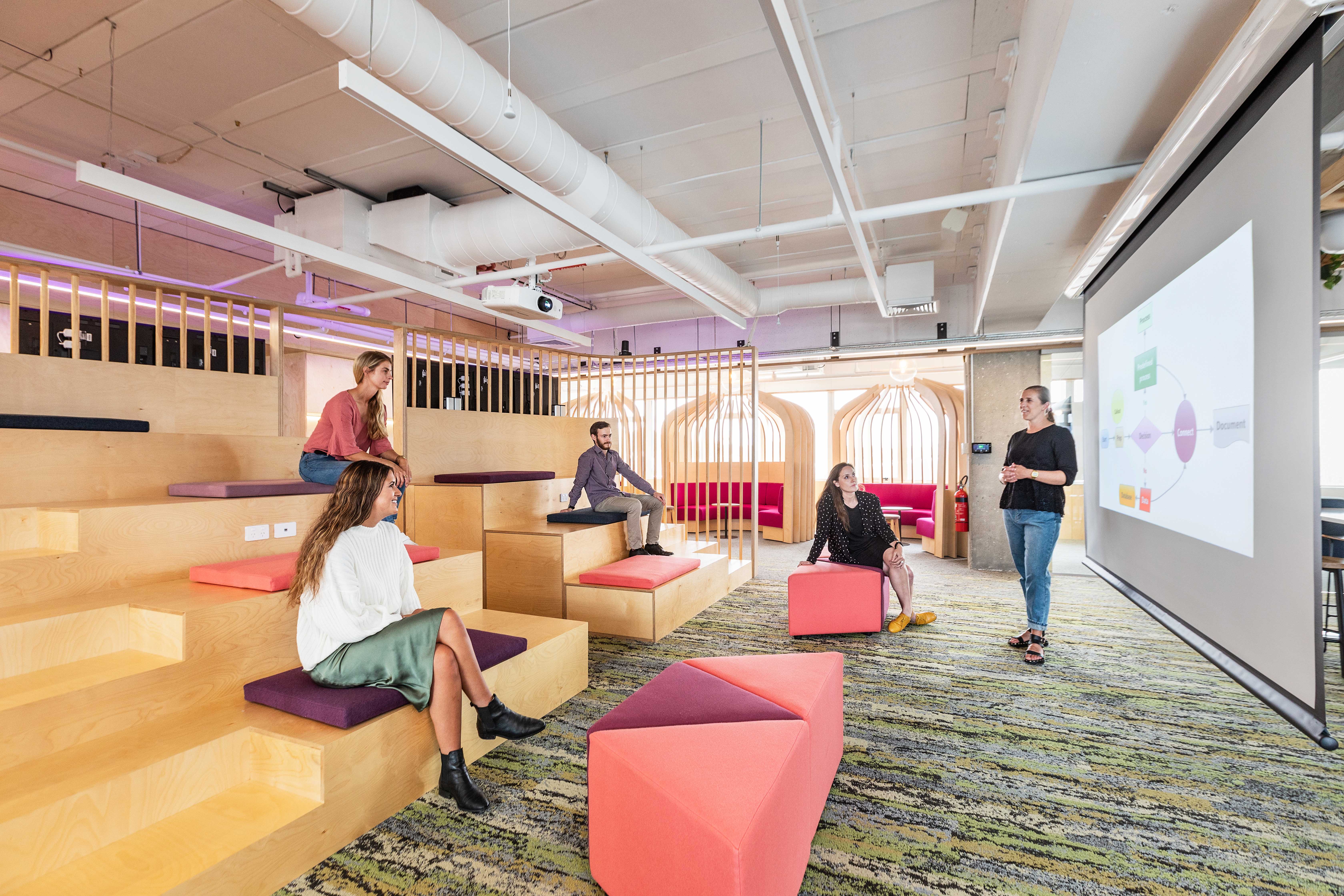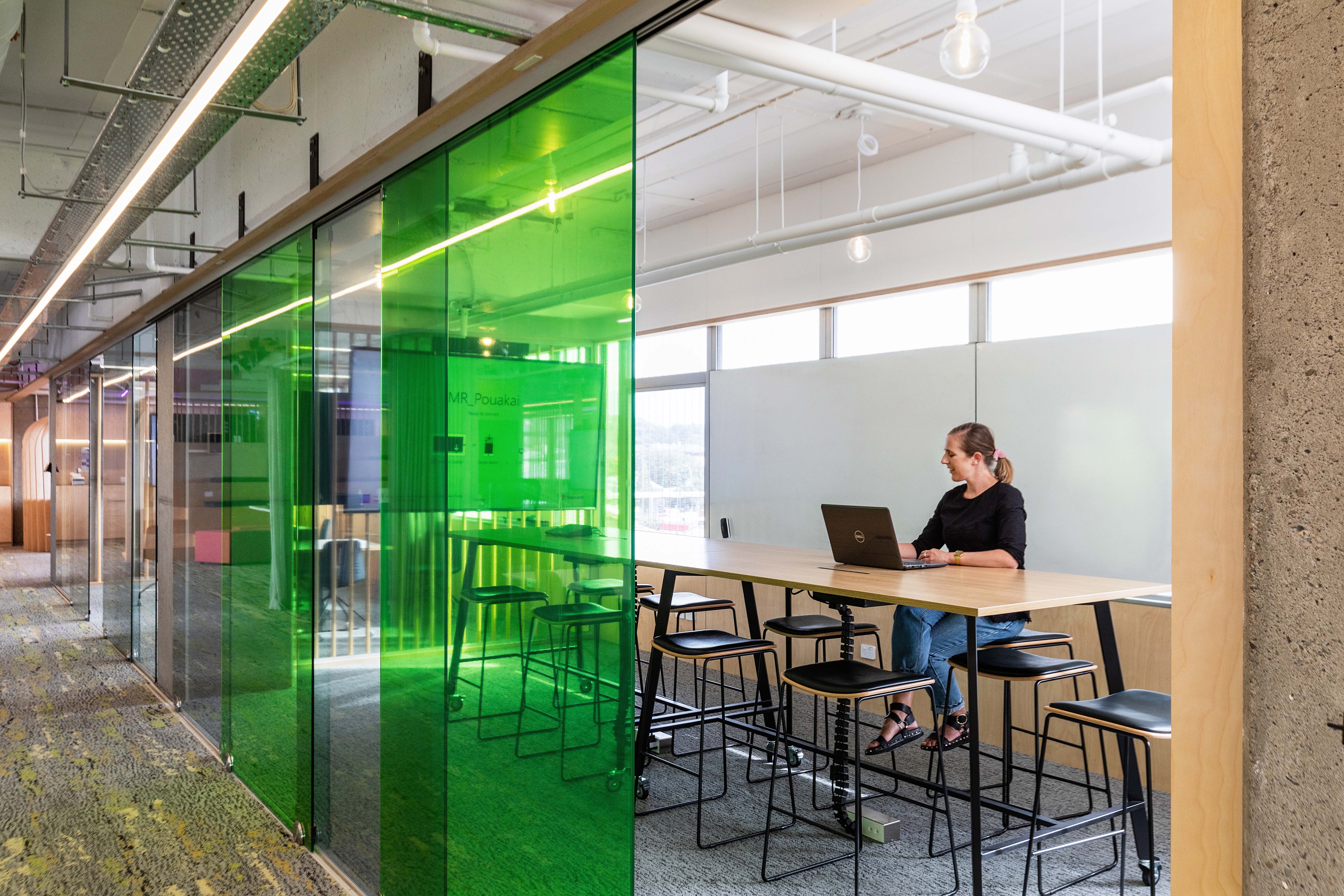 This vibrant and engaging space has transformed an ageing corporate interior into one that encourages a culture of connection, growth, and collaboration. The open office layout is carefully curated, with specialised ‘focus zones’ throughout; these areas successfully divide the space using colour and materiality, while maintaining a sense of transparency. The abundance of indoor plants and natural materials including timber, New Zealand wool and natural rubber, as well as glass to admit natural light, stimulates a sense of productivity and celebrates wellbeing.