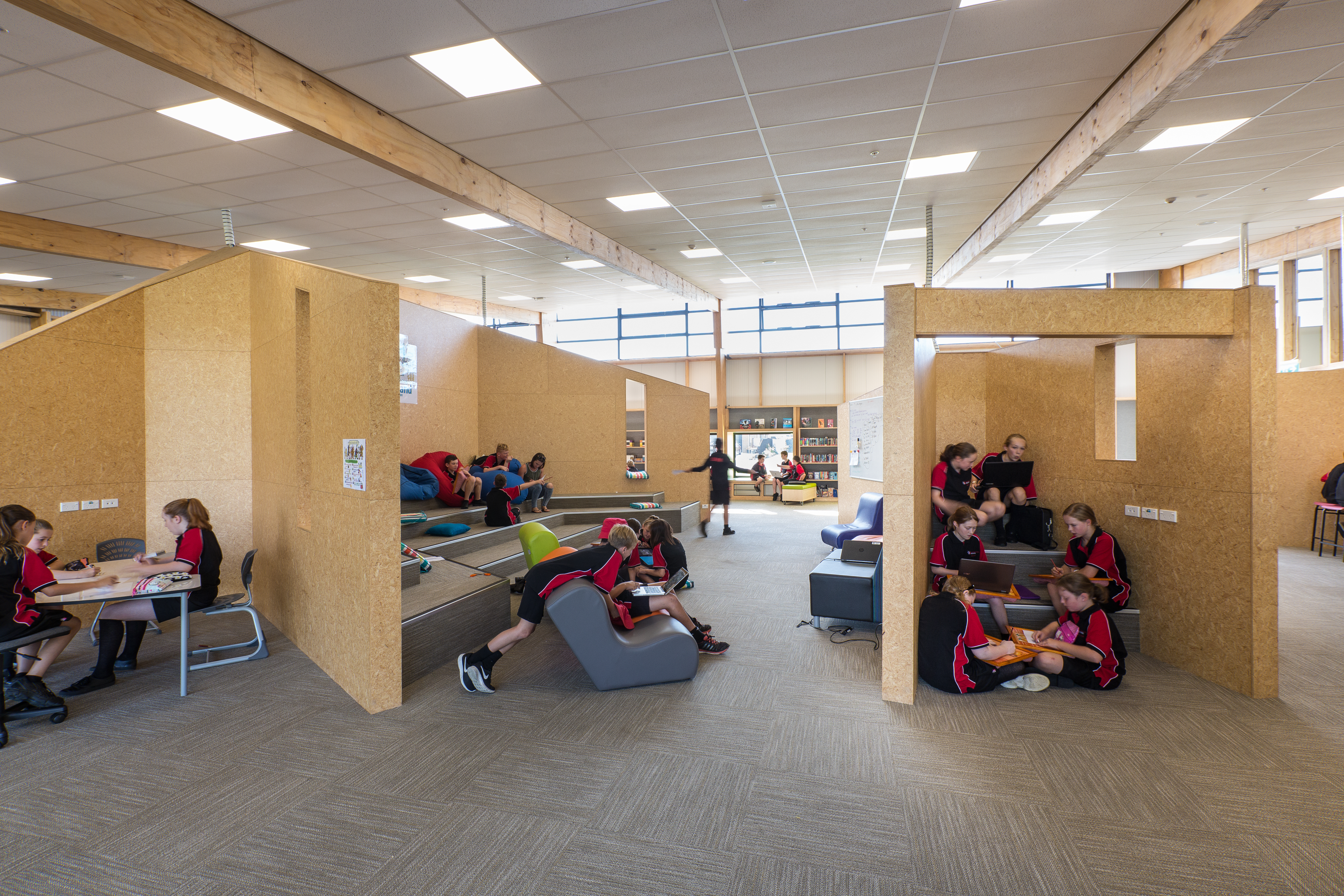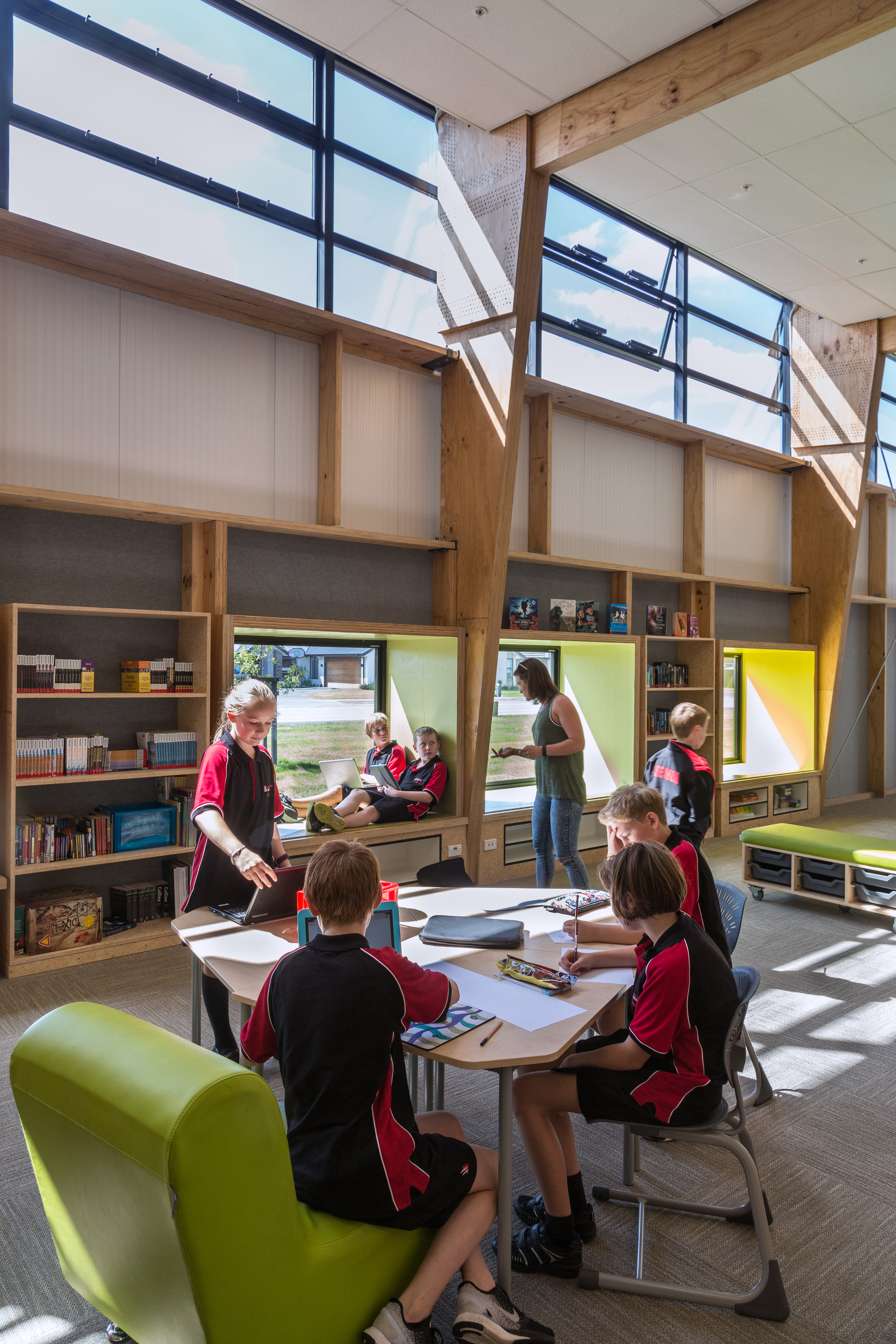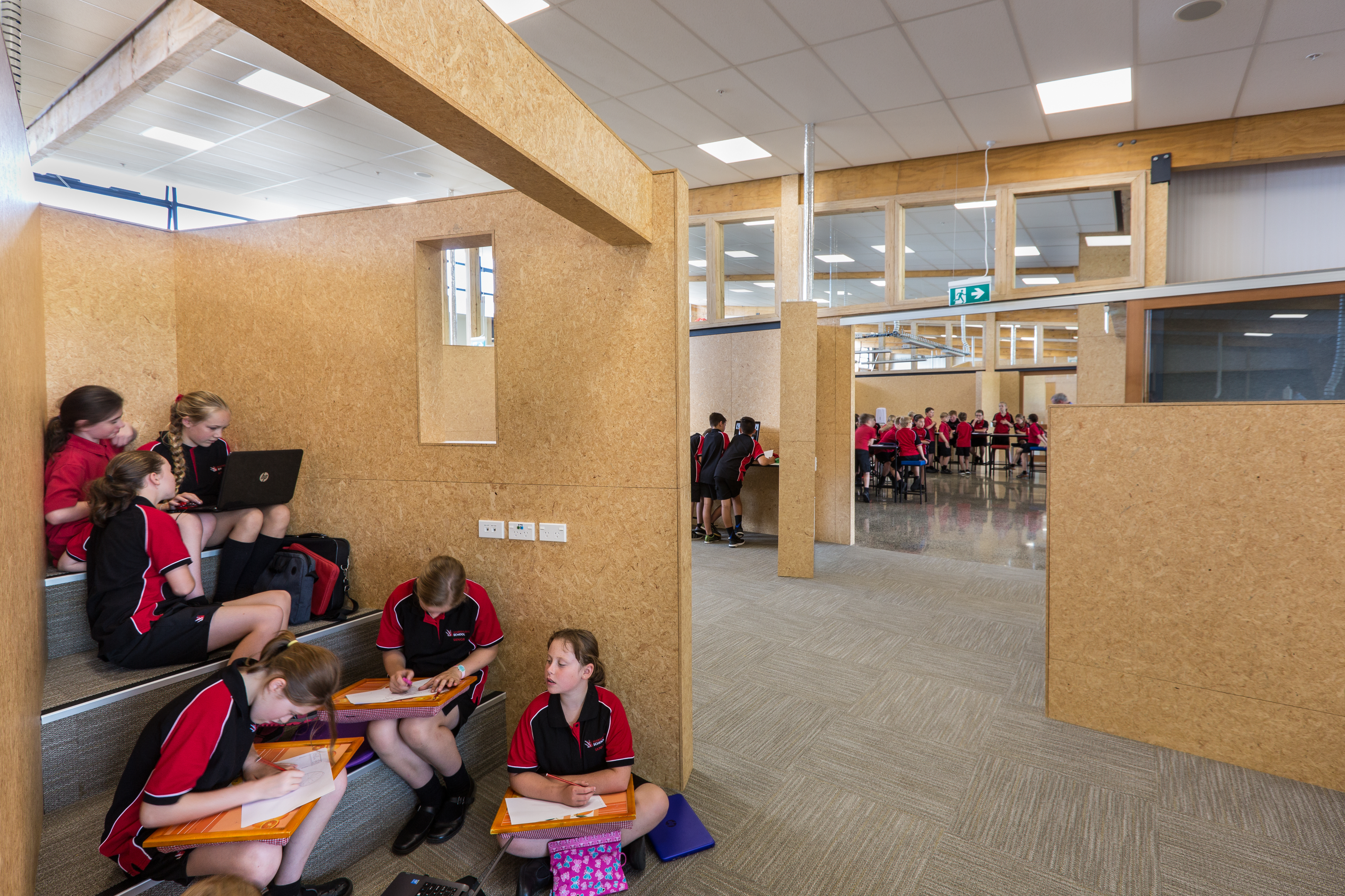 The relationship between the end-use client and architect was key to the success of this project. Ideas were able to be thoroughly tested and refined before being implemented. The simple forms and structure of the school are brought to life through the clever use of a restrained and robust palette of materials. The use of an LVL portal structure is efficient but also provides warmth, rhythm and scale appropriate to the children using the spaces. Shelving and window seats, or ‘Dream Boxes’, occupy the spaces between the portals connecting the learning spaces to the external world. Strandboard-clad ‘mountains’ provide a robust and fun organising structure within the open internal learning environment, defining the separate but connected spaces crucial to the pedagogies practised by the school.