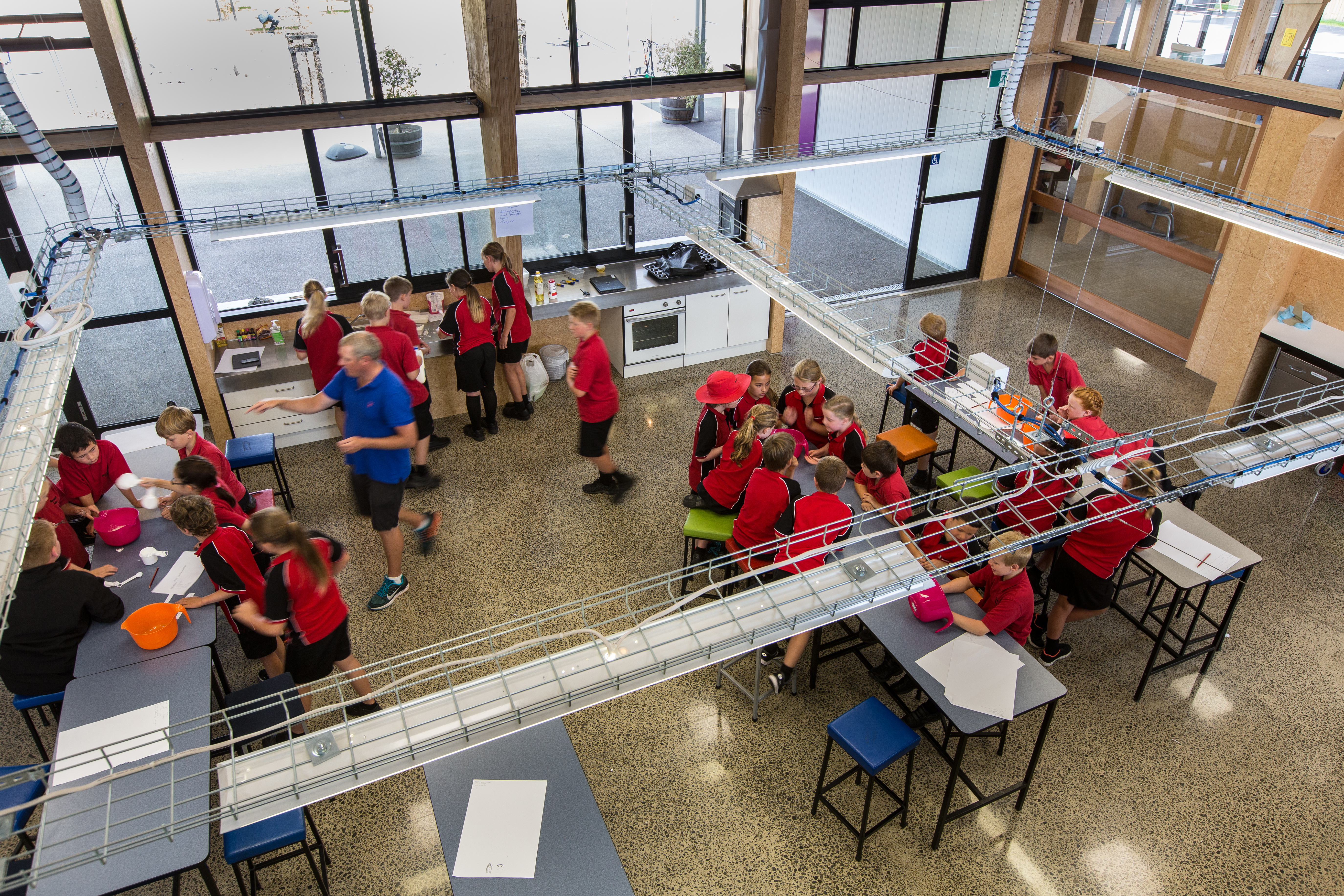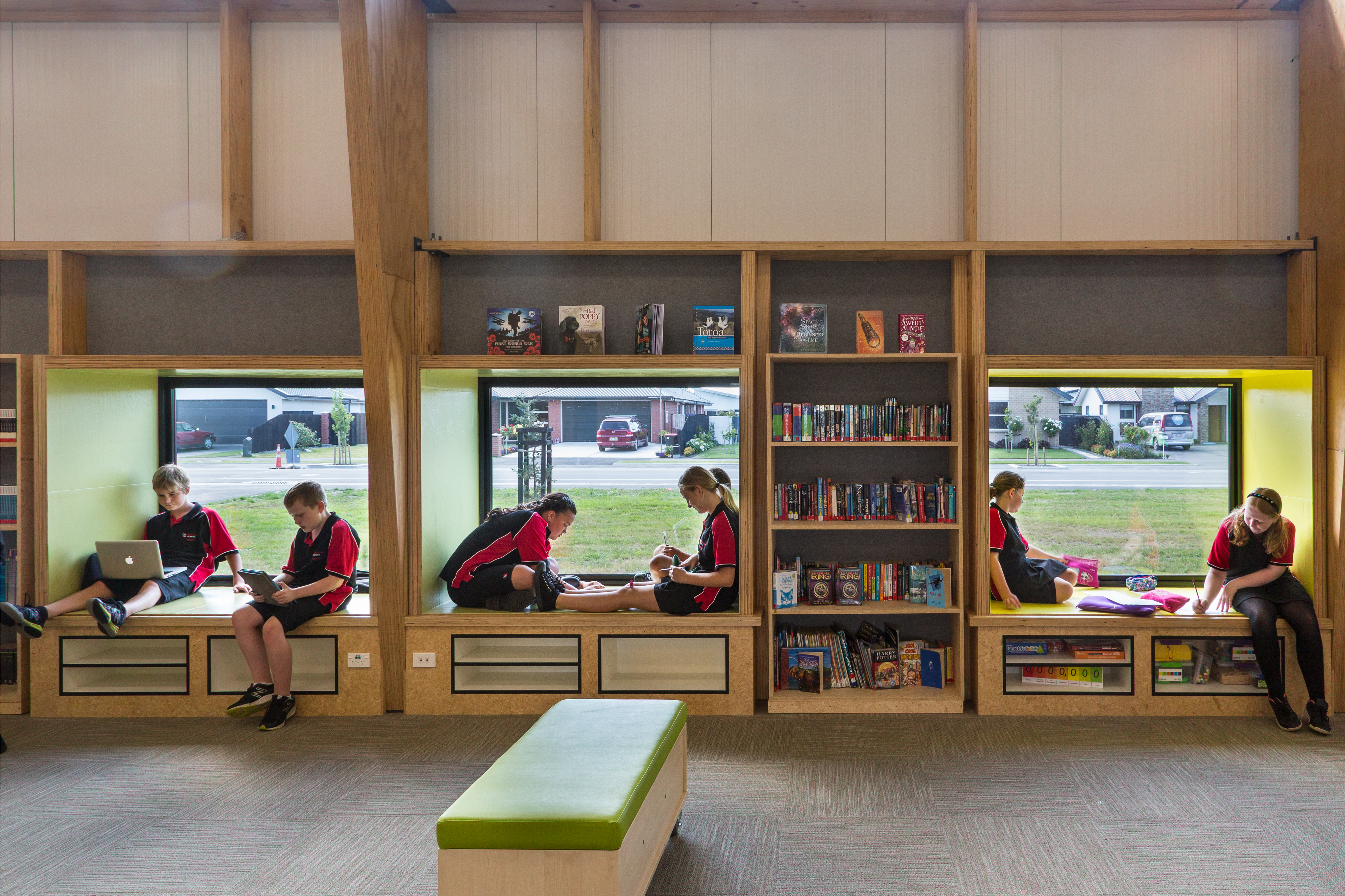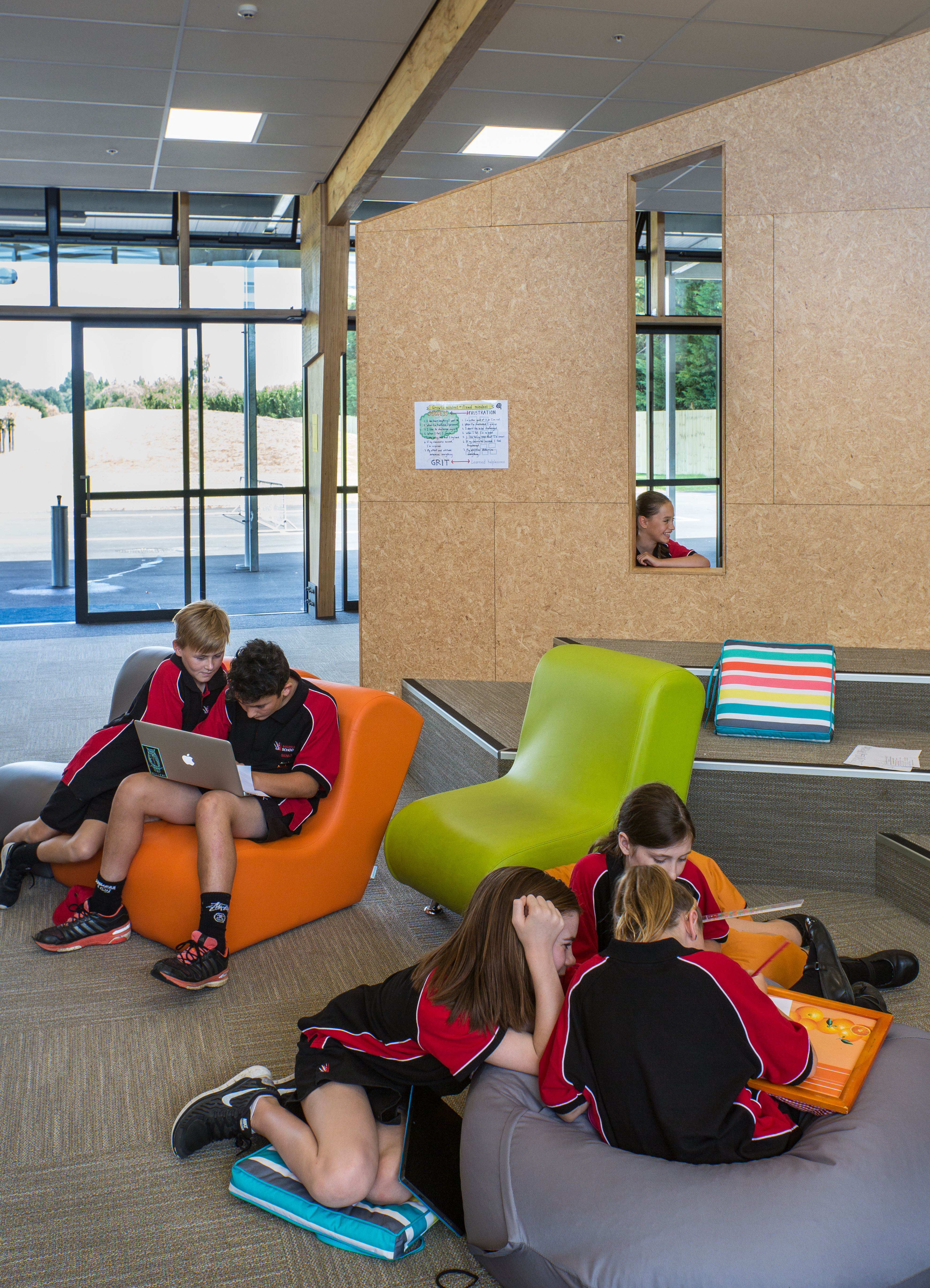 The relationship between the end-use client and architect was key to the success of this project. Ideas were able to be thoroughly tested and refined before being implemented. The simple forms and structure of the school are brought to life through the clever use of a restrained and robust palette of materials. The use of an LVL portal structure is efficient but also provides warmth, rhythm and scale appropriate to the children using the spaces. Shelving and window seats, or ‘Dream Boxes’, occupy the spaces between the portals connecting the learning spaces to the external world. Strandboard-clad ‘mountains’ provide a robust and fun organising structure within the open internal learning environment, defining the separate but connected spaces crucial to the pedagogies practised by the school.
