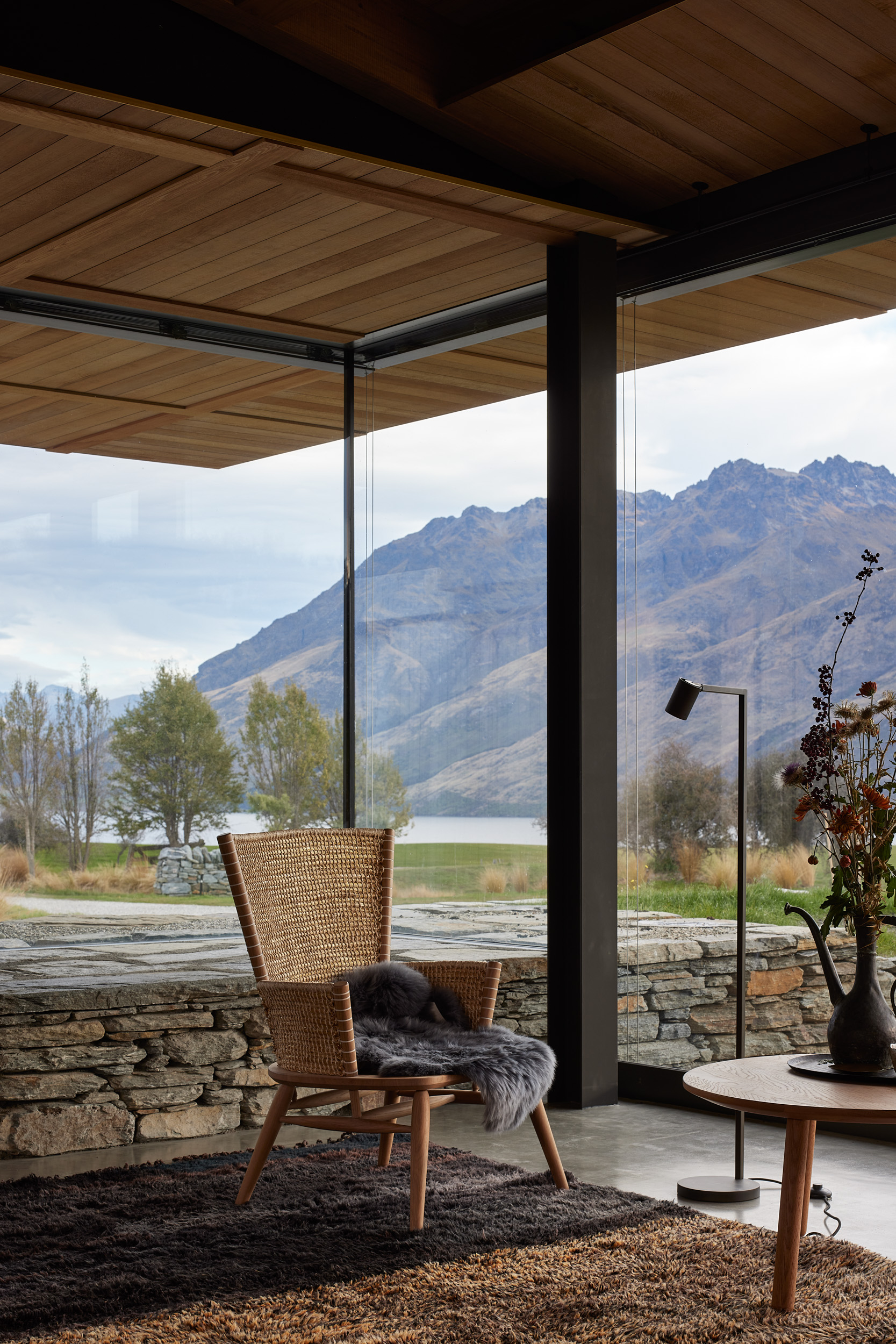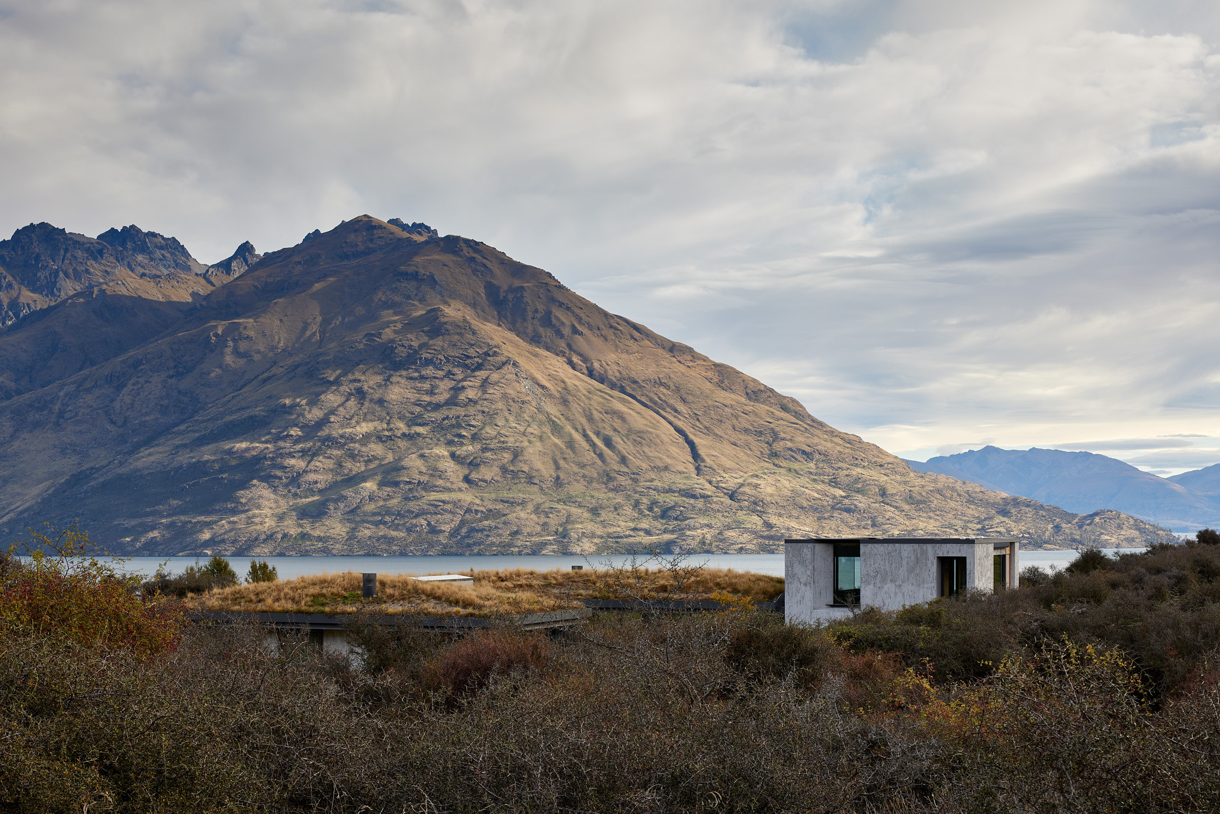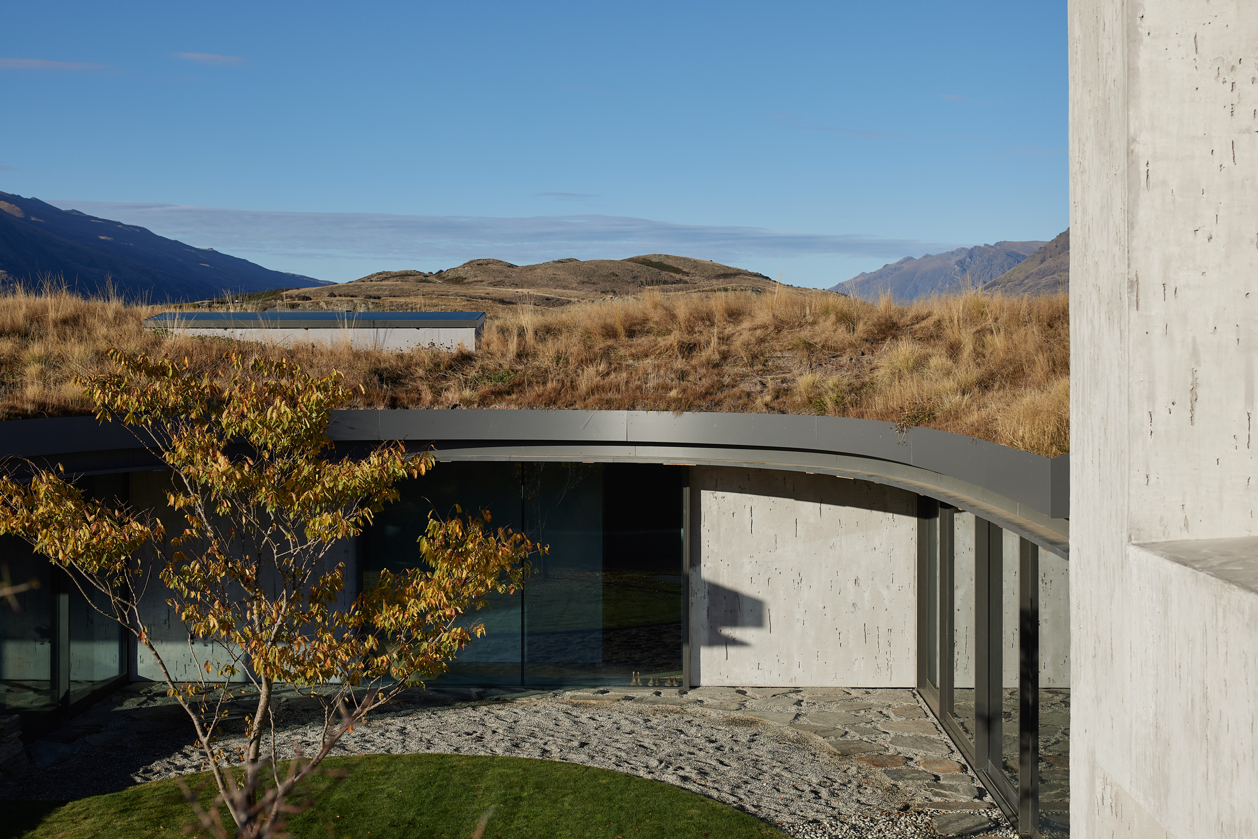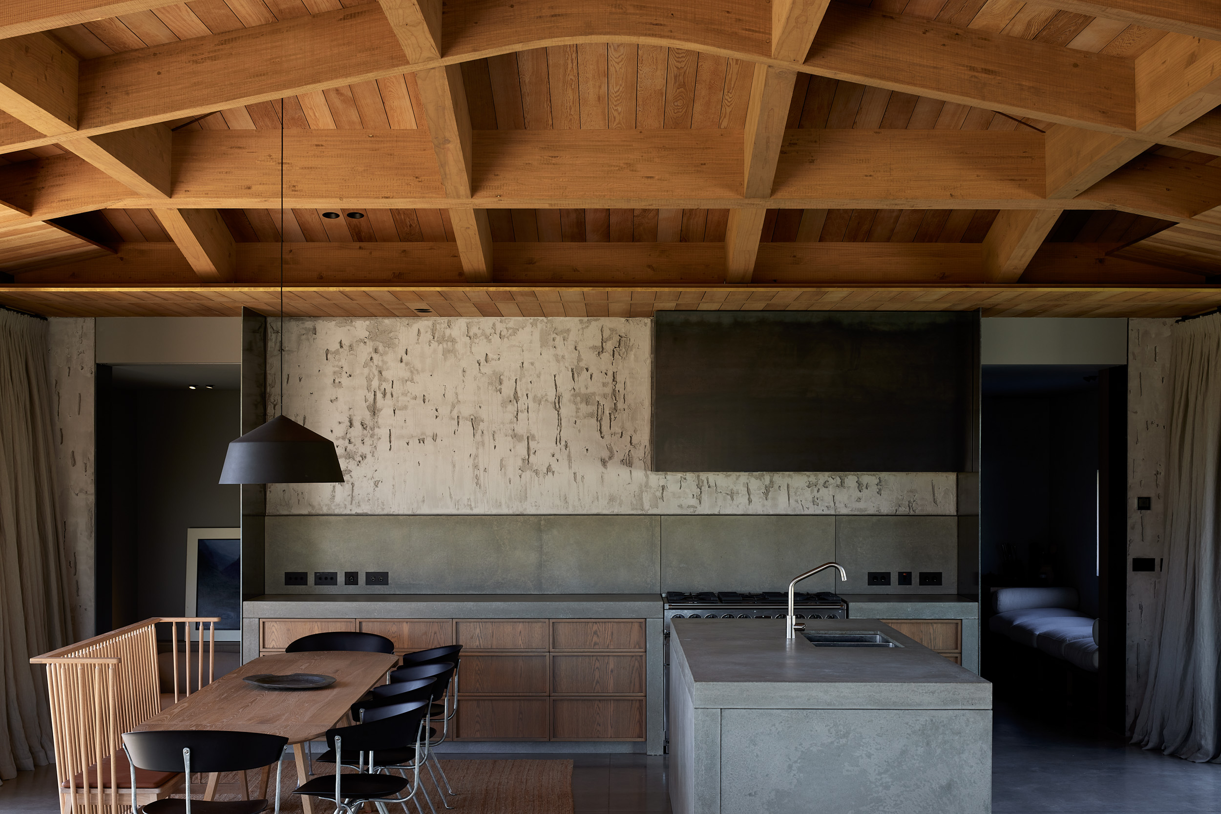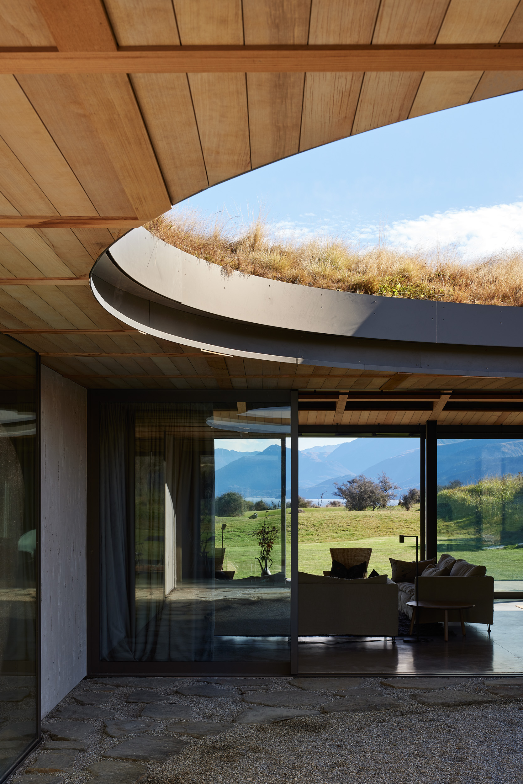 This impressive design is thorough in its consistency and subtlety. Considerate of the landscape, its low-lying form has a green roof that transitions from the hill behind. Walls, predominantly plaster or glazing, connect with the surroundings and support the flow from interior to exterior. The interior architecture, finishes and furnishings are similar or the same as the exterior and the coffered timber ceiling is a notable addition. Although sophisticated, the result feels unpretentious due to its refined detailing.
