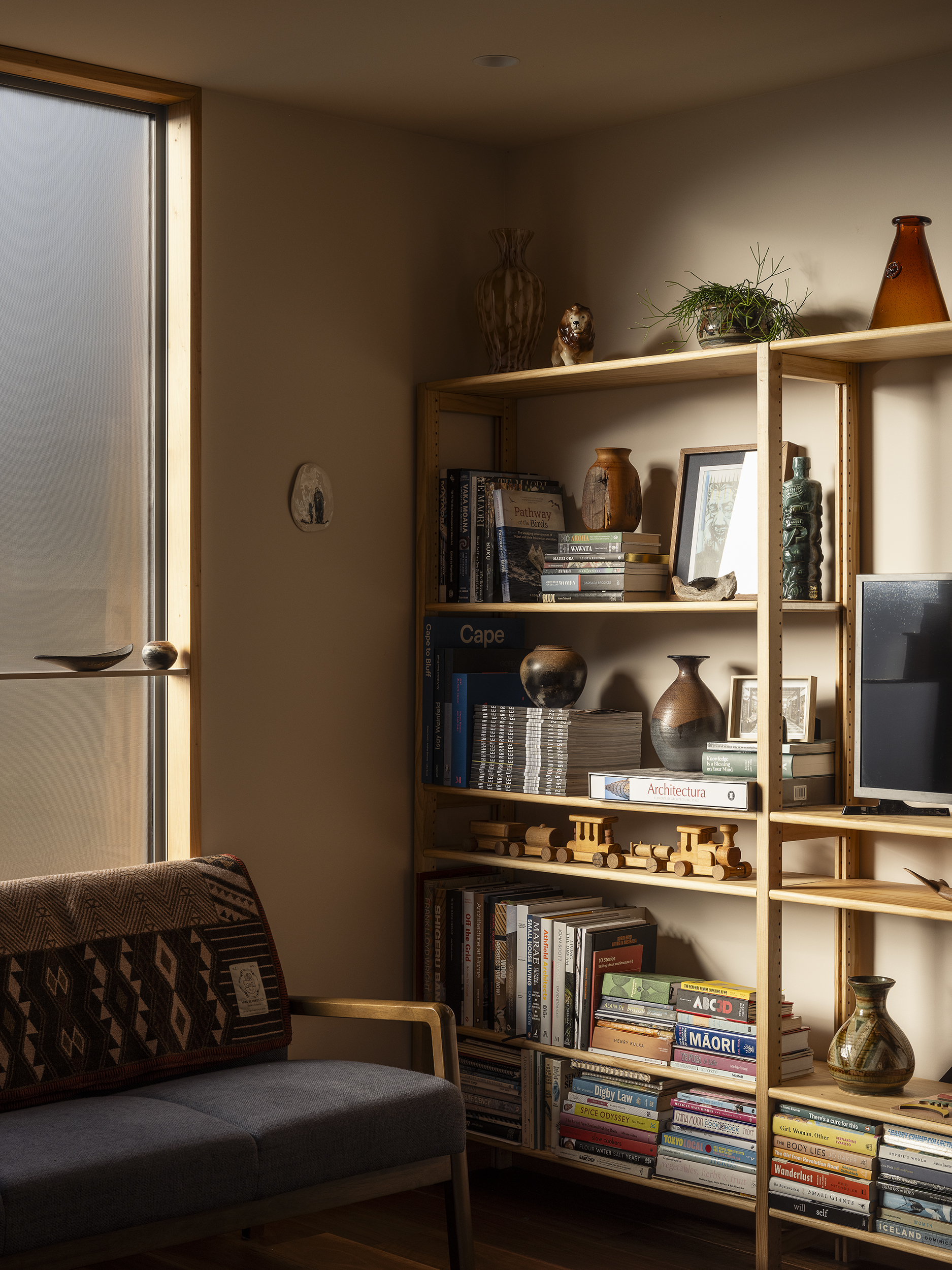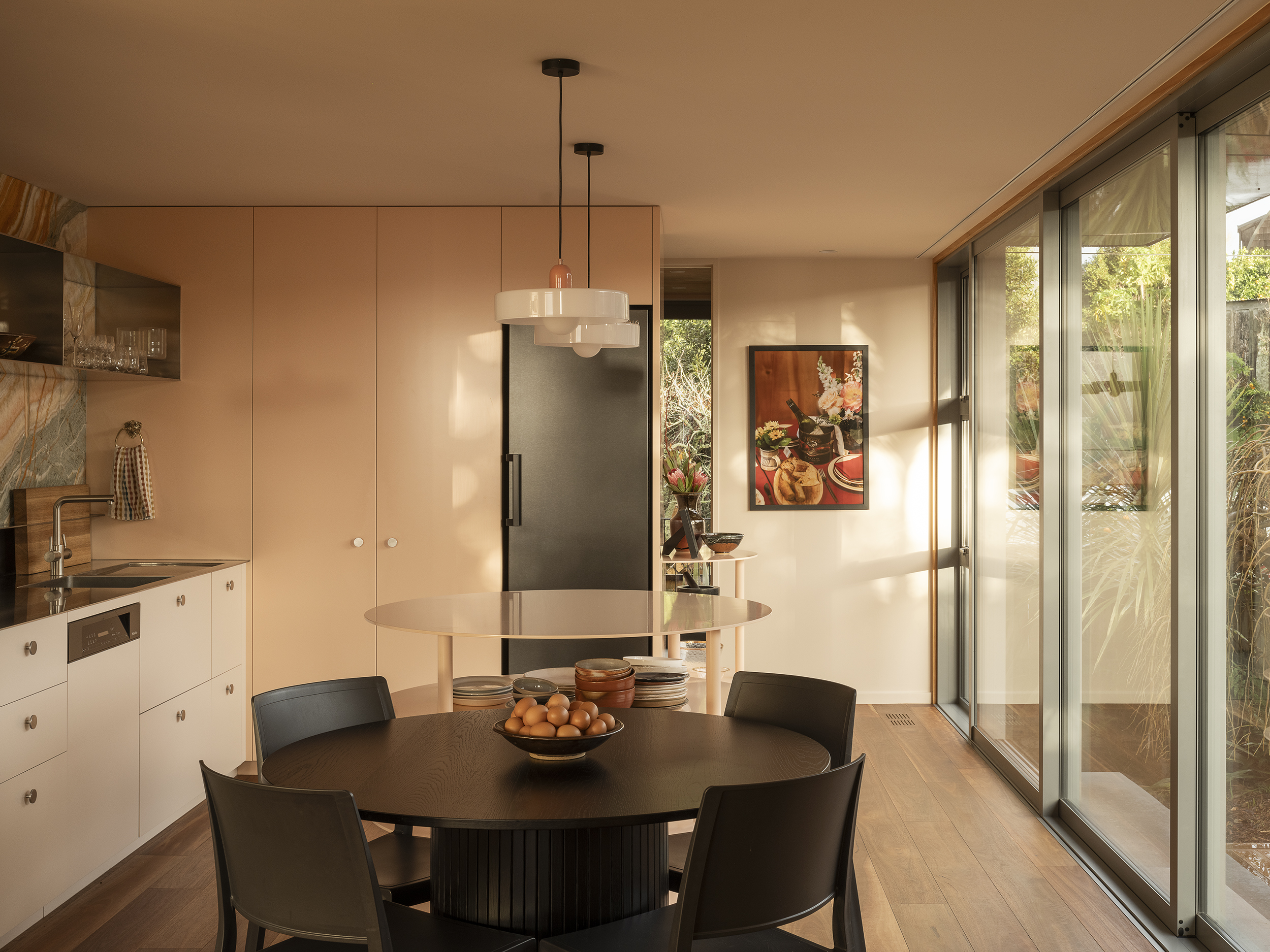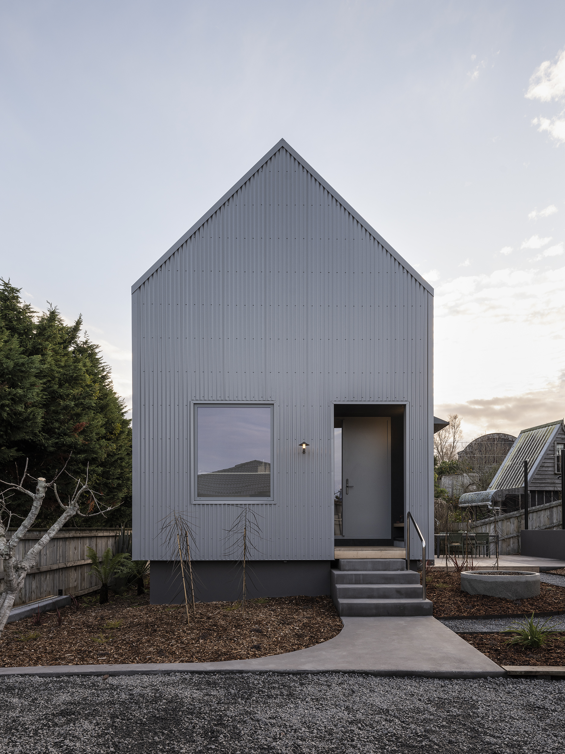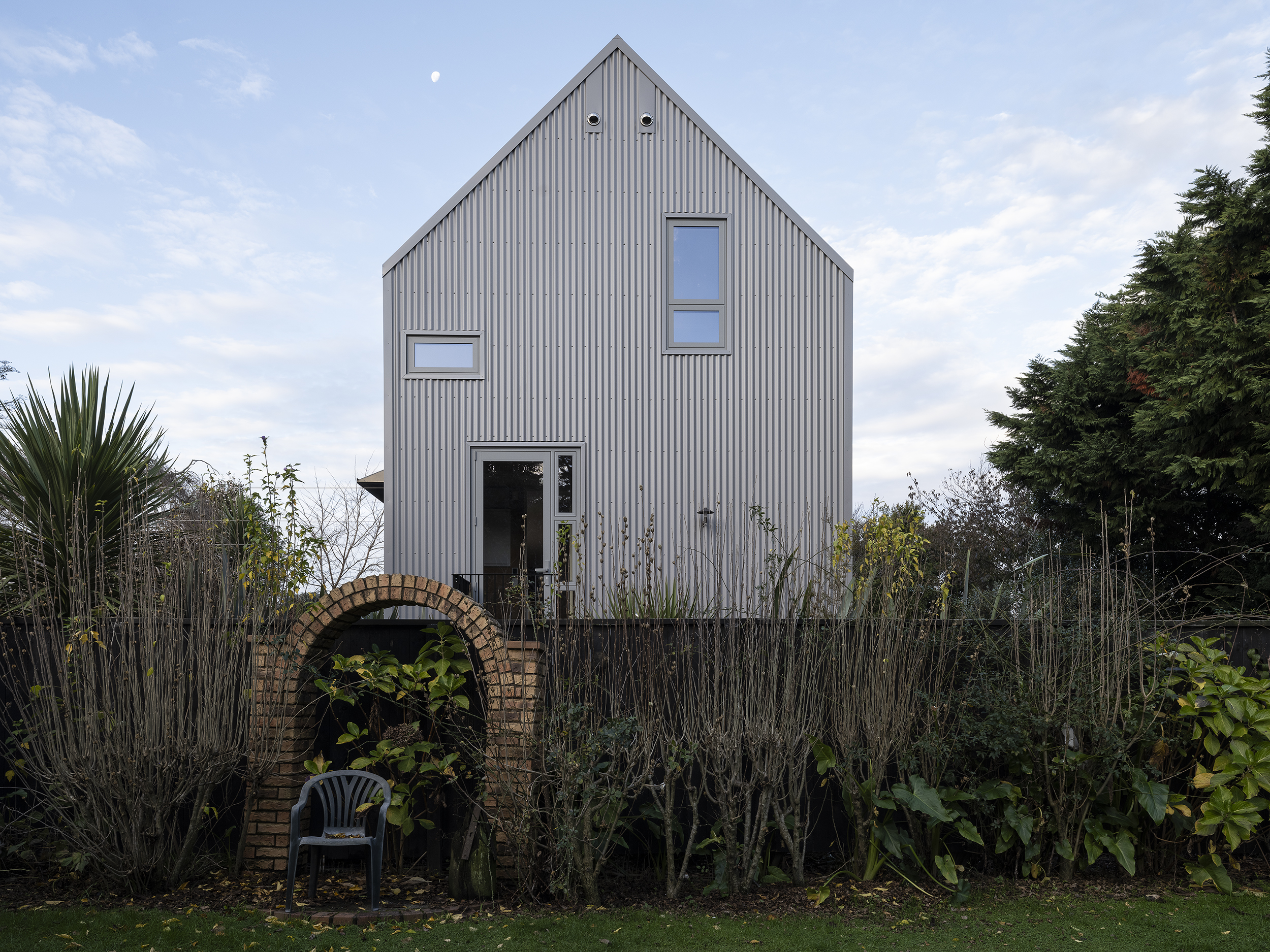 Matuku Moana is an urban haven on a busy road for the architect and his young family. The home’s thoughtful placement on the site allows a sun-filled sunken courtyard to feel private, connected to the trees, and is integral to the home’s success. Its deceptively simple form is highly detailed and well-considered on a cost-conscious budget. Downstairs is open and spacious and connected to the sun-drenched courtyard and upstairs has a more cocooned and retreat-like atmosphere. This is all created by clever proportions, use of materials and a concise layout. Matuku Moana has most successfully achieved a true compound-like oasis in suburbia.
