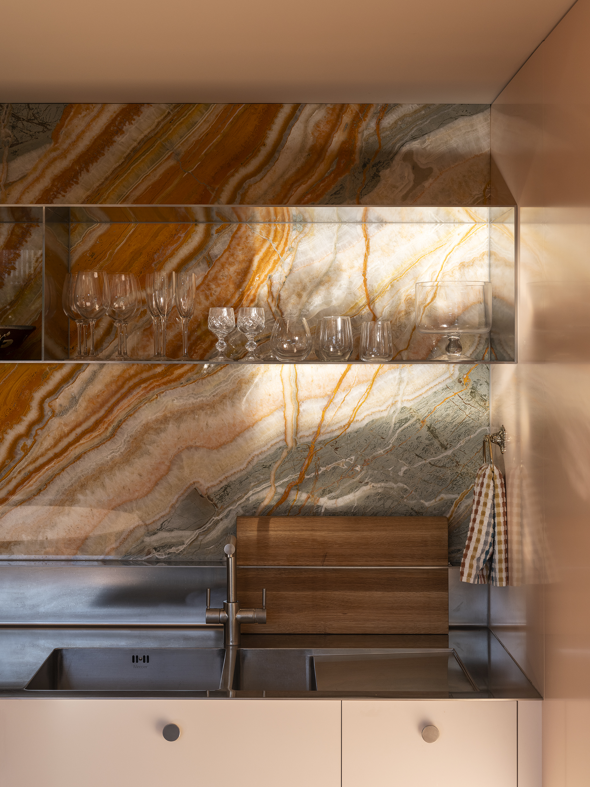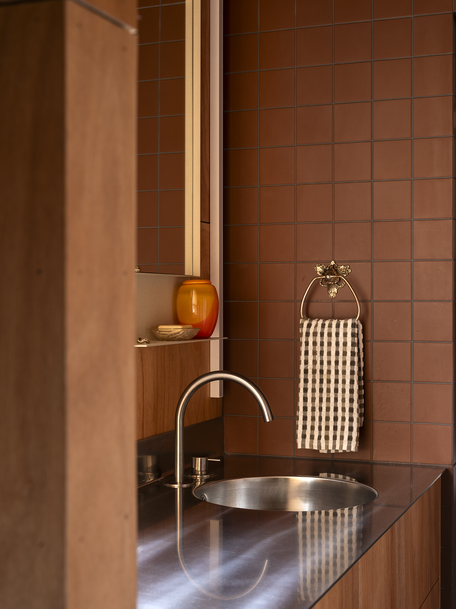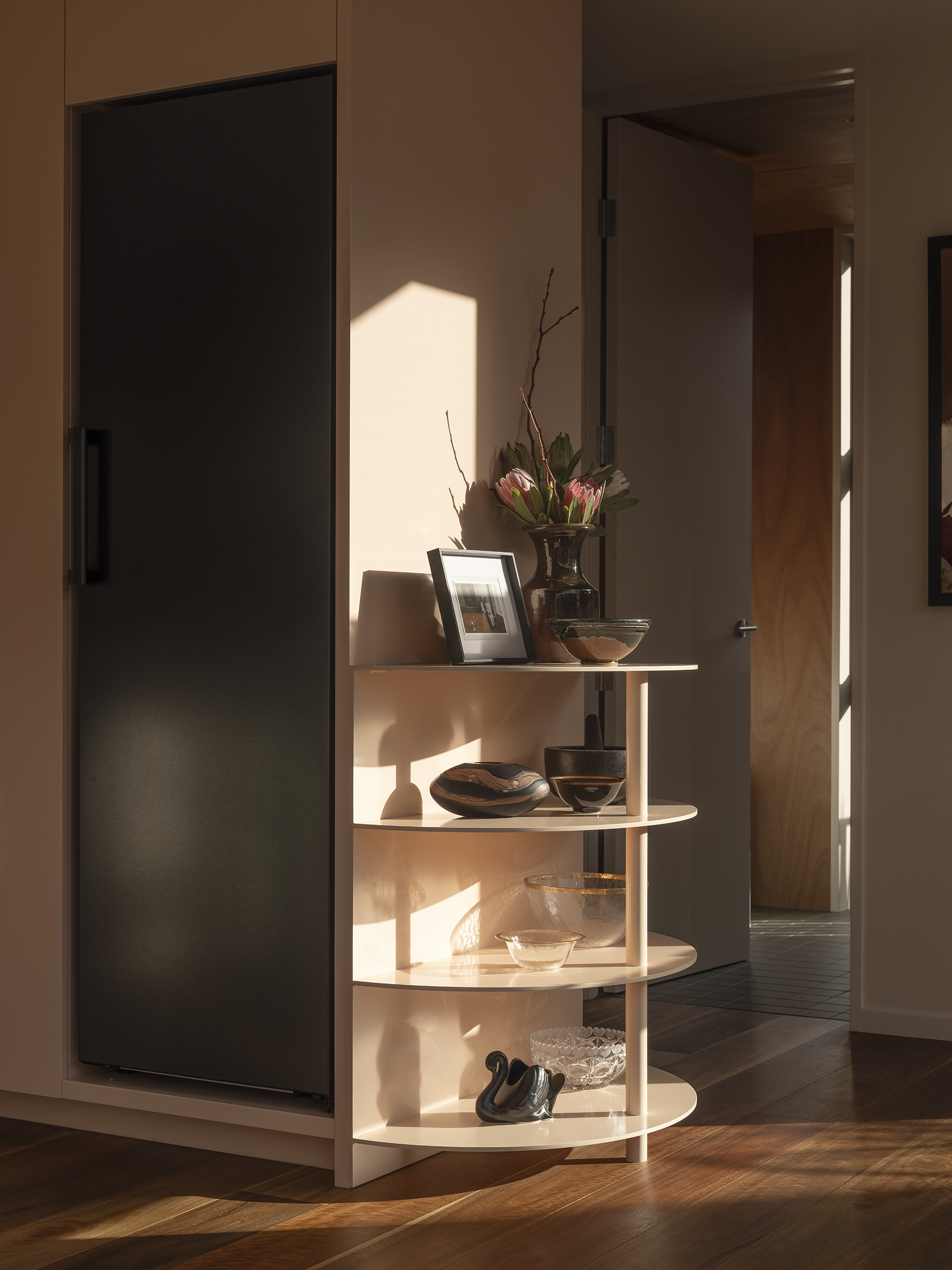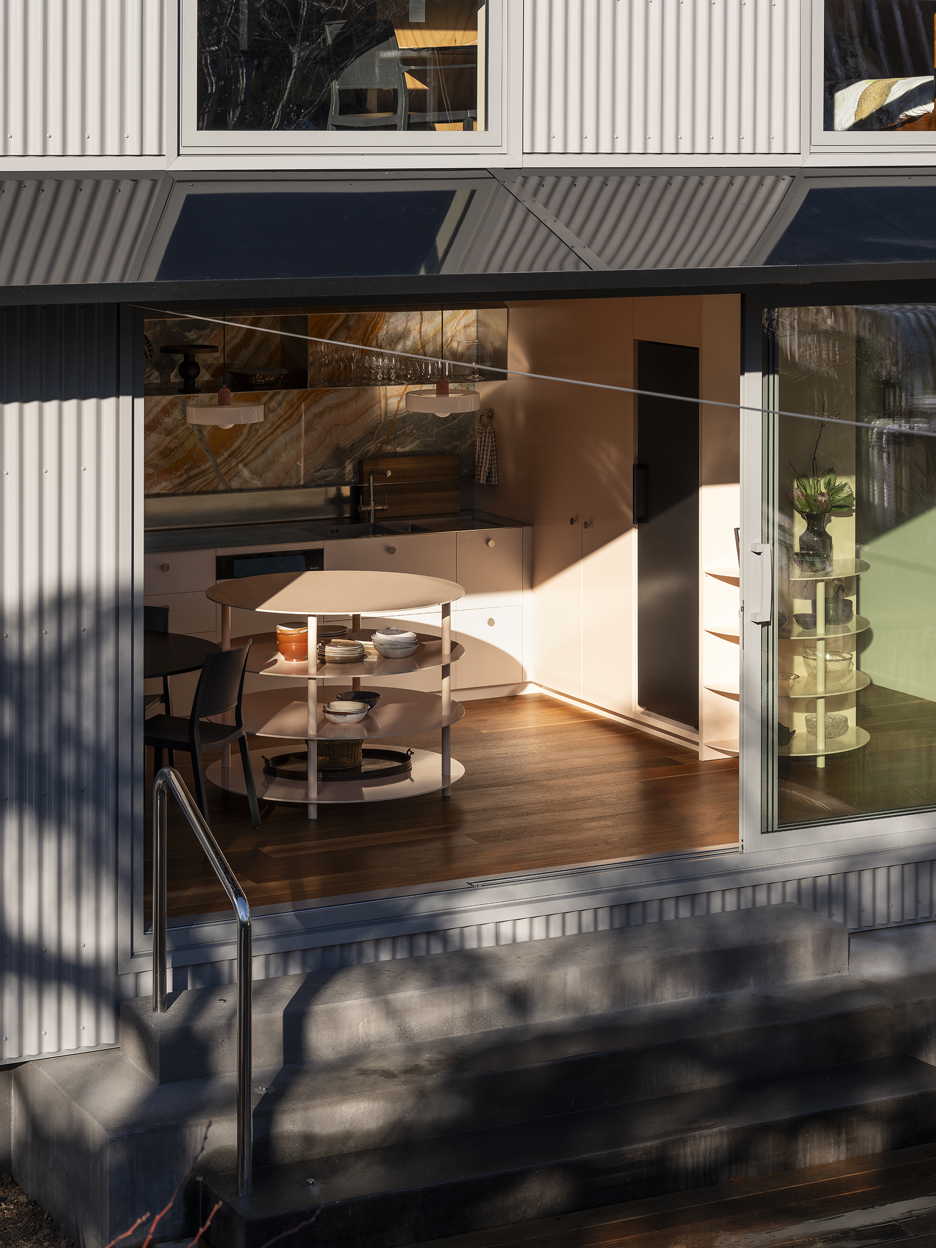 Matuku Moana is an urban haven on a busy road for the architect and his young family. The home’s thoughtful placement on the site allows a sun-filled sunken courtyard to feel private, connected to the trees, and is integral to the home’s success. Its deceptively simple form is highly detailed and well-considered on a cost-conscious budget. Downstairs is open and spacious and connected to the sun-drenched courtyard and upstairs has a more cocooned and retreat-like atmosphere. This is all created by clever proportions, use of materials and a concise layout. Matuku Moana has most successfully achieved a true compound-like oasis in suburbia.