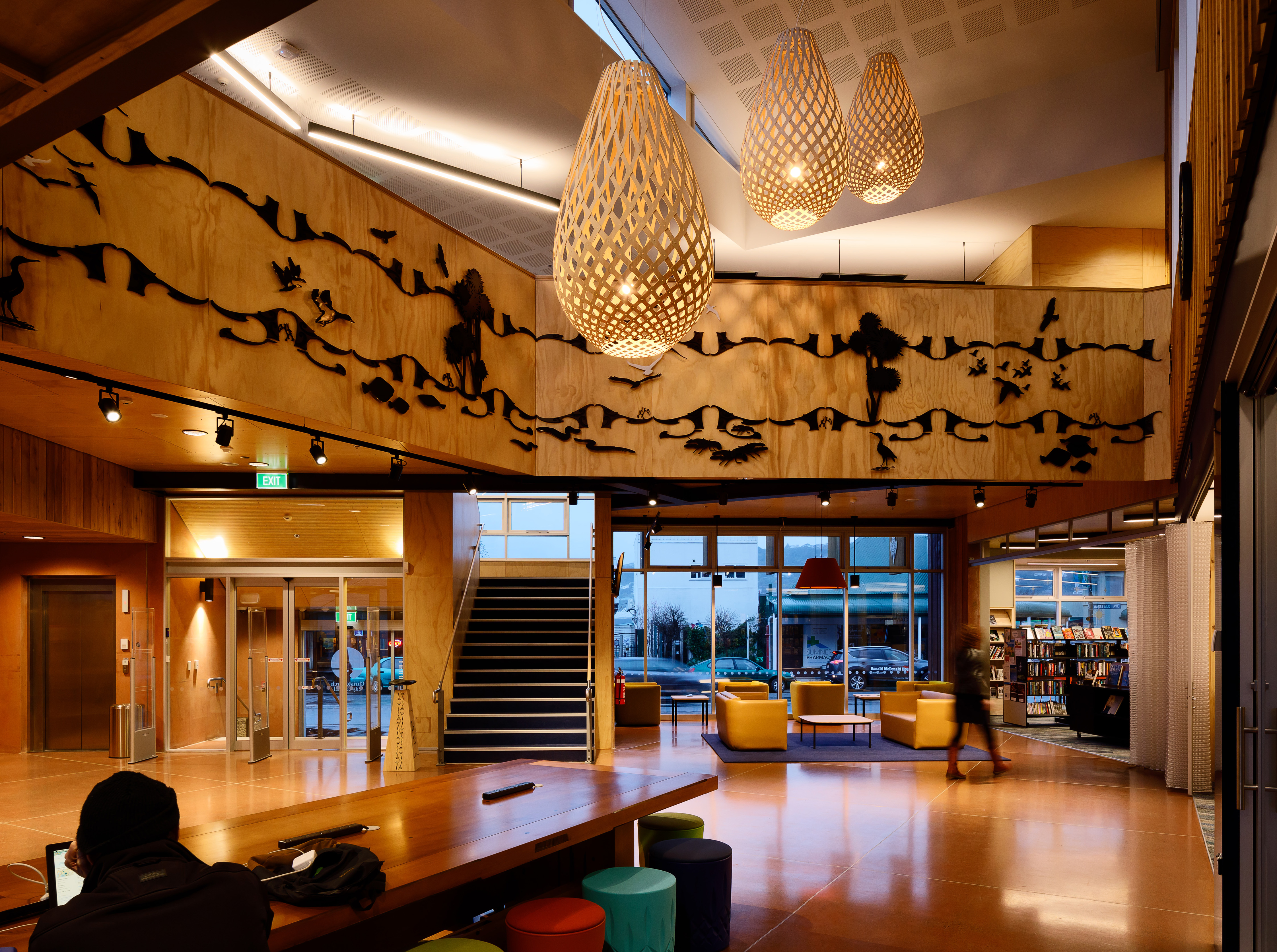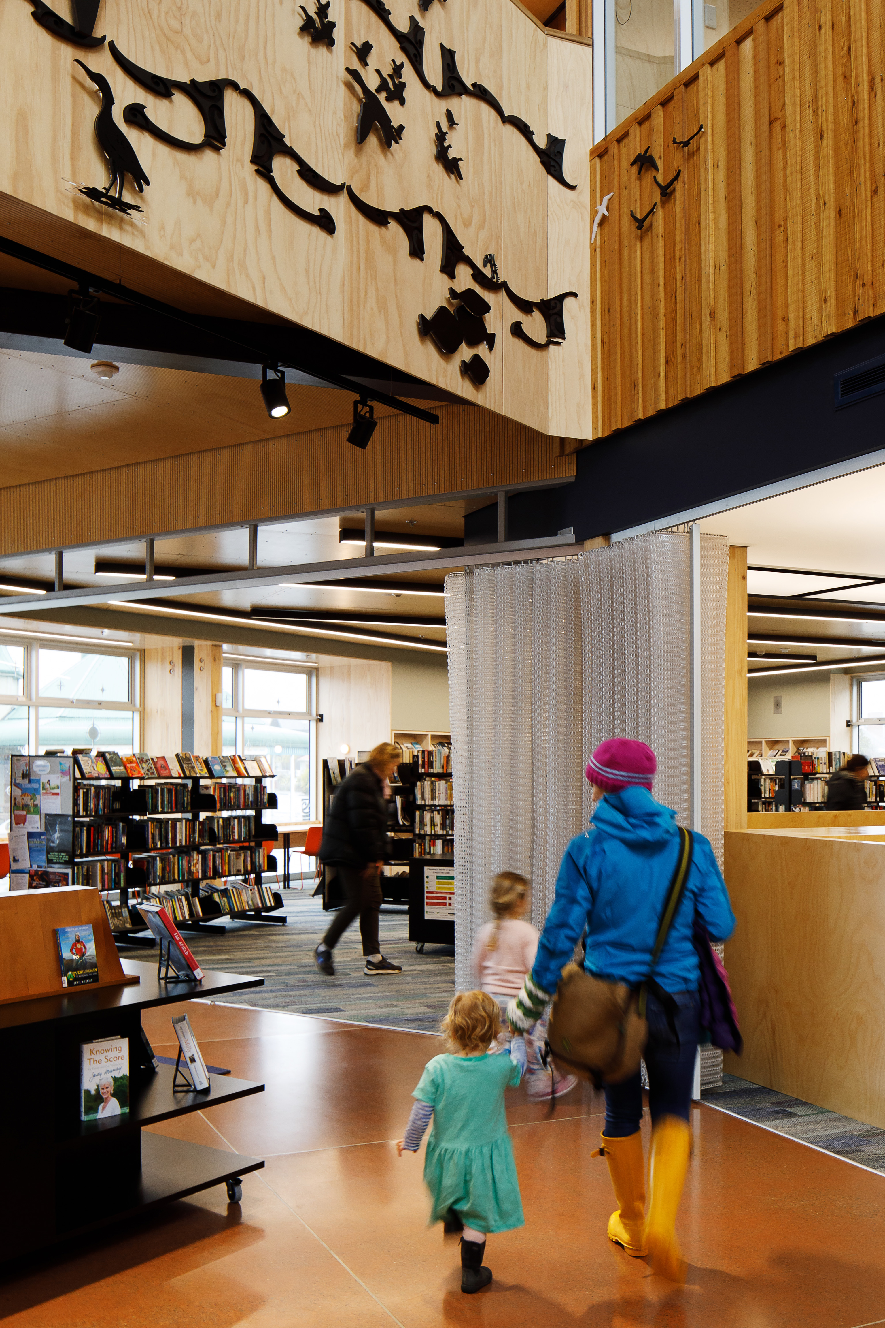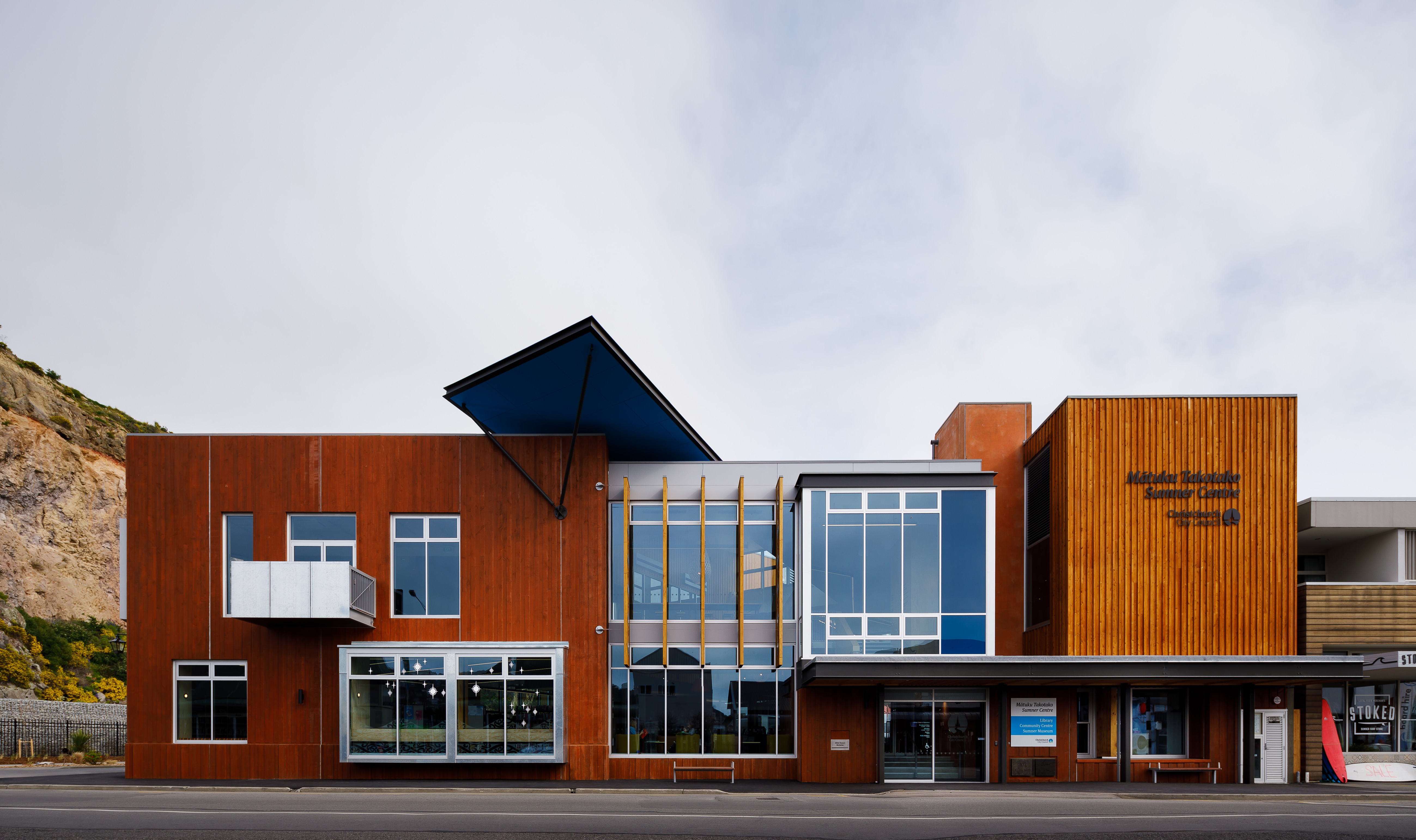 Matuku Takotako: Sumner Centre is a new facility – influenced by the community but civic in scale – that replaces three pre-quake buildings. The new library is precedent-setting for Christchurch, breaking down the traditional threshold to include adjacent public spaces, while inviting the community to their new living room. Issues of scale have been addressed via form and materiality, with rust oxide-coloured concrete responding to the volcanic cliff backdrop and larch battens reflecting the weathered coastal environment. Building hard to the street corner references the volume of a demolished predecessor building; communal memory is further respected in the adaptive re-use of salvaged elements including a war memorial roll. Adjacent street furniture and public transport infrastructure have been integrated into the overall design.