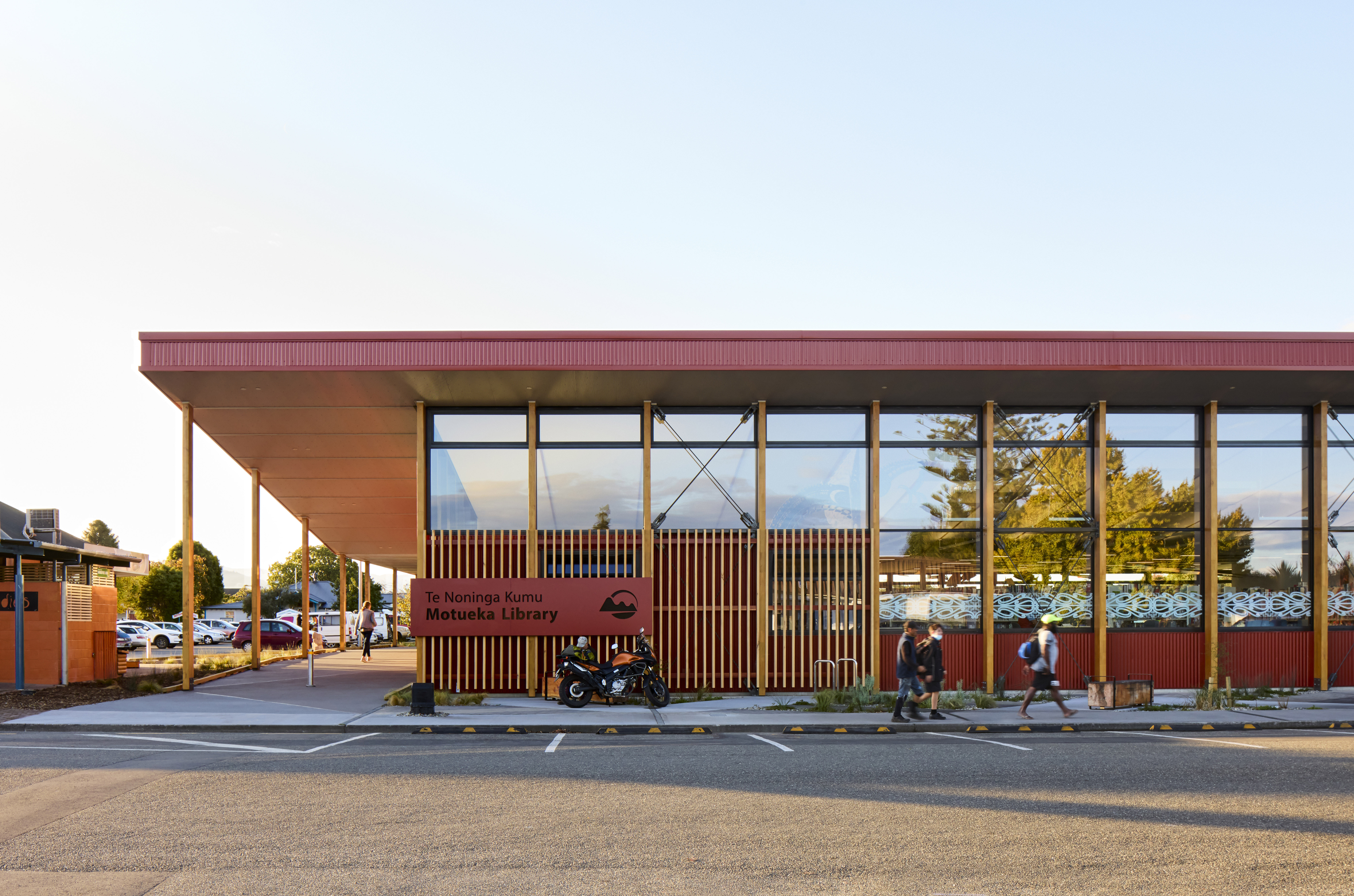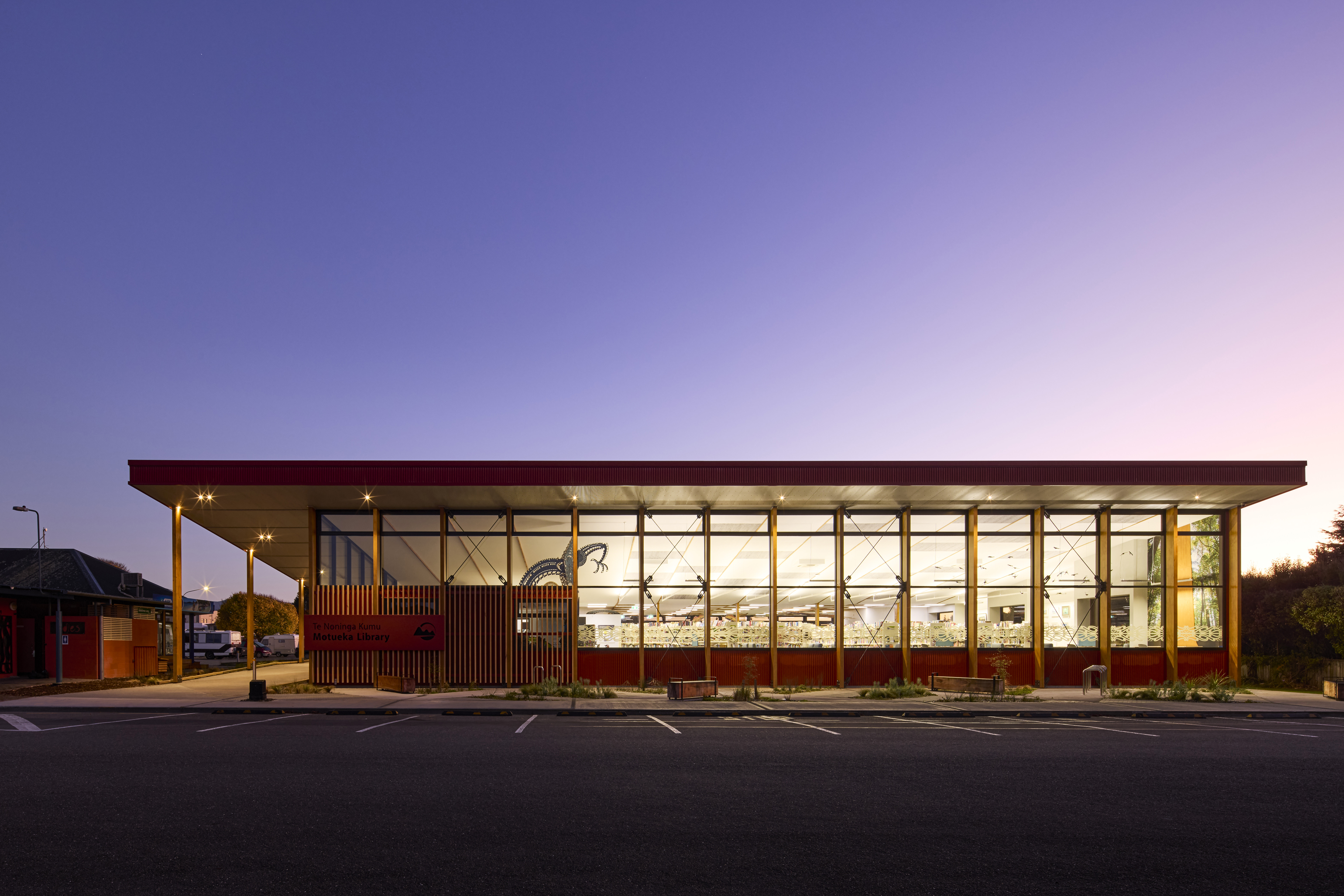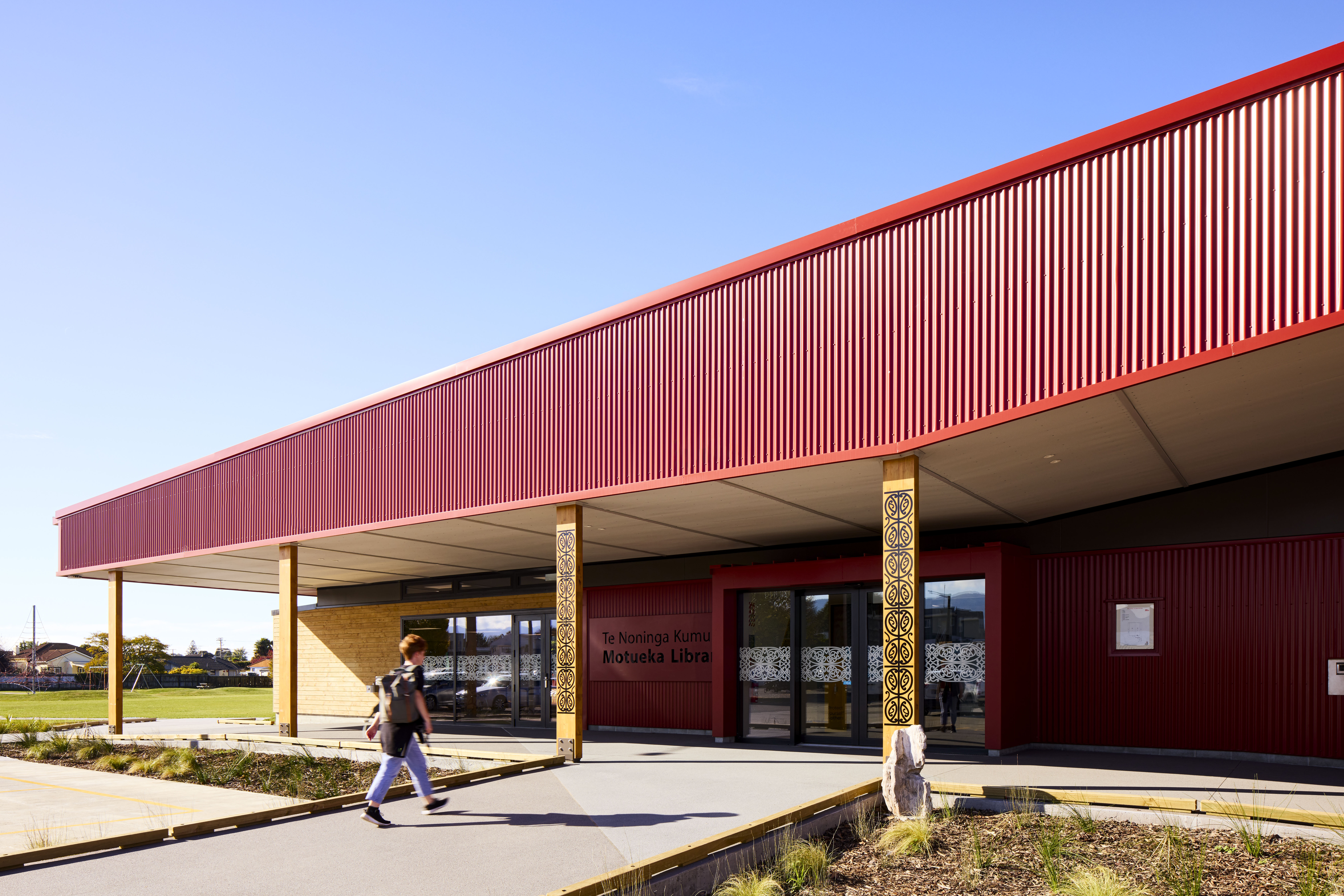 Essentially a building in the round, the Motueka Library responds effectively to its suburban setting. The exposed laminated timber structure activates the street edge, while the response to the public domain is more intimate. Punched window openings give glimpses through to the adjacent Japanese gardens and bi-fold doors lead to exterior reading decks. Toi Māori throughout brings visibility to mana whenua and enhances a sense of place and community connection. Robust external detailing, cladding and roofing reflect the nature of the community’s agricultural roots. Photovoltaic panels and natural ventilation are used effectively to manage operational efficiencies, and the judicious choice of materials has contributed to an uncomplicated interior finish.