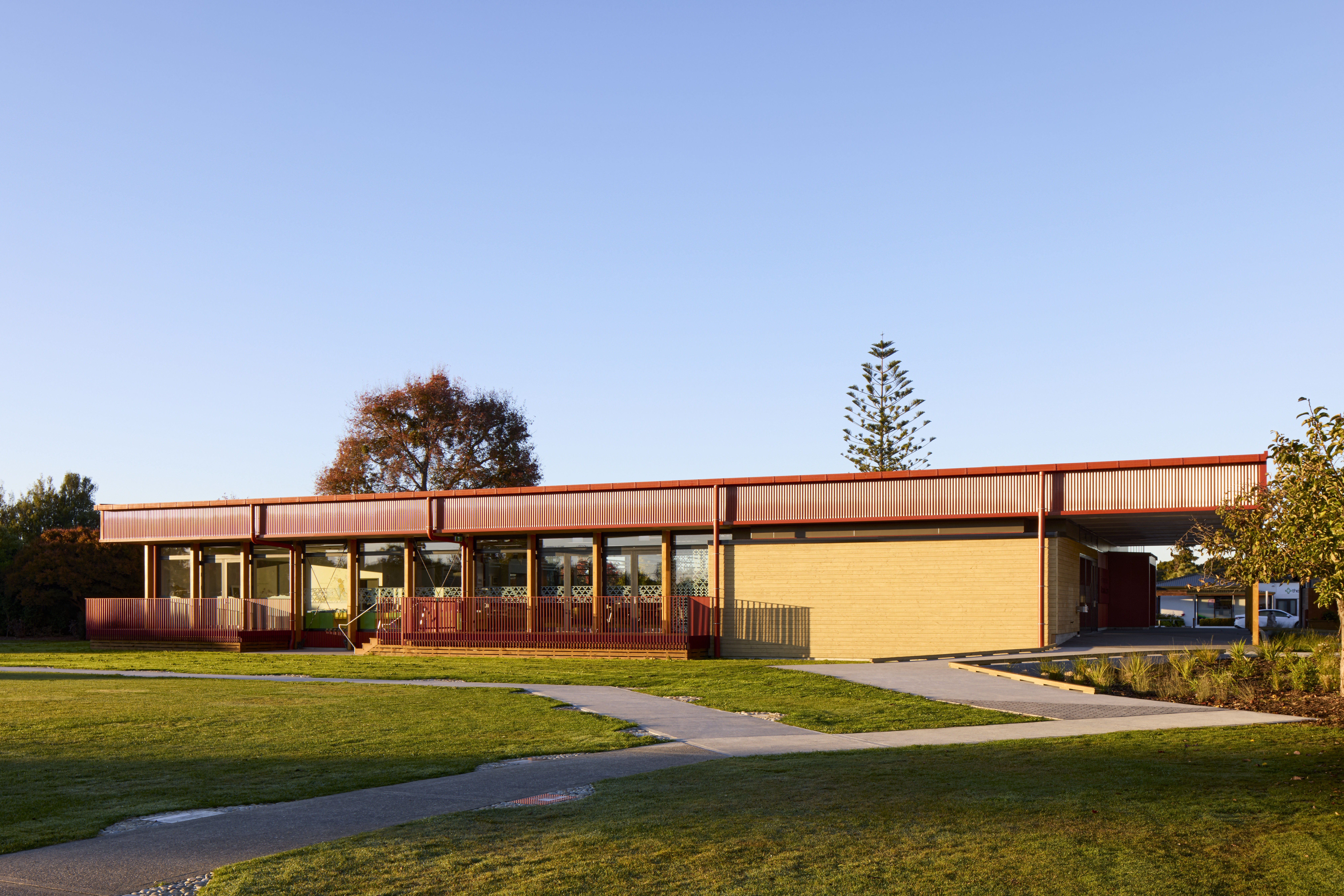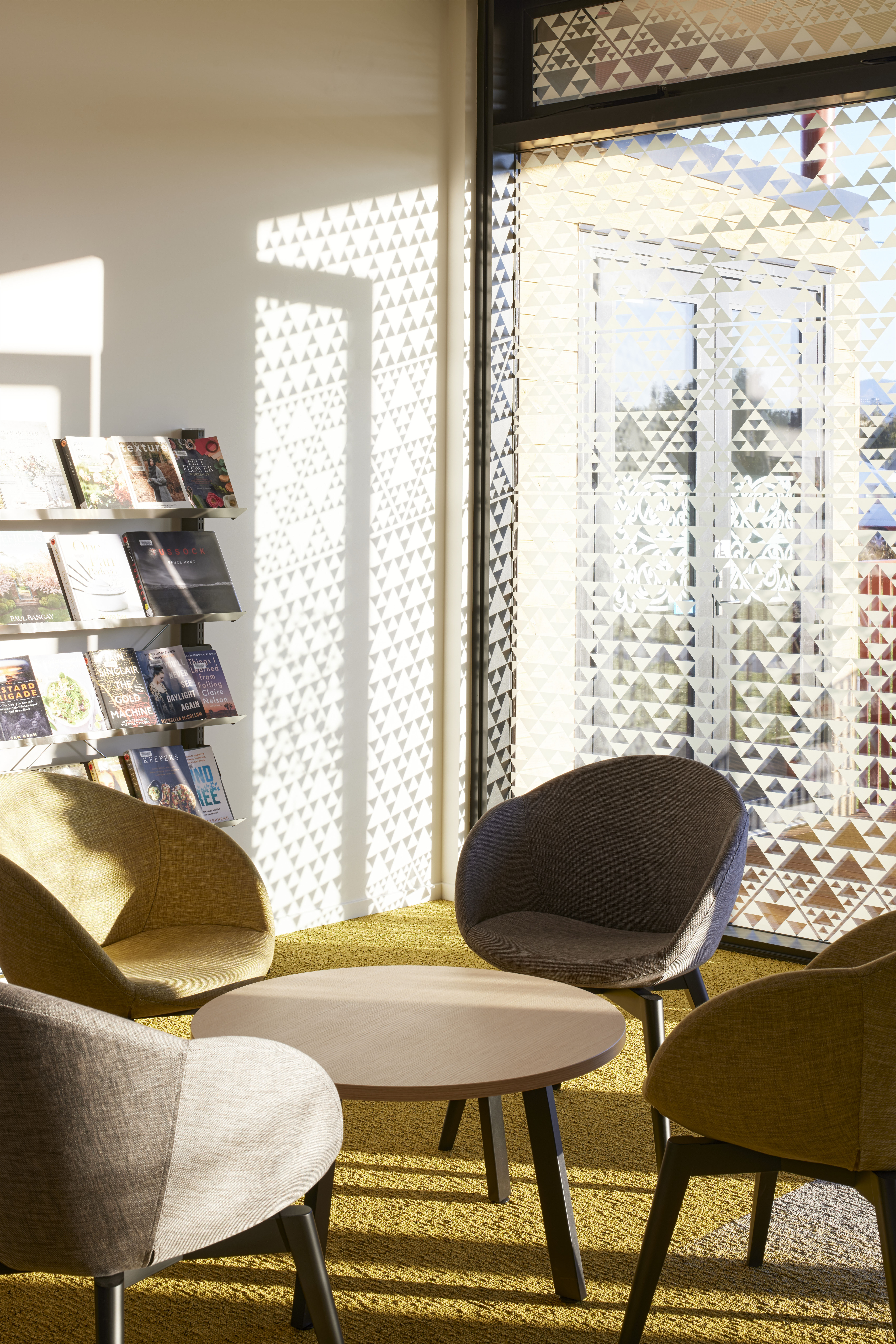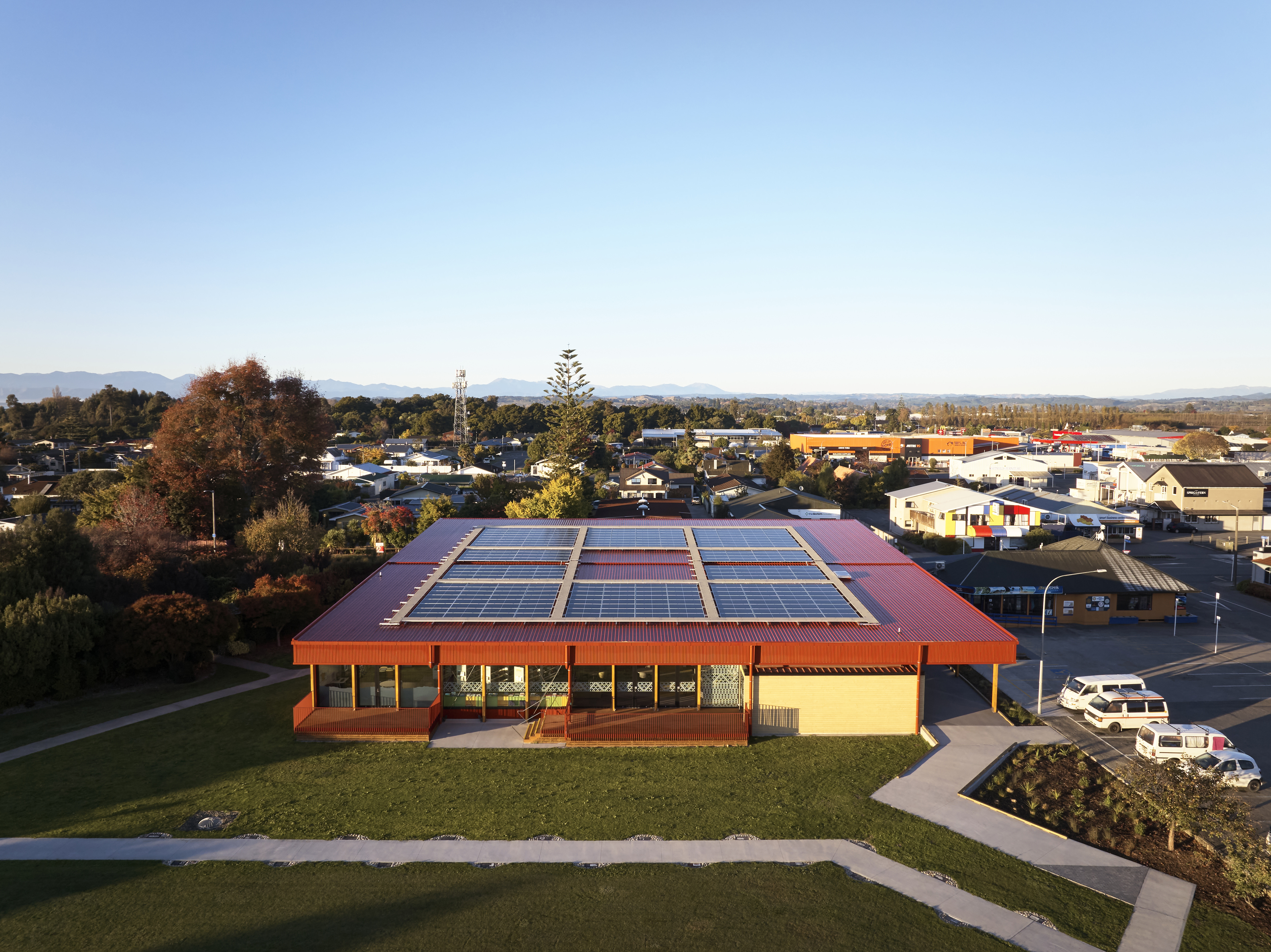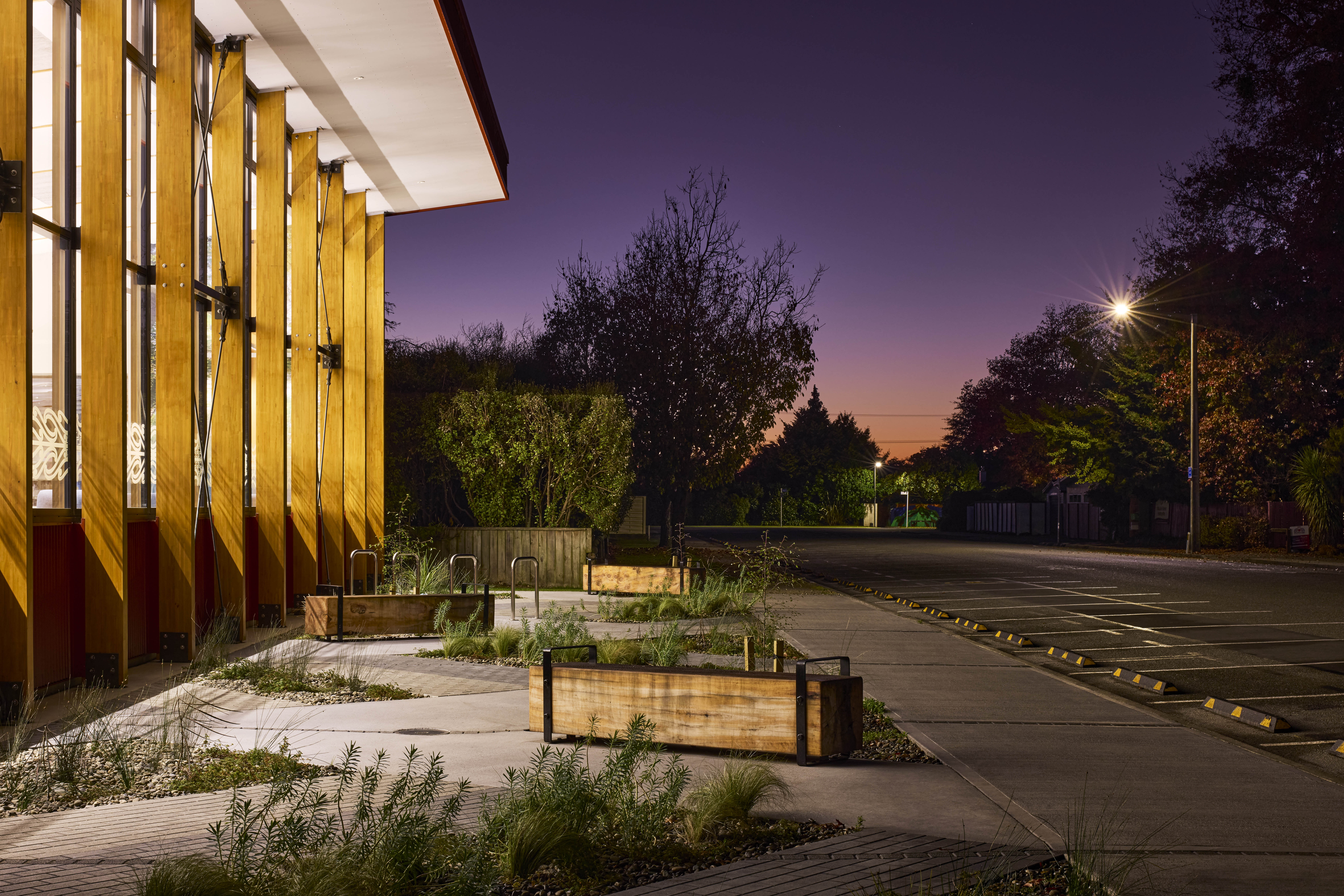 Essentially a building in the round, the Motueka Library responds effectively to its suburban setting. The exposed laminated timber structure activates the street edge, while the response to the public domain is more intimate. Punched window openings give glimpses through to the adjacent Japanese gardens and bi-fold doors lead to exterior reading decks. Toi Māori throughout brings visibility to mana whenua and enhances a sense of place and community connection. Robust external detailing, cladding and roofing reflect the nature of the community’s agricultural roots. Photovoltaic panels and natural ventilation are used effectively to manage operational efficiencies, and the judicious choice of materials has contributed to an uncomplicated interior finish.