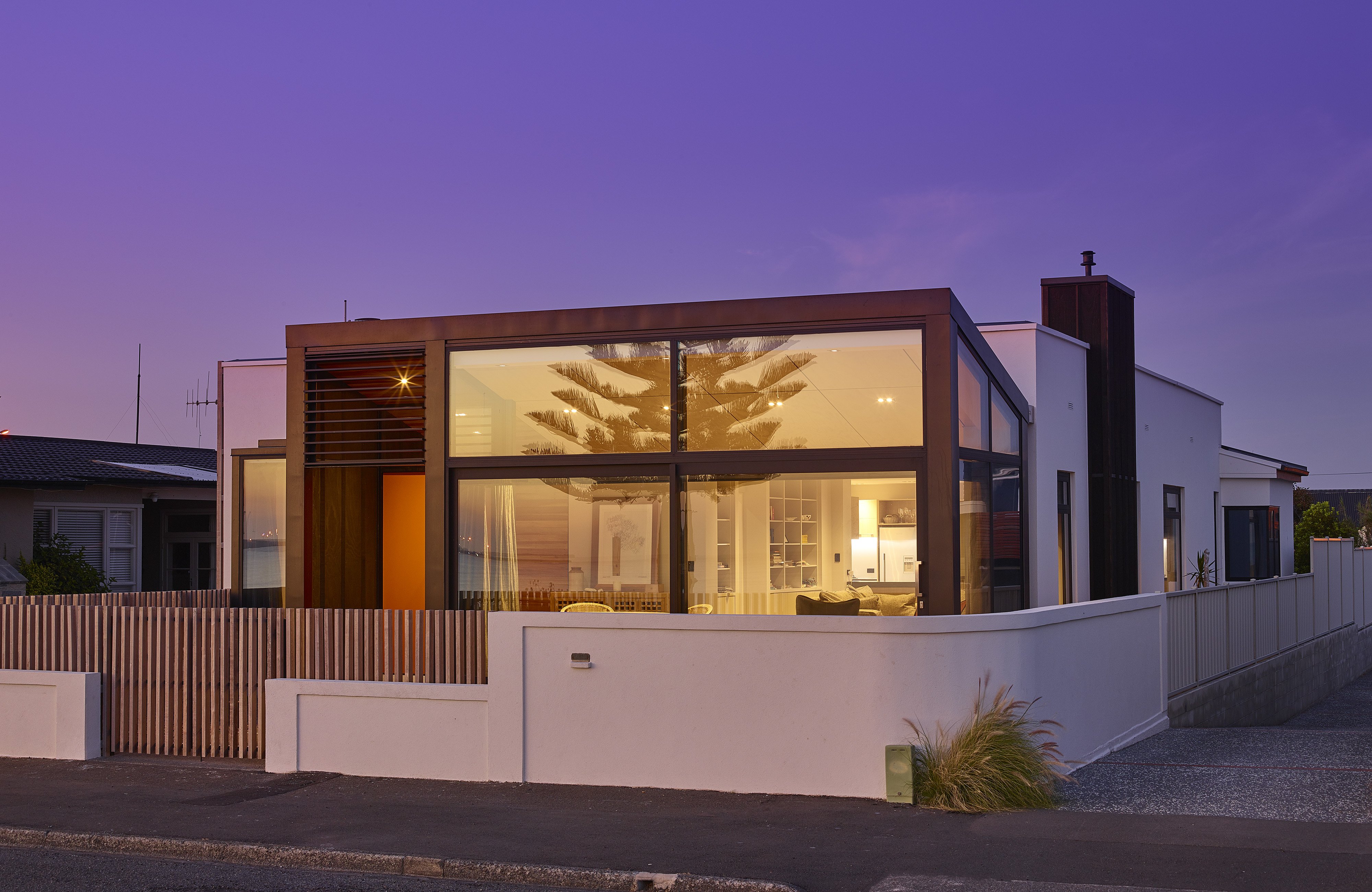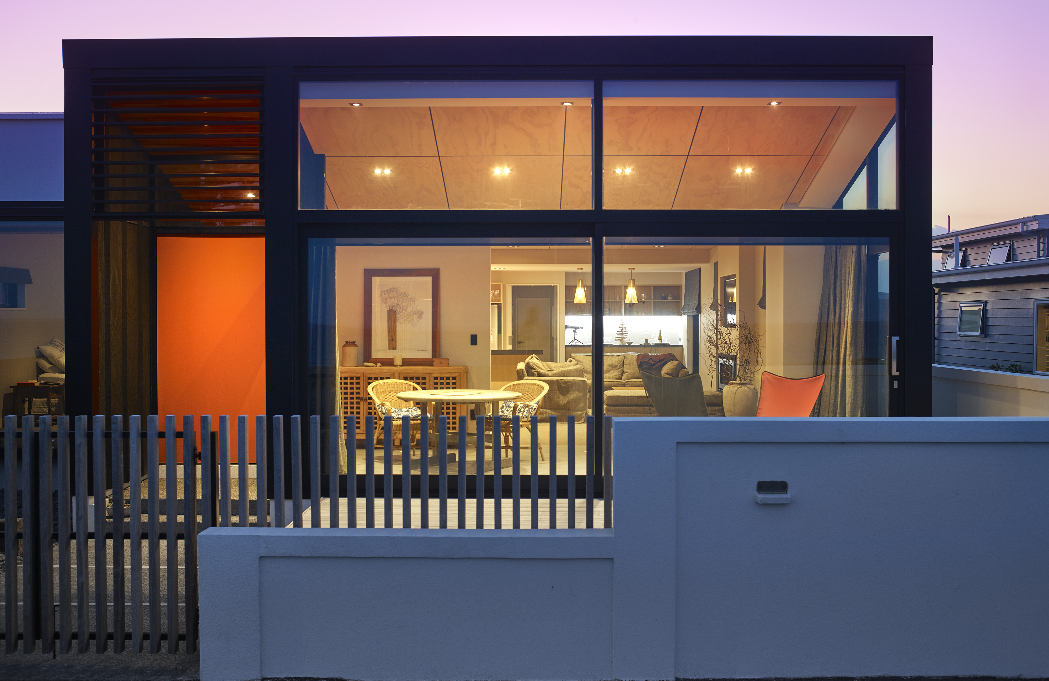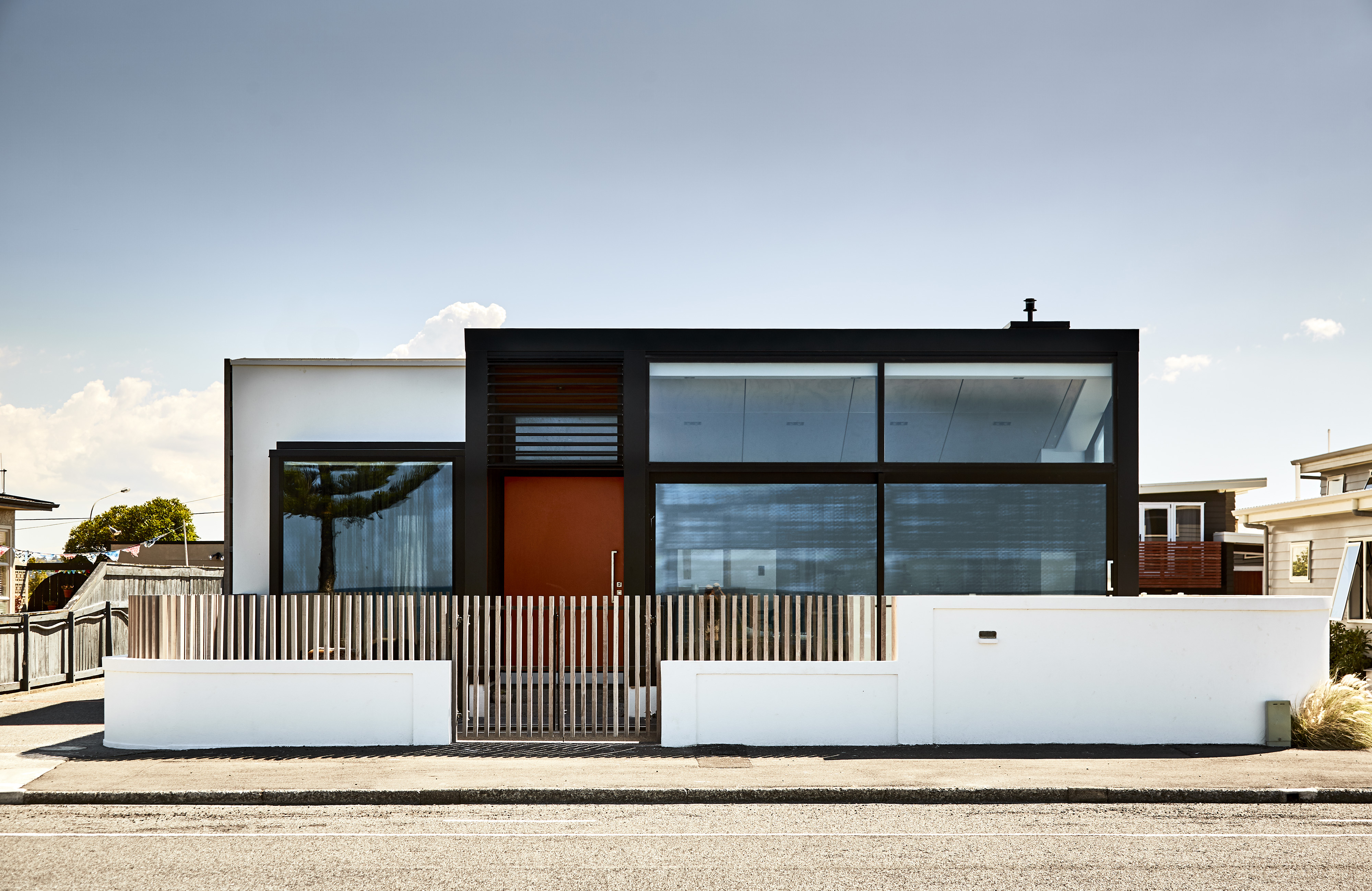 This elegant and successful seaside house shows how more modest existing housing stock can be re-imagined for modern-day living. The architects have made effective use of the suburban seaside site and employed materials that evoke the tradition of the creosoted bach. From the lush-orange front door and recycled tÅtara boards, the beautiful entrance sequence unfolds into a more open-plan layout that works well within the constraints of the original concrete structure. With a clever interpretation of the traditional, enclosed front verandah, facing east out to the sea, and the retained art deco garden wall and slatted fence, this house looks set for beach life.