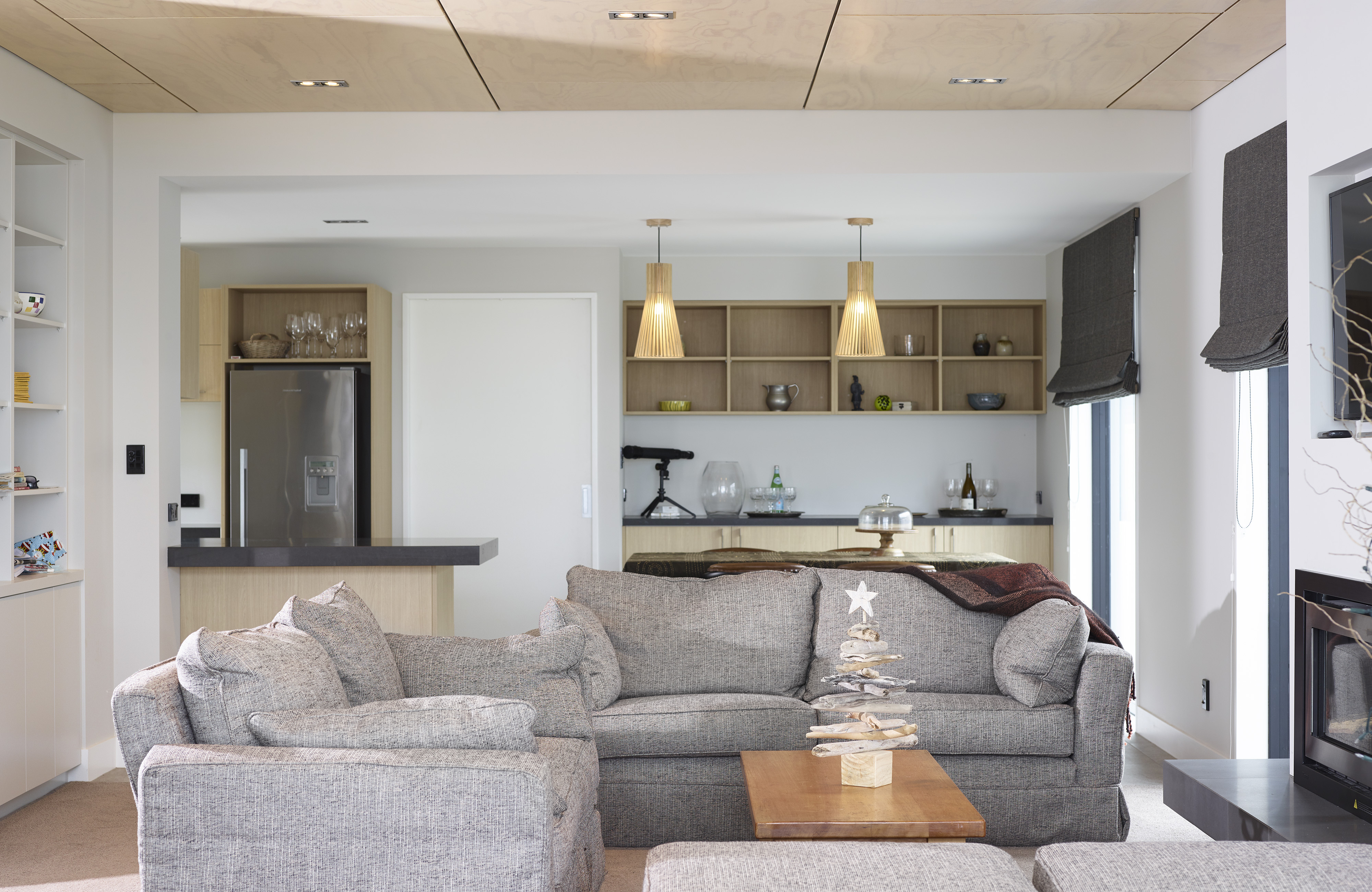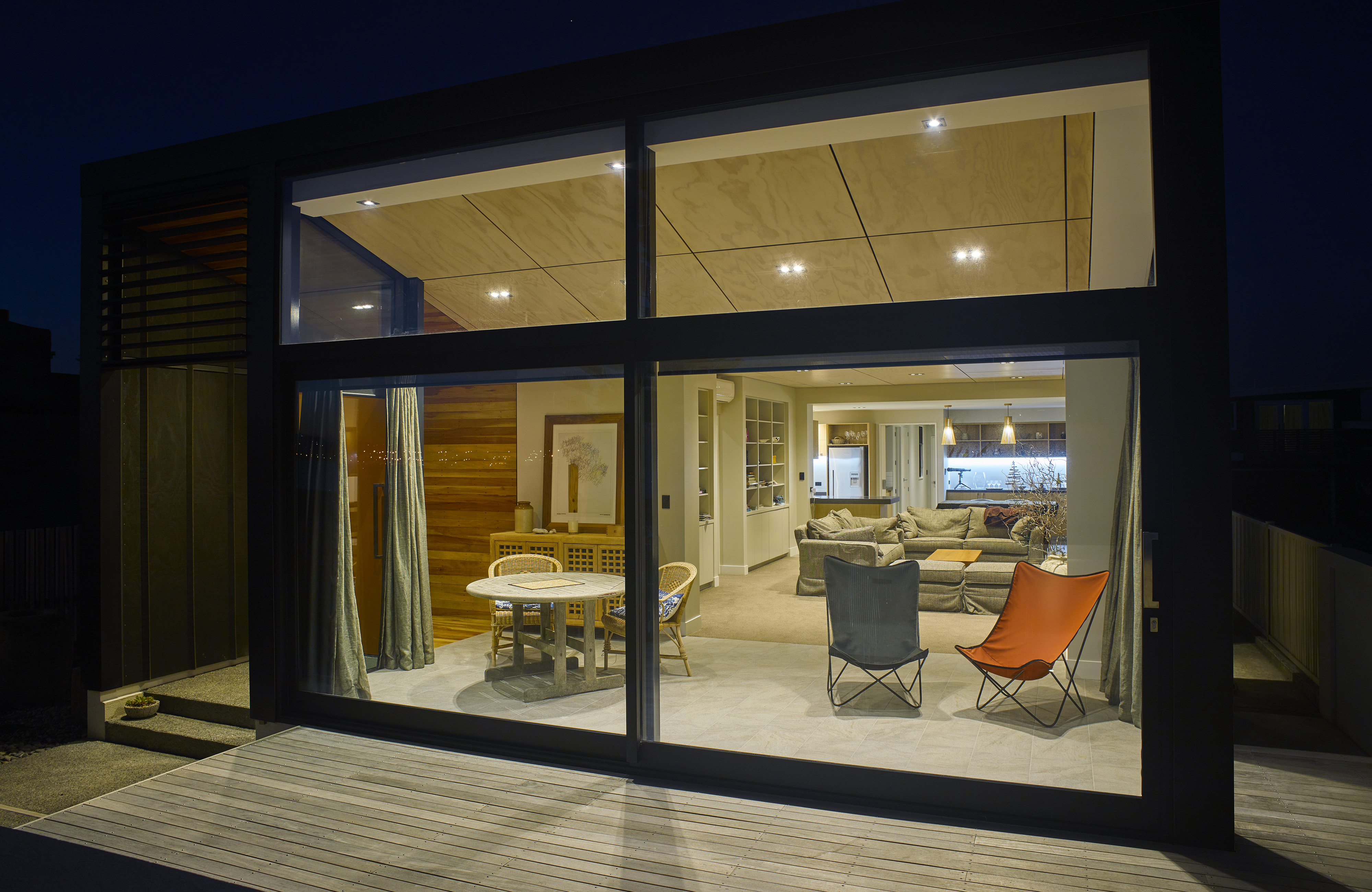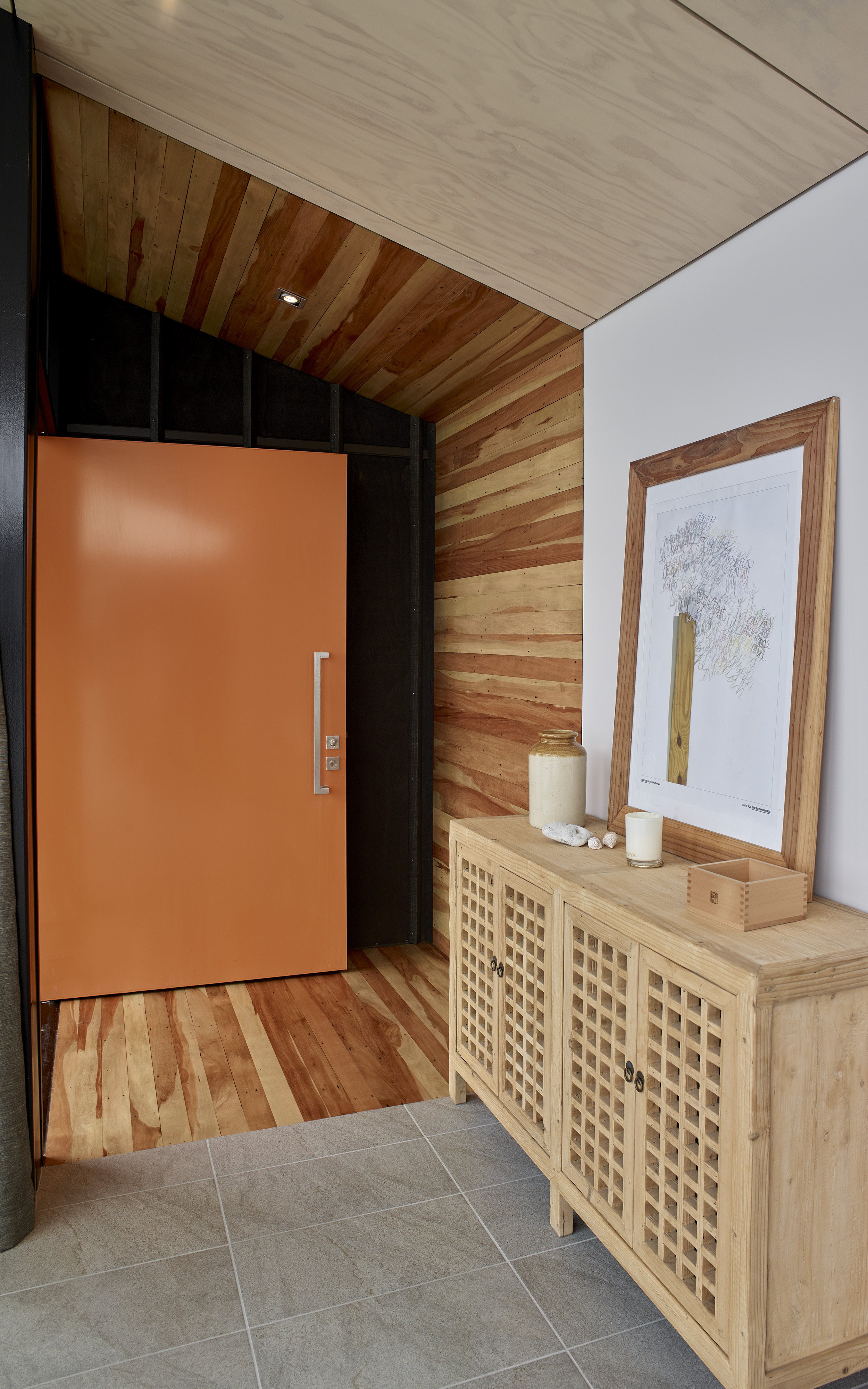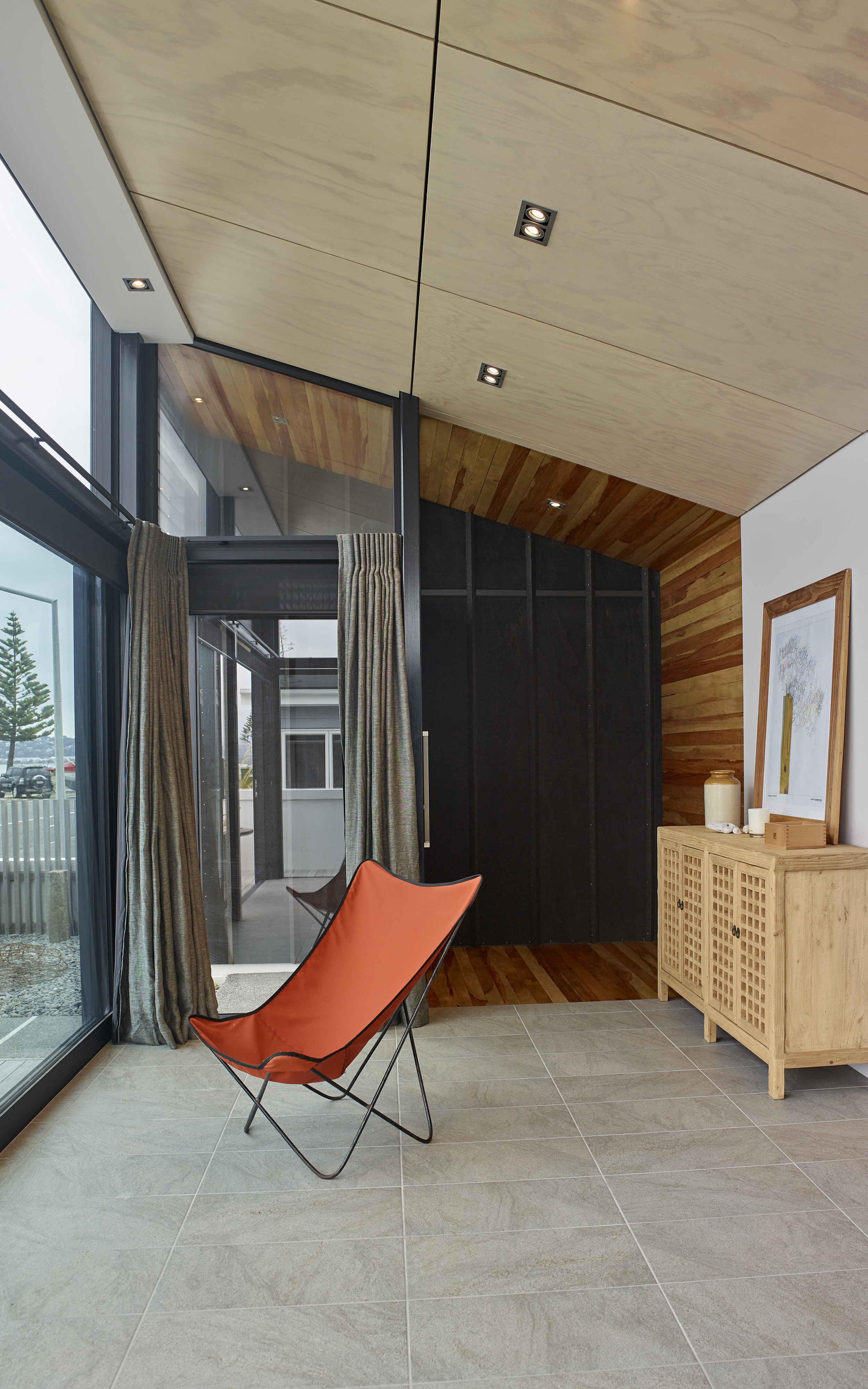 This elegant and successful seaside house shows how more modest existing housing stock can be re-imagined for modern-day living. The architects have made effective use of the suburban seaside site and employed materials that evoke the tradition of the creosoted bach. From the lush-orange front door and recycled tÅtara boards, the beautiful entrance sequence unfolds into a more open-plan layout that works well within the constraints of the original concrete structure. With a clever interpretation of the traditional, enclosed front verandah, facing east out to the sea, and the retained art deco garden wall and slatted fence, this house looks set for beach life.