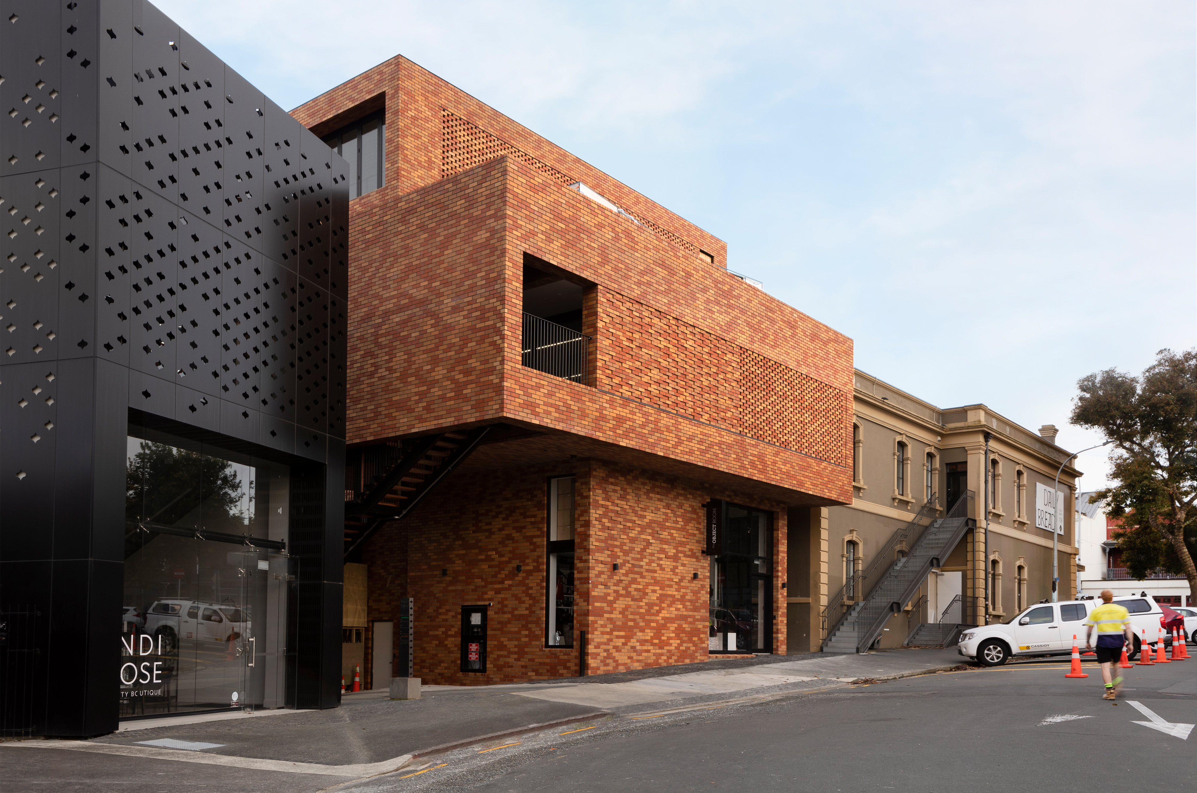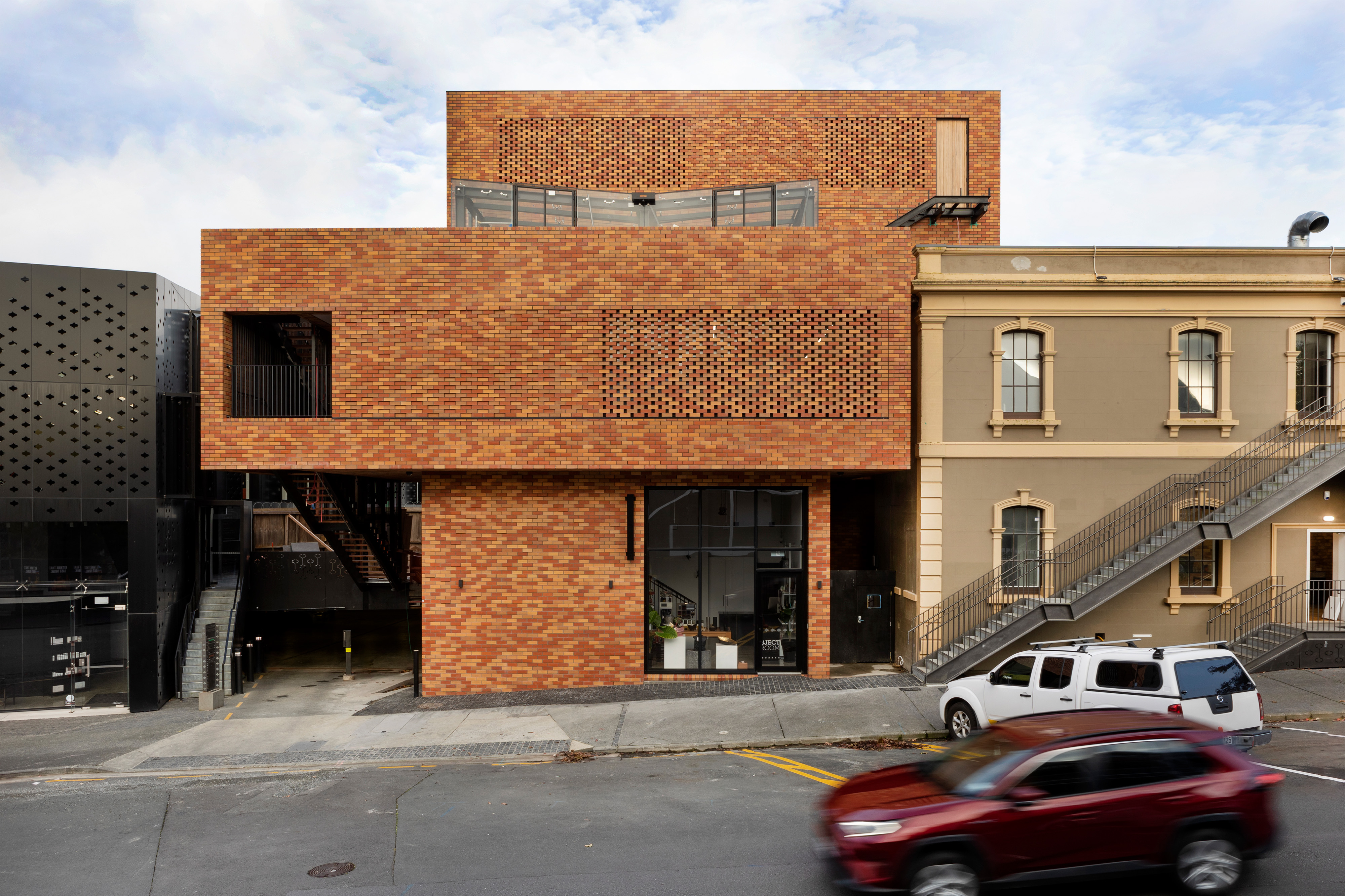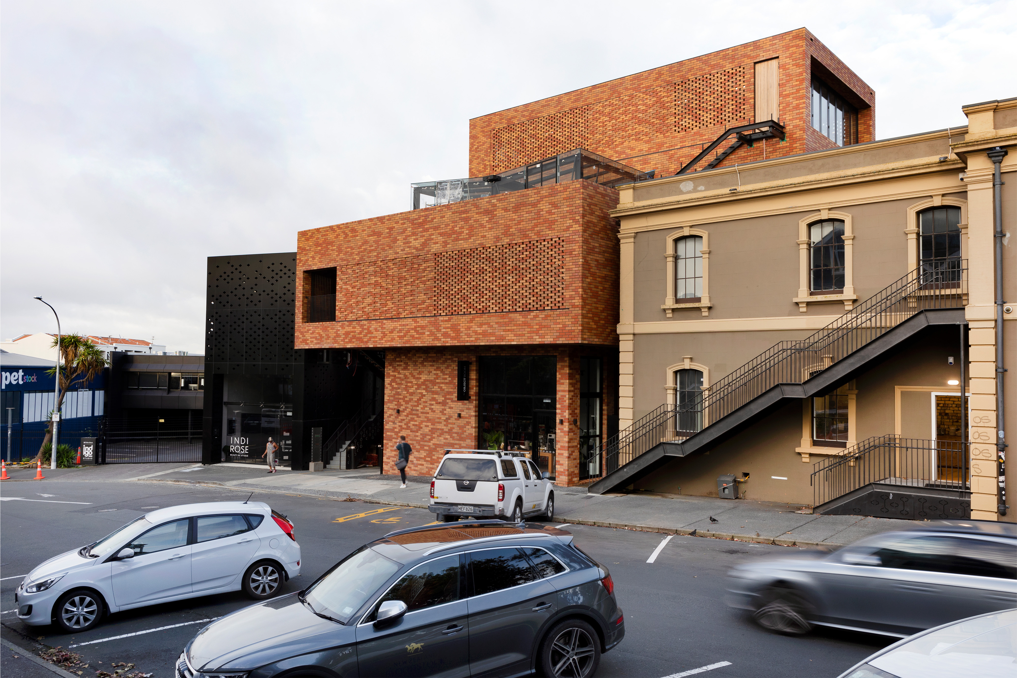 This delightful intervention on a tight city plot brings Ponsonby Road character around the corner to activate the side street. The assemblage of forms relates to the scale and proportion of the adjacent heritage building and gains additional volume by stepping back and cantilevering over the carpark entry. The negative space on top is cleverly regained by the addition of a glazed box. Brick screening adds pattern to the streetscape while filtering light within. Care and attention to detail bring value and charm to the neighbourhood.