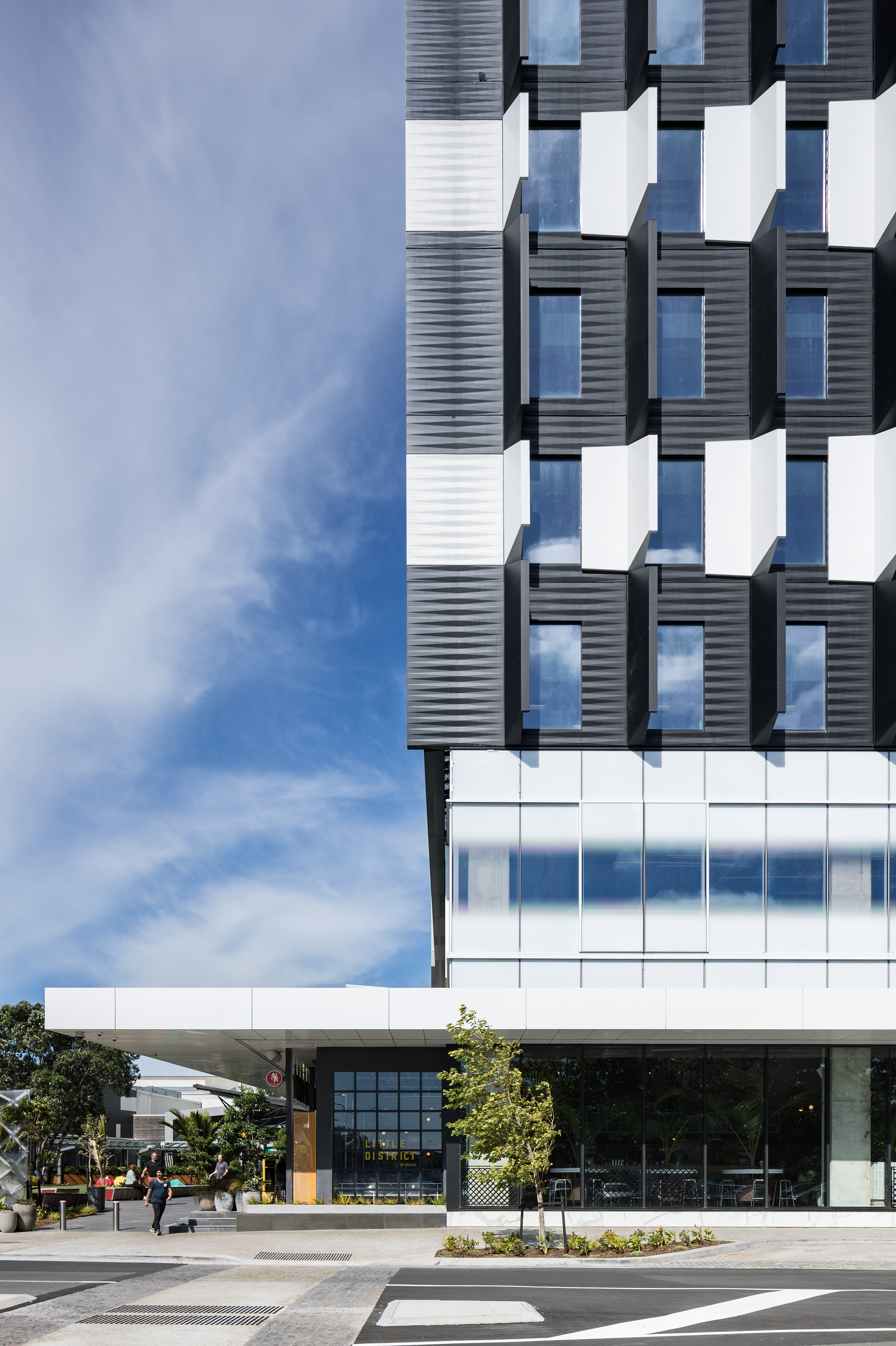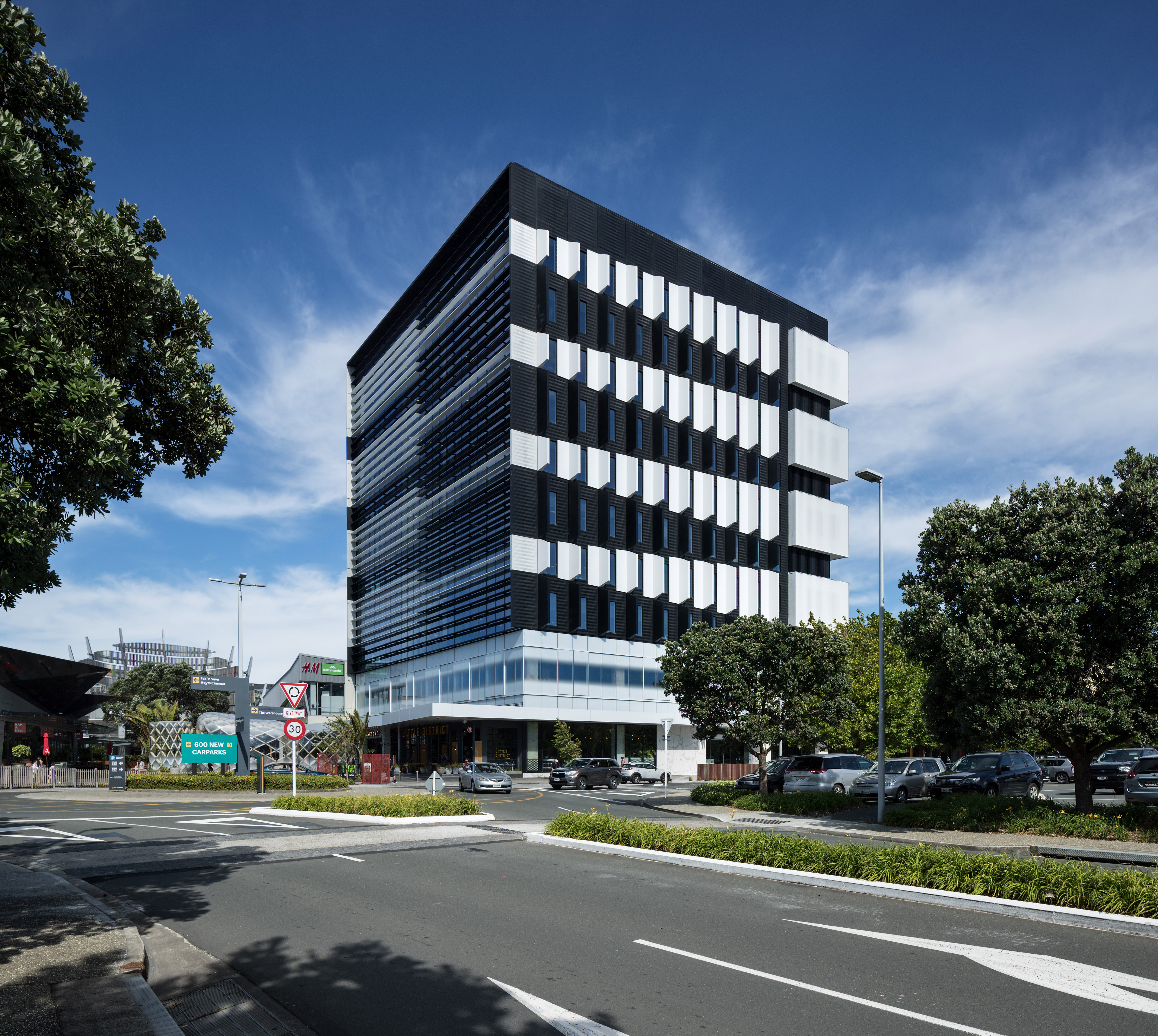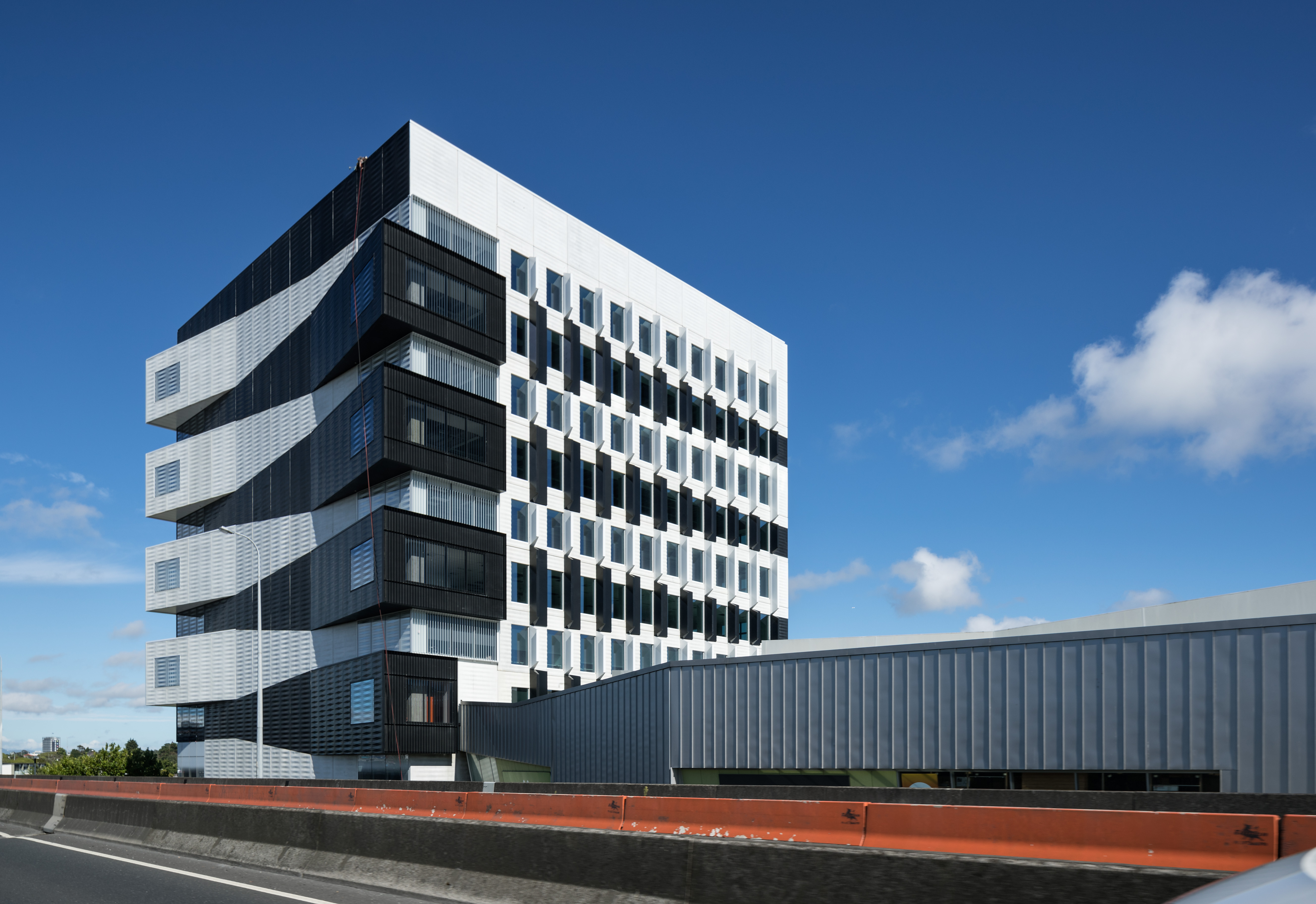 The newest addition to the Sylvia Park skyline presents a striking challenge: think again, it says, there’s more going on here than you probably think. The angled lines and boldly contrasting black/white pattern of the Architectus office block speak their commitment to design flair, and to the entrepreneurial confidence of the building’s tenants, and they do it with more than a little wit. This is the first office block at Sylvia Park, and beyond its own intrinsic functions, it should serve to attract many more. The floors are large and flexible, with only four internal columns and a services core on the south side. There’s scope for retail expansion on the first floor, which is accessible up a very grand circular stair rising from the ground floor lobby. The floors above are arranged as three vertical villages, with atriums to the north and interfloor connections. The construction of exciting, engaging signature buildings in the new town centres is a fundamental and urgently needed component of the growth of Auckland, and with Number 1 Sylvia Park, Architectus has risen admirably to the challenge. Tenants large and small, established companies and start-ups alike, will find a welcome home here.