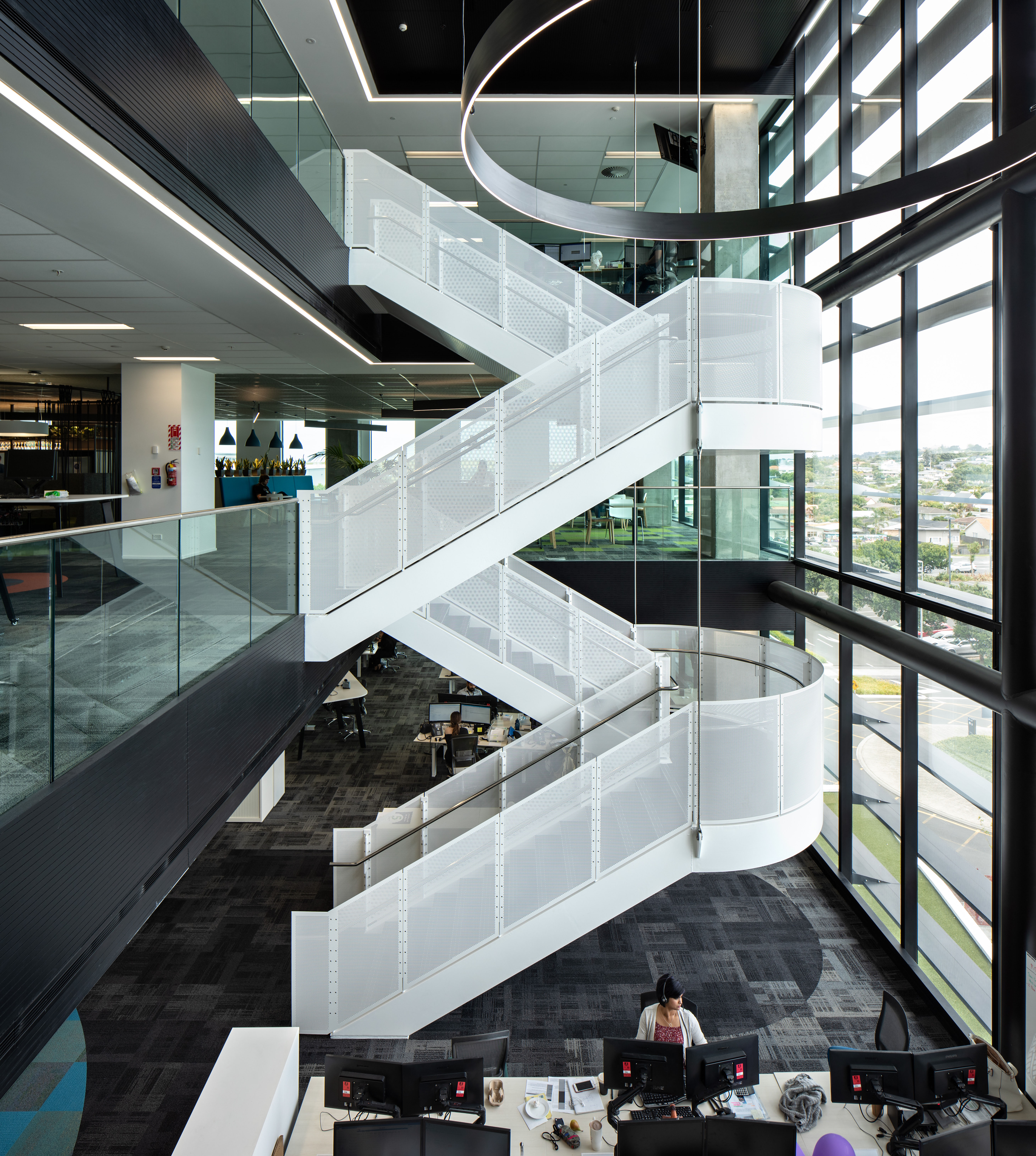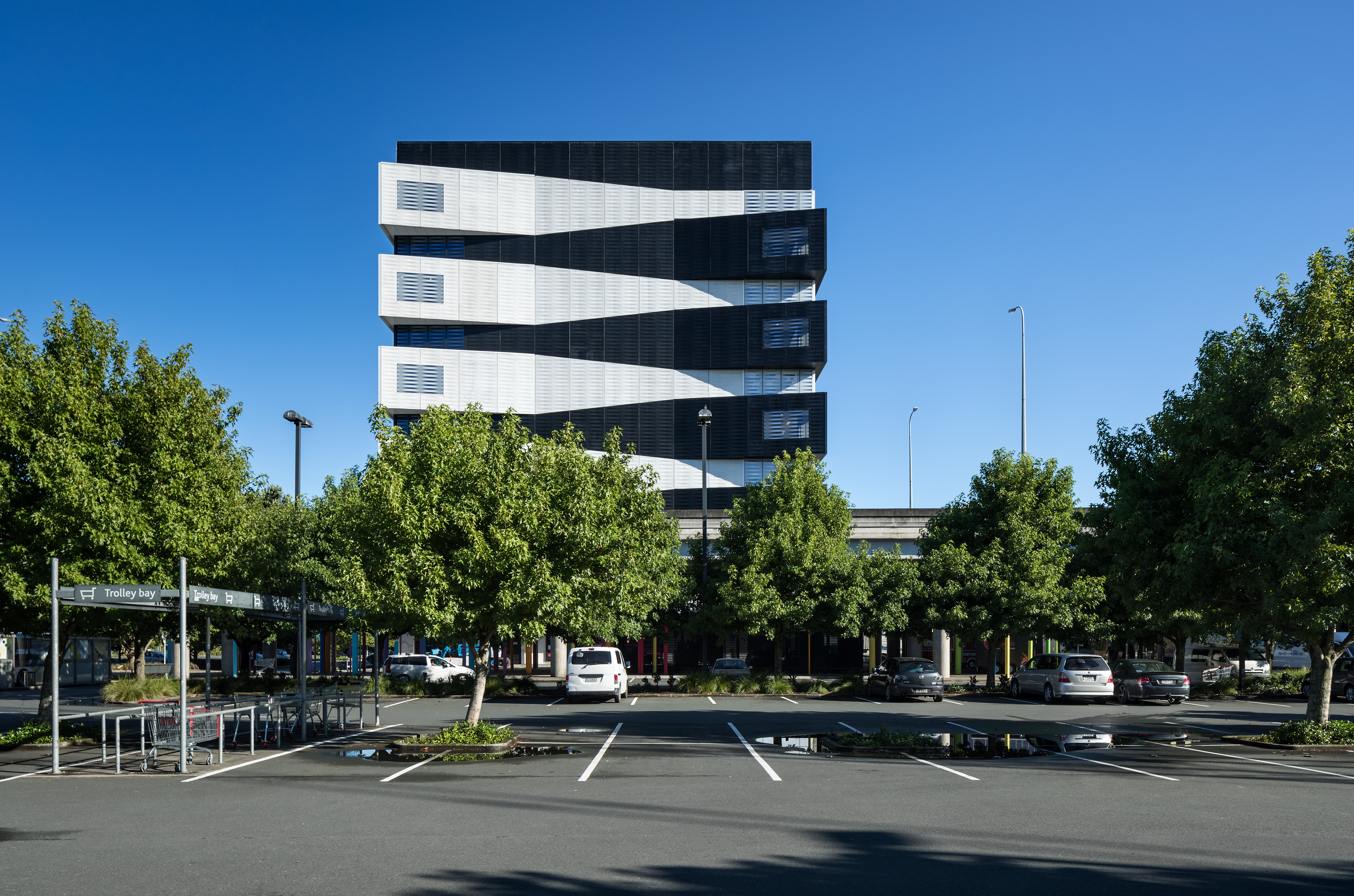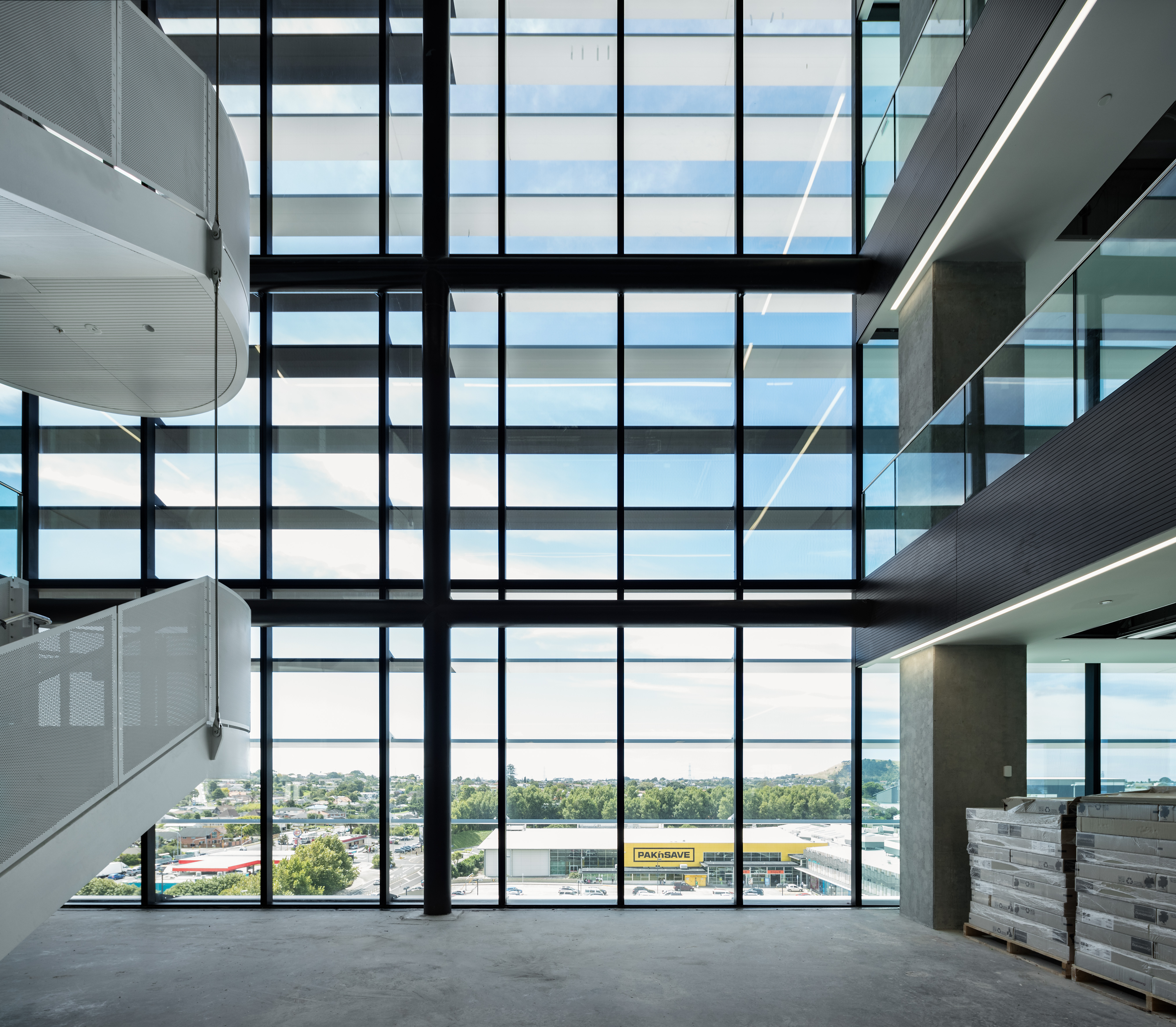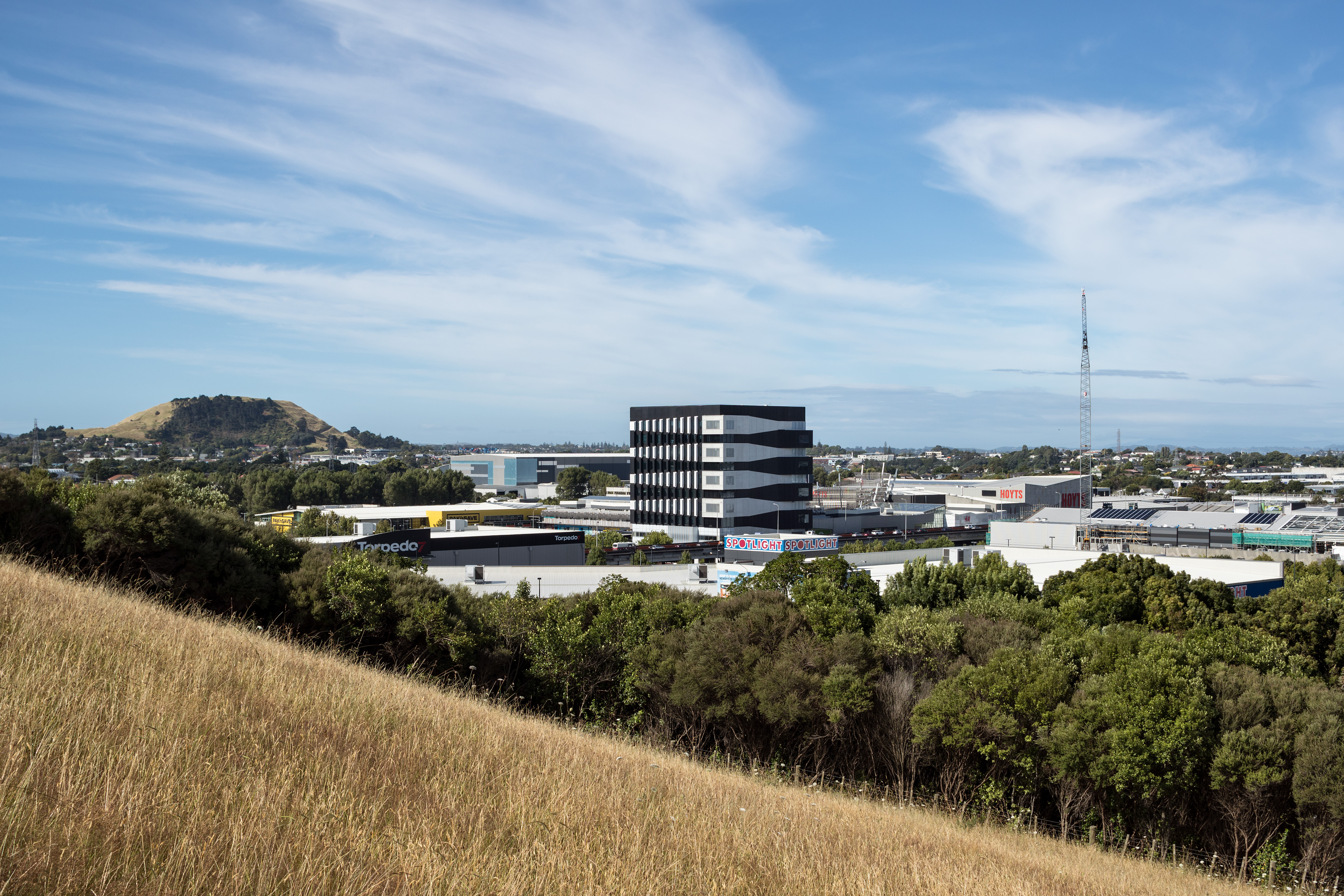 The newest addition to the Sylvia Park skyline presents a striking challenge: think again, it says, there’s more going on here than you probably think. The angled lines and boldly contrasting black/white pattern of the Architectus office block speak their commitment to design flair, and to the entrepreneurial confidence of the building’s tenants, and they do it with more than a little wit. This is the first office block at Sylvia Park, and beyond its own intrinsic functions, it should serve to attract many more. The floors are large and flexible, with only four internal columns and a services core on the south side. There’s scope for retail expansion on the first floor, which is accessible up a very grand circular stair rising from the ground floor lobby. The floors above are arranged as three vertical villages, with atriums to the north and interfloor connections. The construction of exciting, engaging signature buildings in the new town centres is a fundamental and urgently needed component of the growth of Auckland, and with Number 1 Sylvia Park, Architectus has risen admirably to the challenge. Tenants large and small, established companies and start-ups alike, will find a welcome home here.