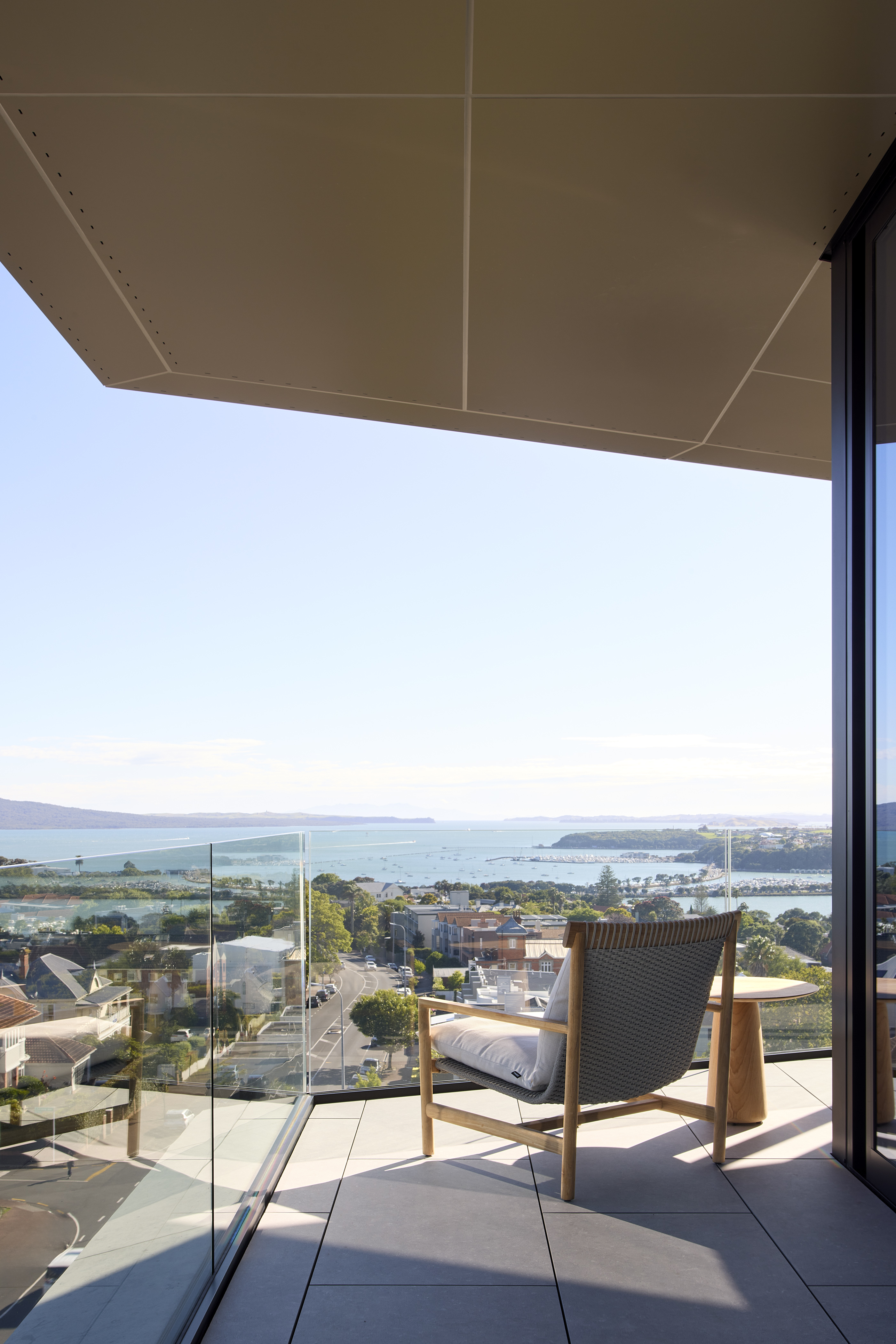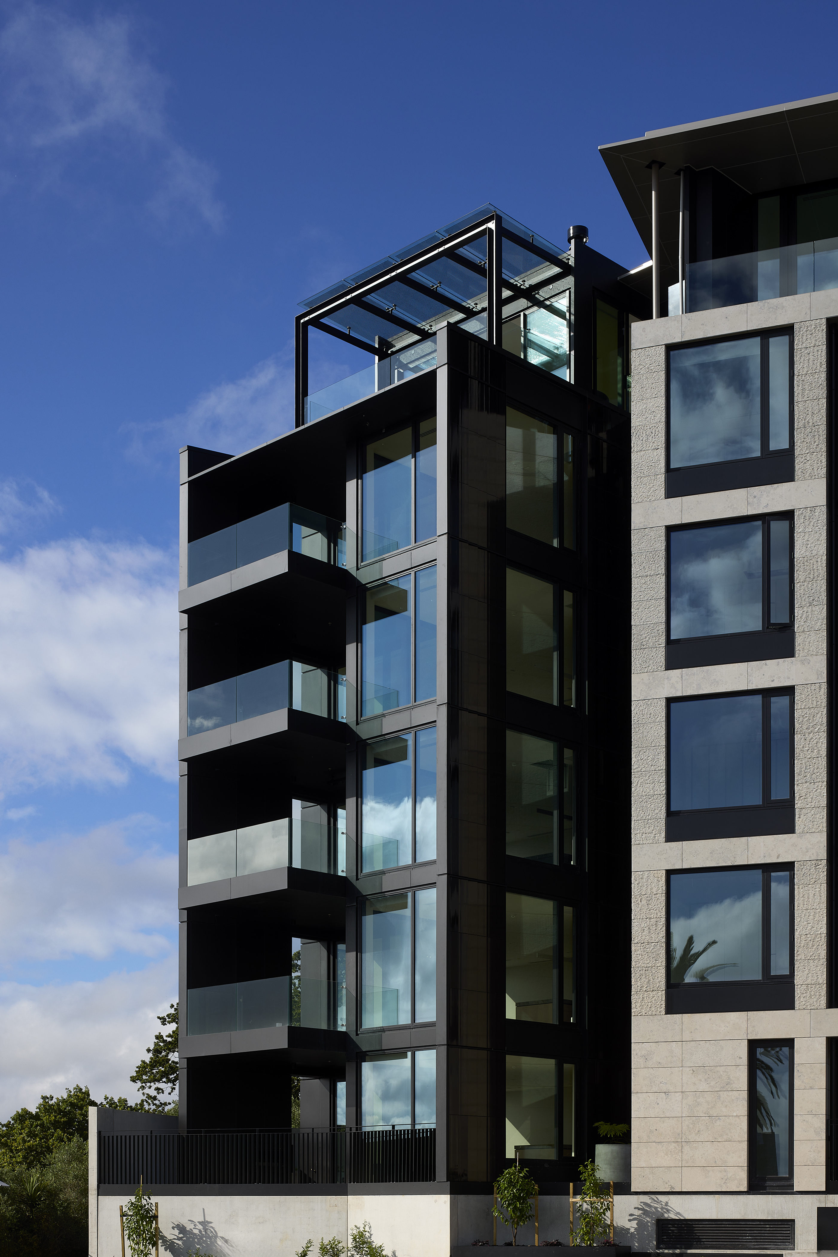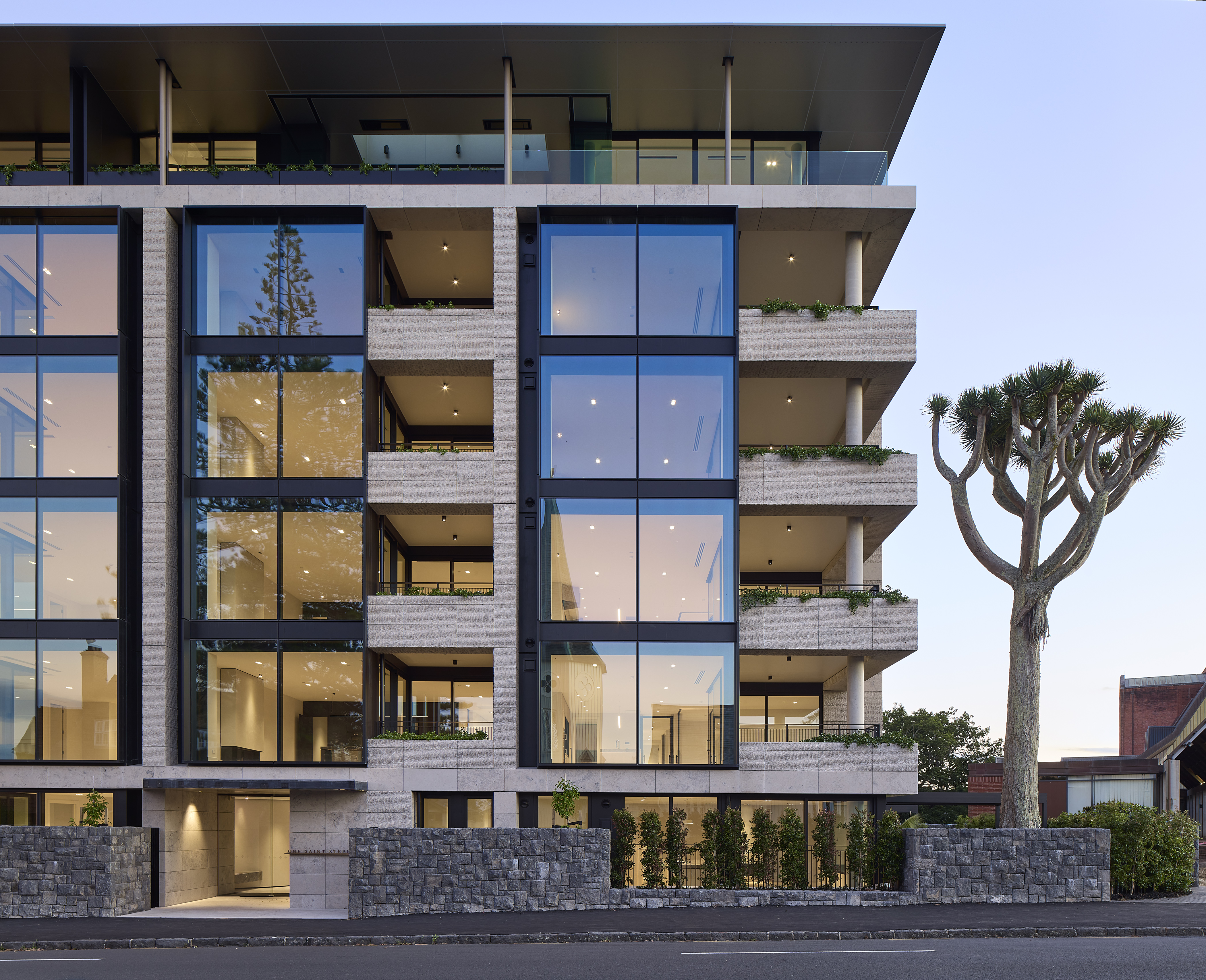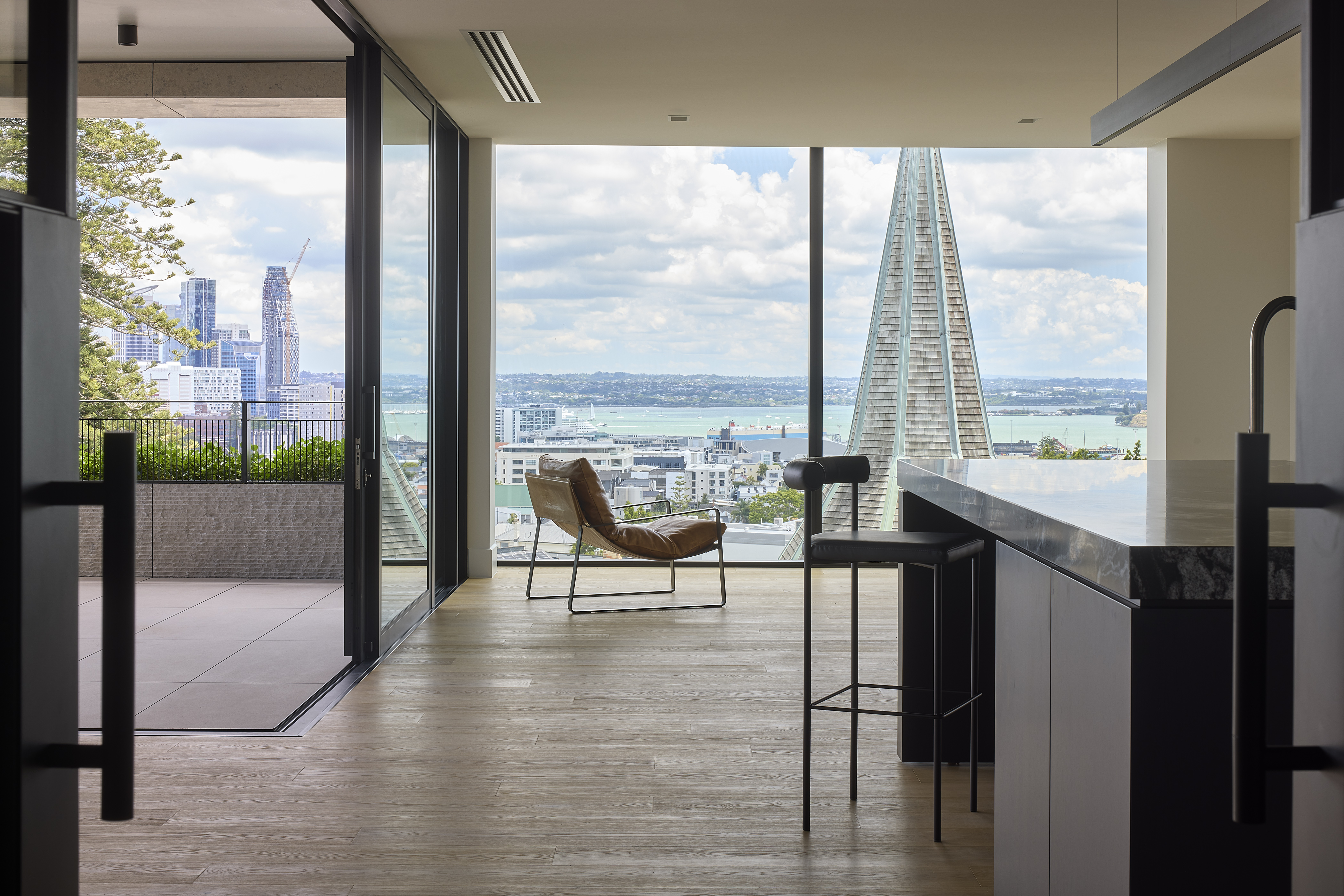 This was a challenging context in which to insert a building of this scale. Bounded on one side by an iconic cathedral and situated on a prominent ridge with views to the Auckland War Memorial Museum in one direction and the Waitematā Harbour in the other, One Saint Stephens employs recessed corner verandahs to reduce its bulk and activate its street presence. Glazed vertical elements further diminish the building's scale while delivering full-height panoramic views to the apartments' occupants. Material selections imbue the building with a sense of permanence and timelessness.