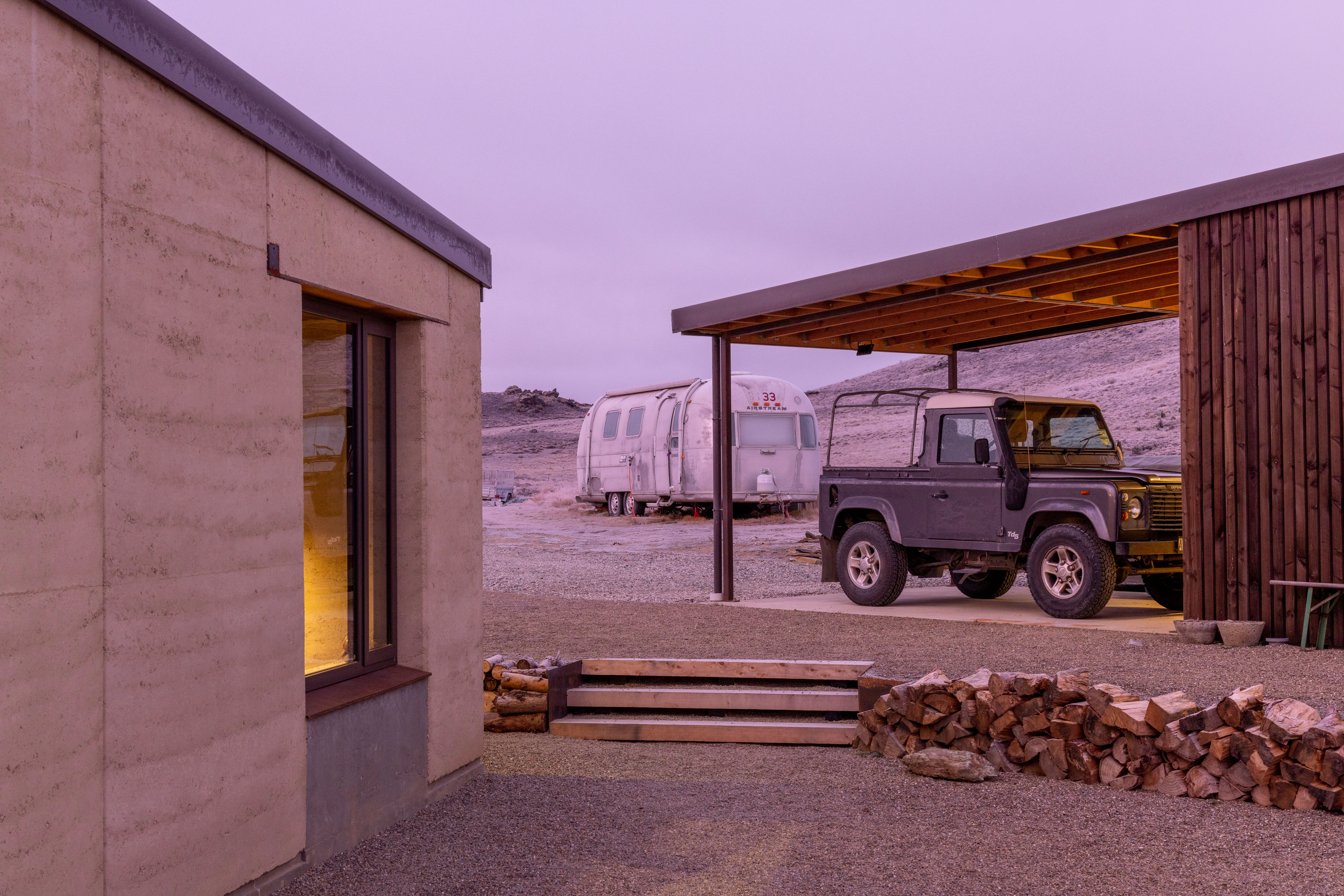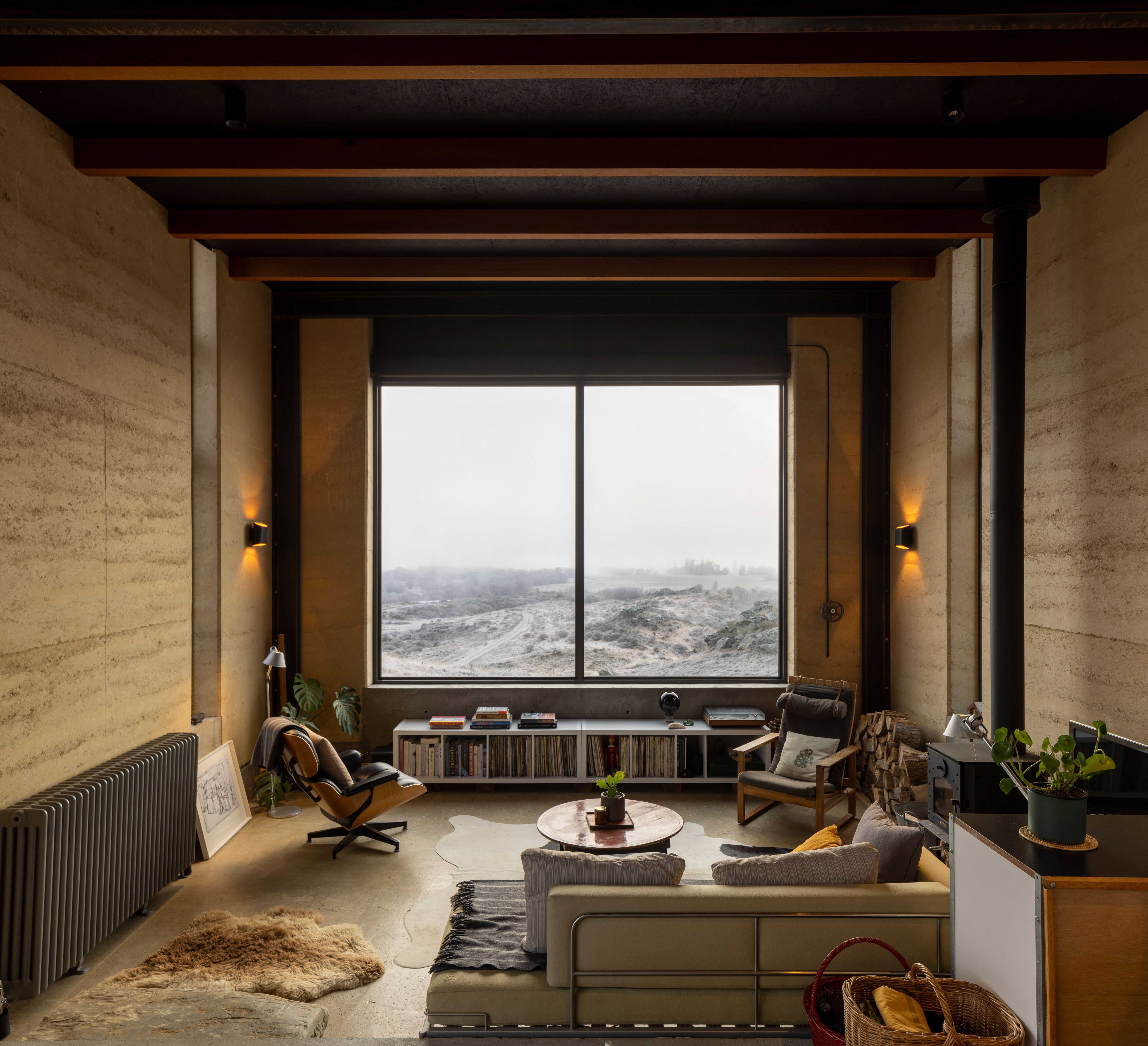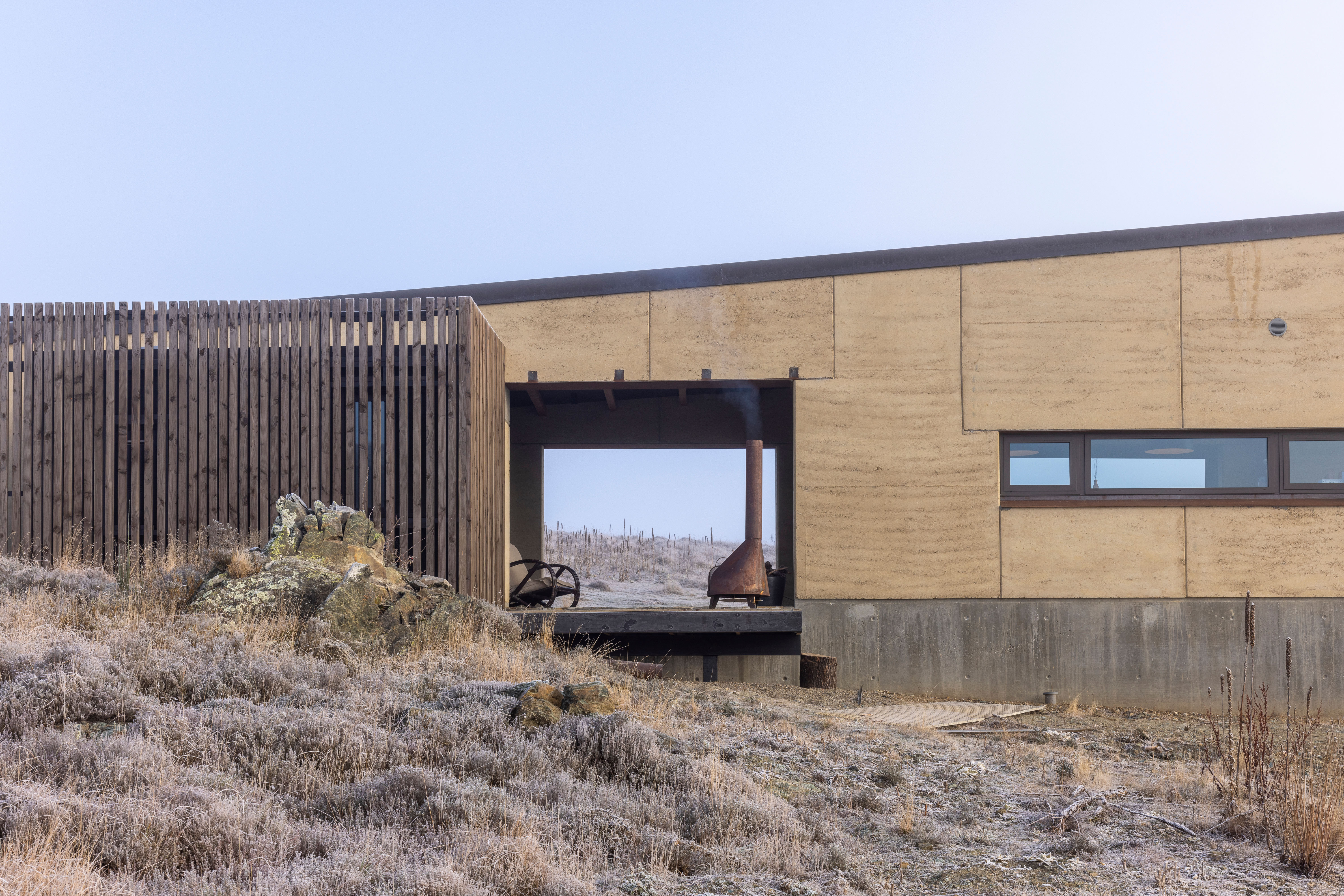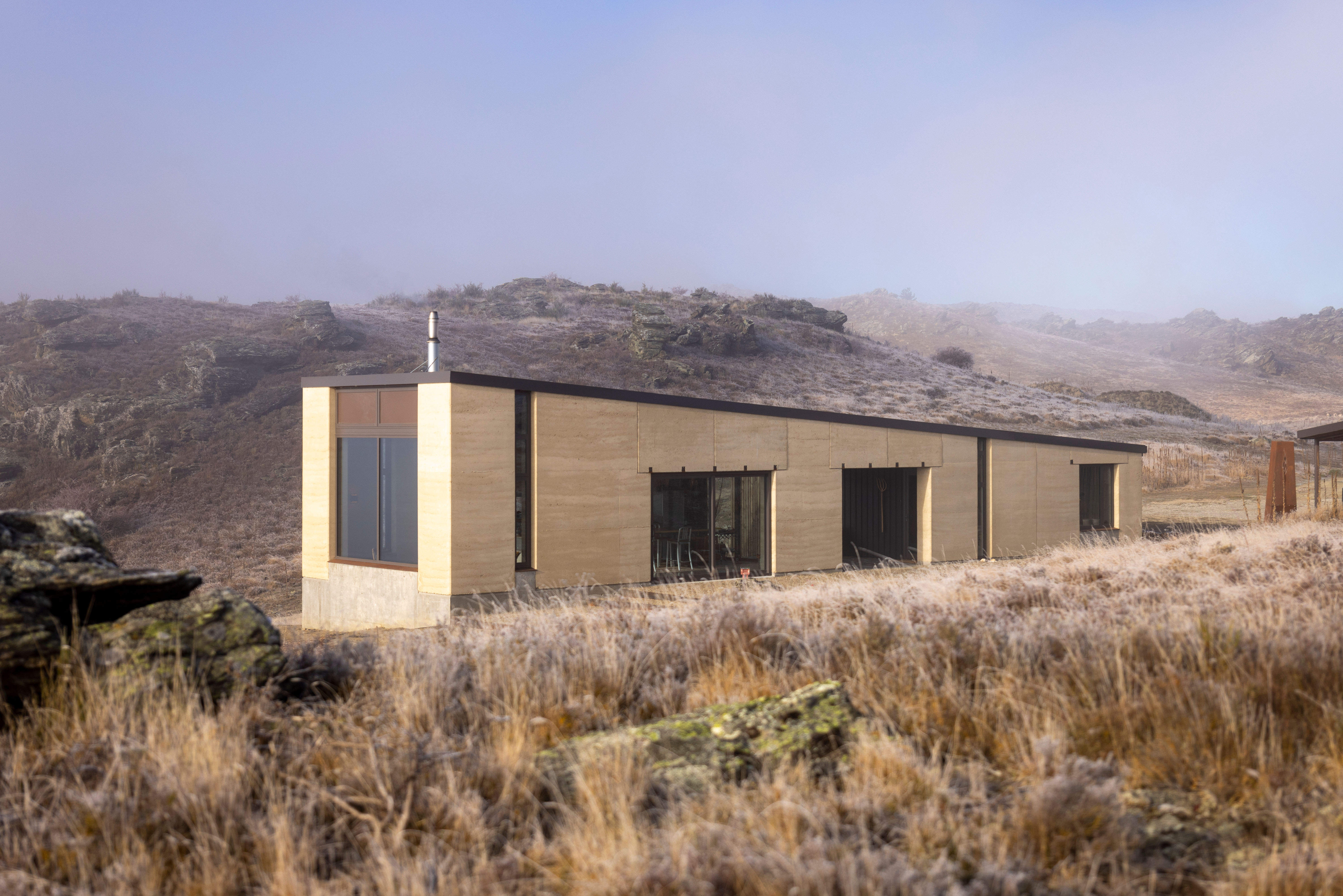 A humble 120m2 abode made with earth from its local surroundings. The clients actively engage with the raw environment in every aspect of this design, from framed views, breezeway and earthen floors. This is an honest and responsive design elevated by playful accessories such as toggle switches and a winding handwheel. The client chose raw materials for their low-carbon impact and the result is a well-executed, sustainable dwelling sitting beautifully within the landscape.