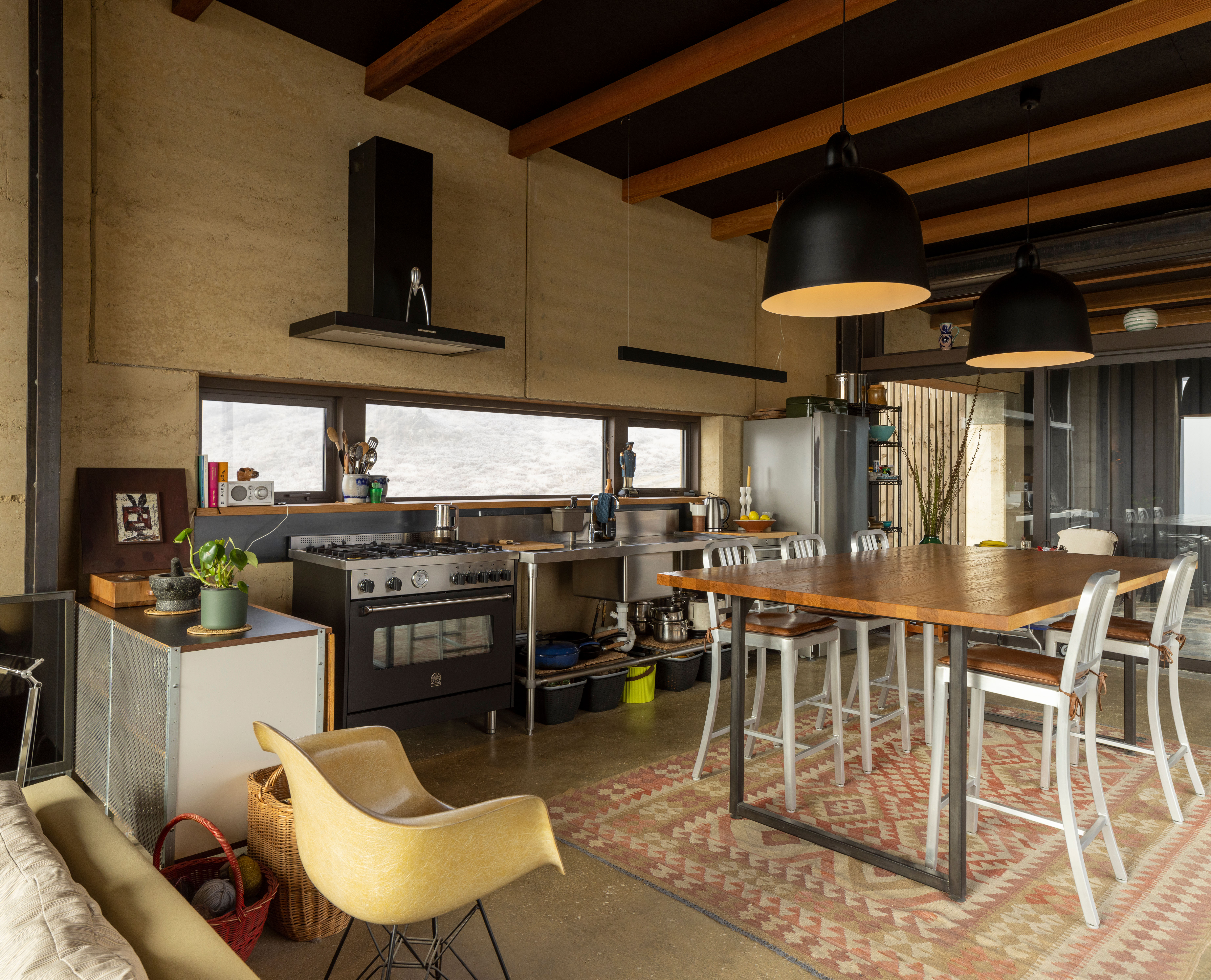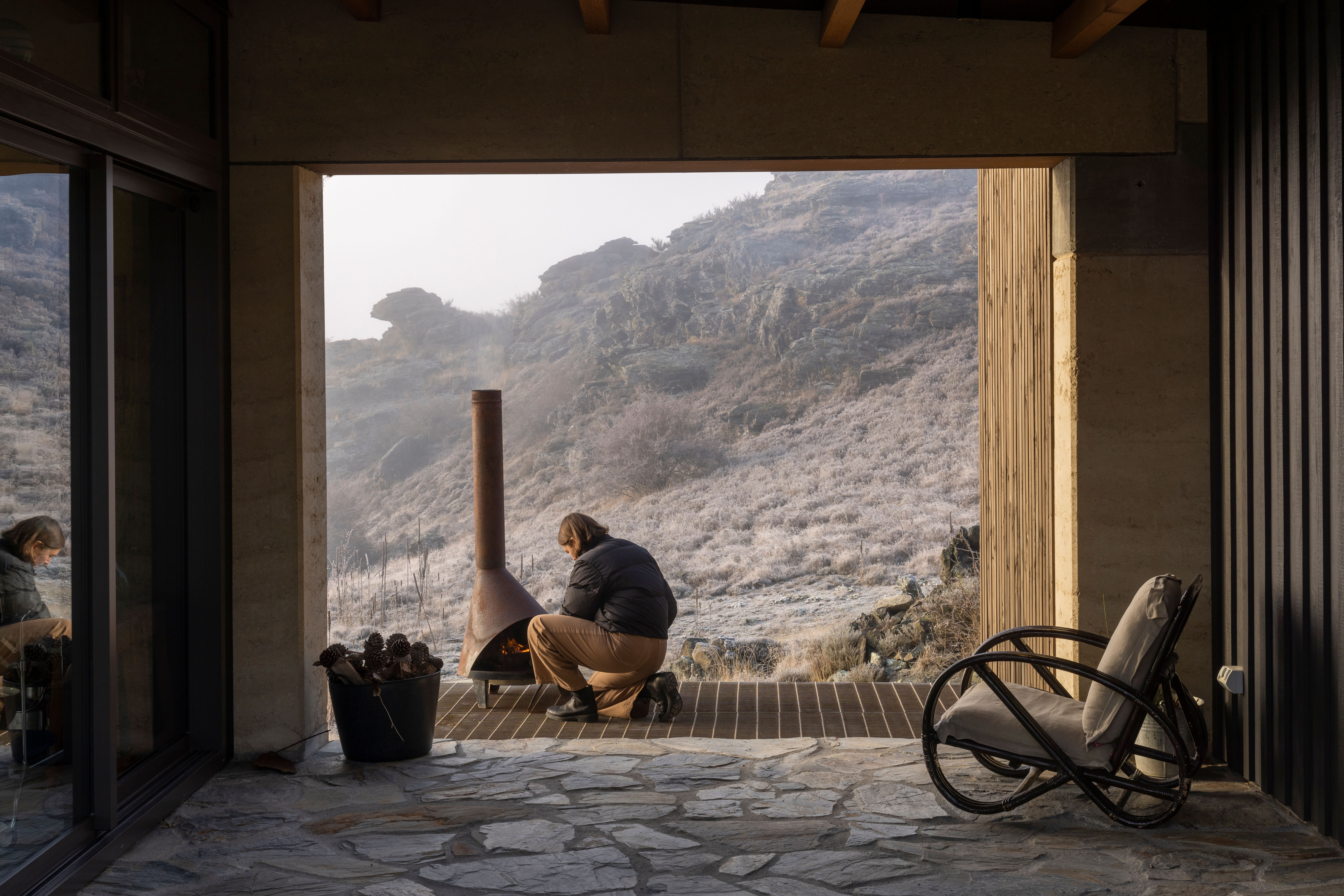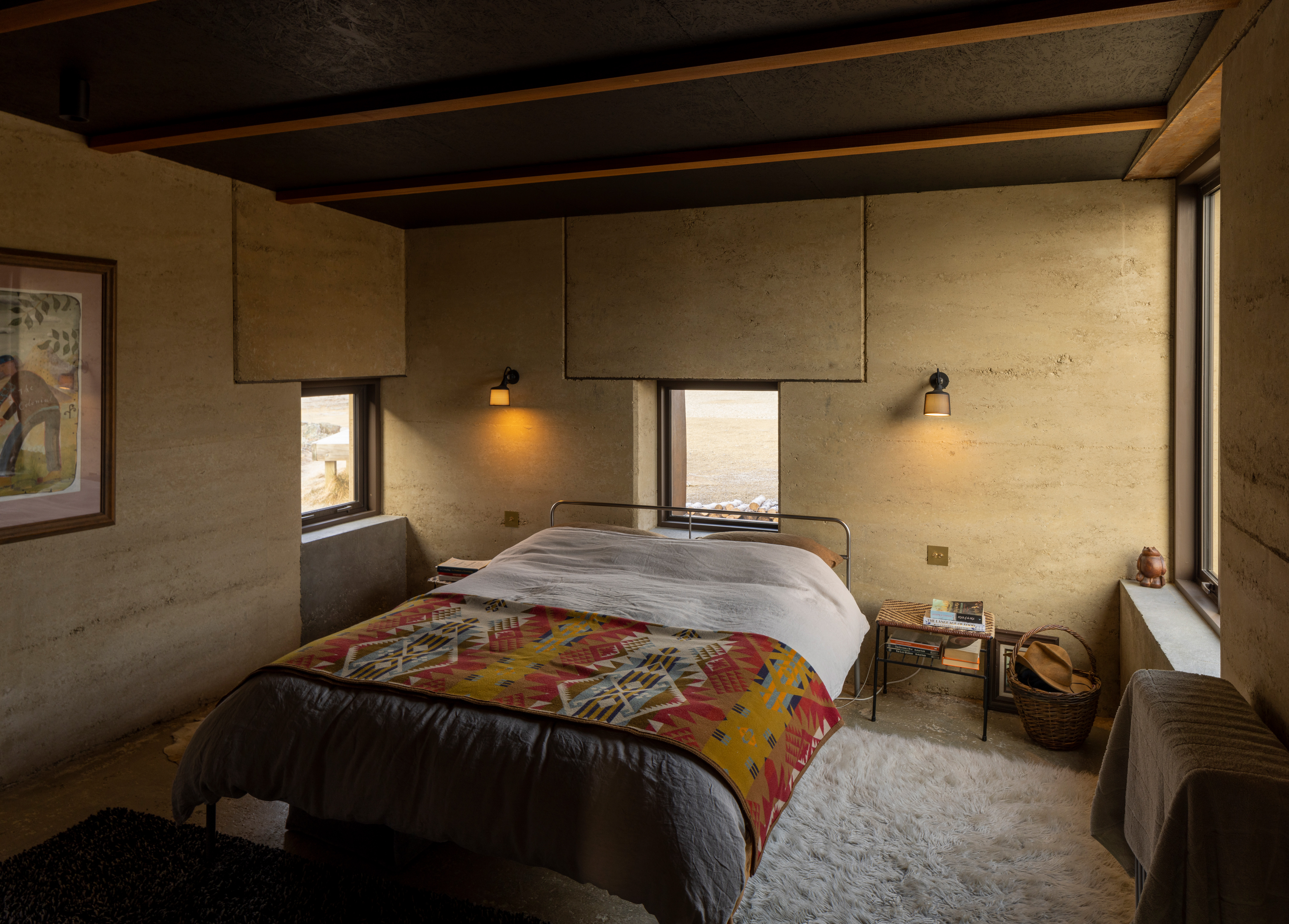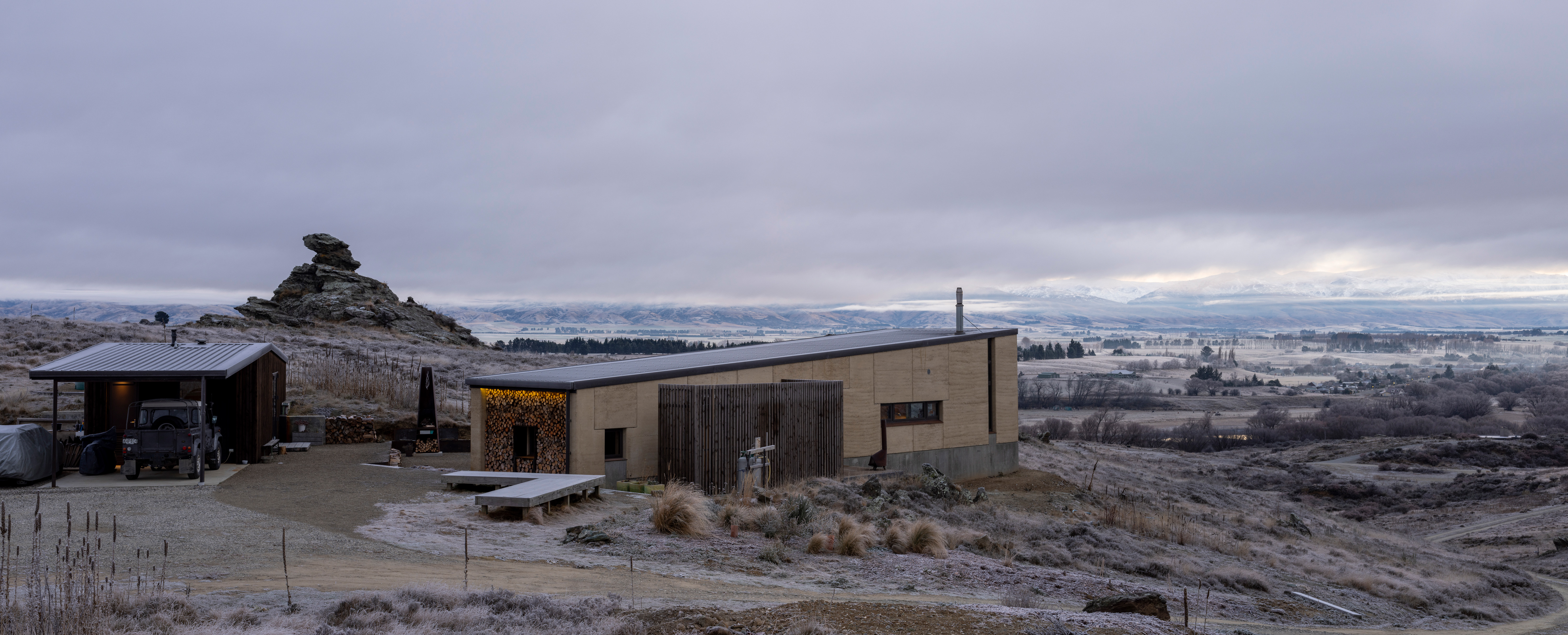A humble 120m2 abode made with earth from its local surroundings. The clients actively engage with the raw environment in every aspect of this design, from framed views, breezeway and earthen floors. This is an honest and responsive design elevated by playful accessories such as toggle switches and a winding handwheel. The client chose raw materials for their low-carbon impact and the result is a well-executed, sustainable dwelling sitting beautifully within the landscape.