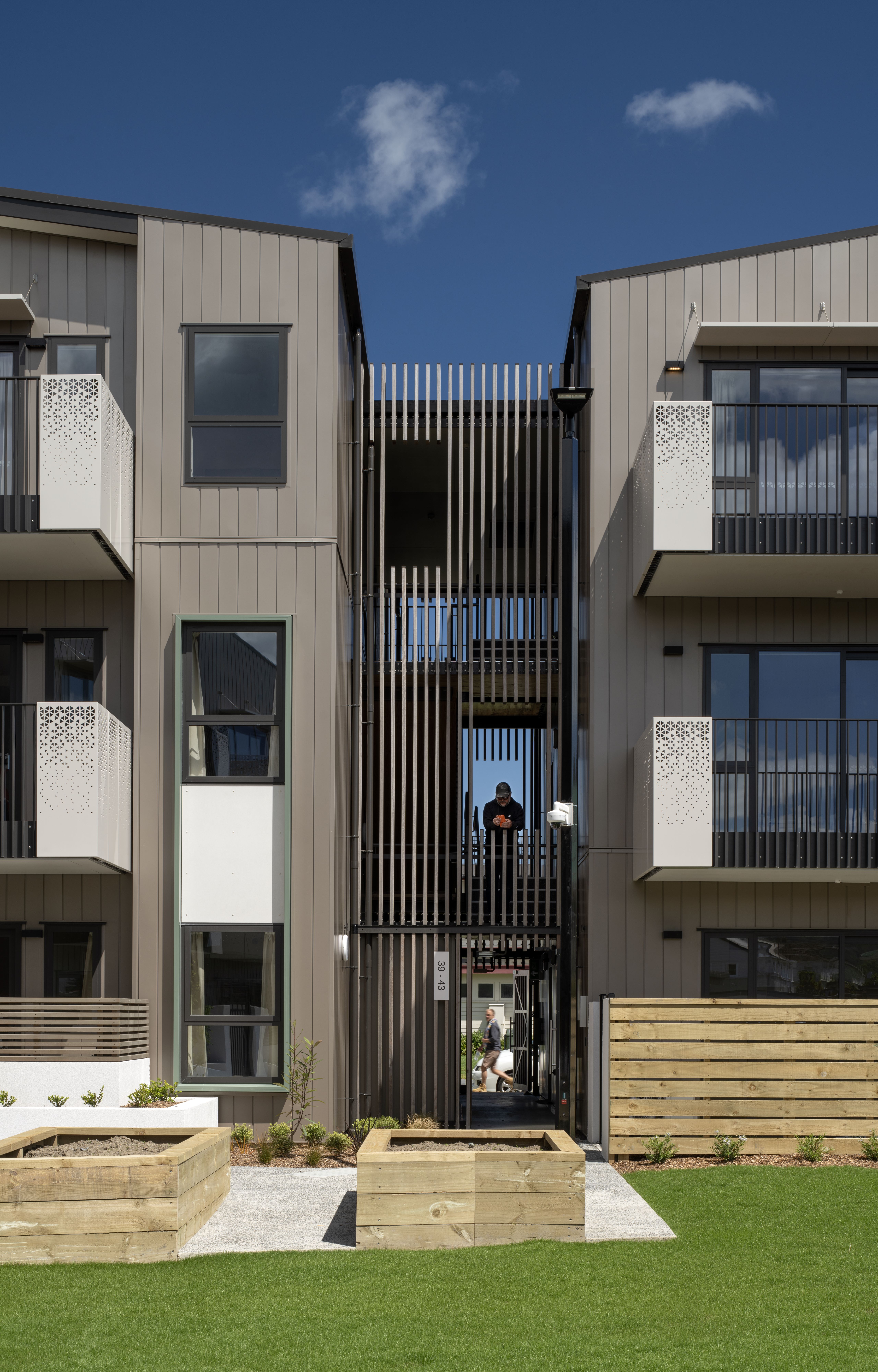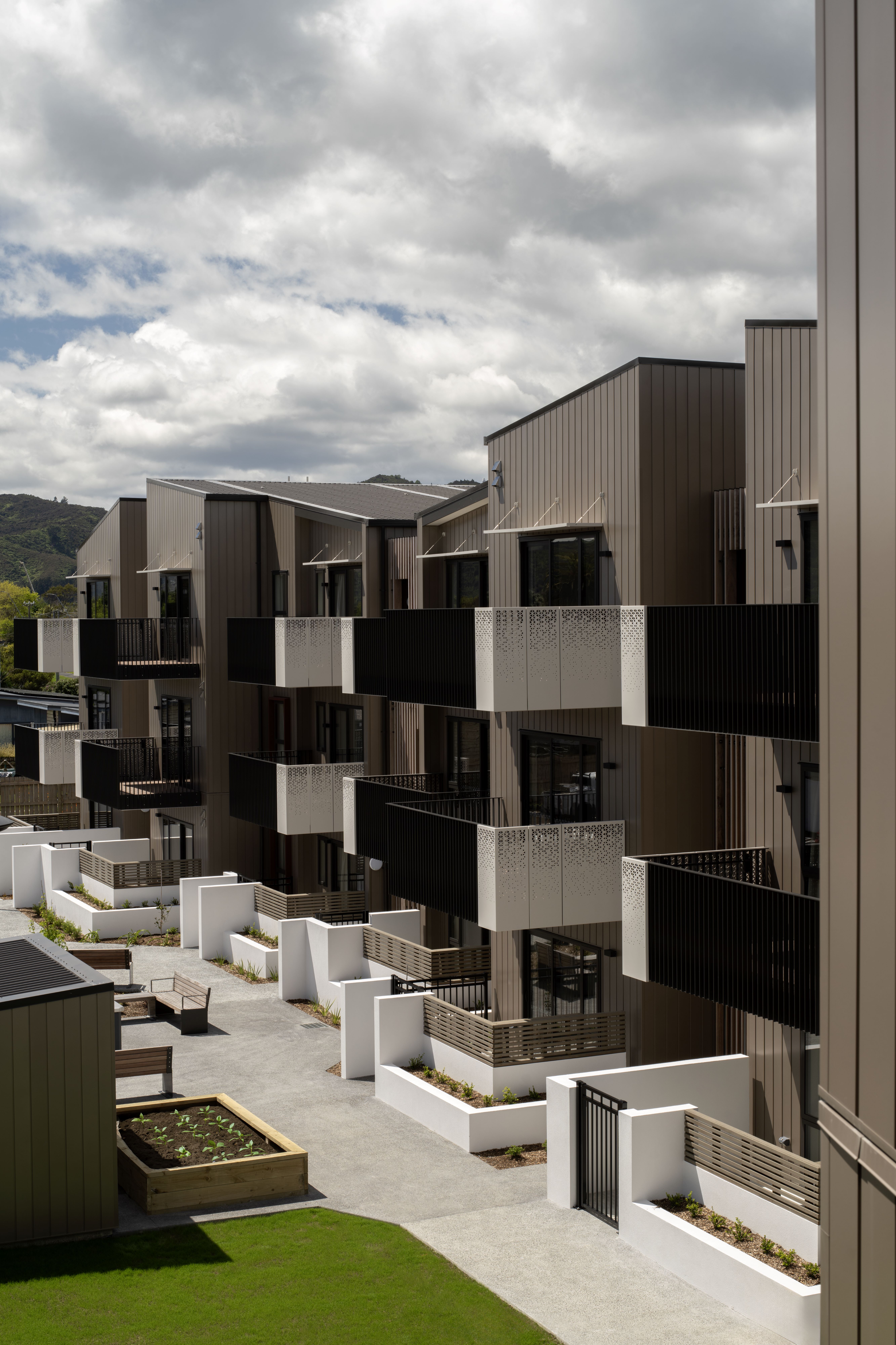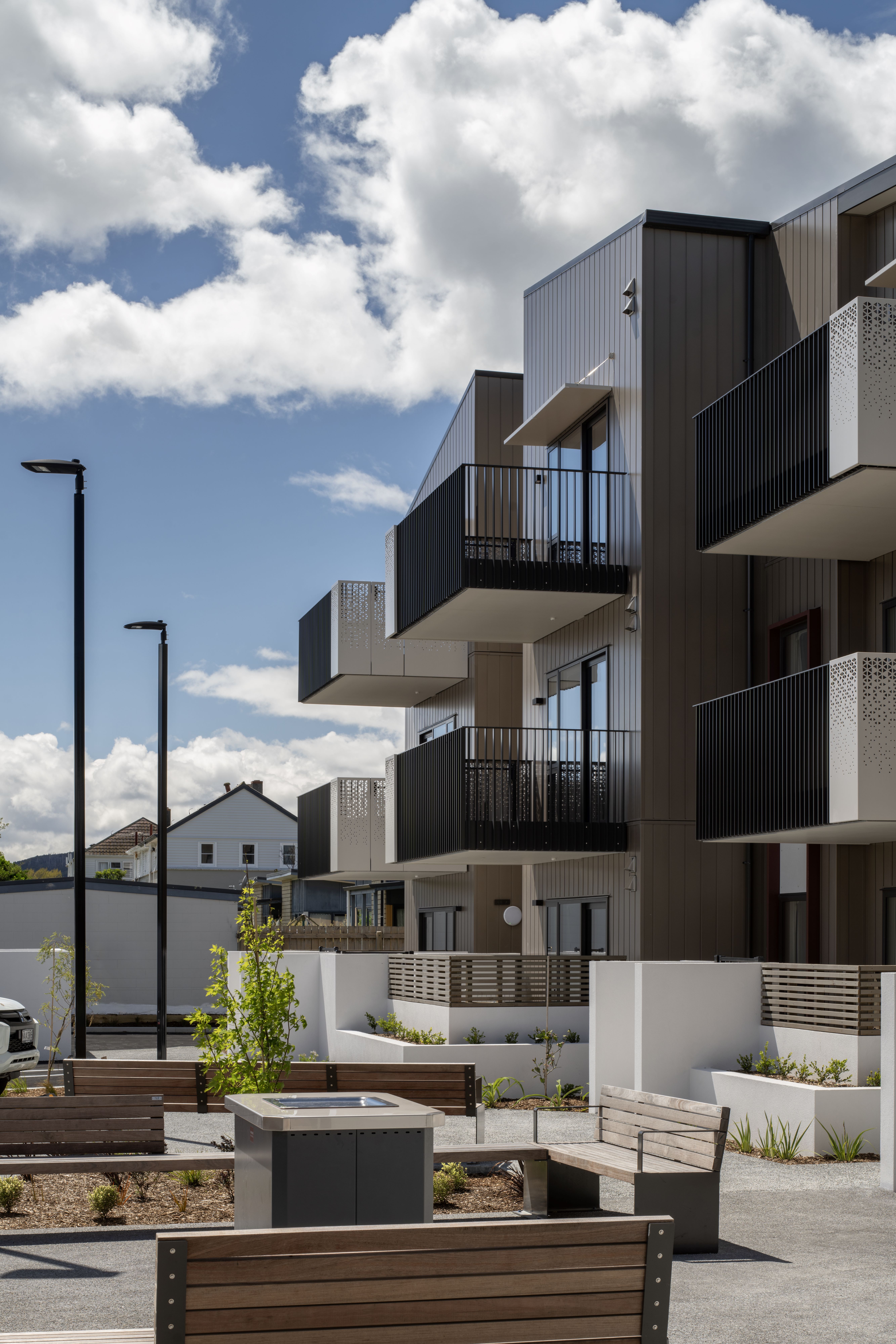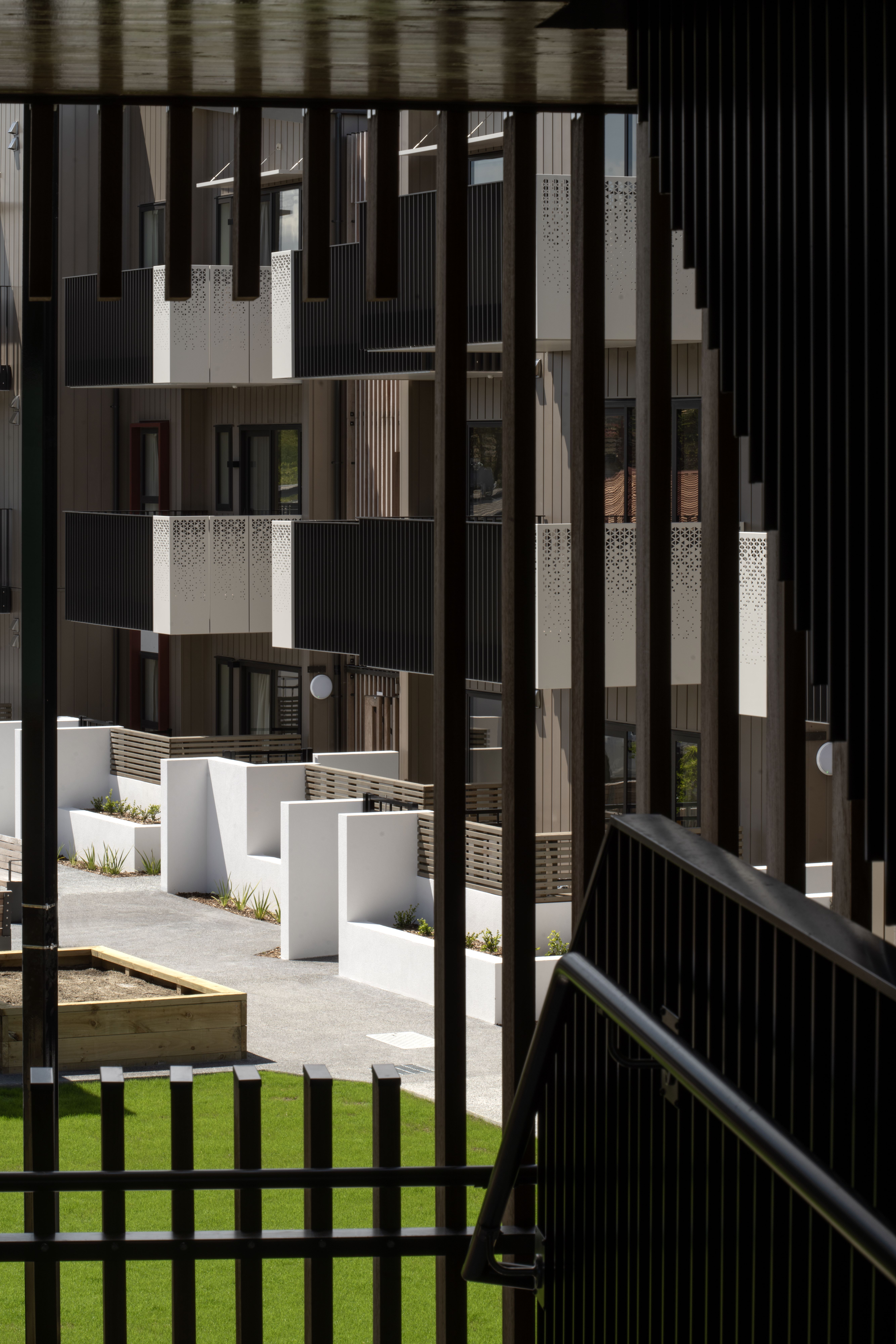 A highly empathetic design response, from site planning to shared stairways, has resulted in a public housing project that allows a sense of community for single-person occupants. Generous and carefully positioned balconies enliven outdoor areas and allow residents to connect in informal ways. The balconies overlook a large central outdoor area that offers places to sit, gather, garden and socialise. Courtyards with garden beds provide texture and depth to the edges of shared spaces. Material selection, such as timber screens in the stairways, have been carefully considered to give public areas texture, warmth and durability. A heart-warming example of a community housing project.