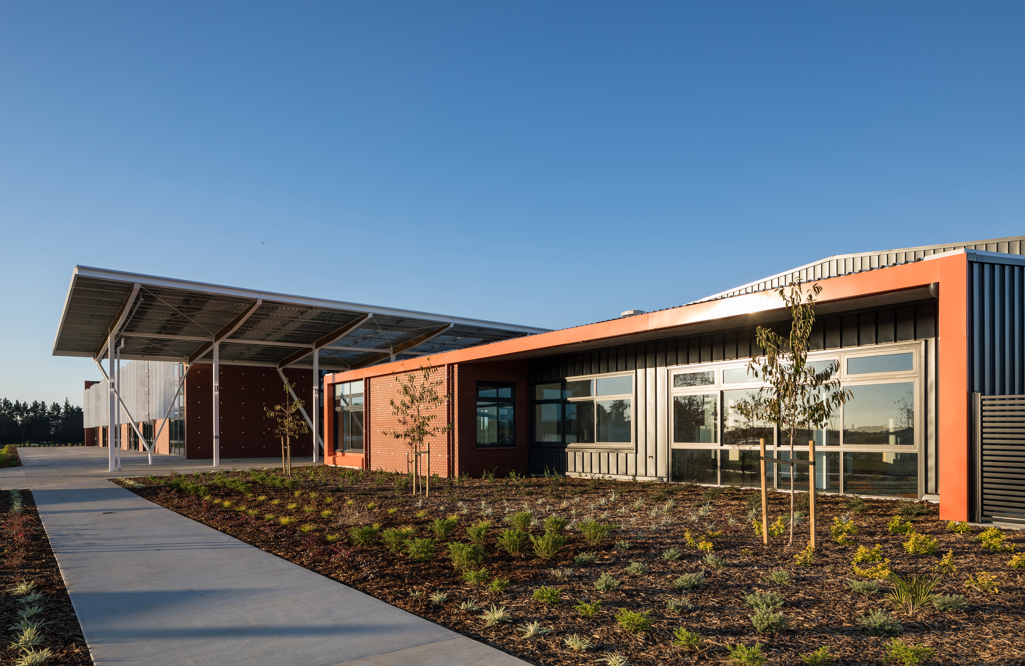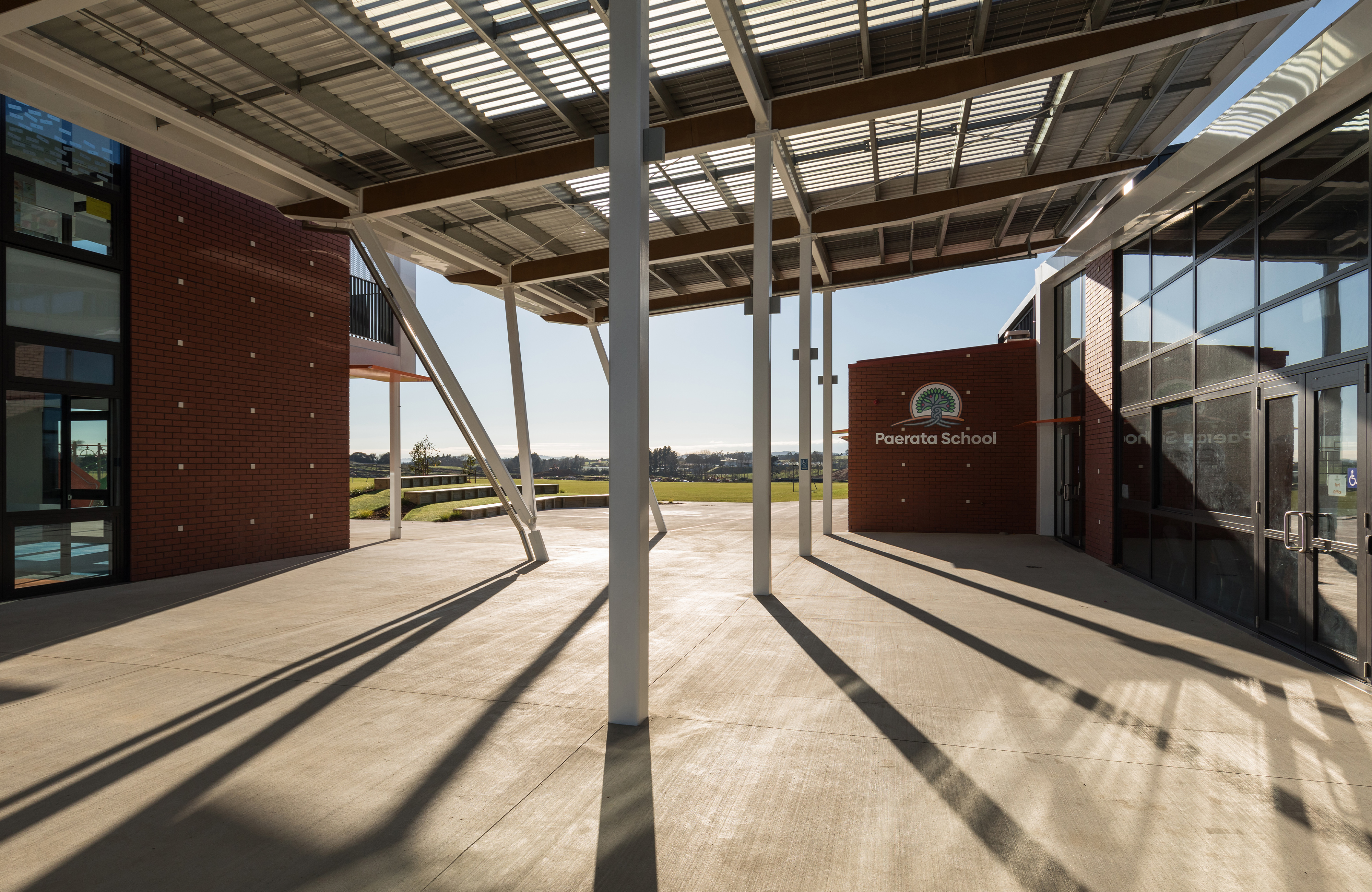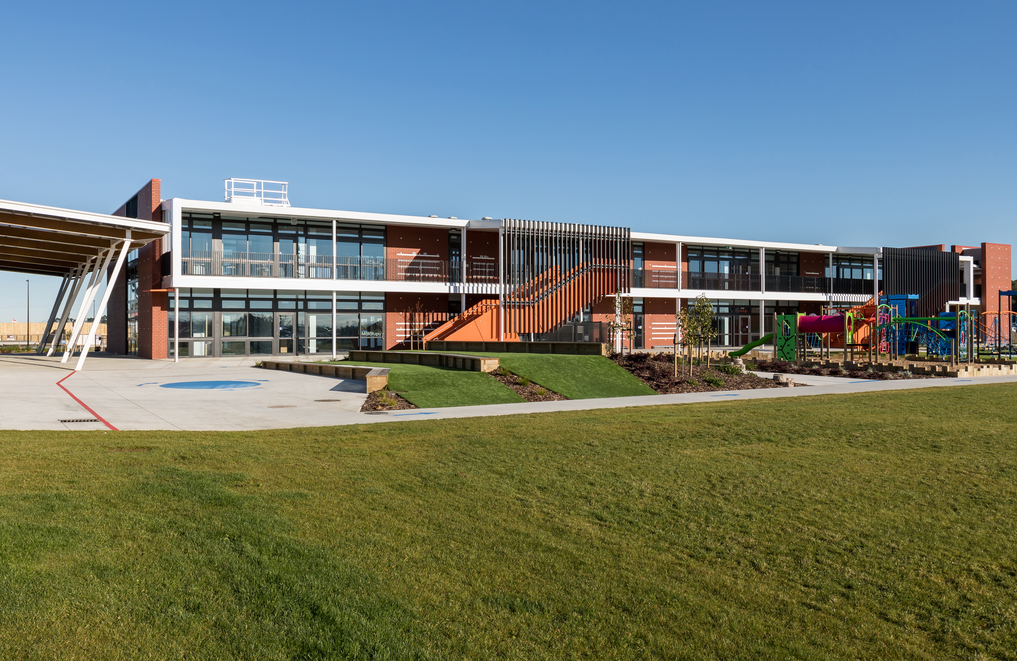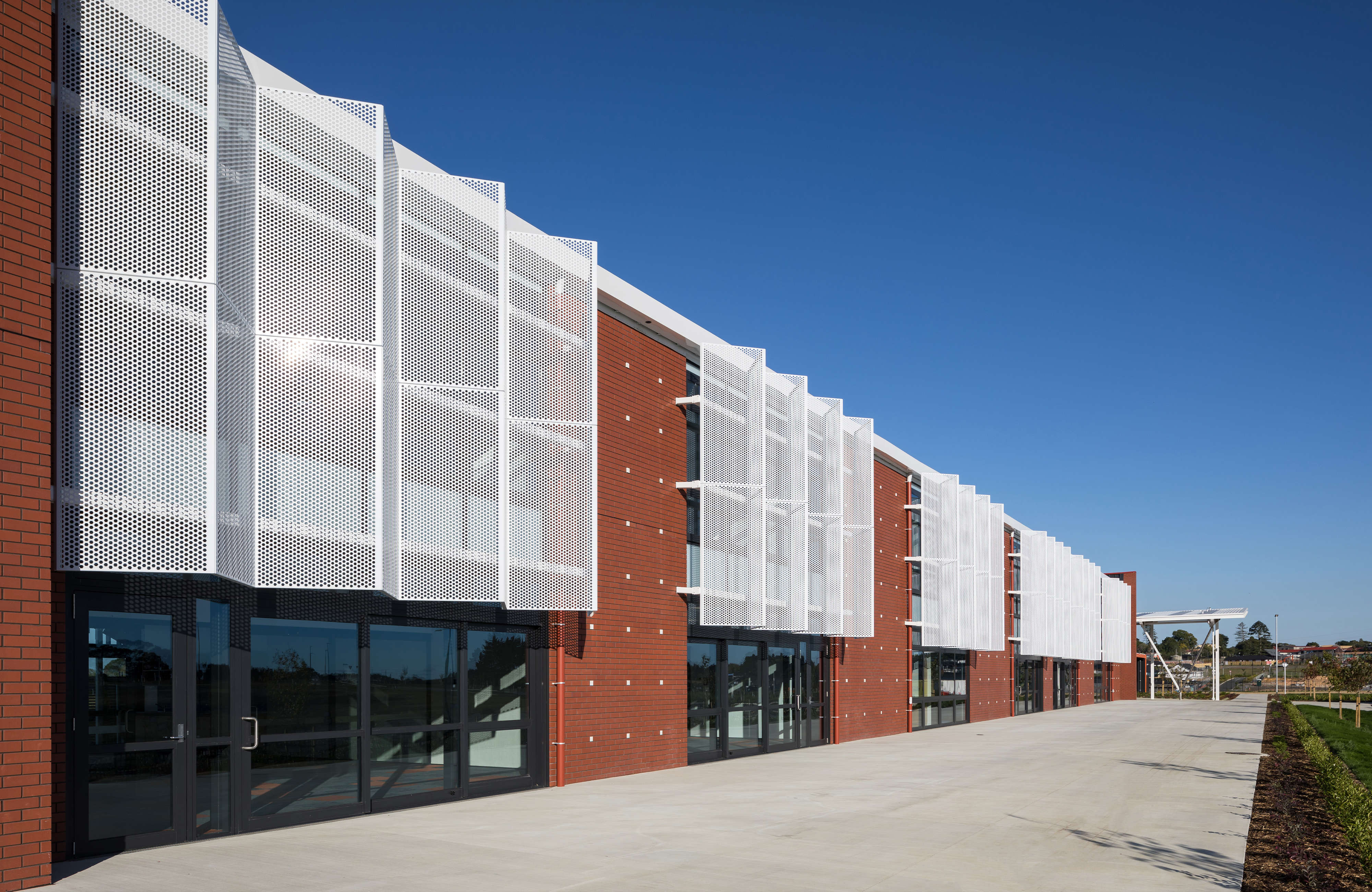 Built in the new community of Paerata Rise south of Papakura, this school is a key contributor to the civic presence of an emerging township, meeting the needs of the school’s pupils and staff, but also the surrounding community. Everyday coming and going for the school occurs at a central point on a north-south axis. Teaching spaces are arranged on one side and administration, library and larger gathering facilities like the gym on the other. The flexibility of the latter provides a multi-gathering venue for the broader community. While following a fairly typical arrangement of double storey teaching rooms accessed off a veranda, innovative space distribution and perforated screens layered on the western façade sets this school beyond the typical.