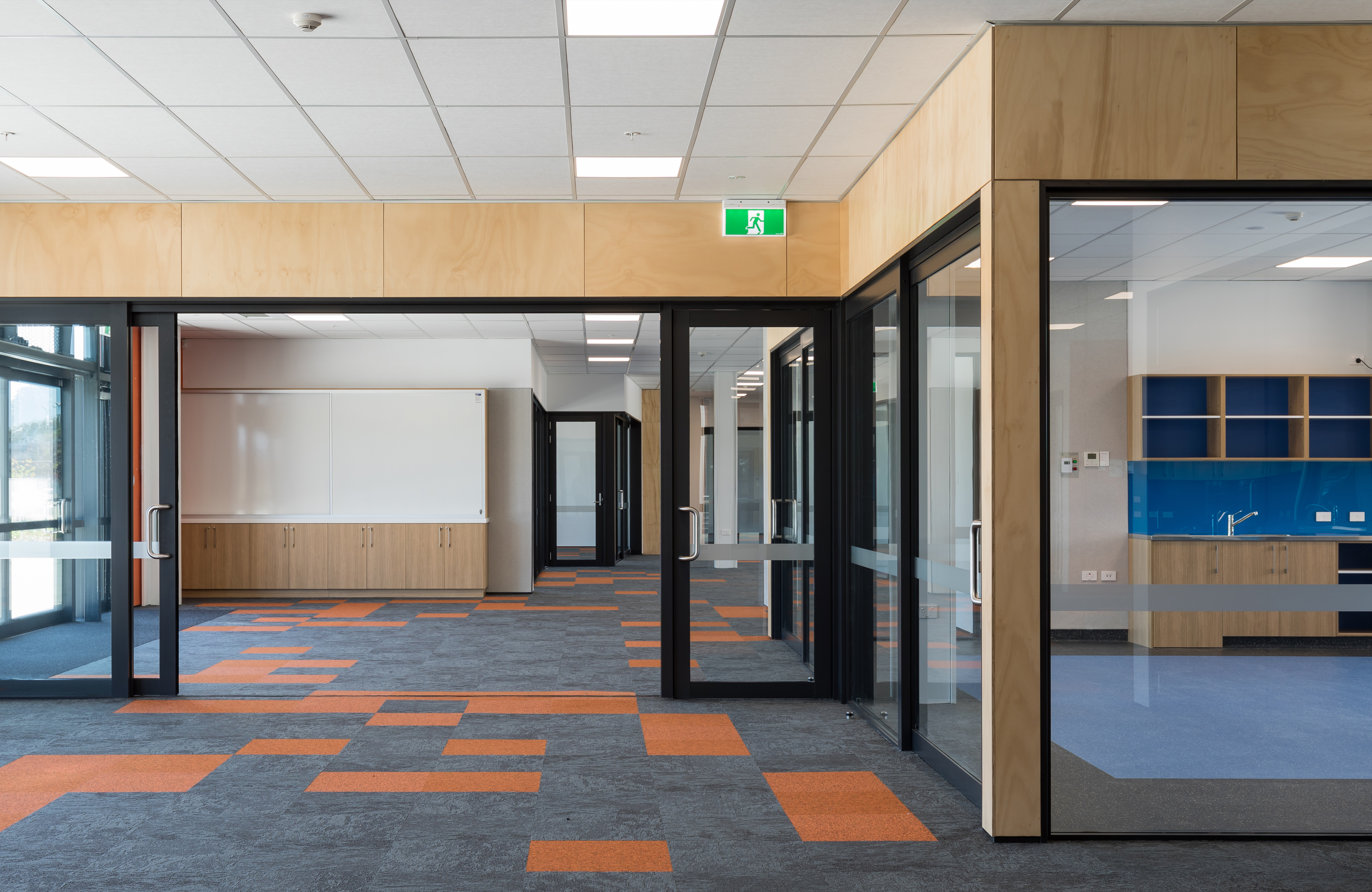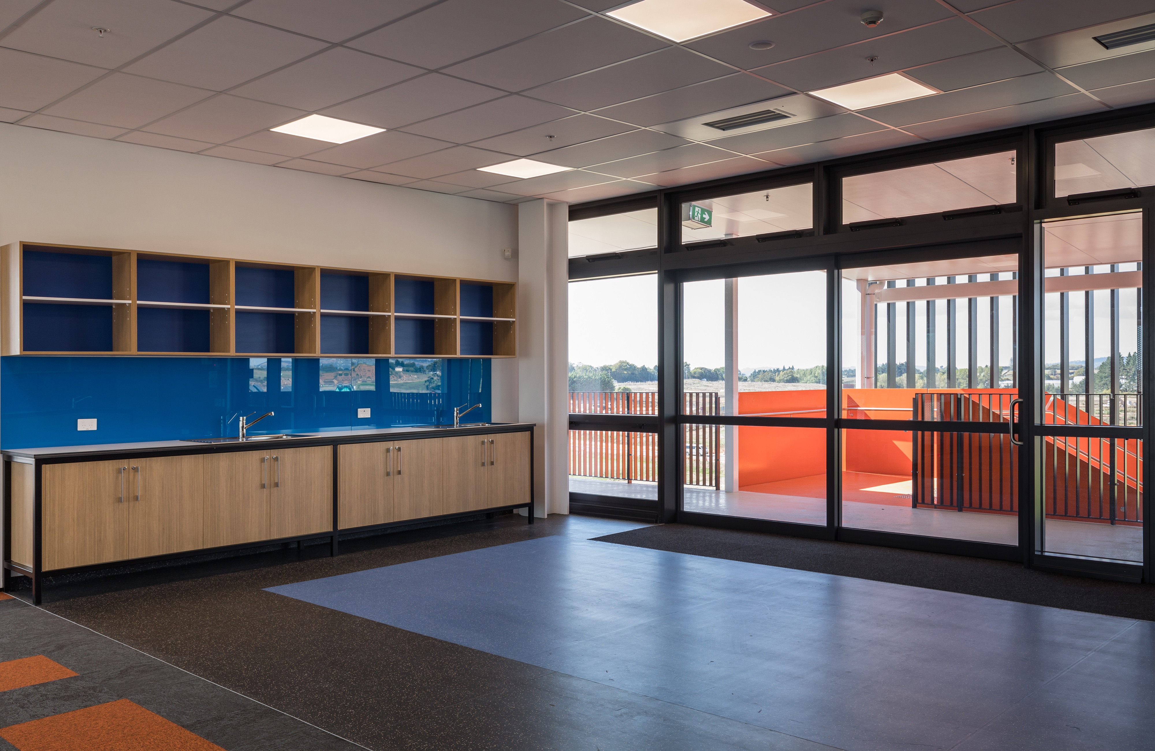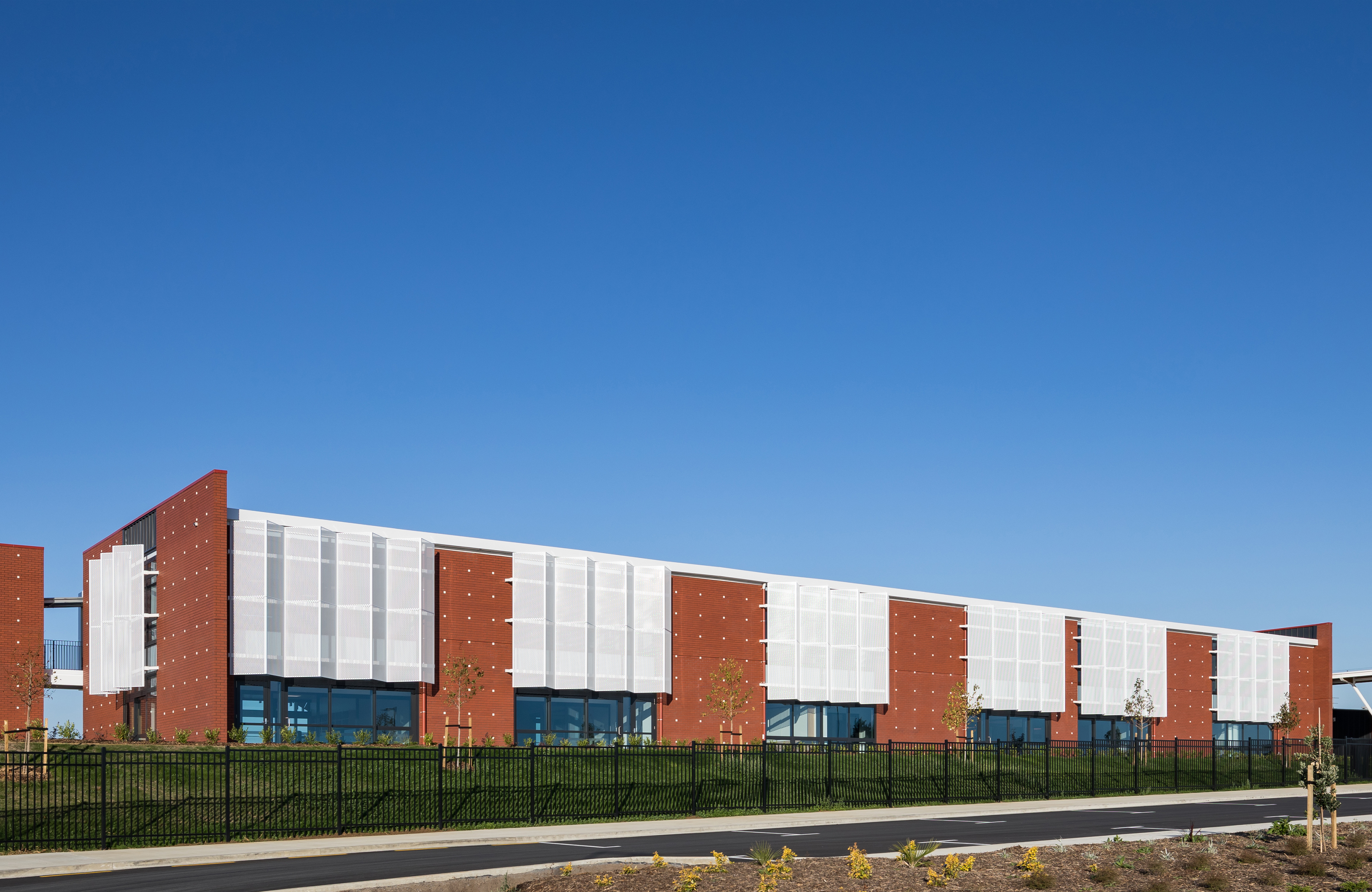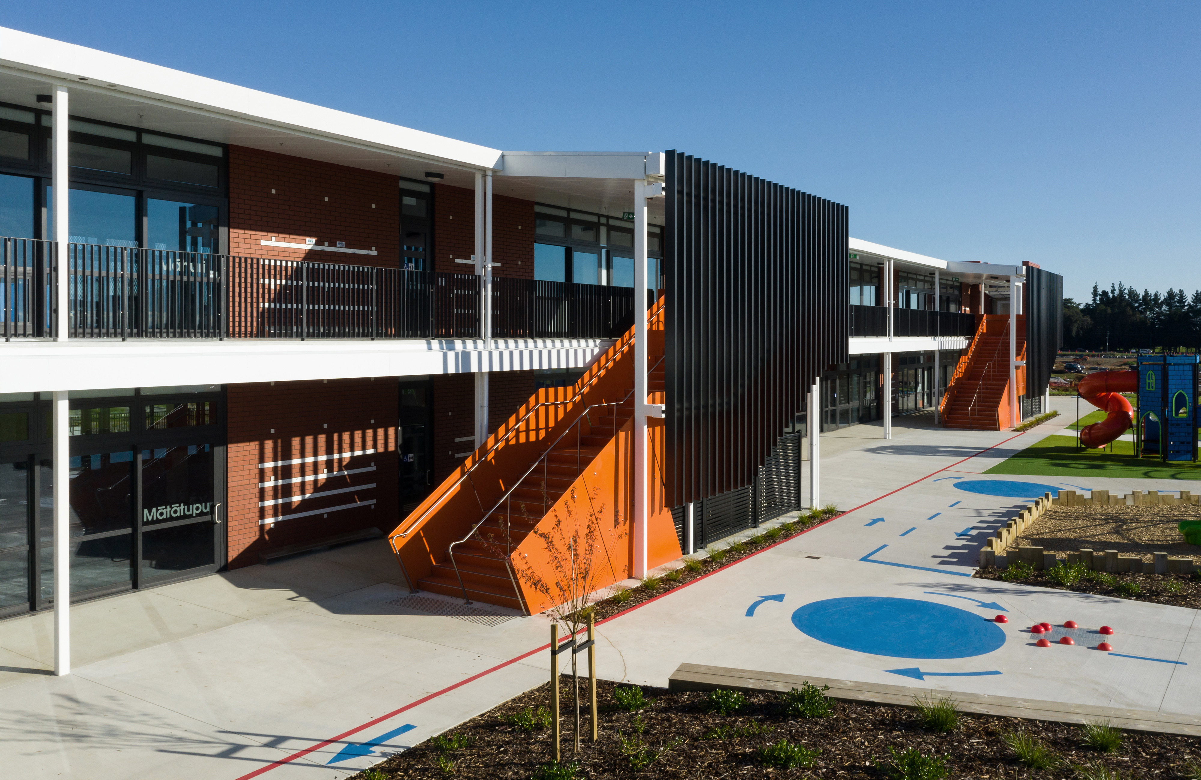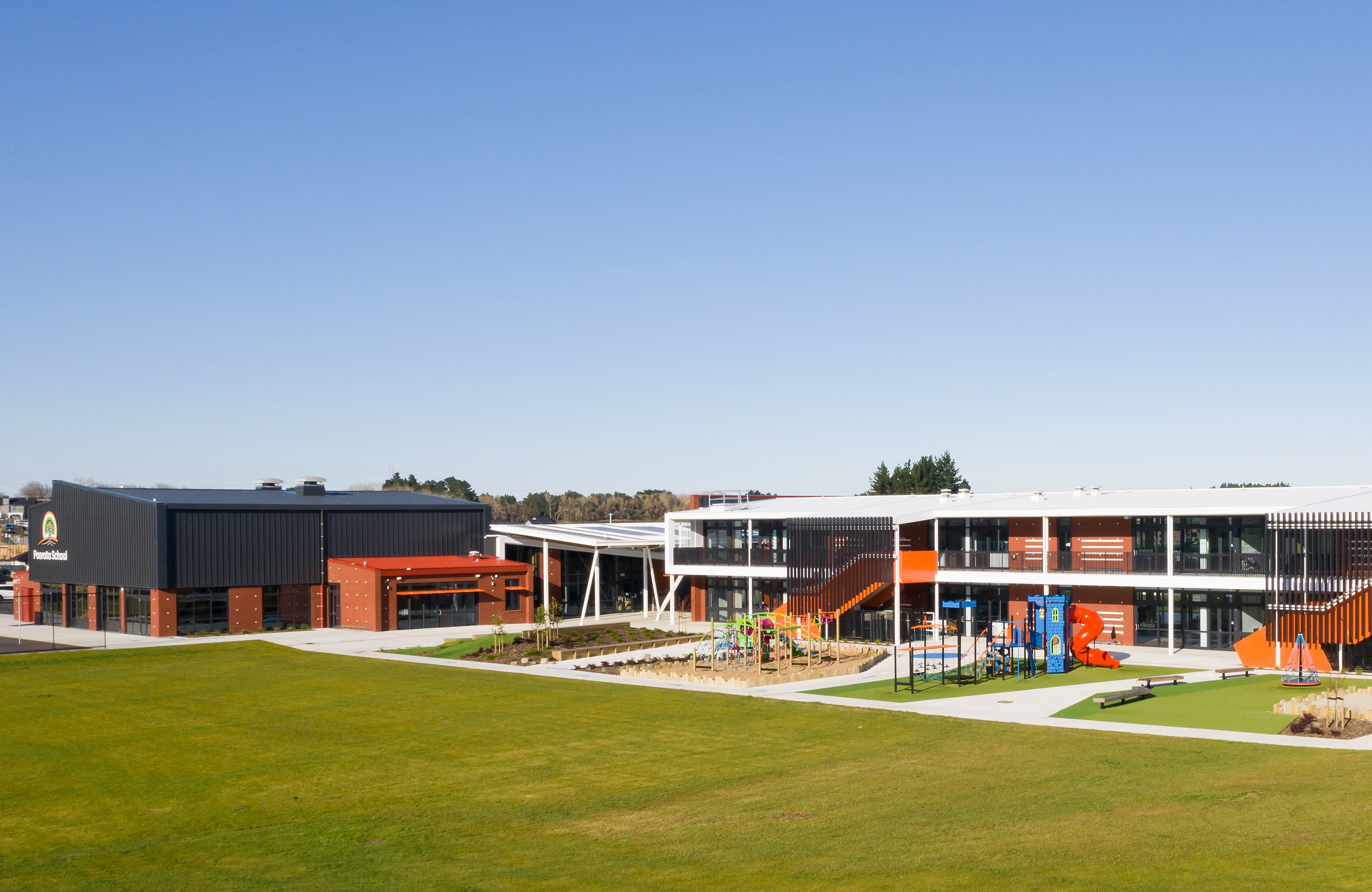 Built in the new community of Paerata Rise south of Papakura, this school is a key contributor to the civic presence of an emerging township, meeting the needs of the school’s pupils and staff, but also the surrounding community. Everyday coming and going for the school occurs at a central point on a north-south axis. Teaching spaces are arranged on one side and administration, library and larger gathering facilities like the gym on the other. The flexibility of the latter provides a multi-gathering venue for the broader community. While following a fairly typical arrangement of double storey teaching rooms accessed off a veranda, innovative space distribution and perforated screens layered on the western façade sets this school beyond the typical.