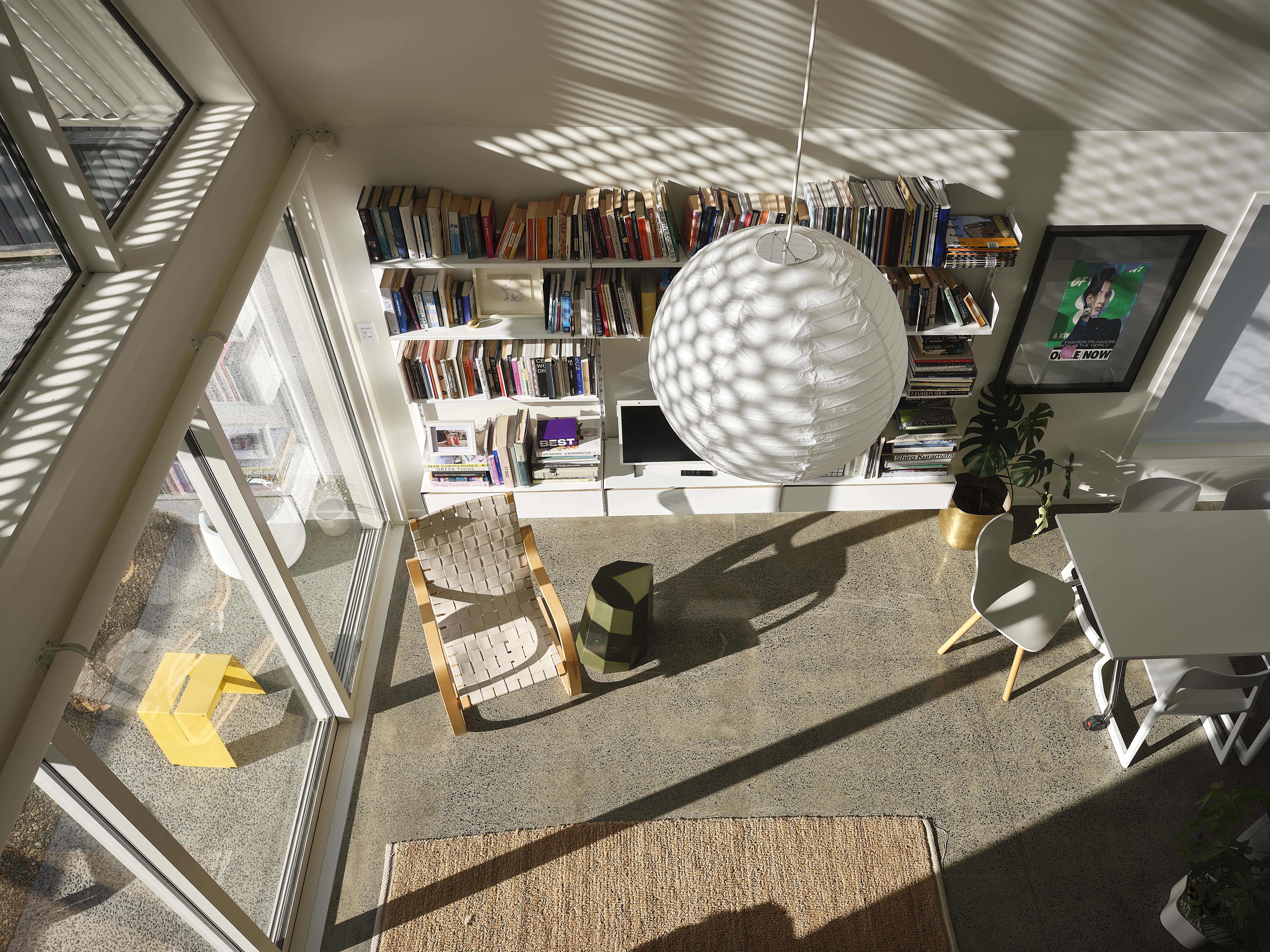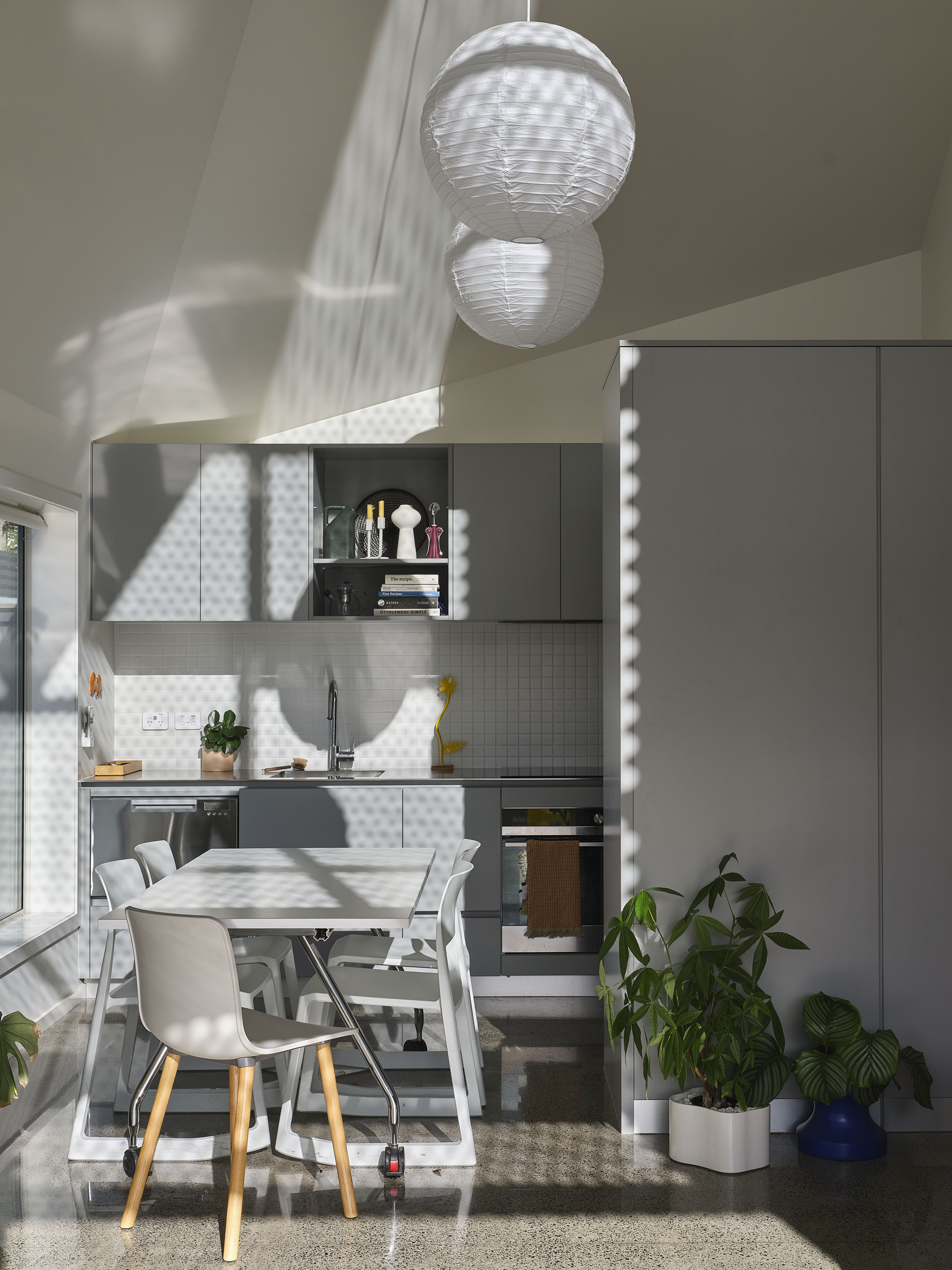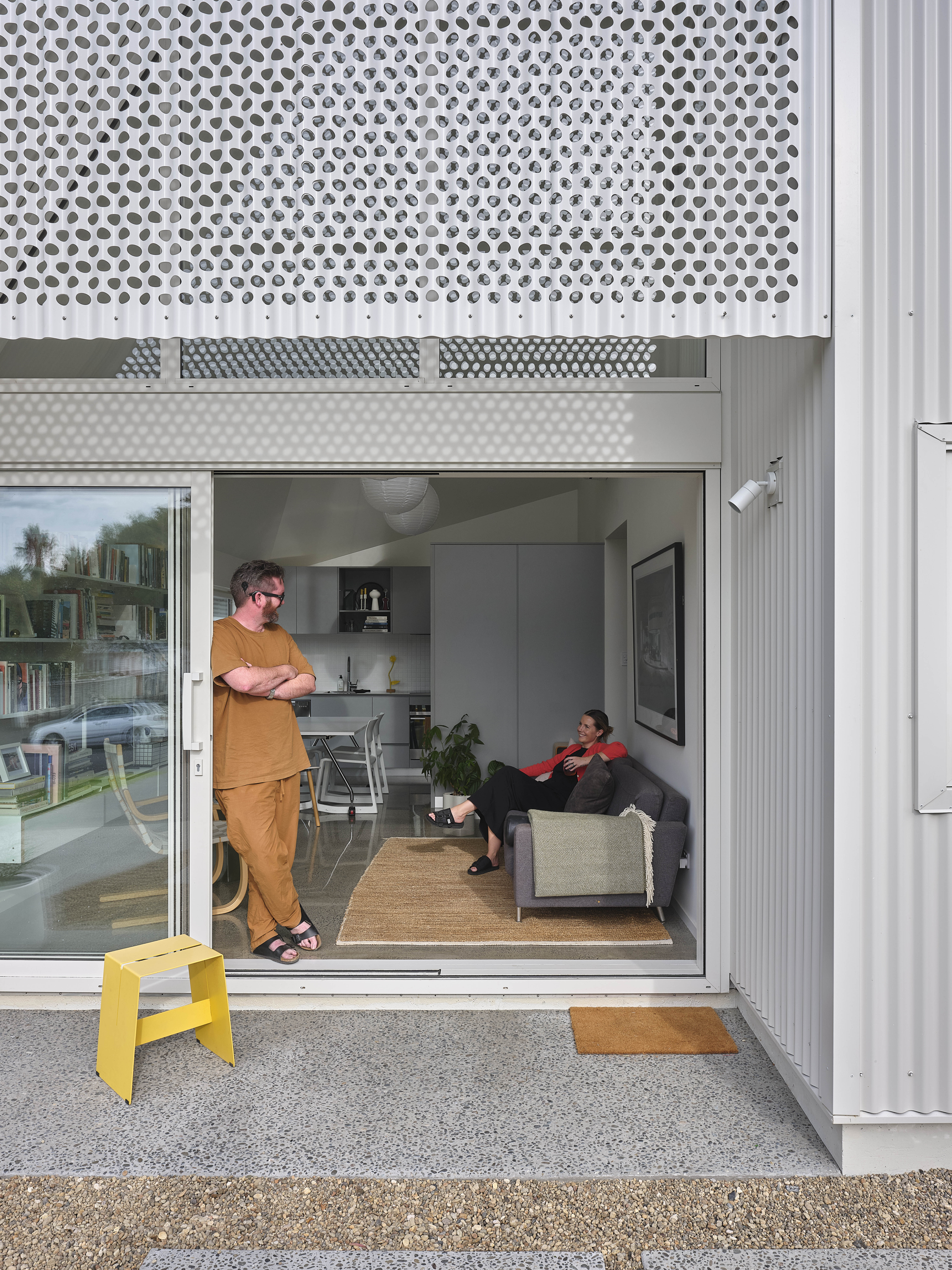 A pocket site generates a clever design response, offering a young couple the opportunity to build a standalone home for themselves in an established neighbourhood. Working directly with the contractor for concept and design advice has been, in this instance, a very successful model. Planning parameters have helped generate the primary form, recessive to the rear and side boundaries and ascendant to the street, creating a memorable asymmetrical gable end to the frontage. Dipped in white, the house is playful and the compact plan exudes spatial generosity by virtue of a north-facing, double-height living space.