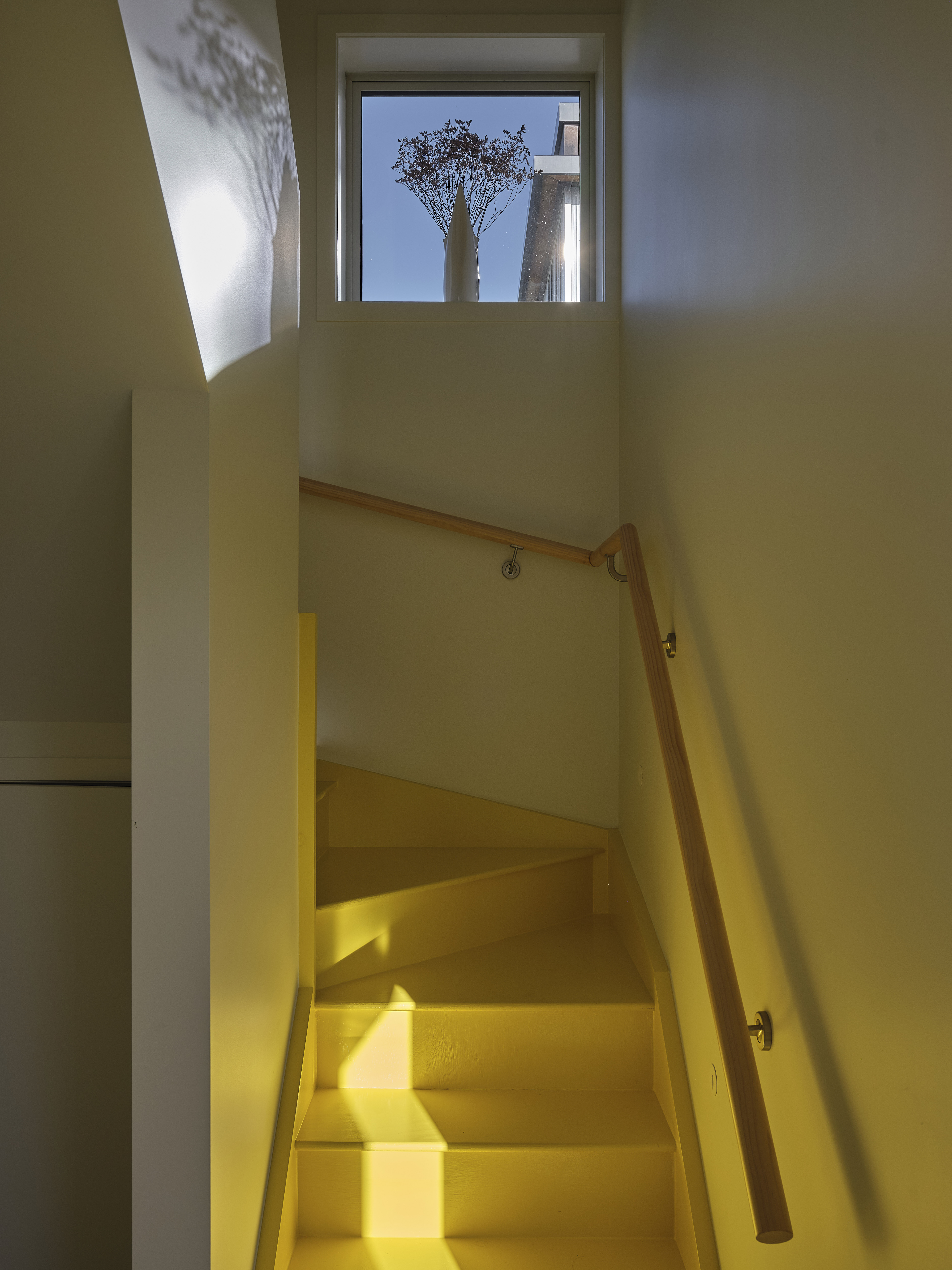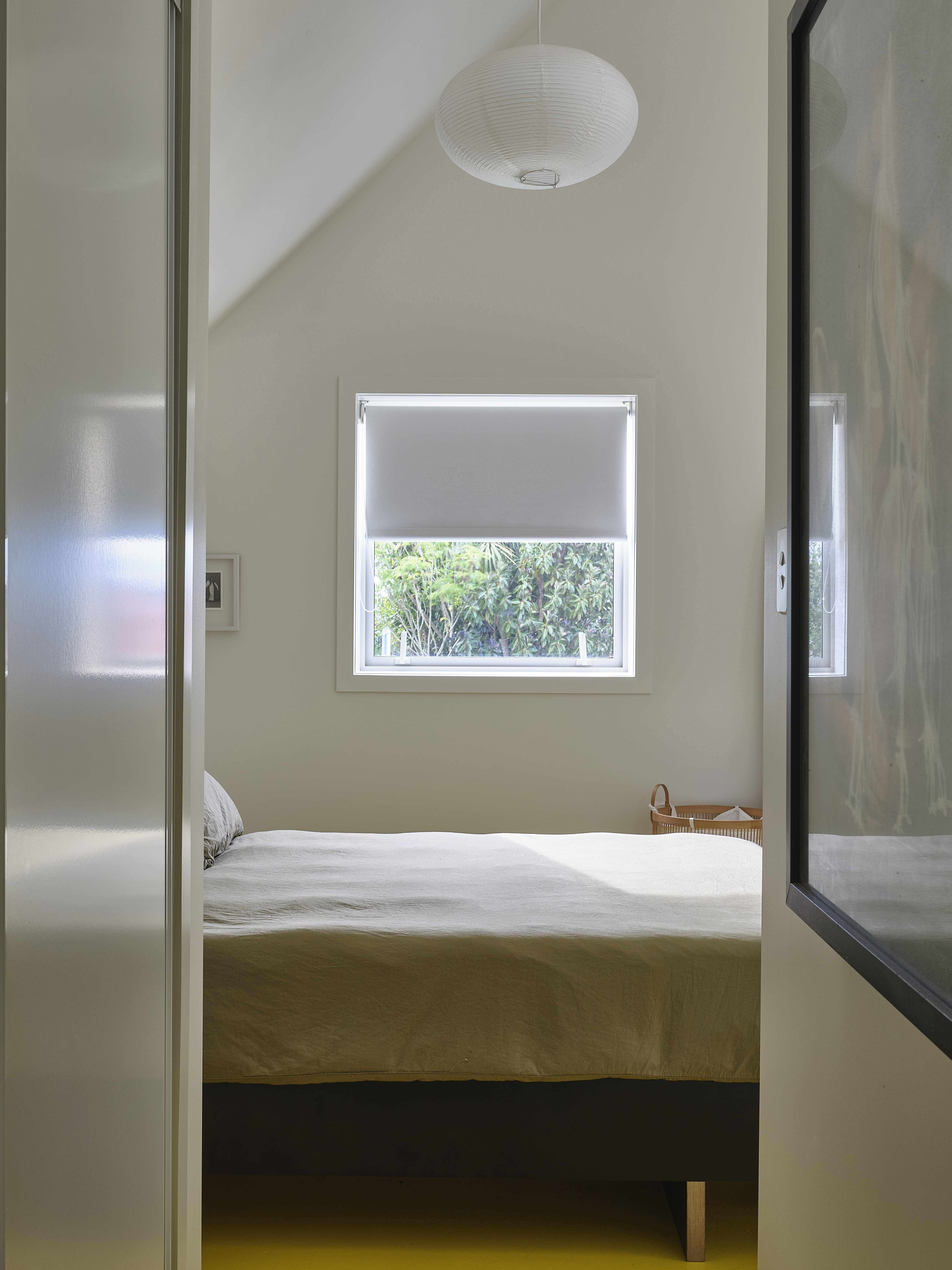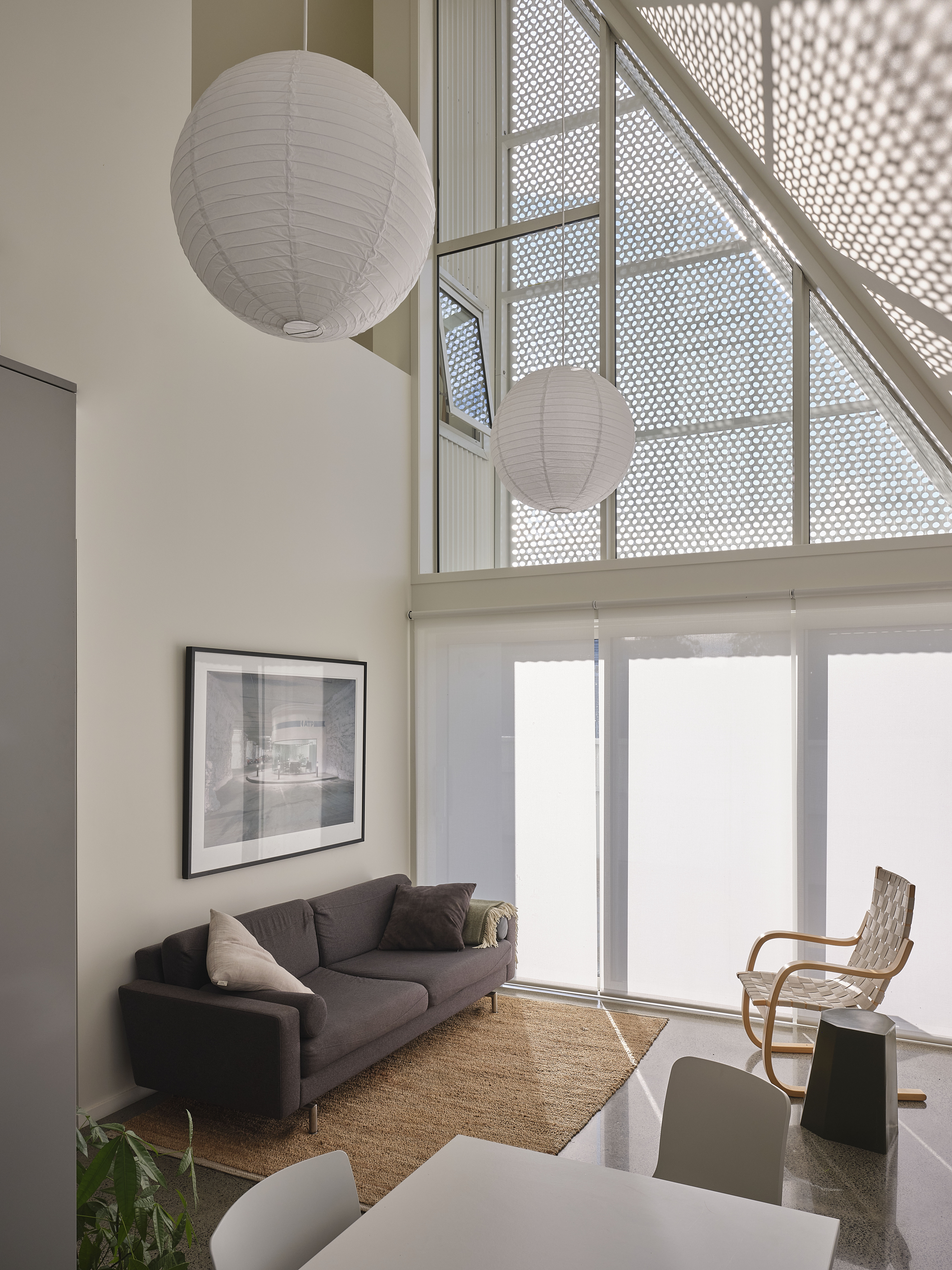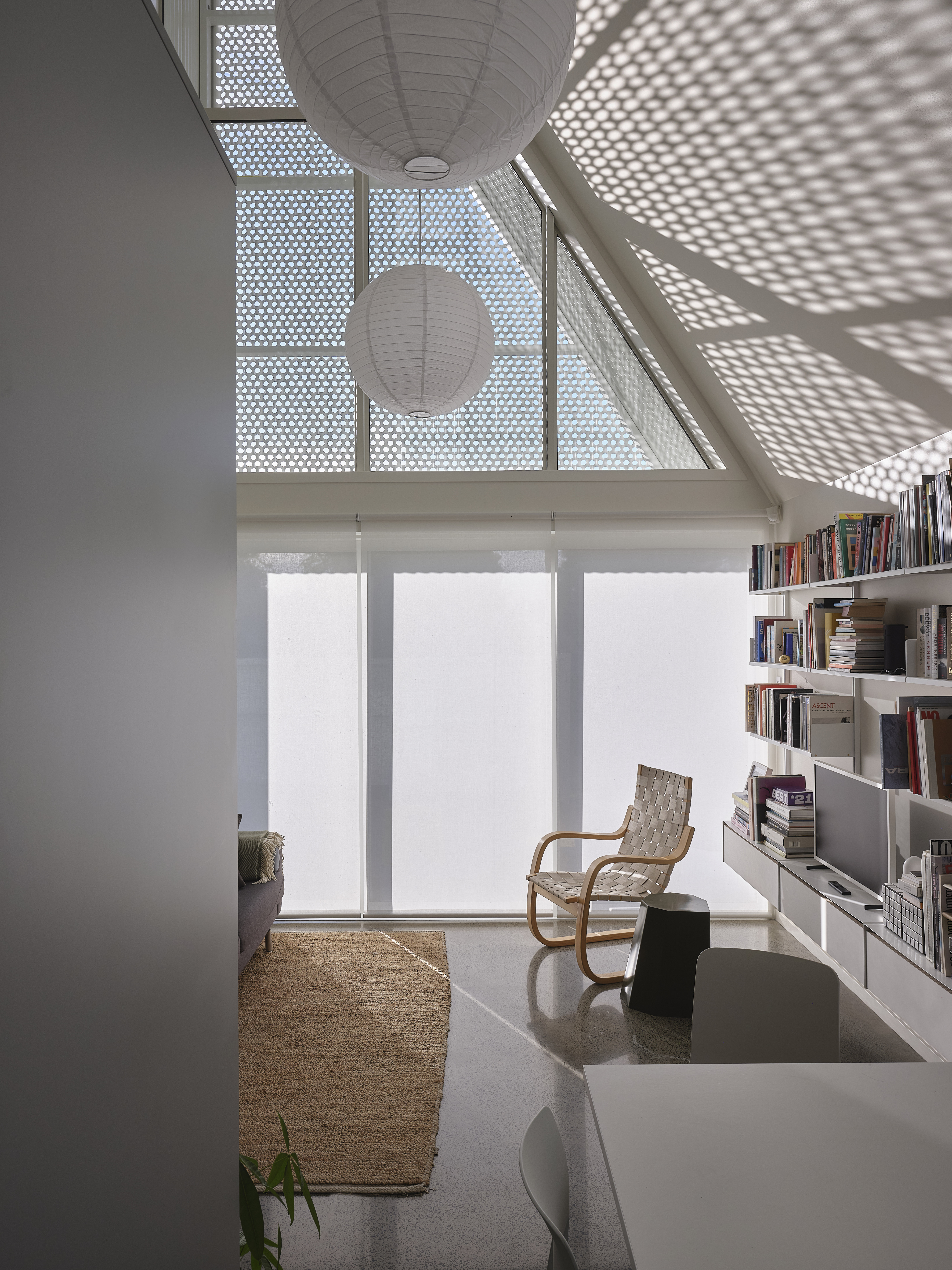A pocket site generates a clever design response, offering a young couple the opportunity to build a standalone home for themselves in an established neighbourhood. Working directly with the contractor for concept and design advice has been, in this instance, a very successful model. Planning parameters have helped generate the primary form, recessive to the rear and side boundaries and ascendant to the street, creating a memorable asymmetrical gable end to the frontage. Dipped in white, the house is playful and the compact plan exudes spatial generosity by virtue of a north-facing, double-height living space.