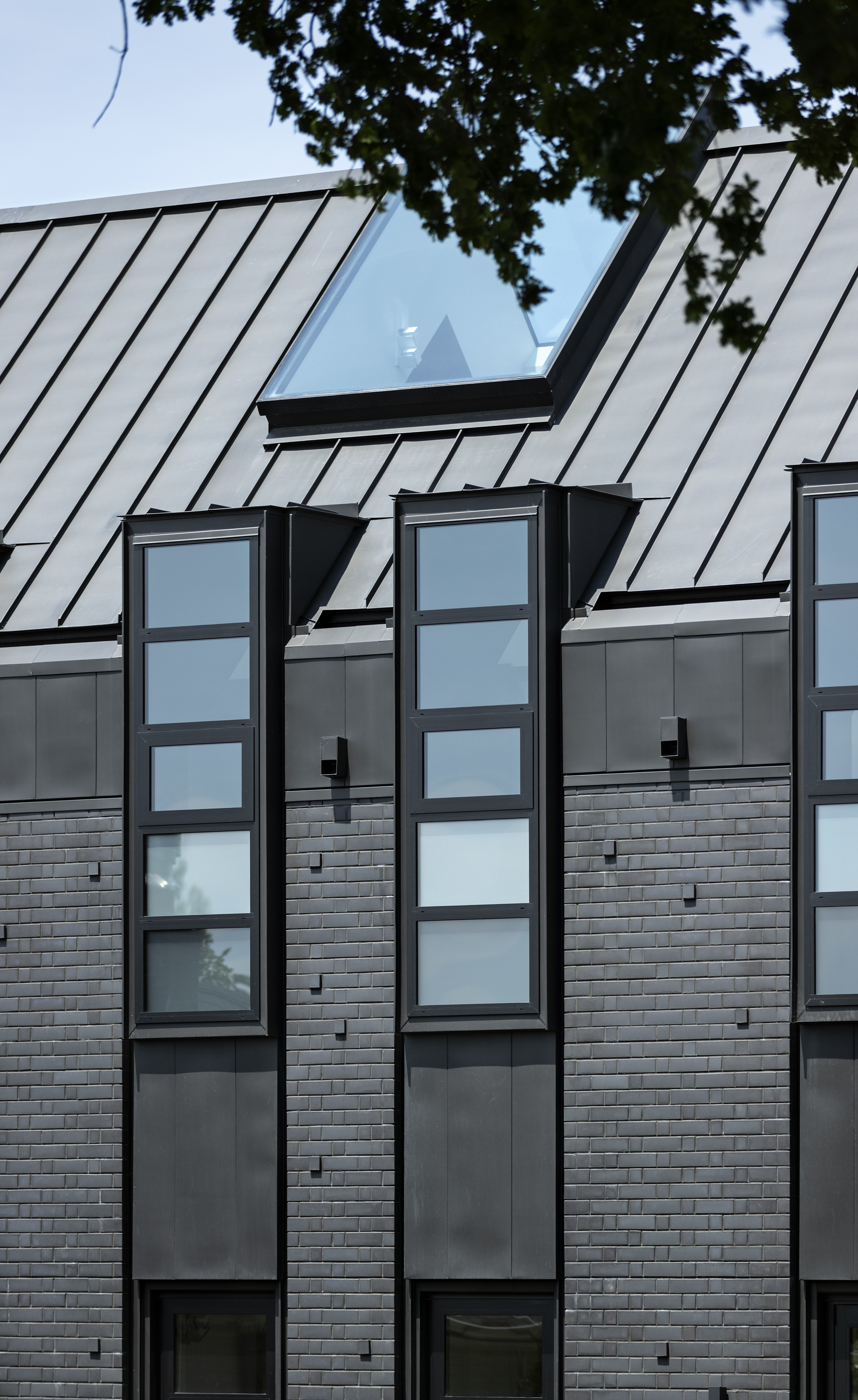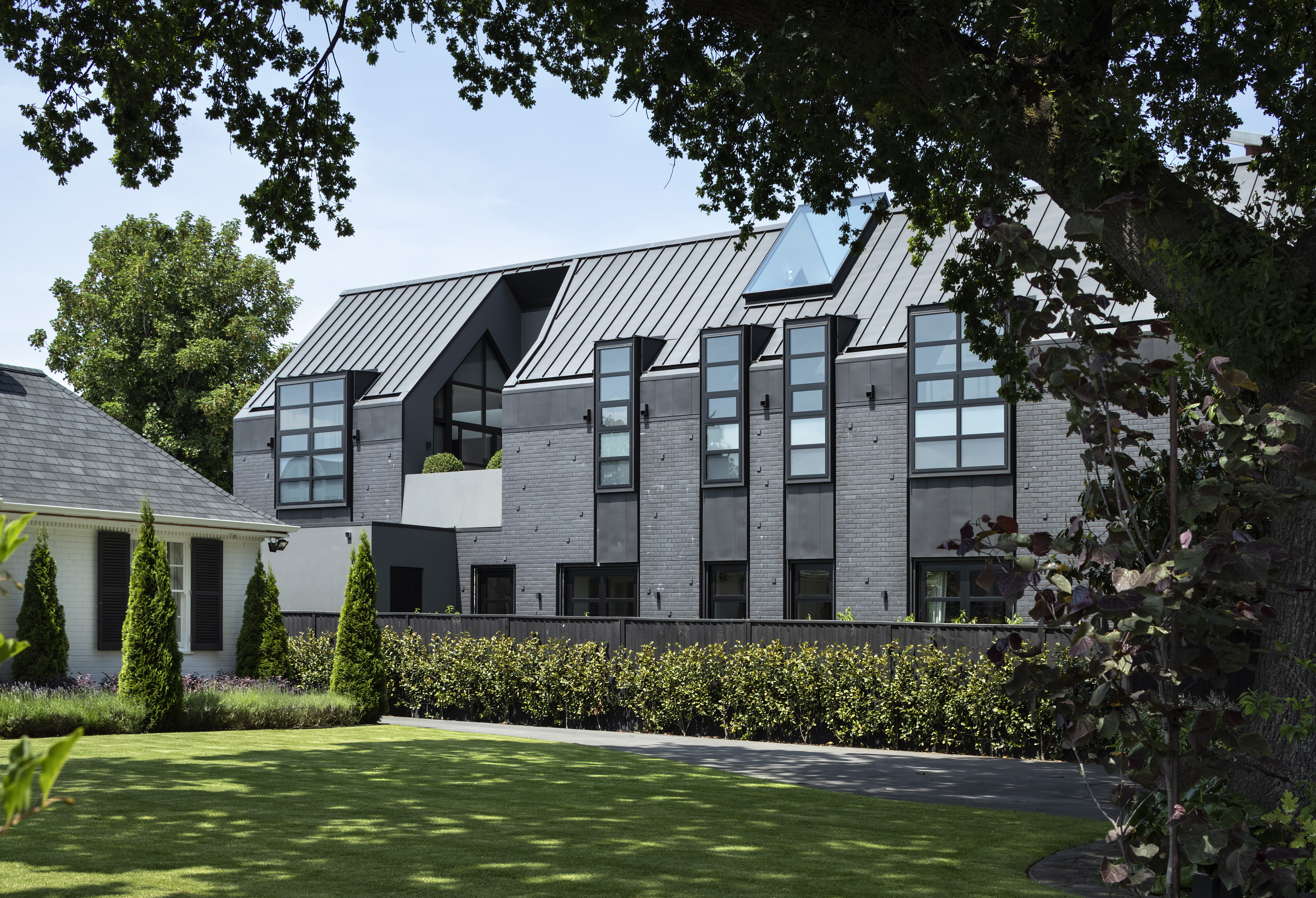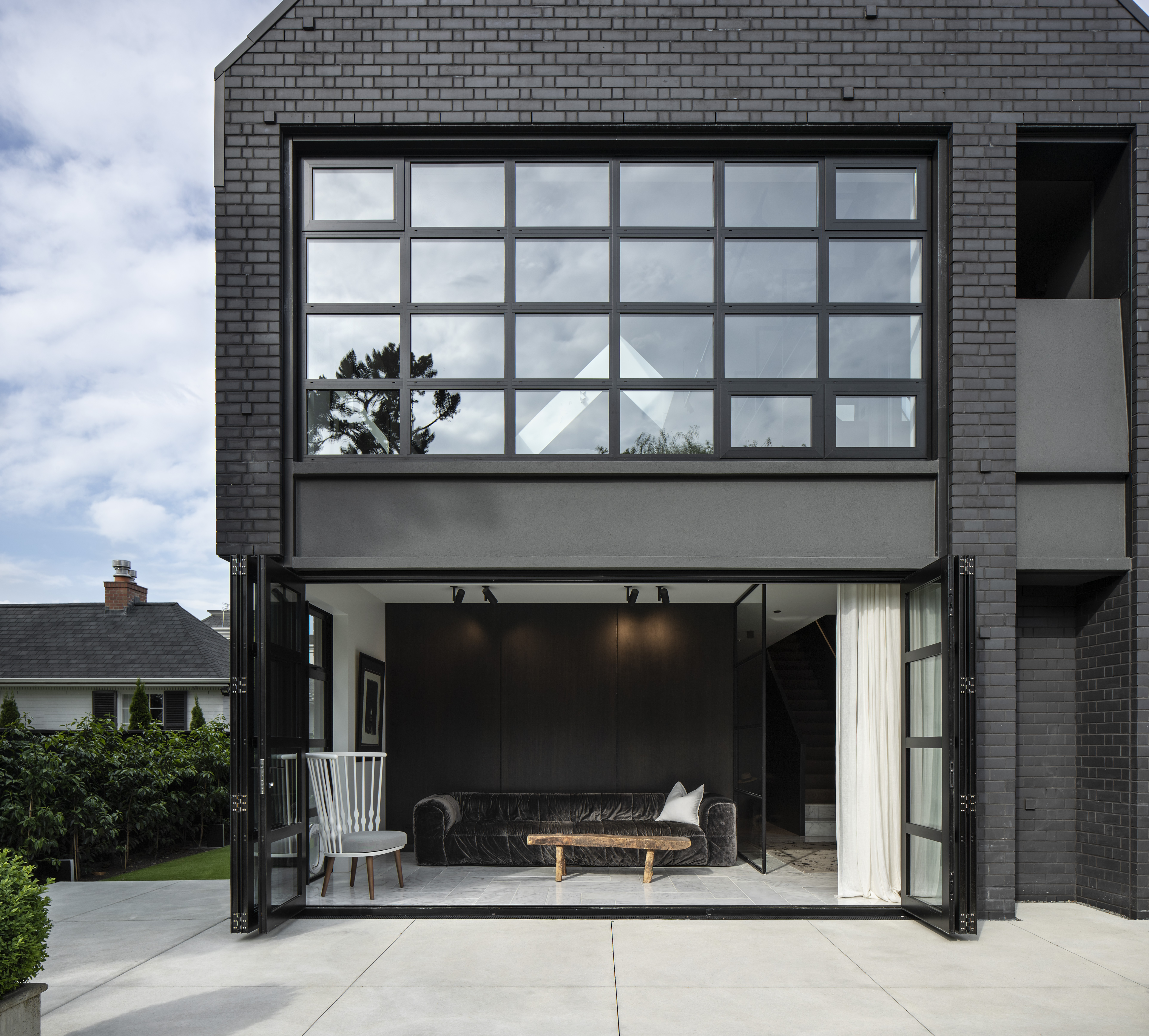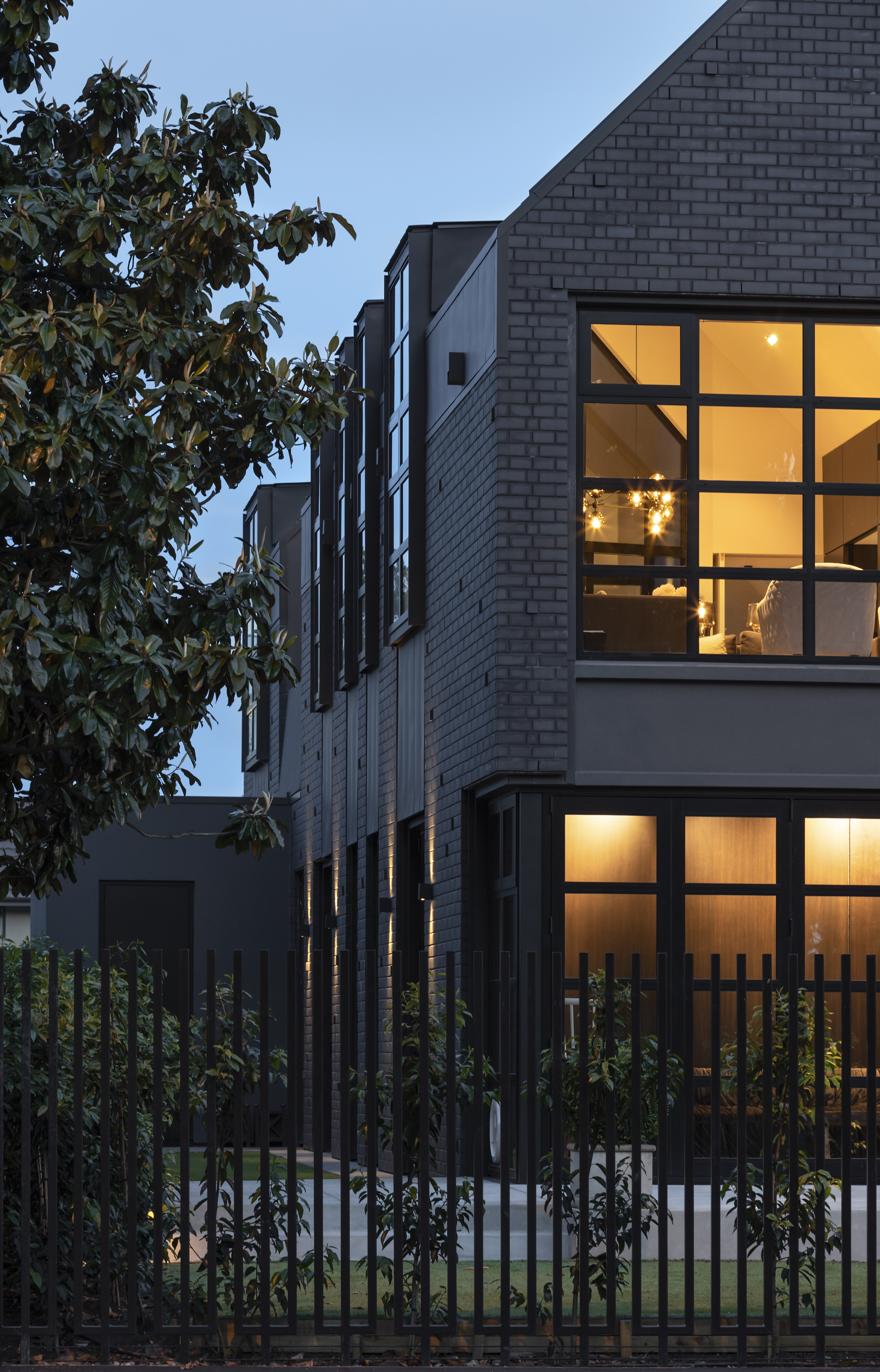 A post-earthquake rebuild that acknowledges and playfully interrogates Christchurch’s architectural heritage, this black gable form is exquisitely composed via a process of addition and subtraction. Riffing on the themes of warehouse and home, Flemish bond brick on the tough south edge contrasts with glazing on the north and west façades, offering stolen views through the neighbour’s garden and willow trees to the park. Internally, a raw industrial aesthetic is balanced by elegant detailing. Drama and contrast underpin the architectural configuration, with a steel-lined circulation spine mediating the industrial and the domestic, while dark brick walls dematerialise at night and the building comes out to play.