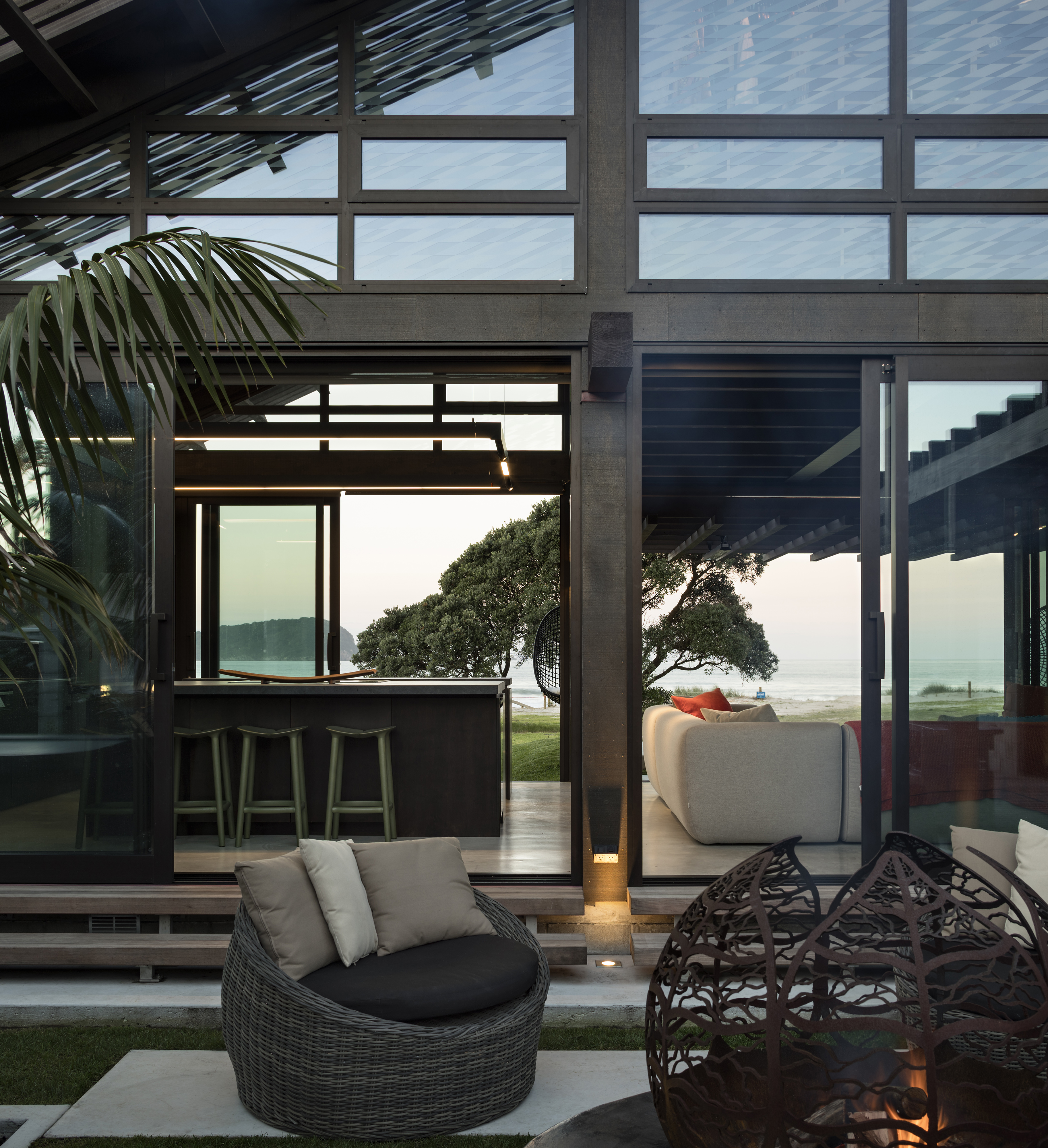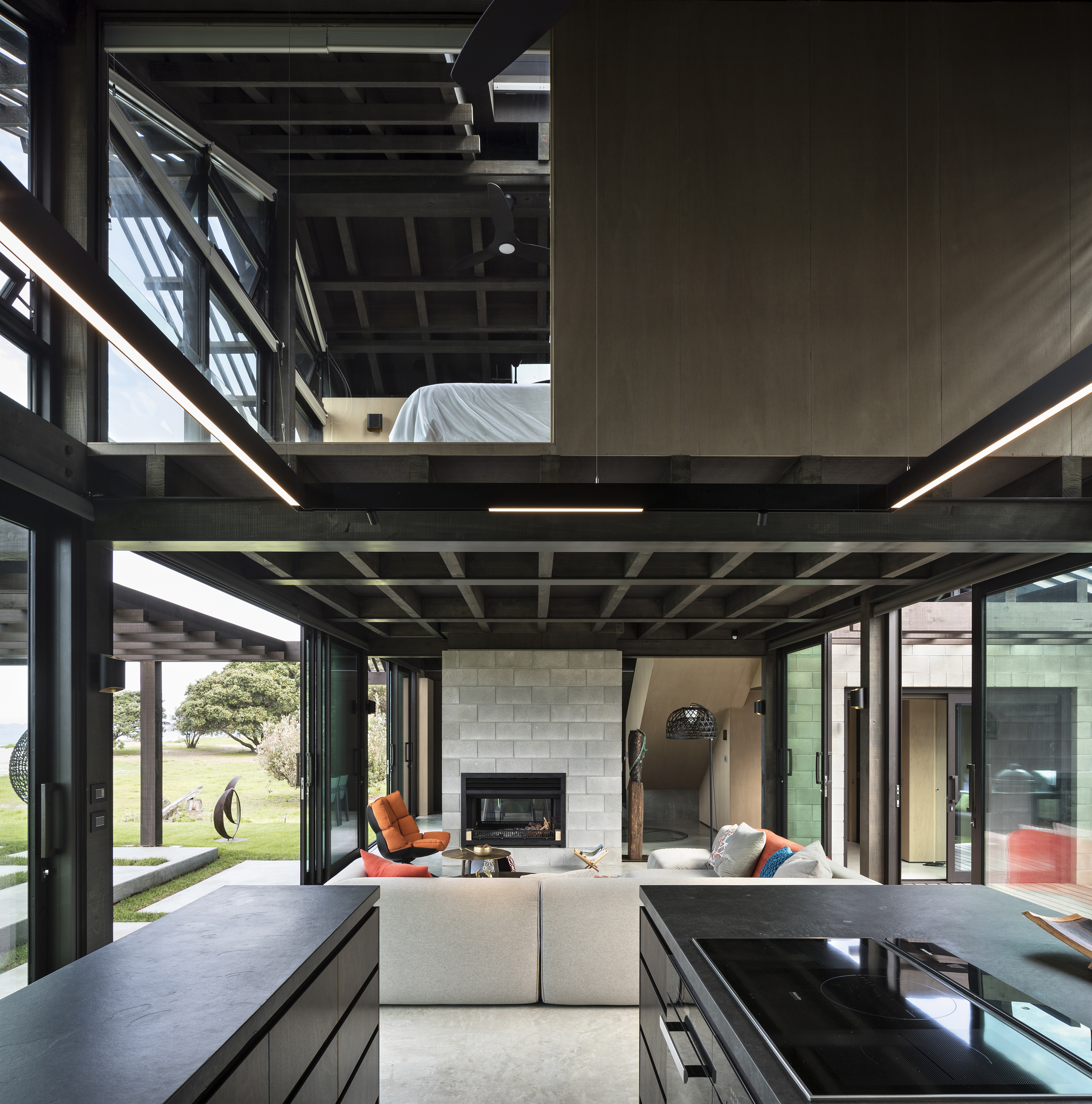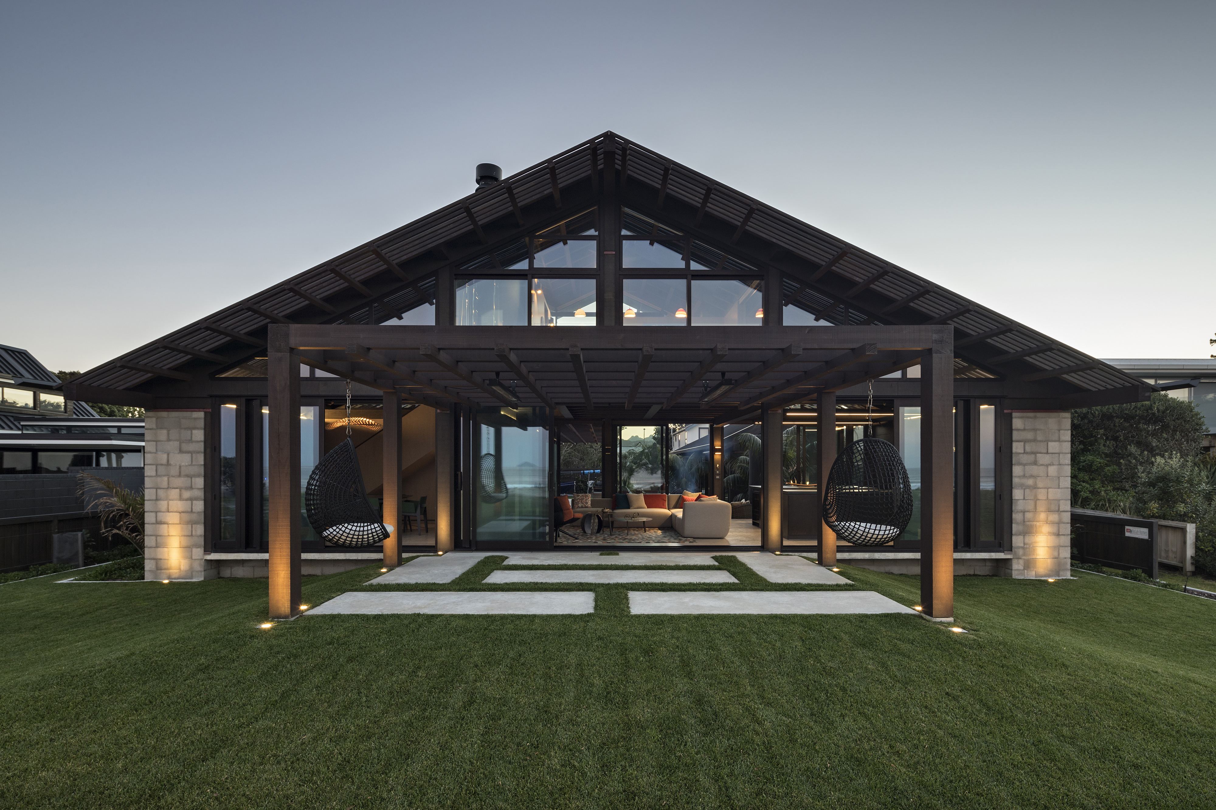 This house is a robust display of a unique relationship built on a superb coastal site. The brief – to make a hewn wooden building with a Polynesian background – has been superbly articulated. The balanced design, enriched by many voices, is centred around a soaring gable held aloft on a clear diagram of frame and transparent infill. The arrangement of family sleeping and nursery wings around the entrance path and cooking pit are a clear delight in the act of greeting, eating and living together.