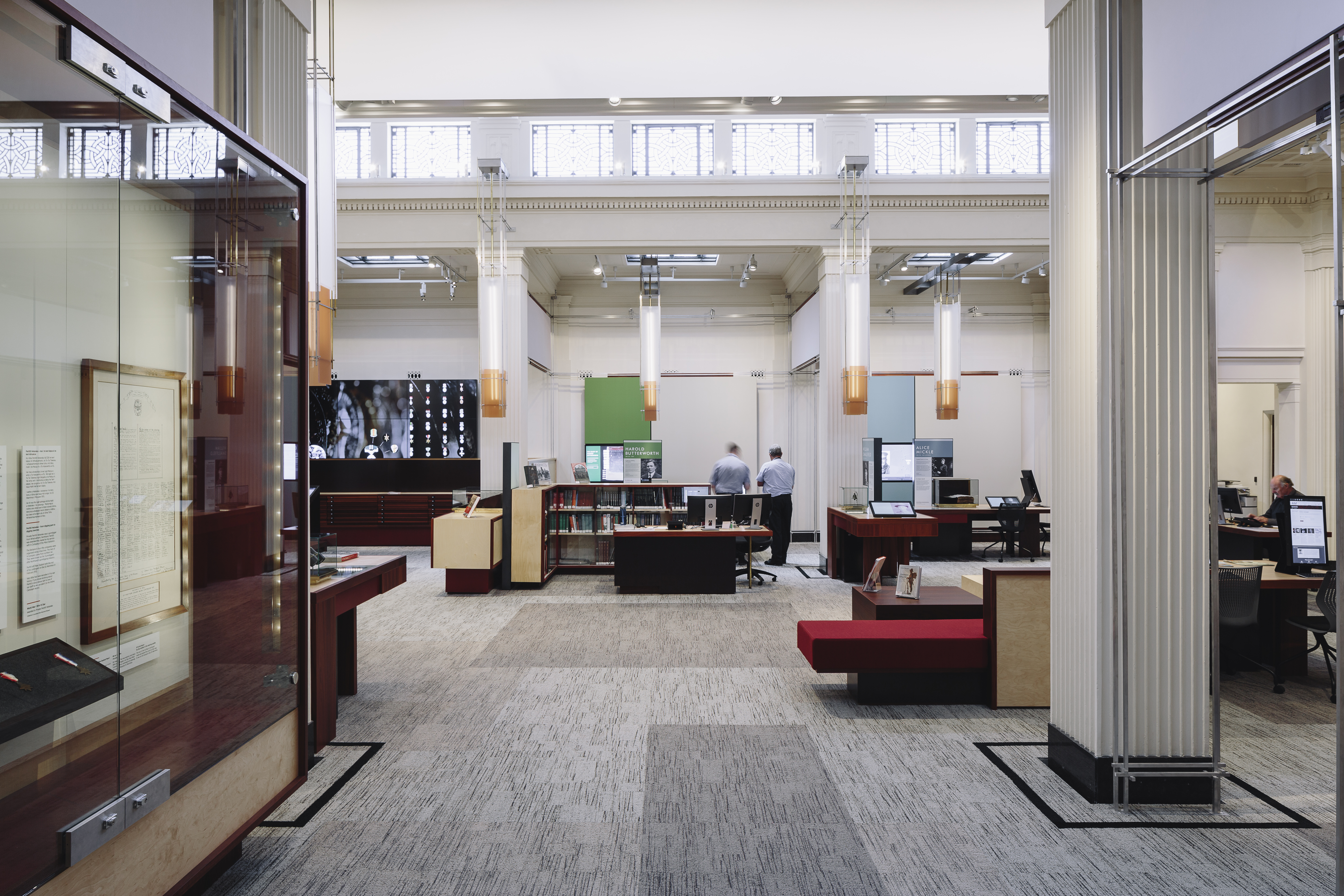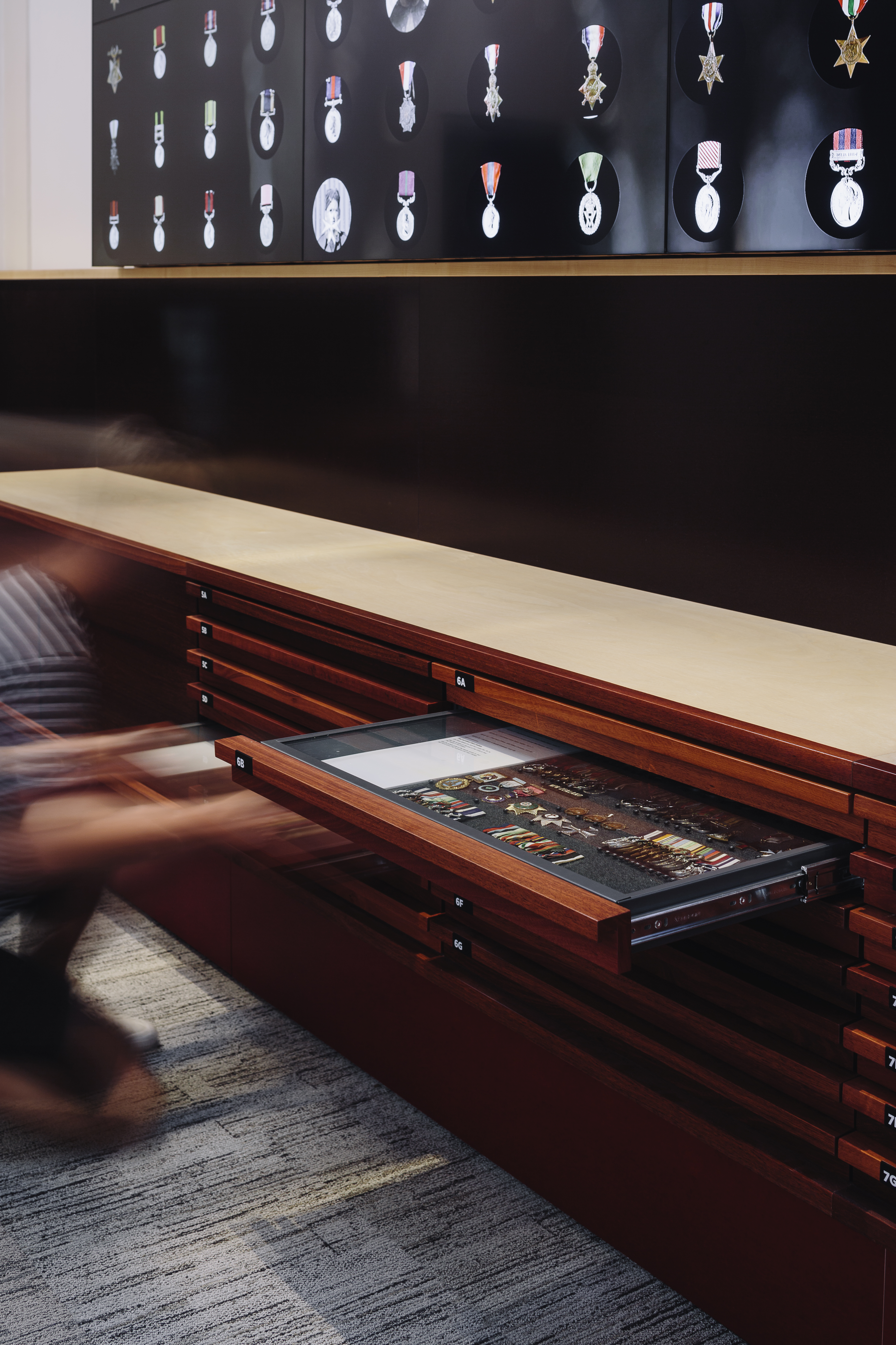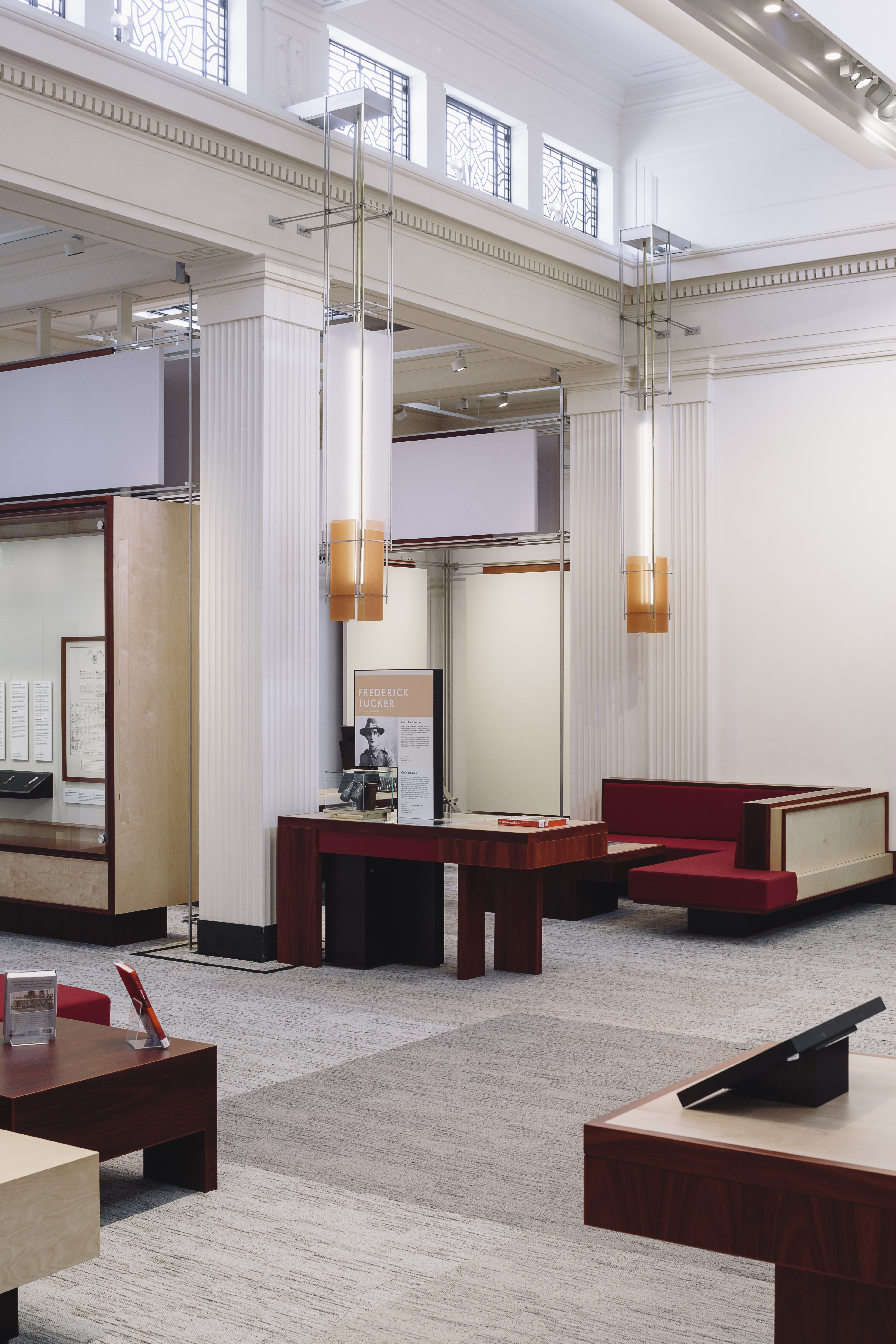 This is an understated yet intensely-resolved interior fitout to a major public building, which looks and feels contemporary yet fits so well that it seems it could have been in place for many years. The design builds on the spirit of the display, rather than using thematic or referential devices. Furniture, display and lighting configurations blur softly together as complete compositions. The overall sense is one of intimacy, an intention of the exhibition where the users of this space connect with those who lost their lives at war as individuals, rather than anonymous ‘others’.