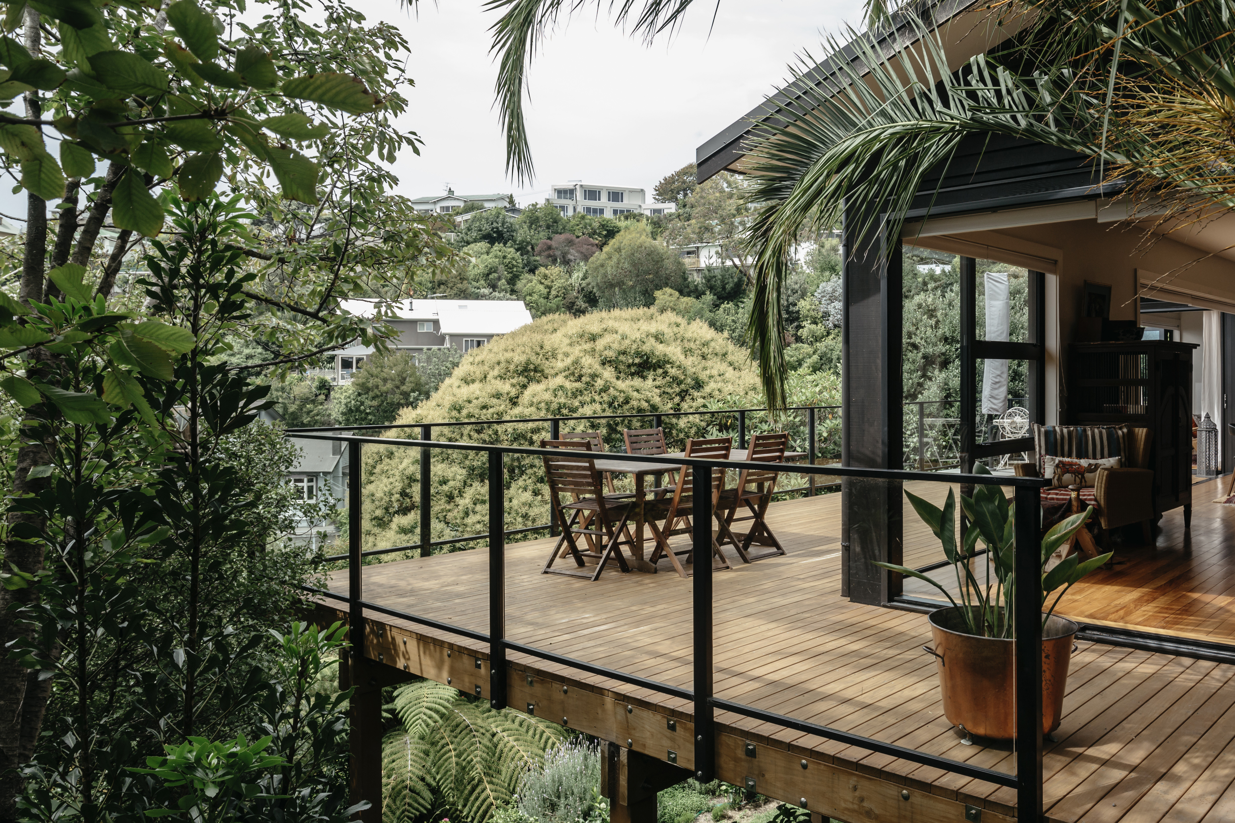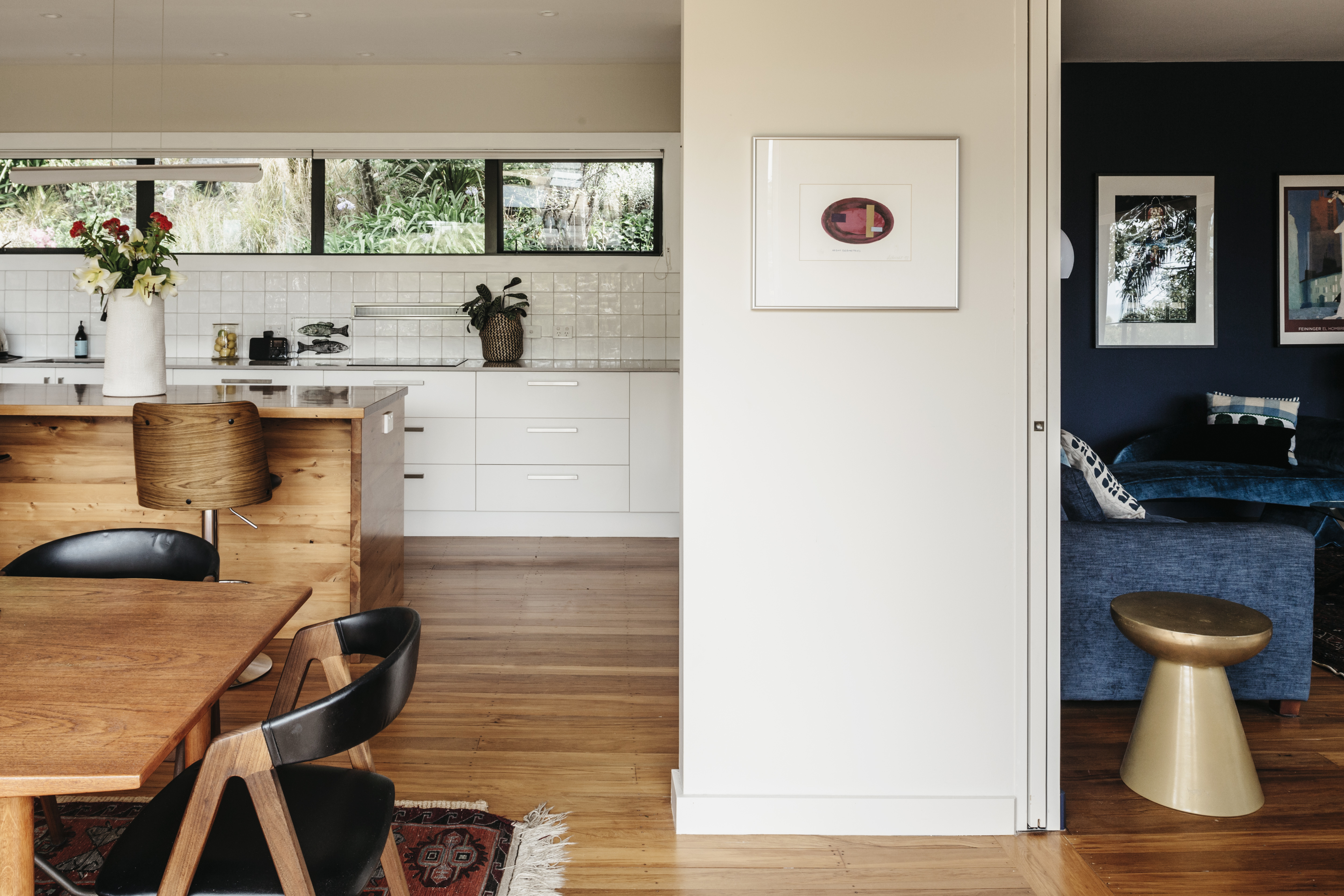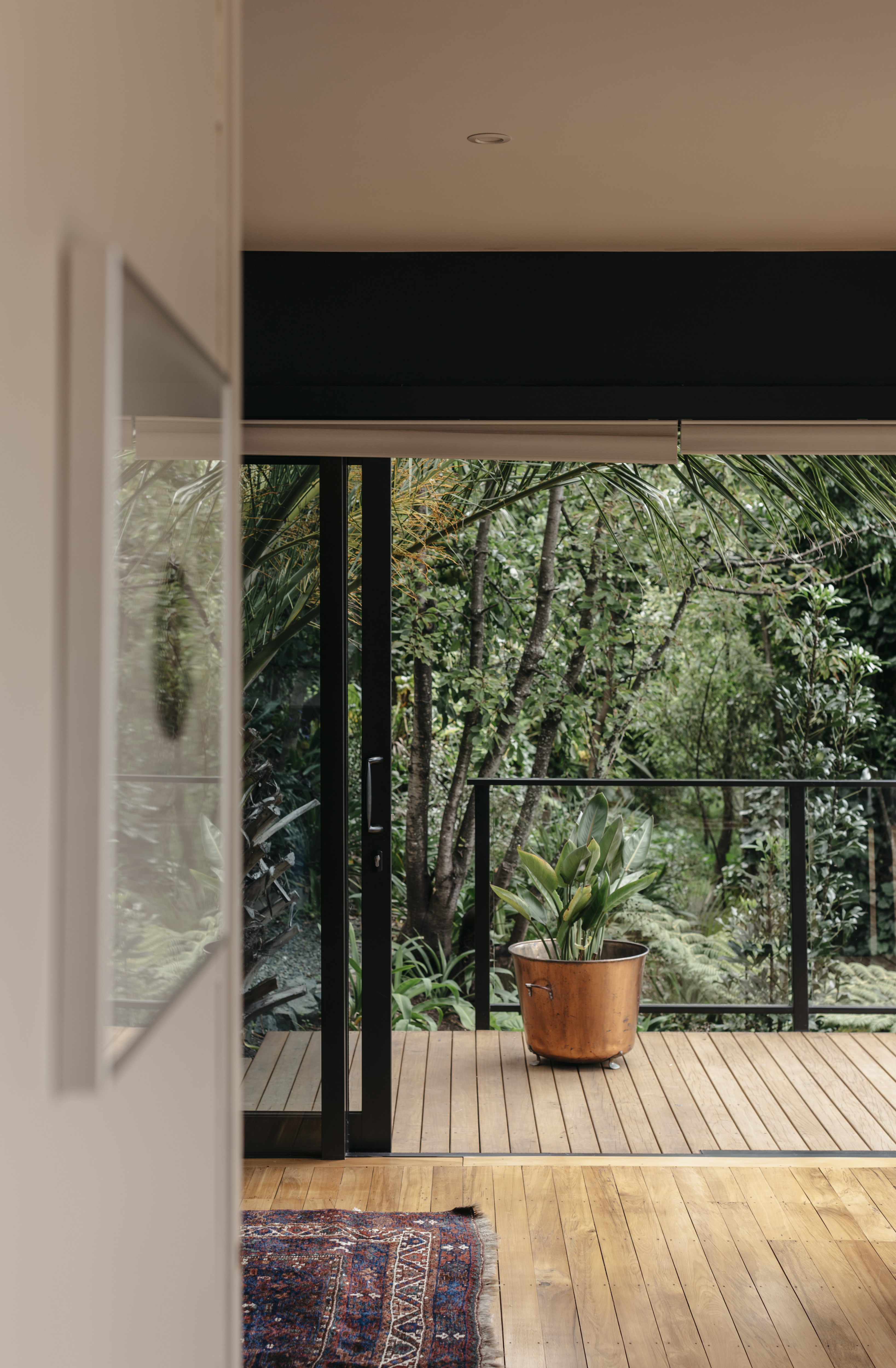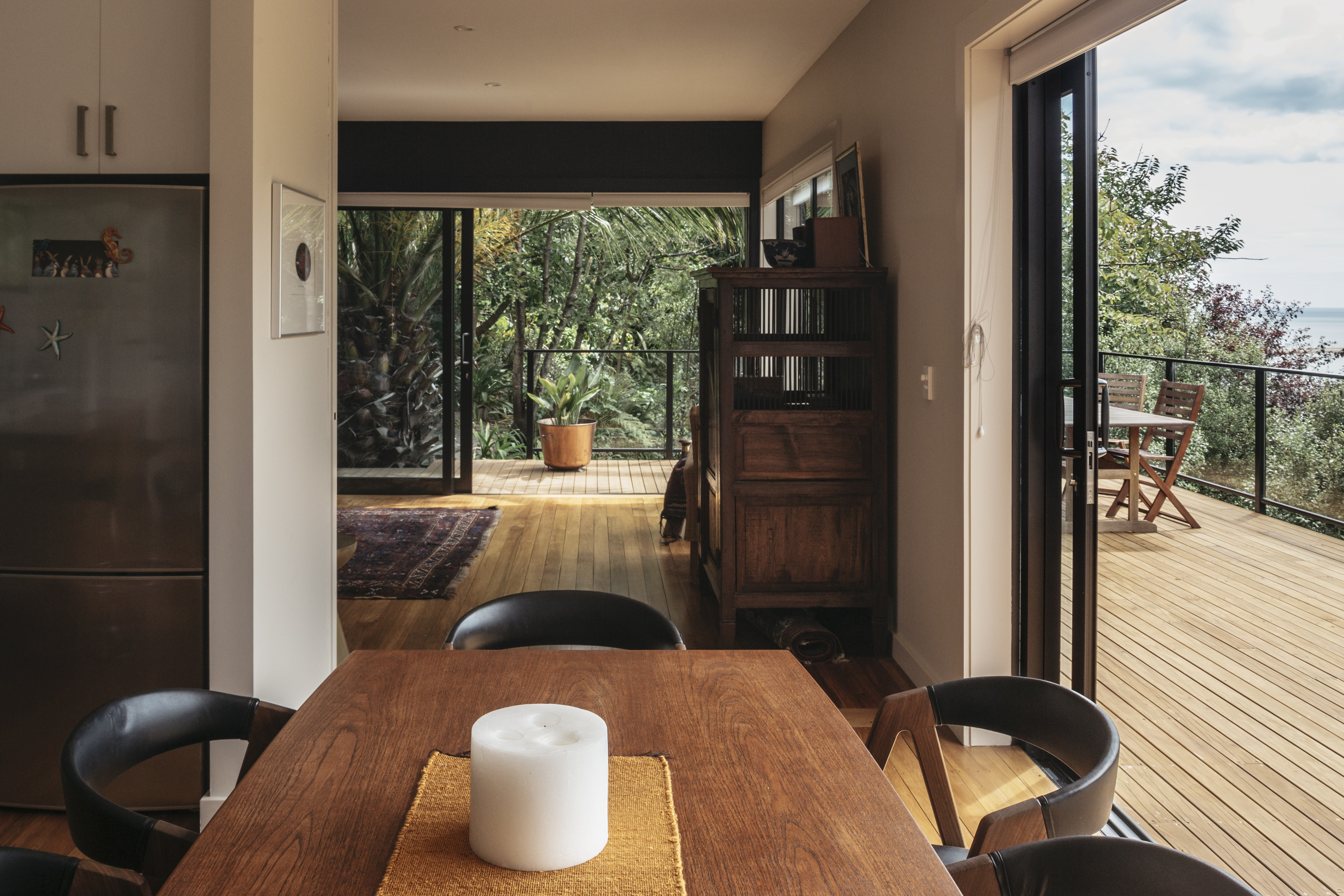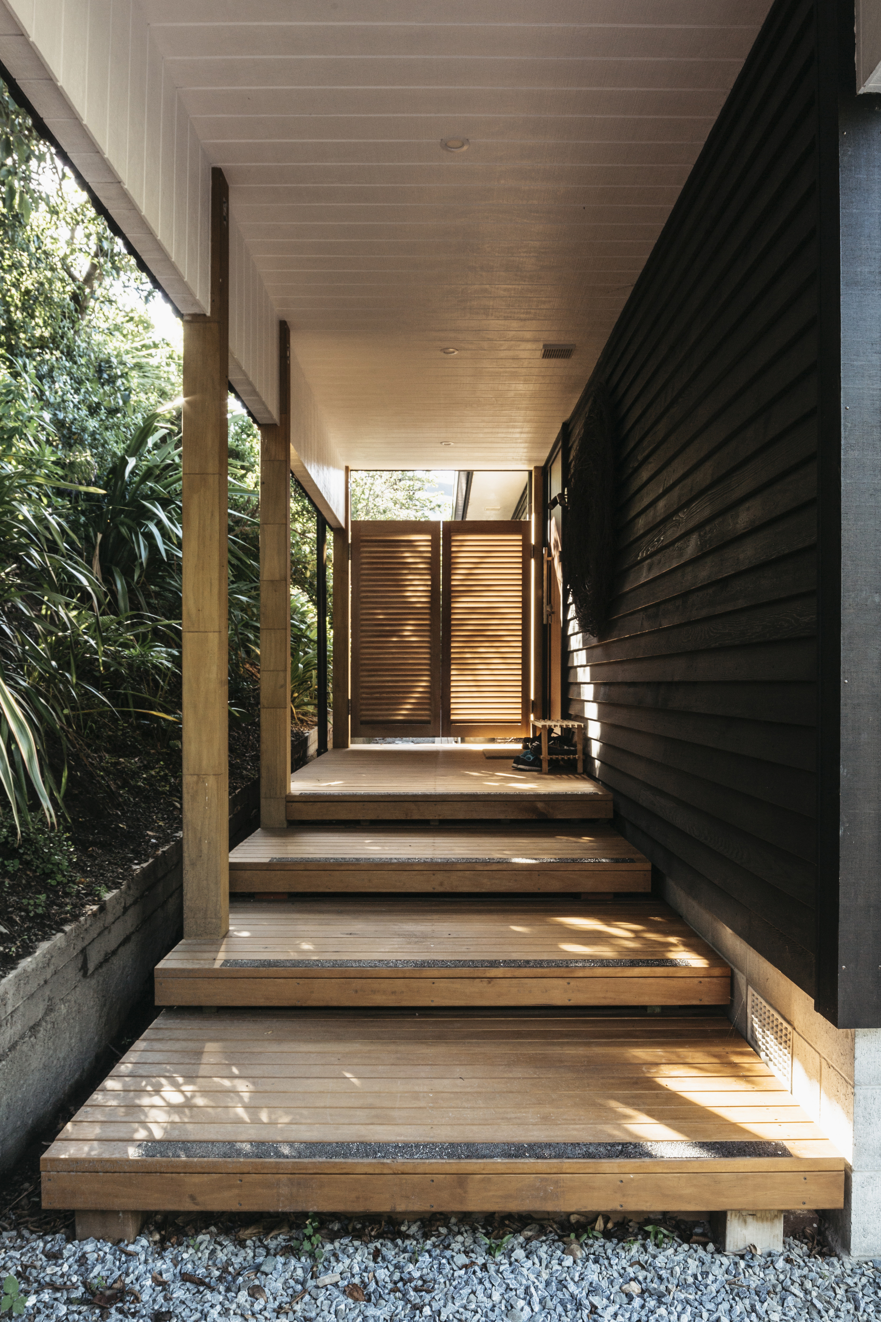 Virtually rebuilt from the base up, this tree-house has been nestled into a sheltered bush-clad gully with special attention given to securing views of the bay below. Fold-back windows celebrate the bush canopy, while the integrity and memory of the original home have been retained by using similar proportions and materials. Inside, former hallways have been integrated into light-filled living spaces to create a dynamic flexible home.