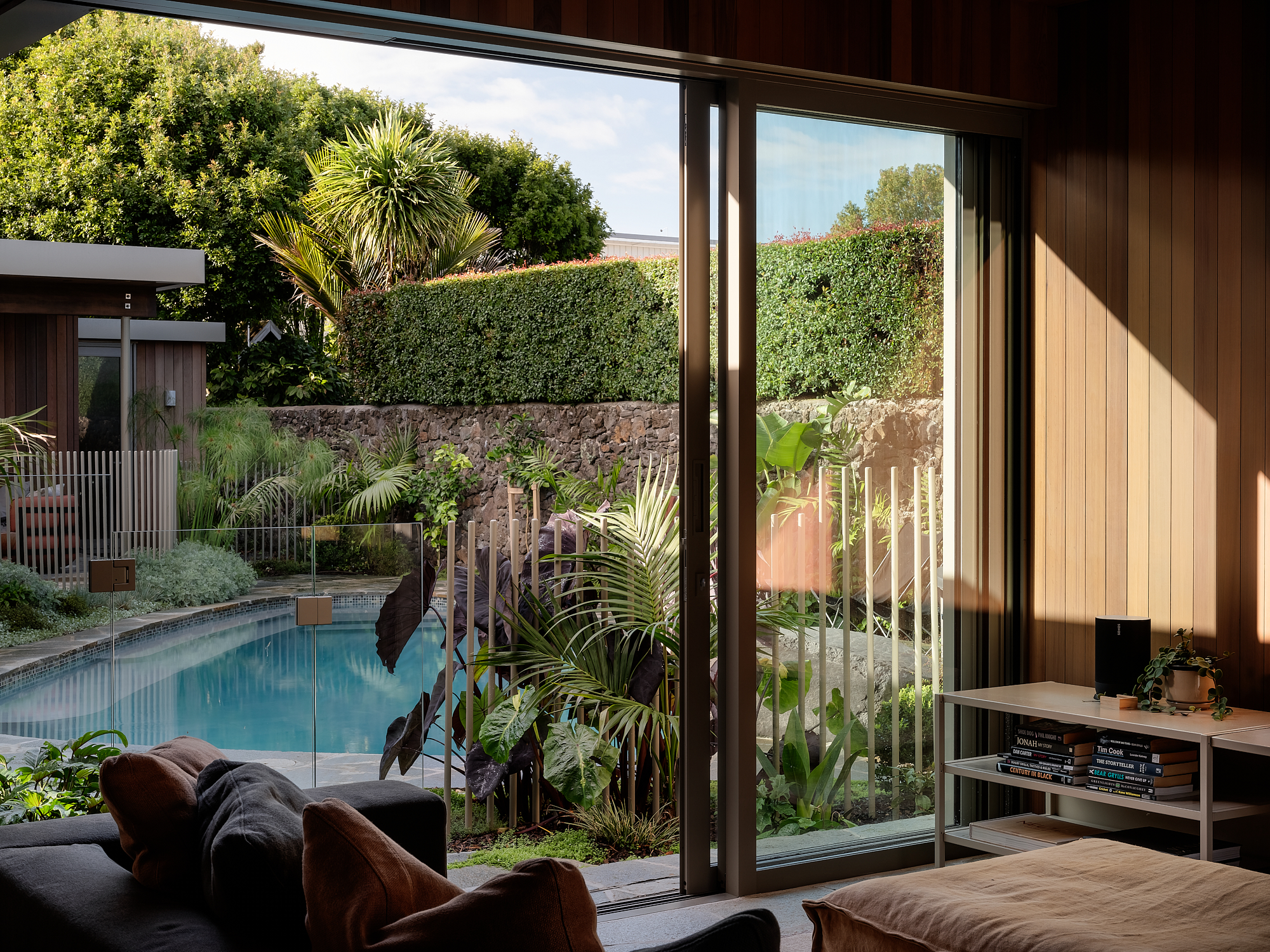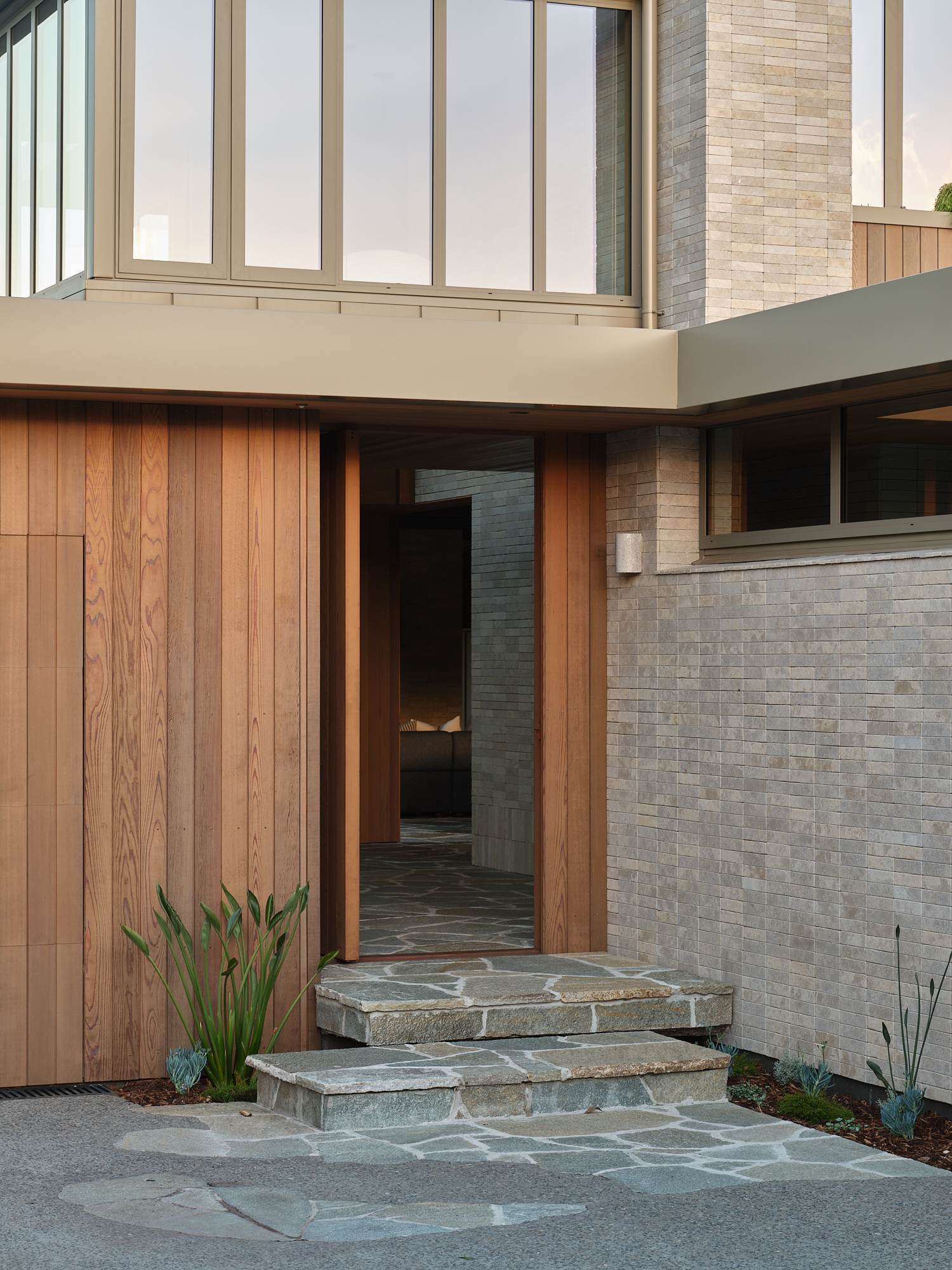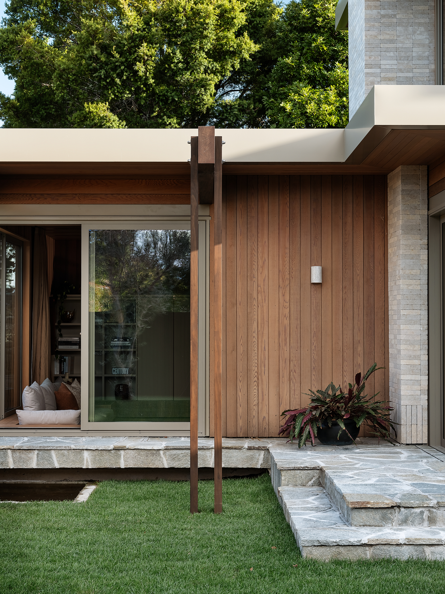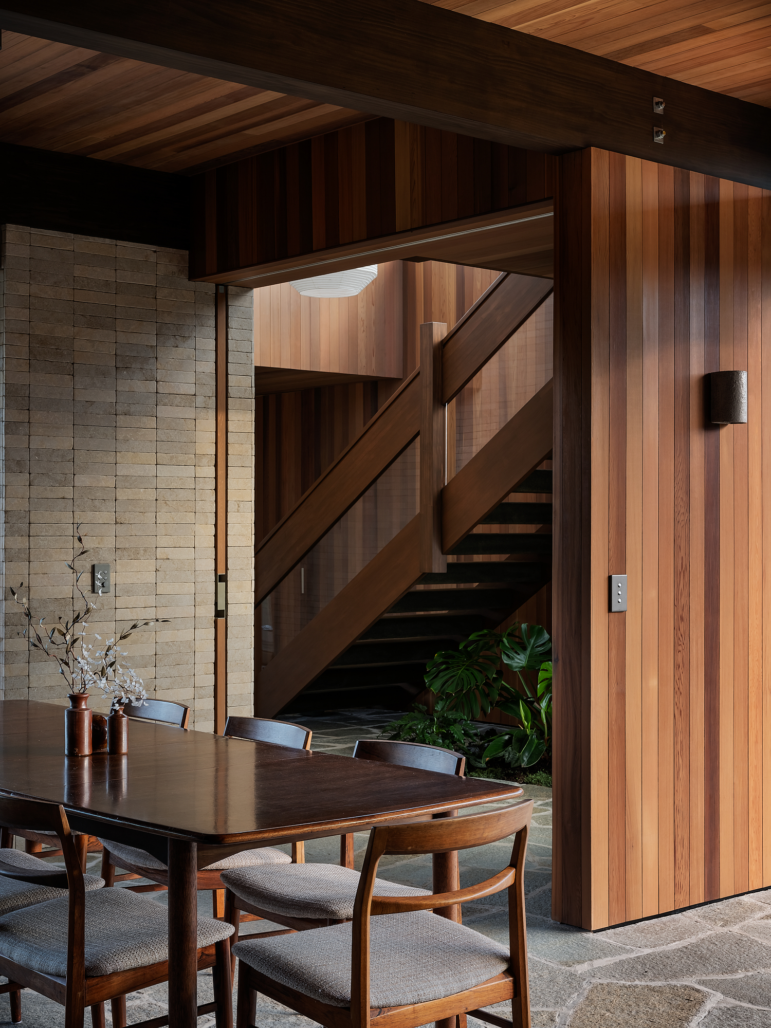 This considered and beautifully detailed family home was a collaboration between the architect and an interior designer client with a passion for mid-century design. Long and low, this home pulls away from the edges of the site, allowing the creation of a series of distinct outdoor courtyards and gardens that are connected via views through the home. A rigorous 2.4 metre module was used as a structuring device to provide rhythm and order, with subtle shifts in plan, volume and light adding richness and variety. Material selection inspired by the client’s memories of her grandparents’ home are of the period and the use of colour is subtle and consistent throughout.