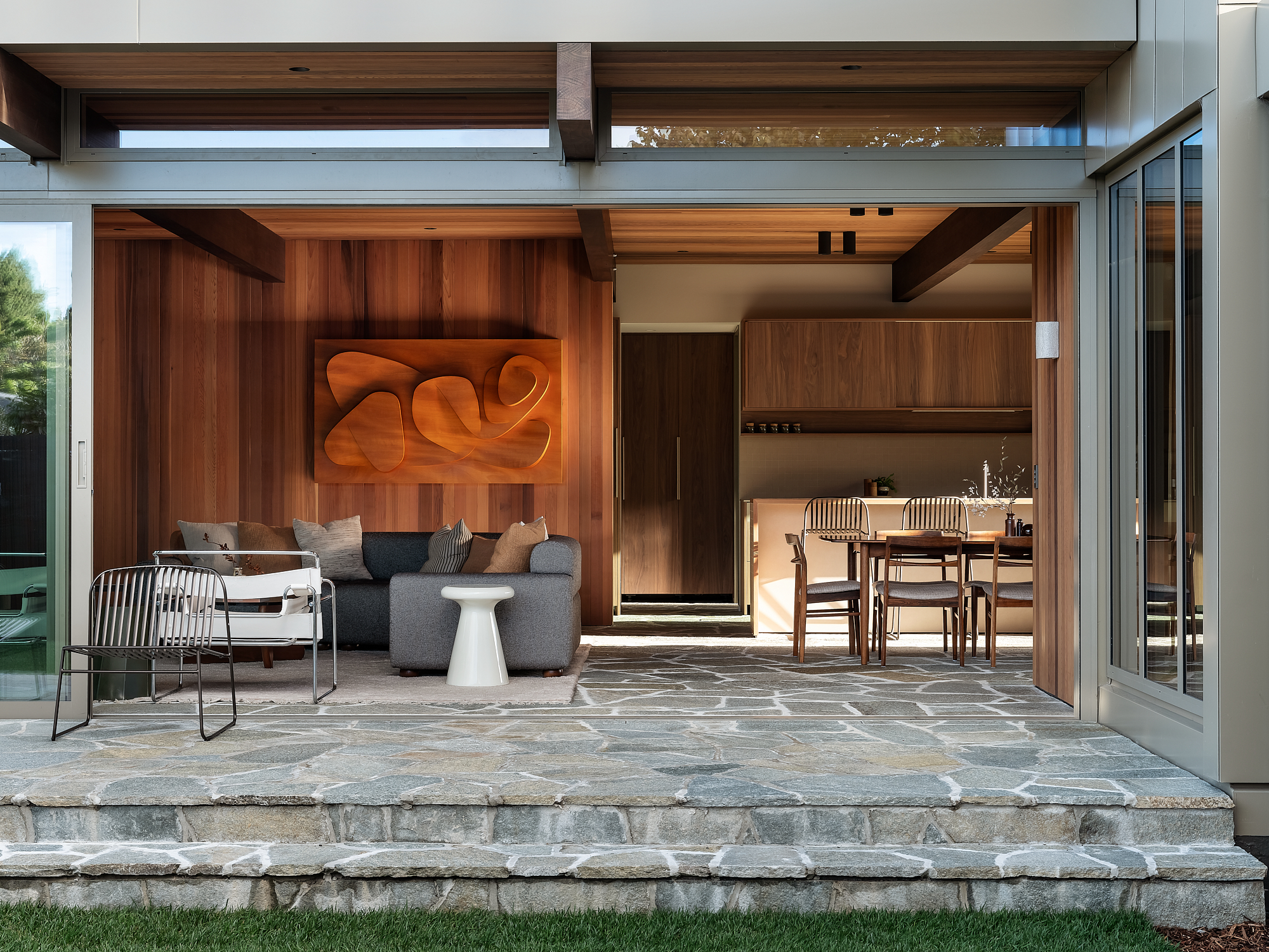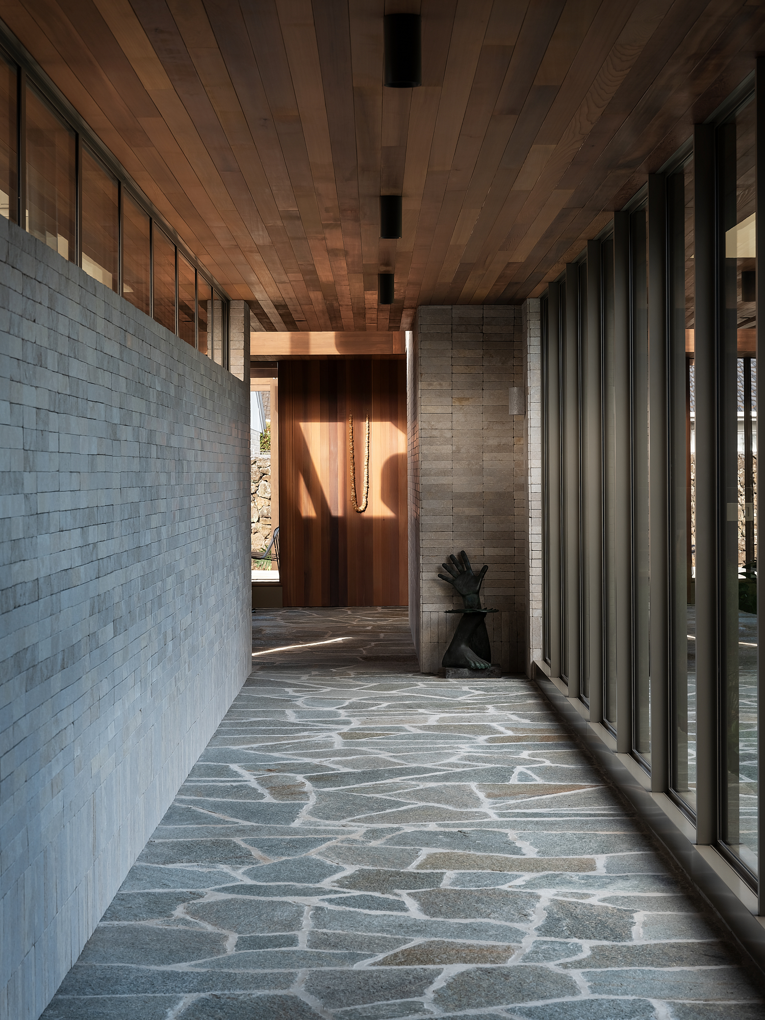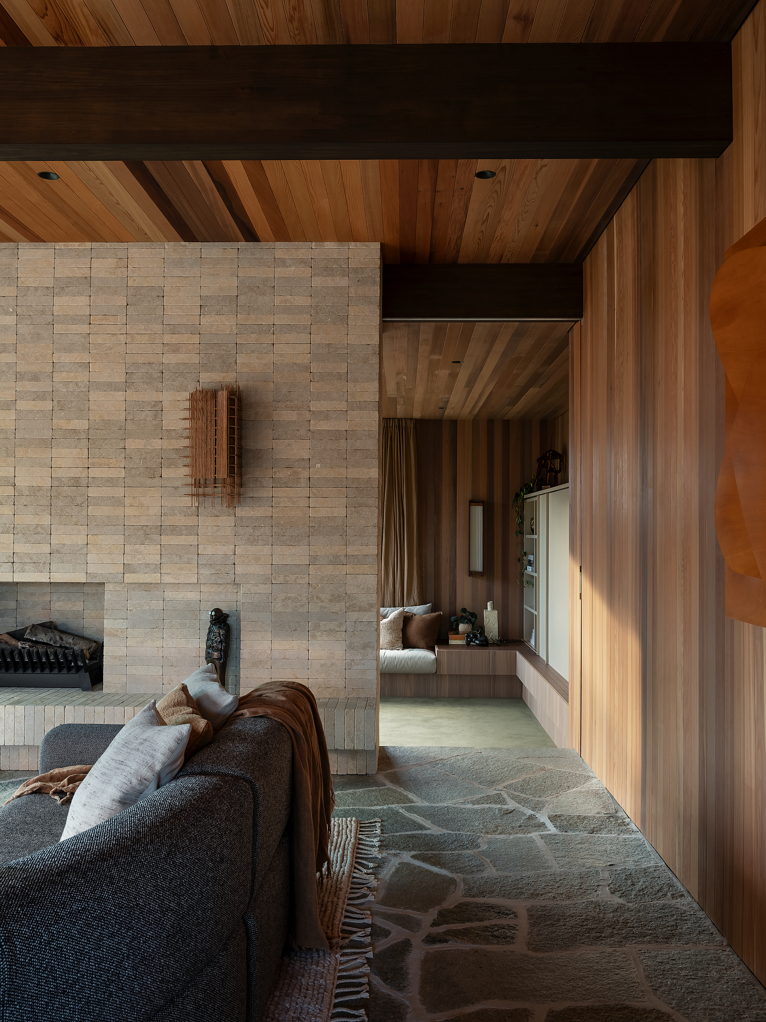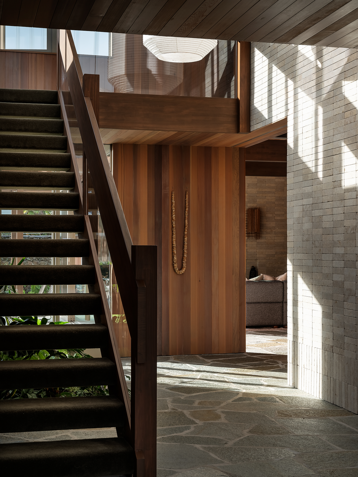 This considered and beautifully detailed family home was a collaboration between the architect and an interior designer client with a passion for mid-century design. Long and low, this home pulls away from the edges of the site, allowing the creation of a series of distinct outdoor courtyards and gardens that are connected via views through the home. A rigorous 2.4 metre module was used as a structuring device to provide rhythm and order, with subtle shifts in plan, volume and light adding richness and variety. Material selection inspired by the client’s memories of her grandparents’ home are of the period and the use of colour is subtle and consistent throughout.