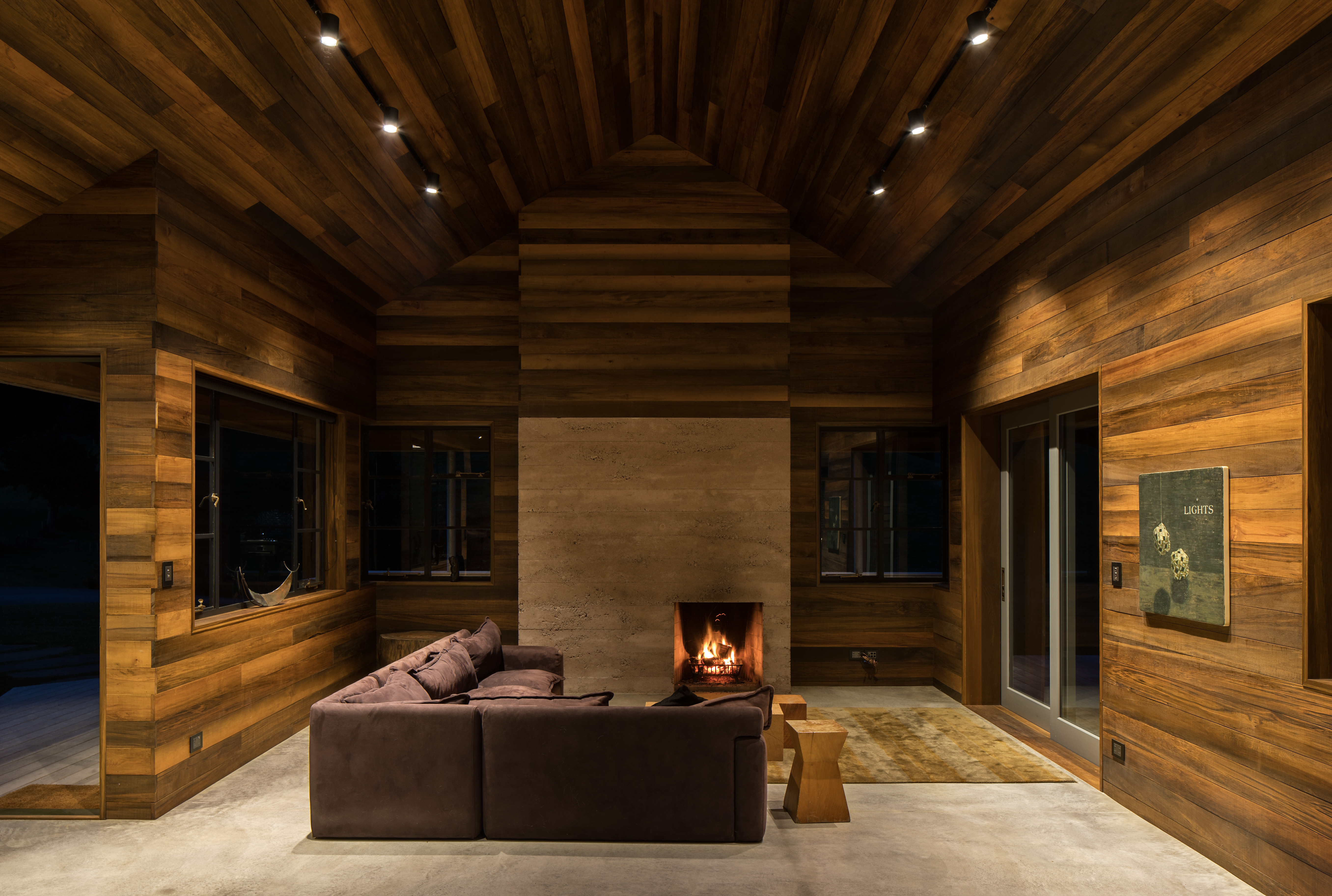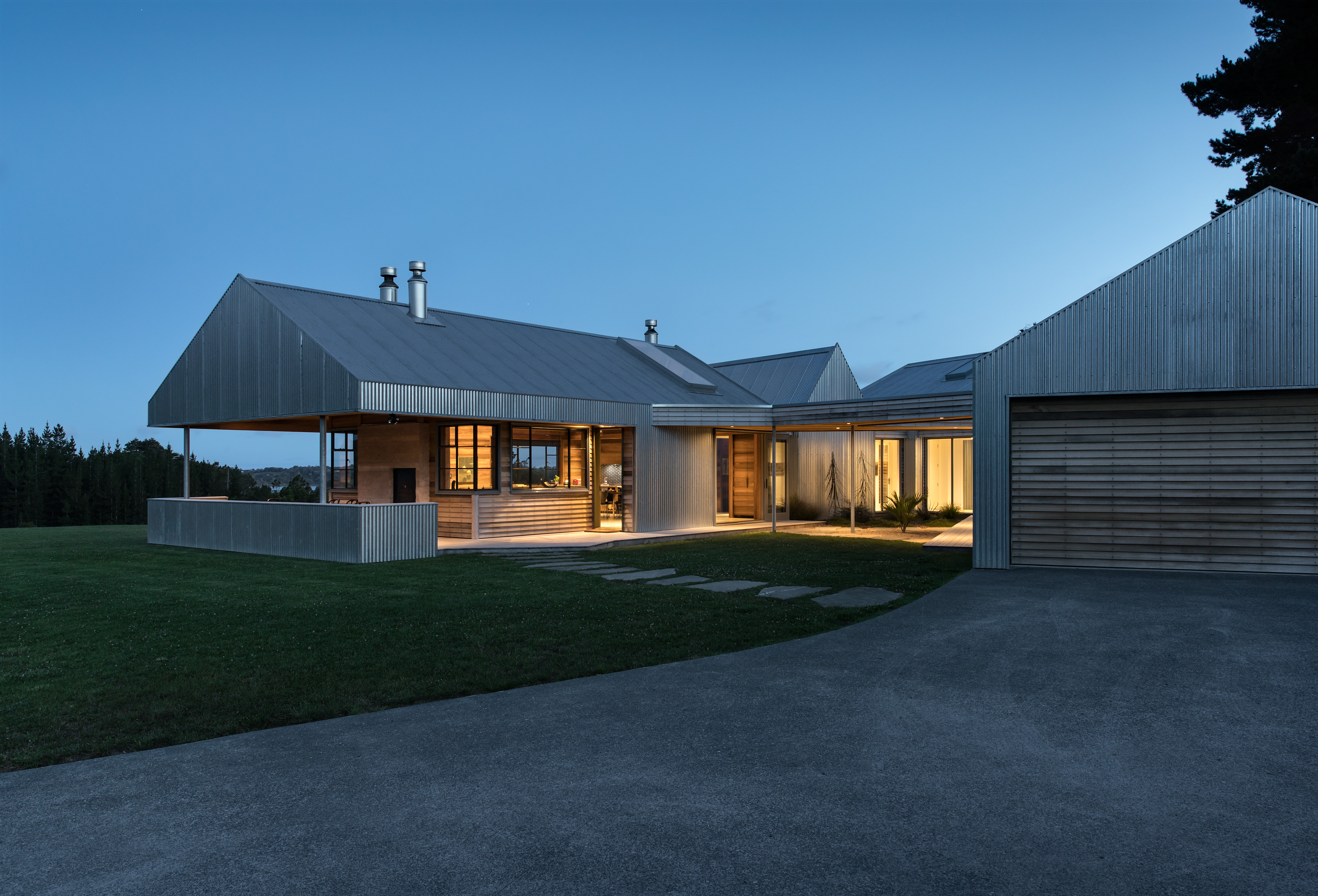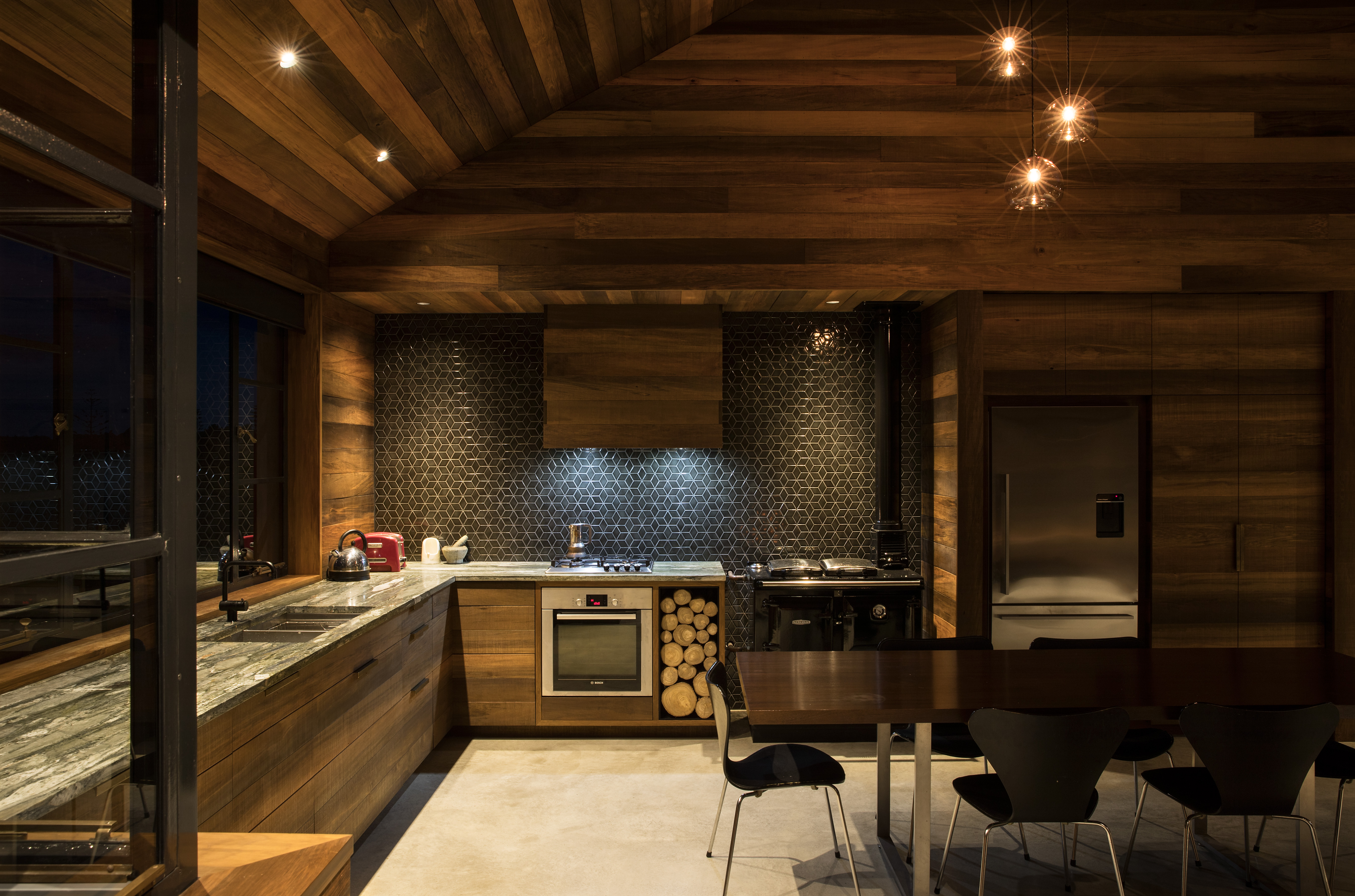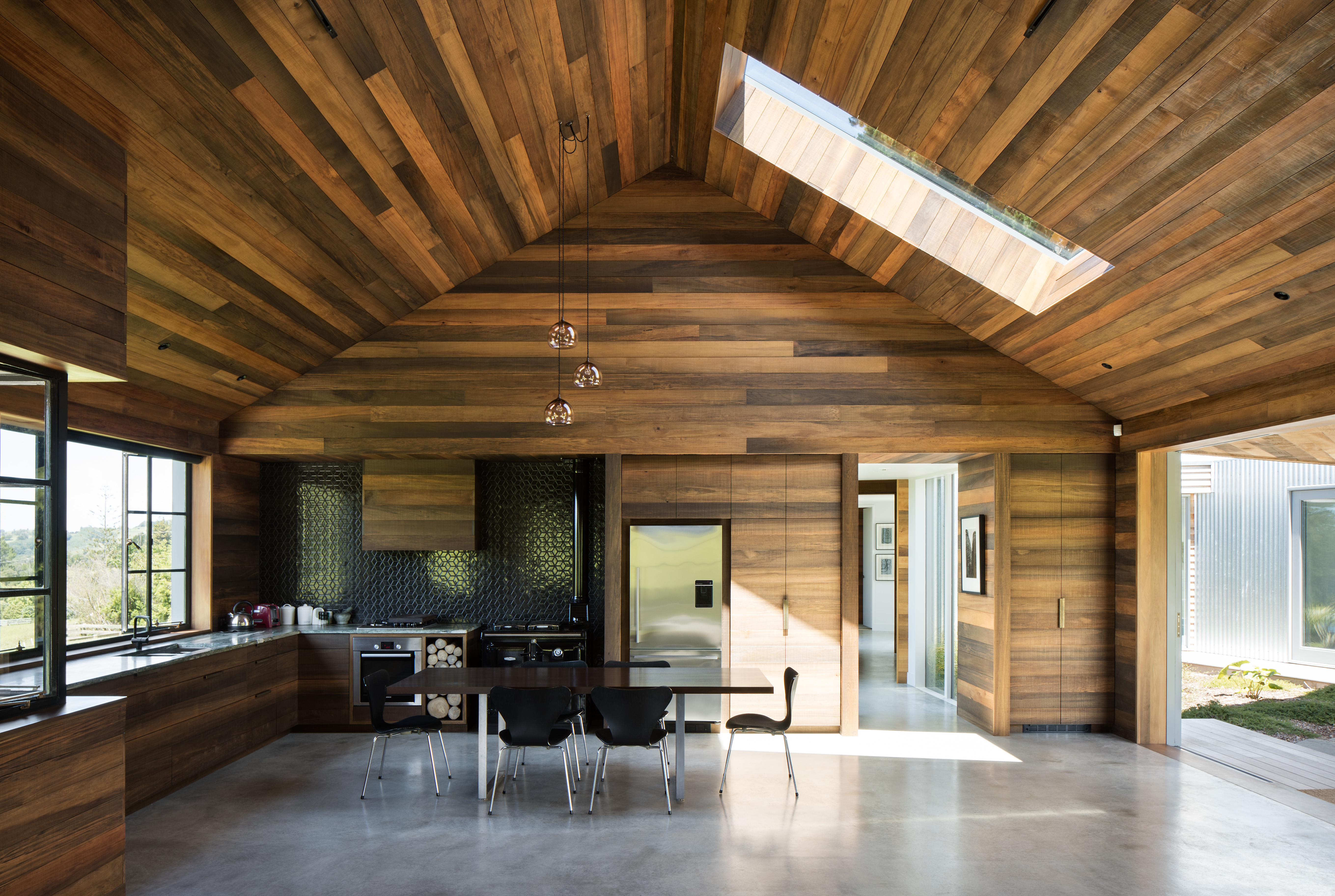 An earthy and warm interior contrasts with carefully selected and framed vistas out to the working rural landscape. Light floods in at the gaps between the obliquely-arranged barn forms, emphasising the richness of the river timbers used in each contained and calm living area – timbers which are detailed and installed with exceptional craftsmanship. The thoughtful use of materials, combined with a variety of spatial proportions, creates a charming and soulful home and workplace.