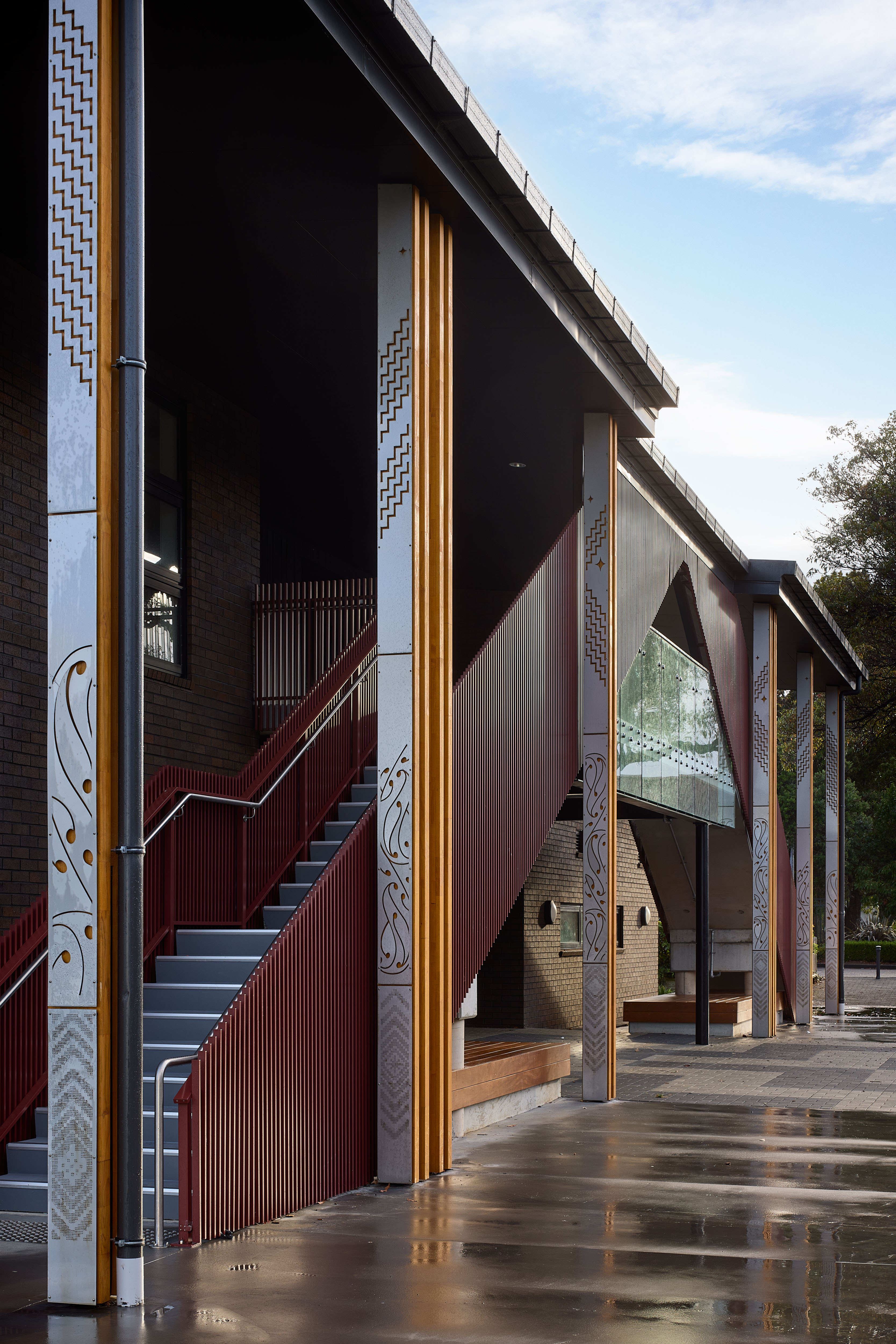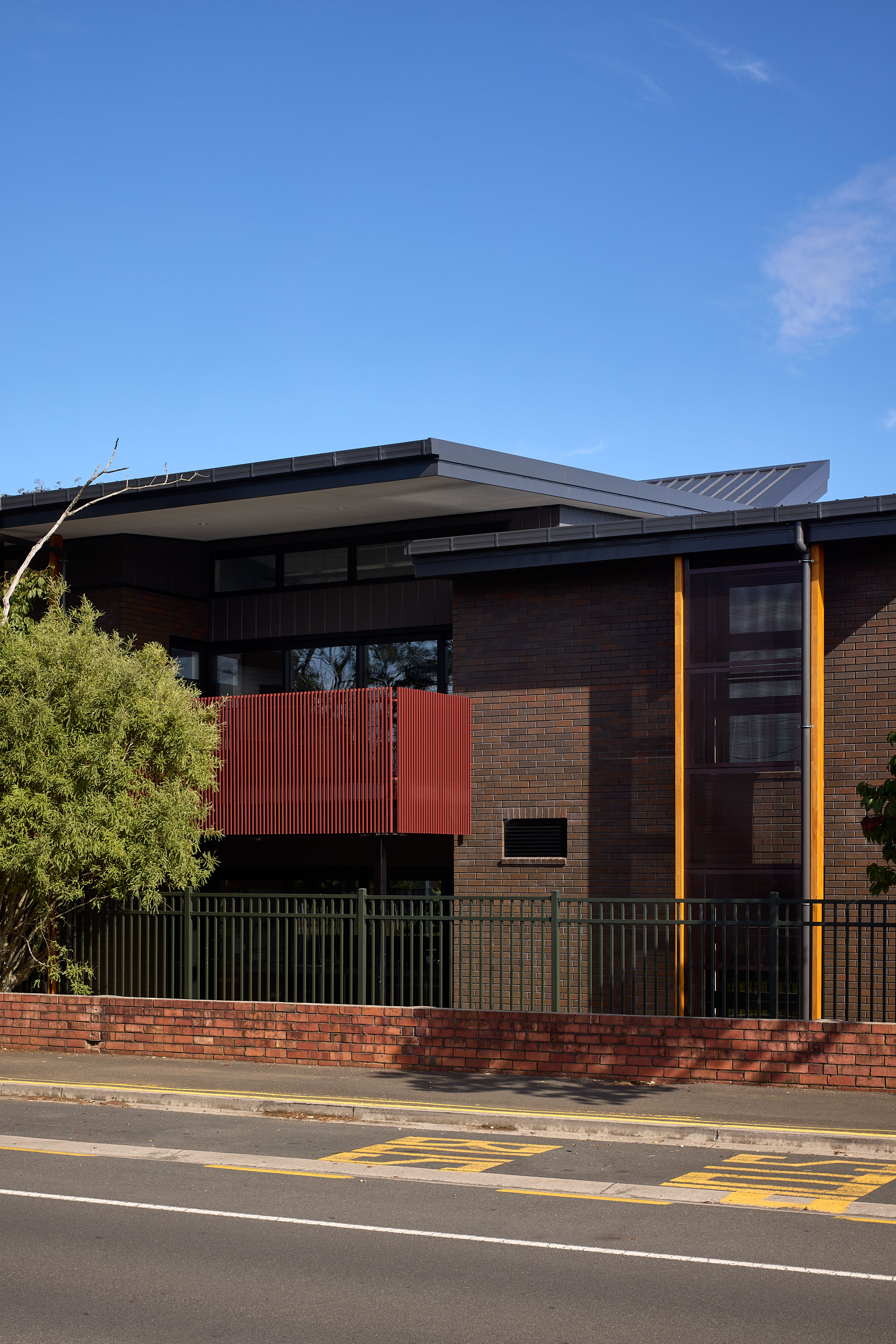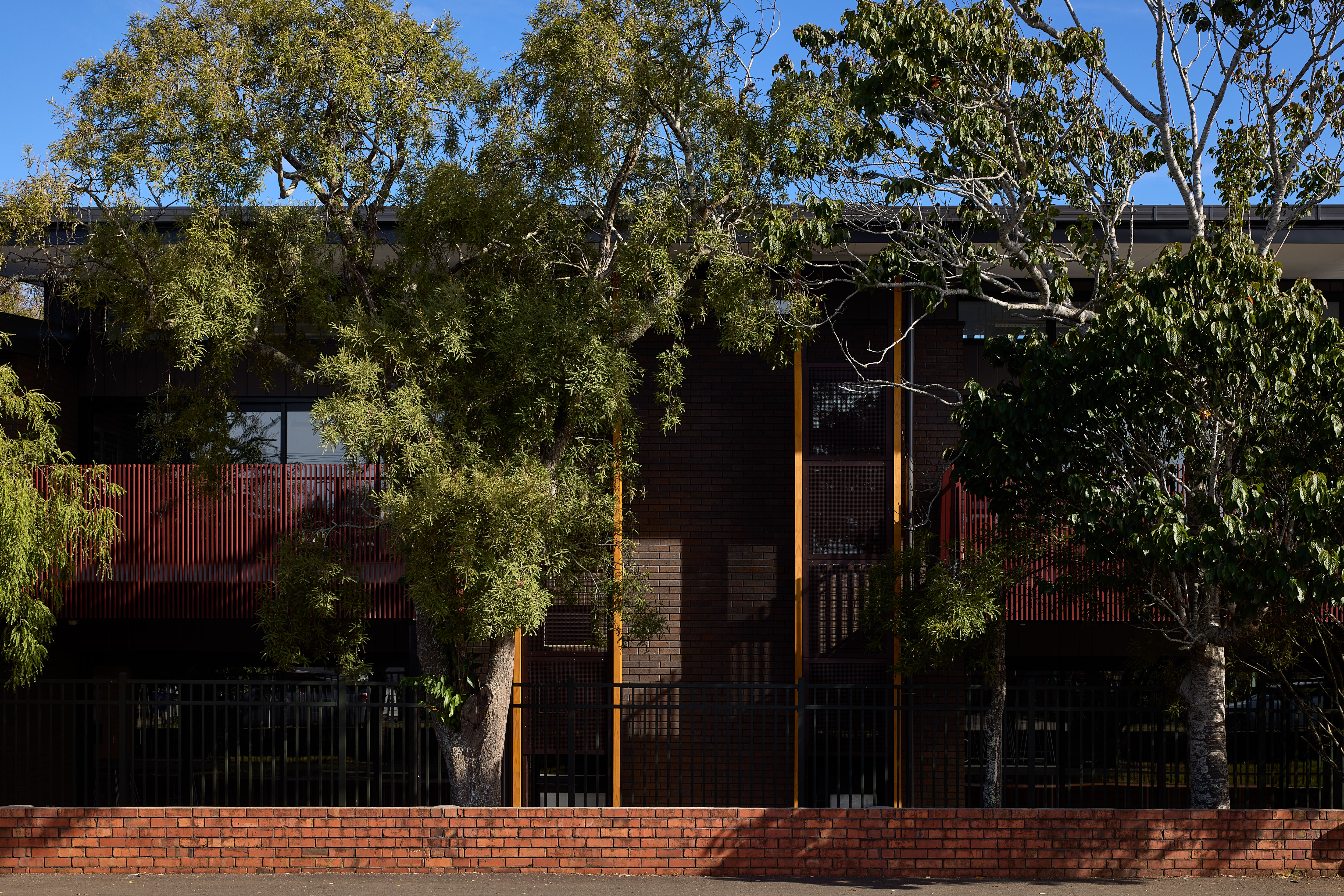 This two-storey school is a place that through its architecture demonstrates care and respect for the students and staff housed within. The flexibility of space, which allows for both separated teaching spaces and areas open to each other and the exterior, provides for a wide variety of pedagogical practices as well as generous transparency throughout. The materials and colours give a sense of quality, durability and vibrancy to the building and create a stimulating and enjoyable place to be and learn. The use of external sun screening and references to cultural narratives, such as the Pātaka on the front façade, lift the project beyond a simple prosaic school project and make it a place that is inspiring to be in and a learning tool.