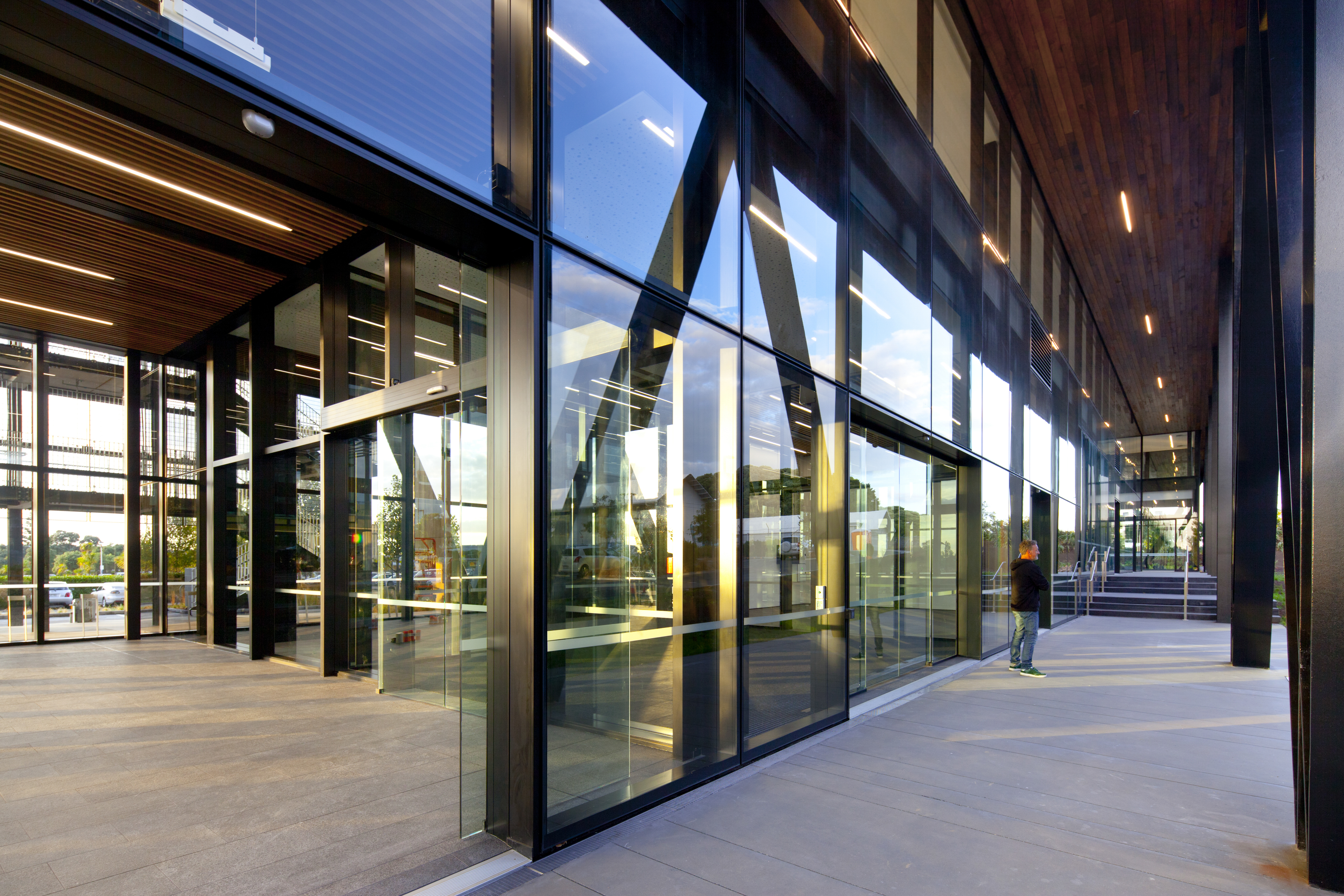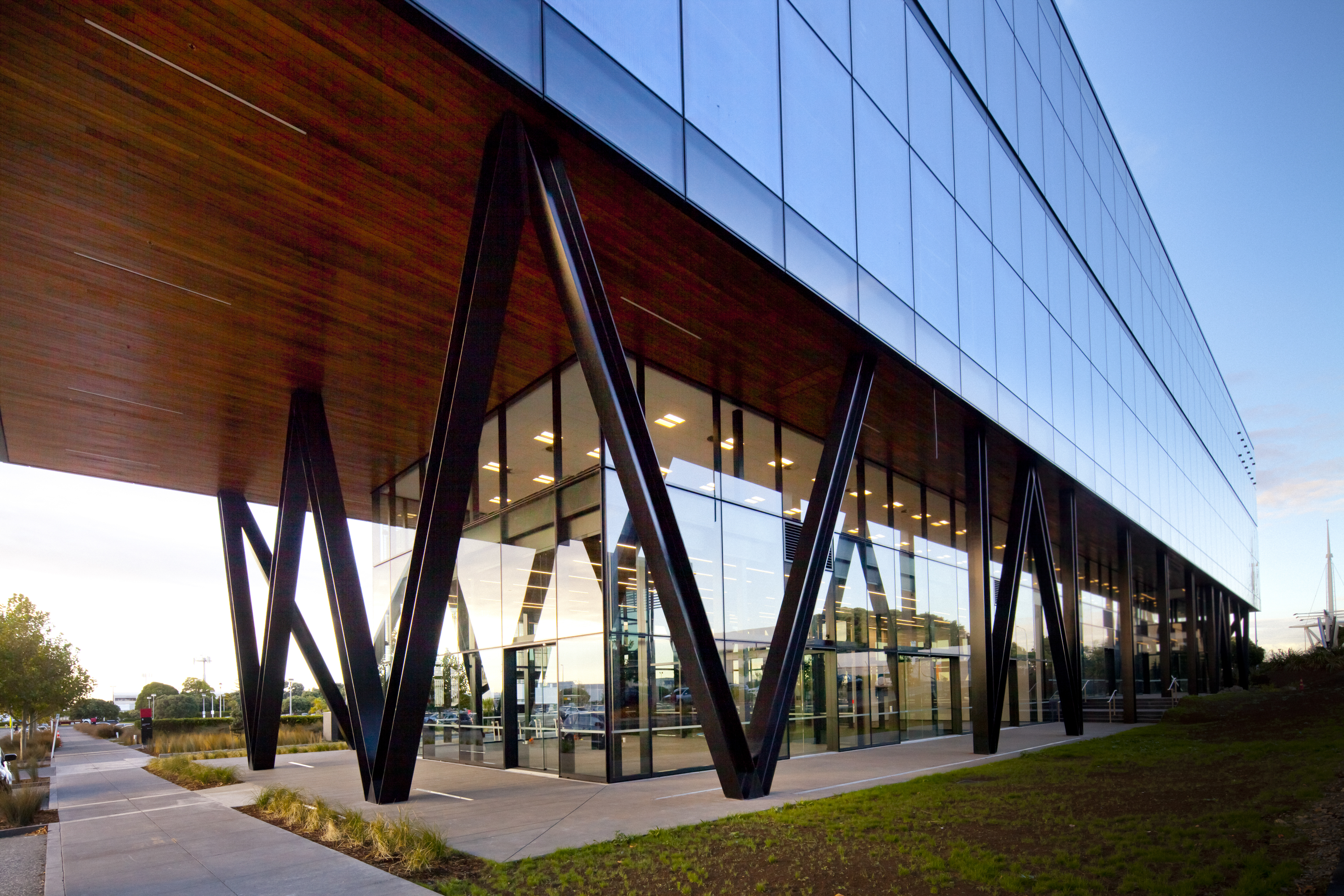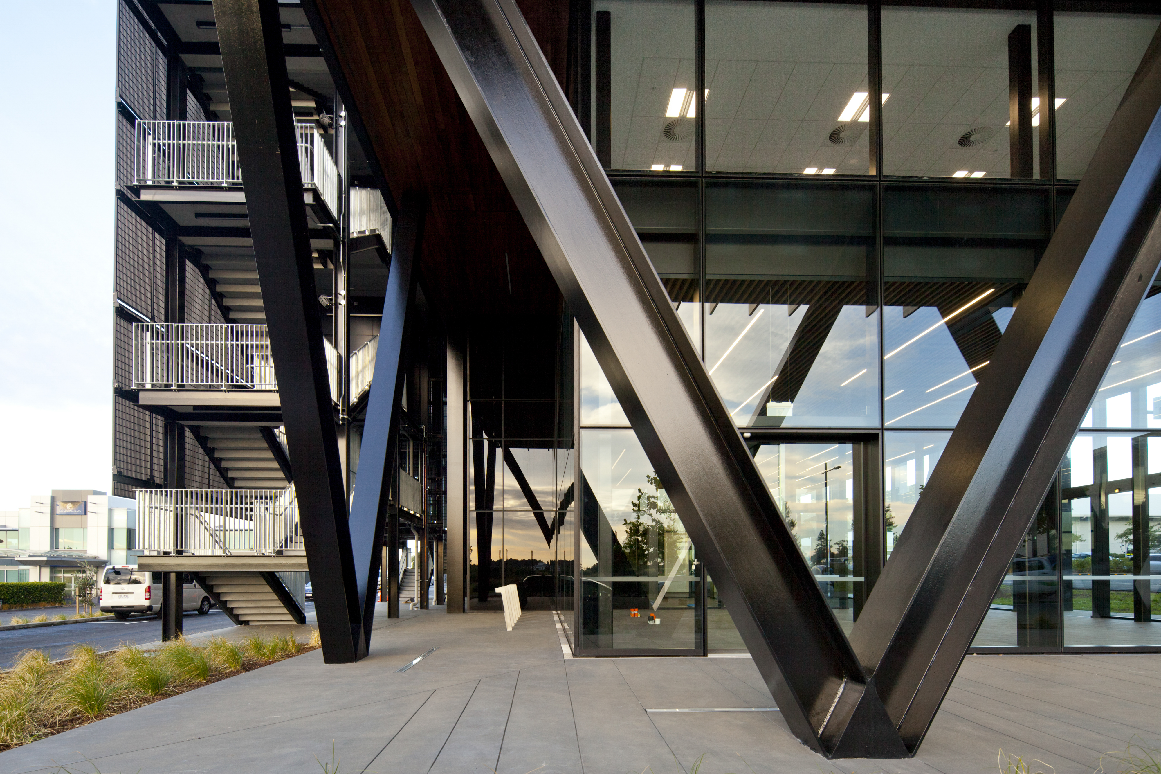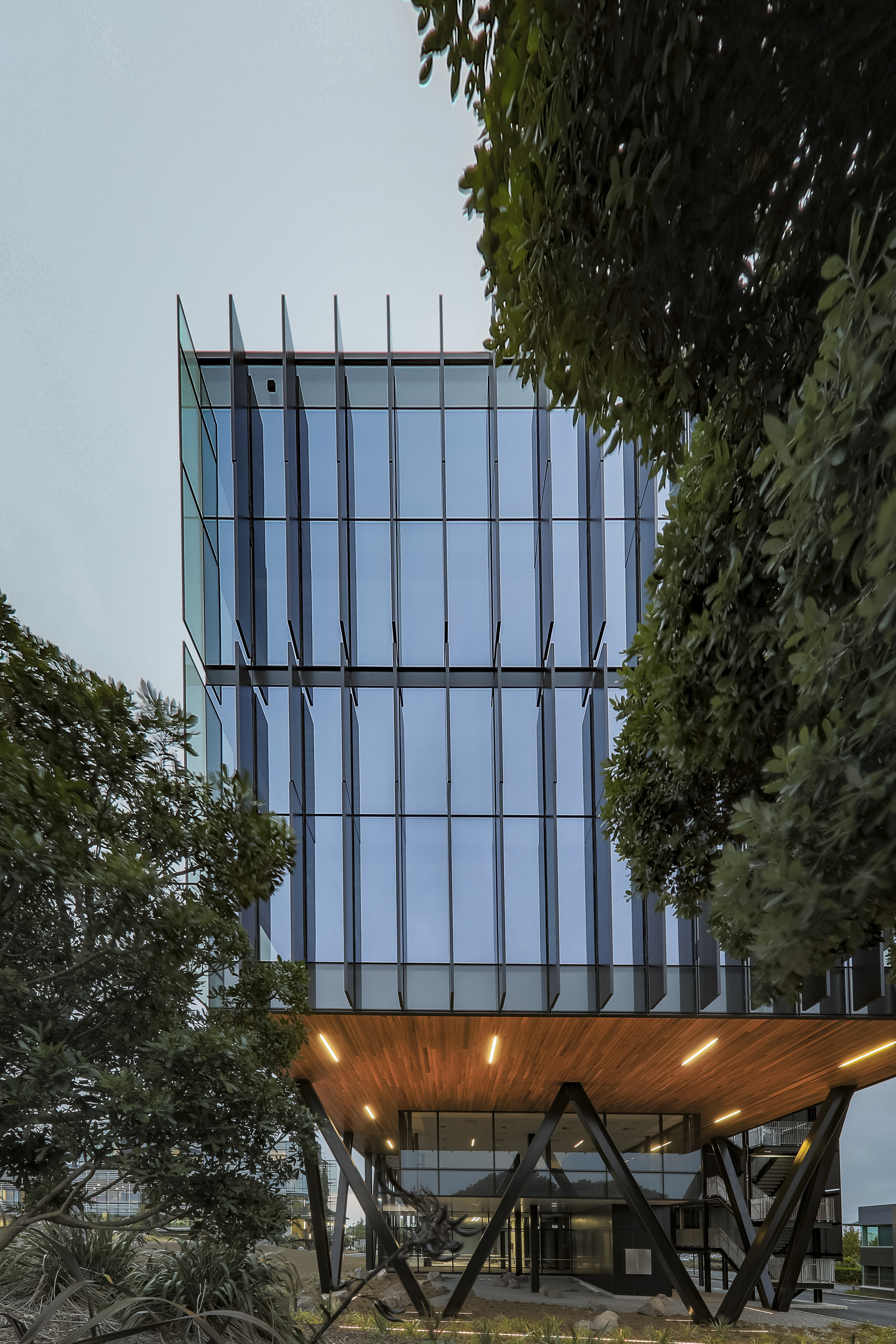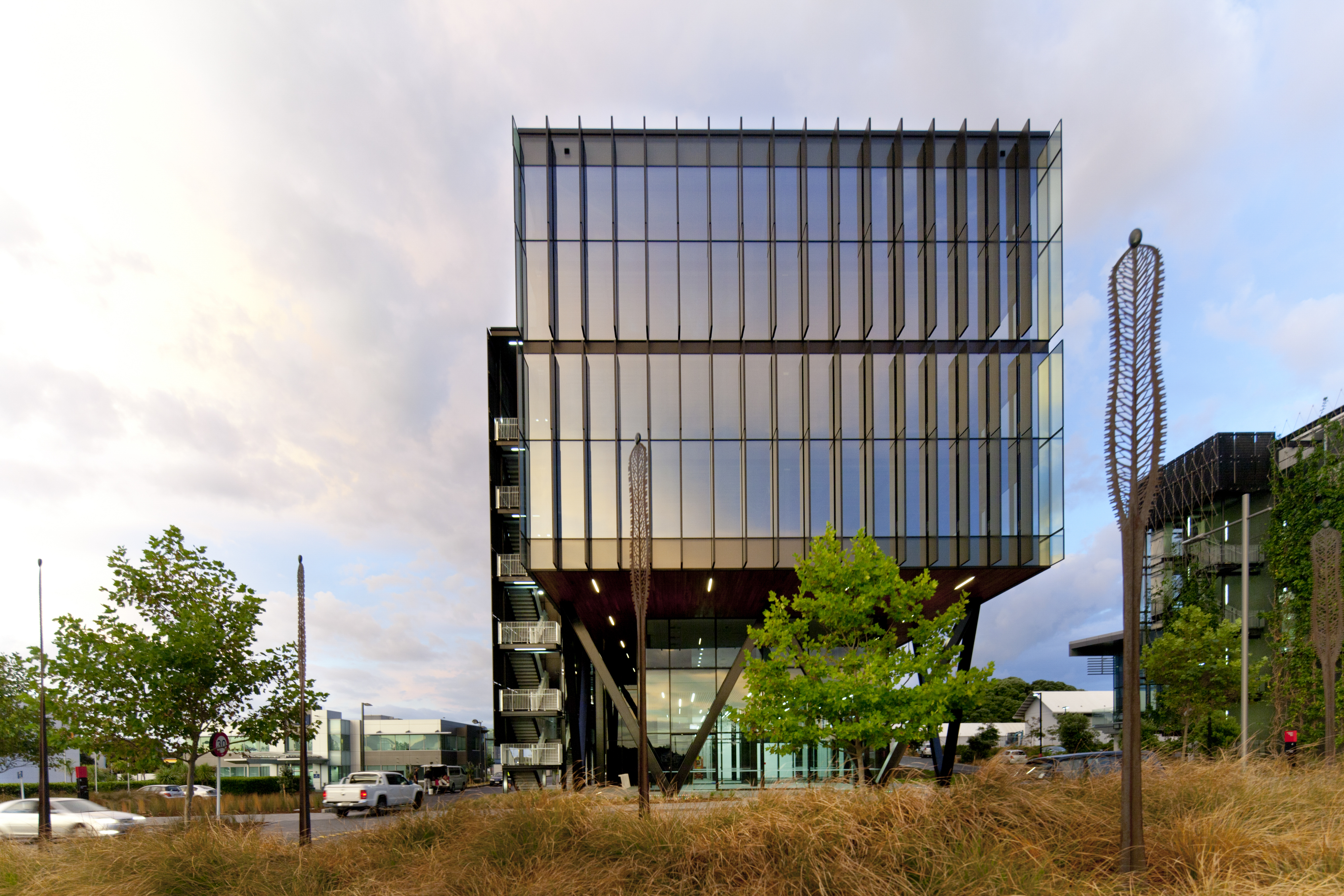 This floating, black, glazed box is a slick and smooth addition to a growing commercial and retail district near Auckland Airport. Open at both ends, and without a back, the elegant yet unapologetically commercial building is spatially generous to both users and pedestrians, and detailed with precision.