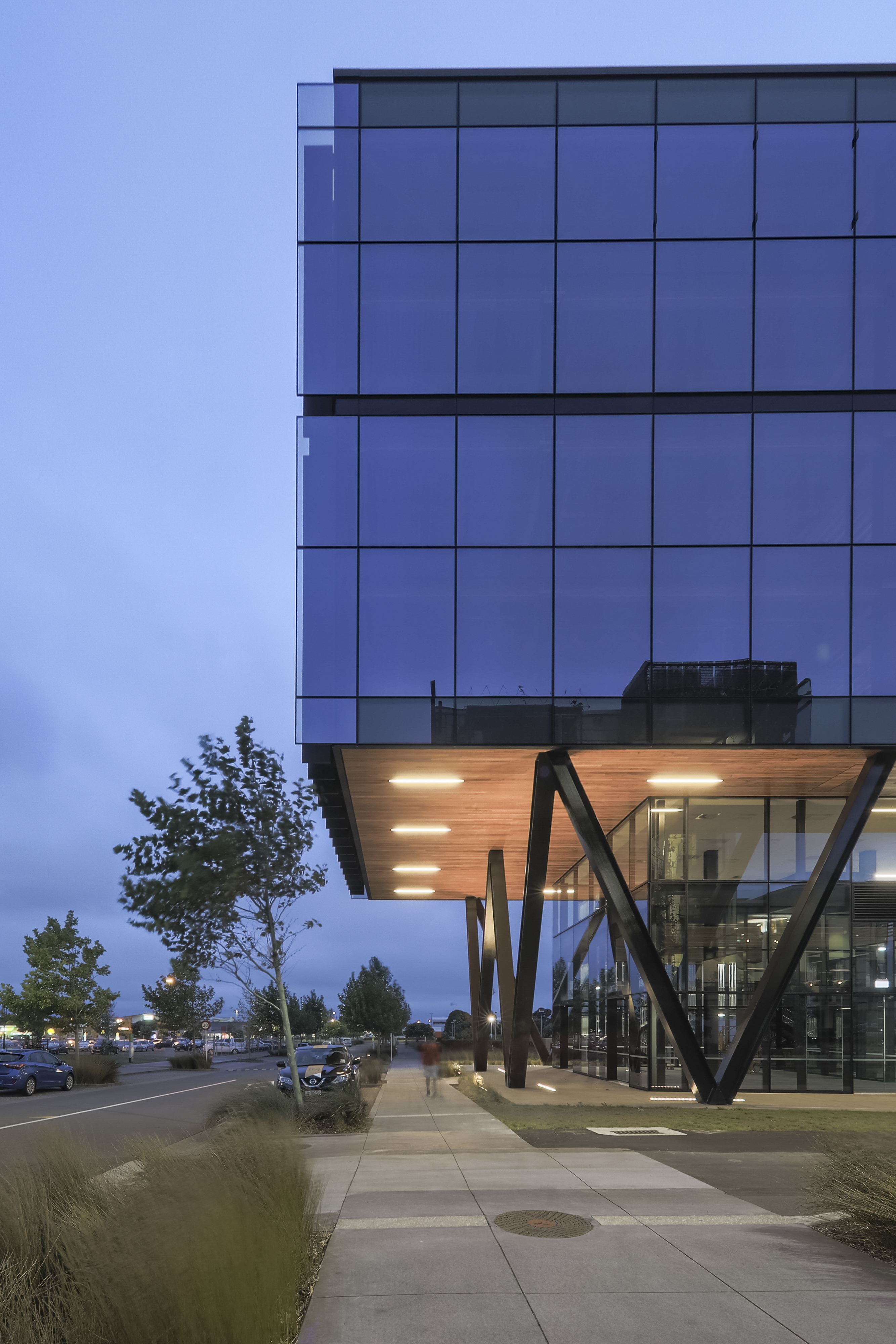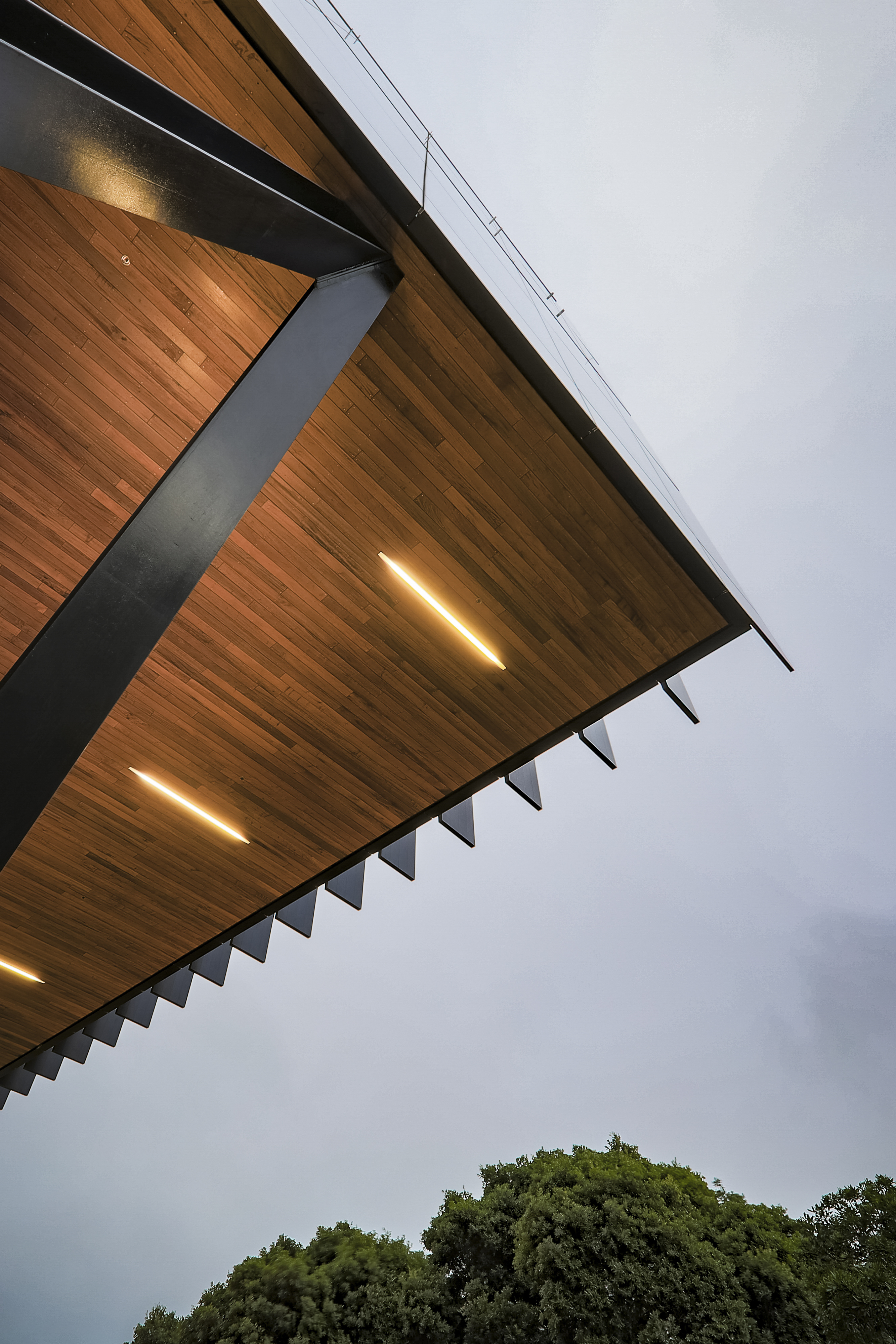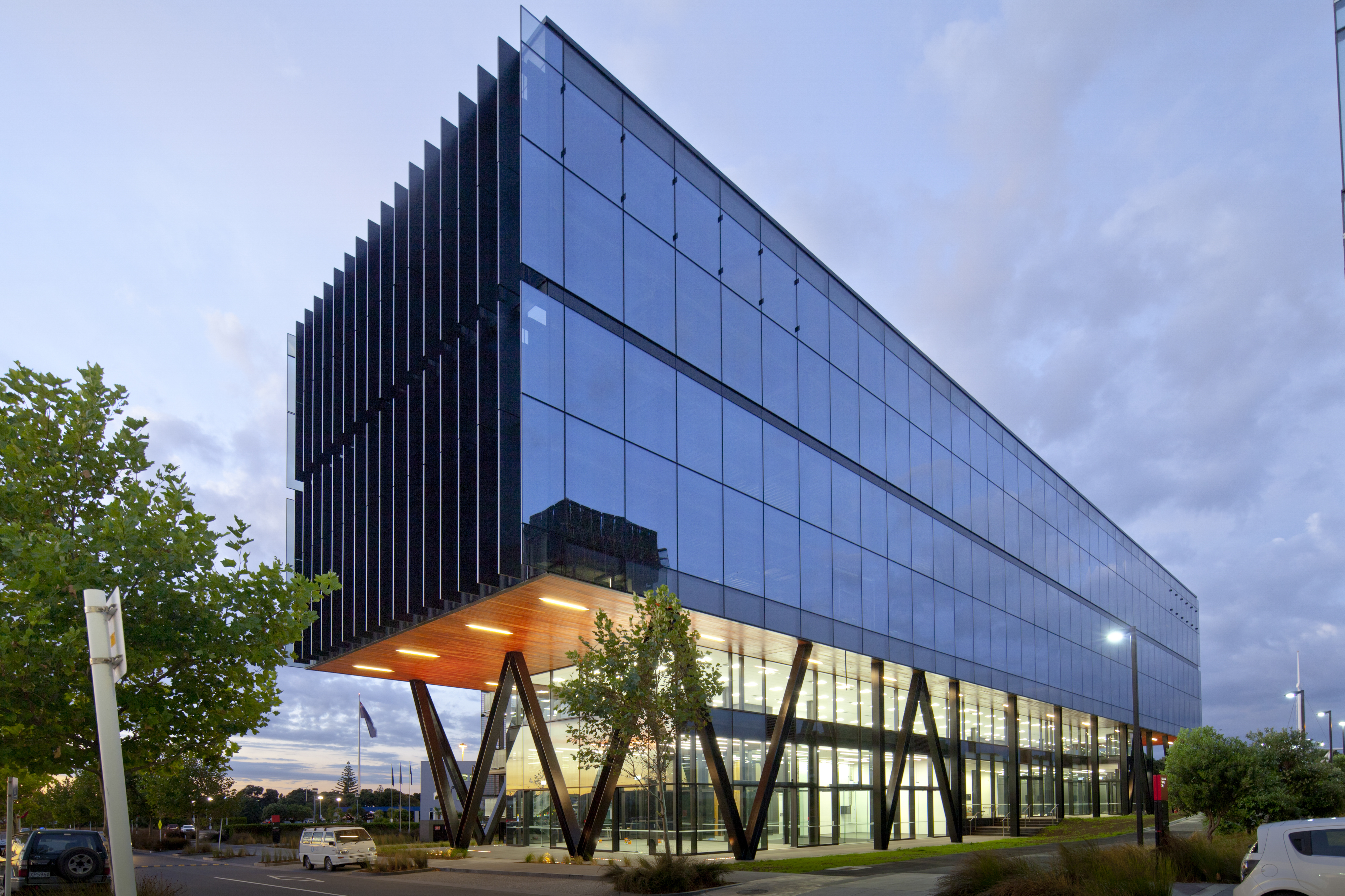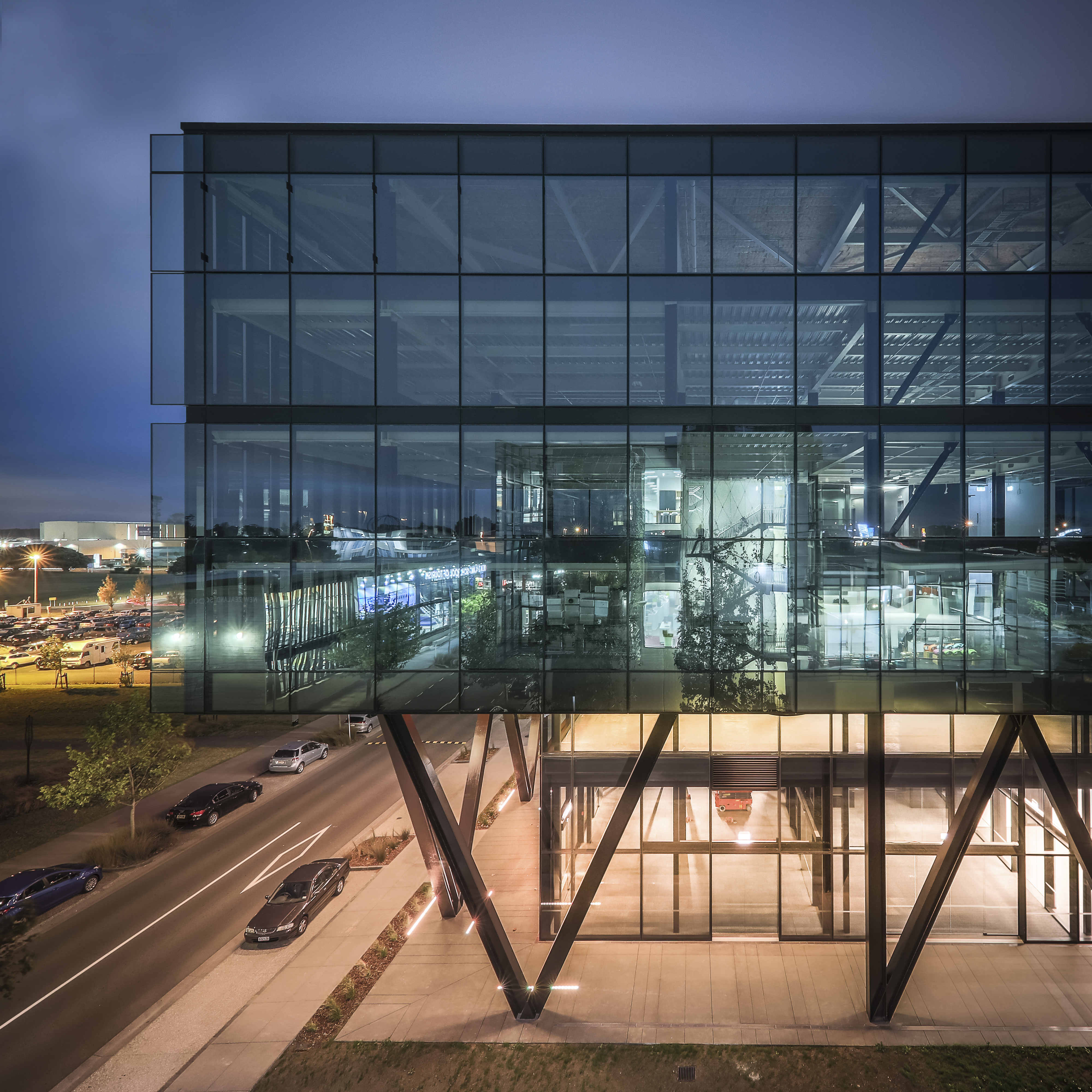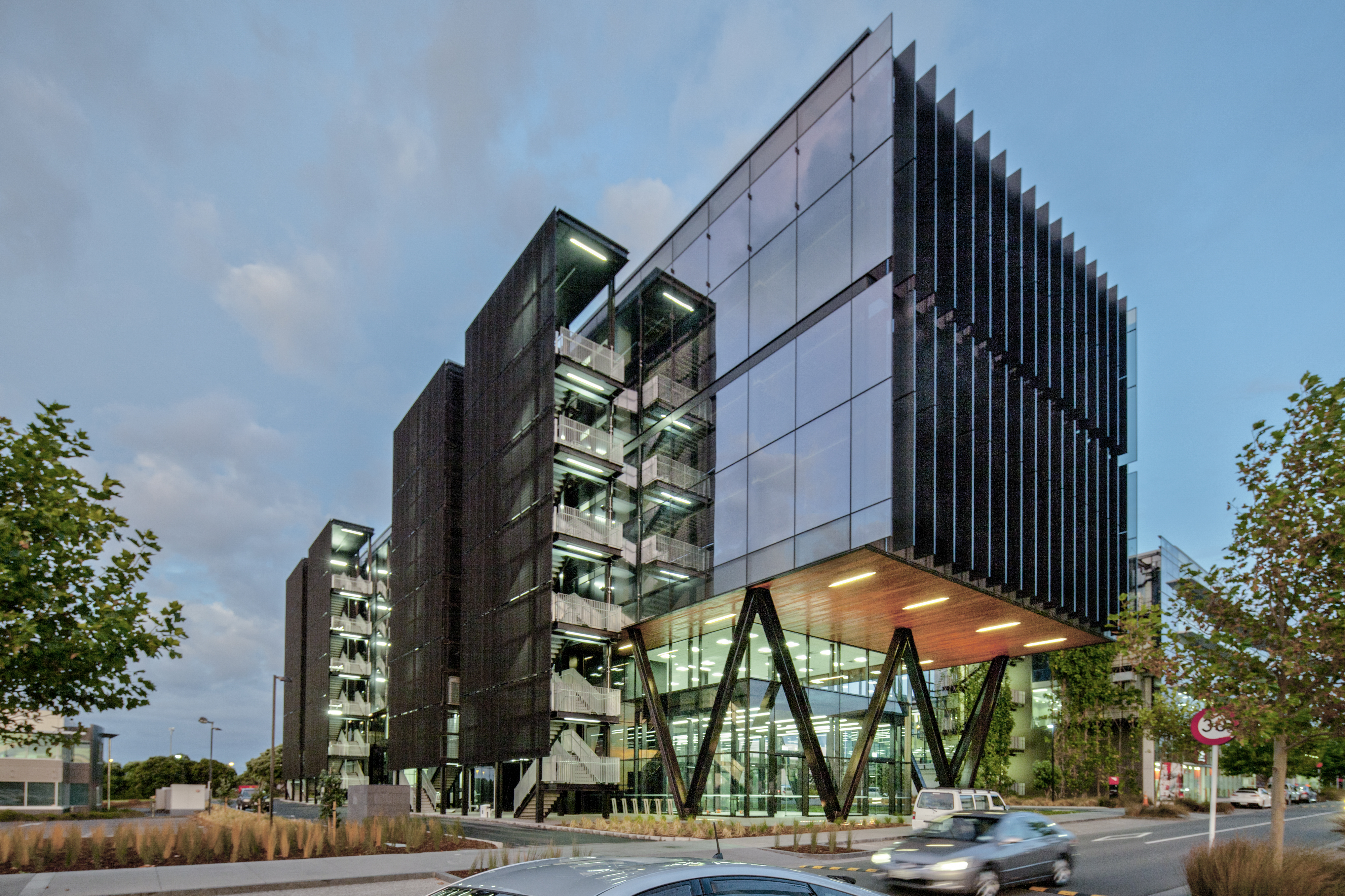 This floating, black, glazed box is a slick and smooth addition to a growing commercial and retail district near Auckland Airport. Open at both ends, and without a back, the elegant yet unapologetically commercial building is spatially generous to both users and pedestrians, and detailed with precision.