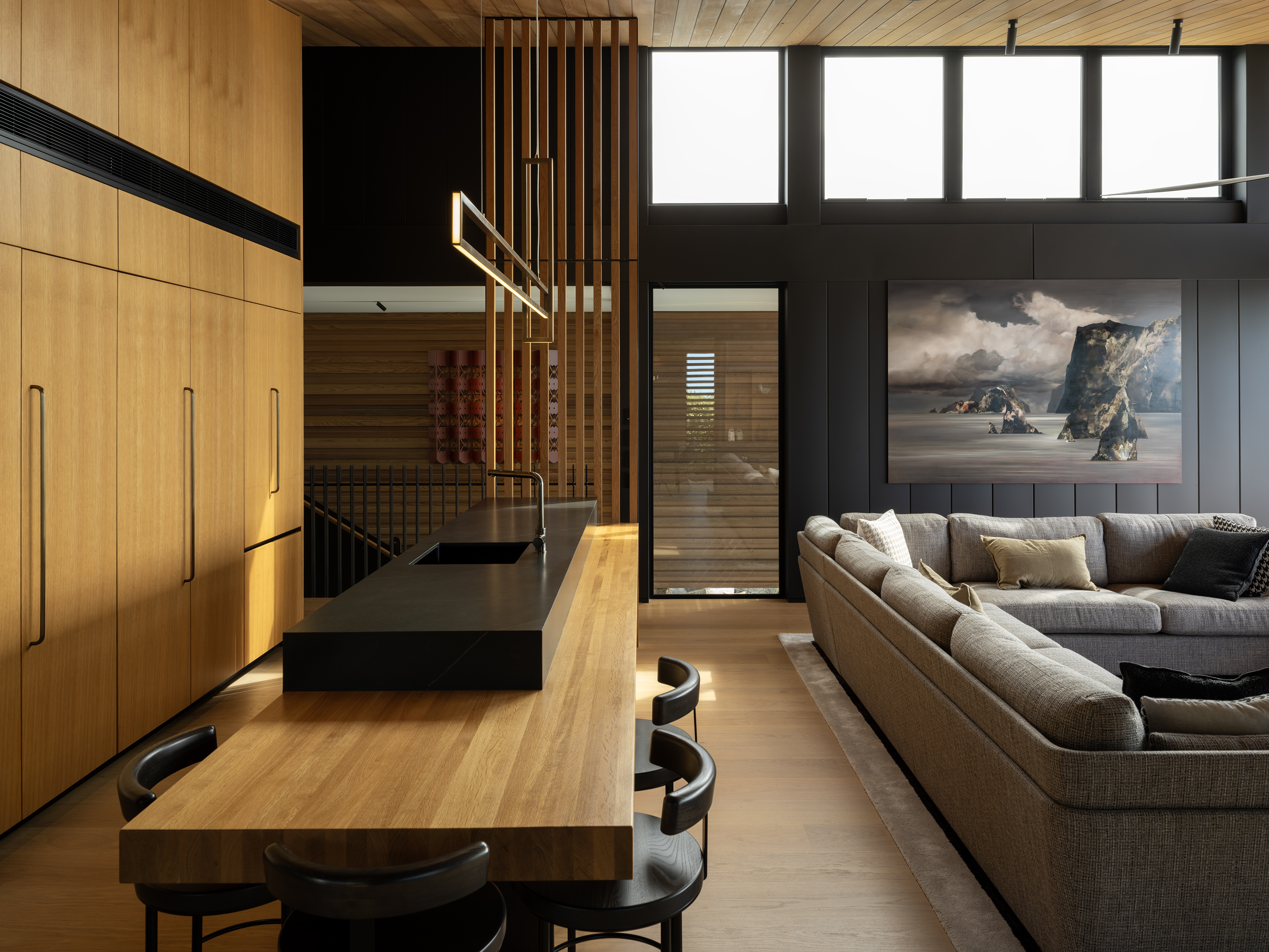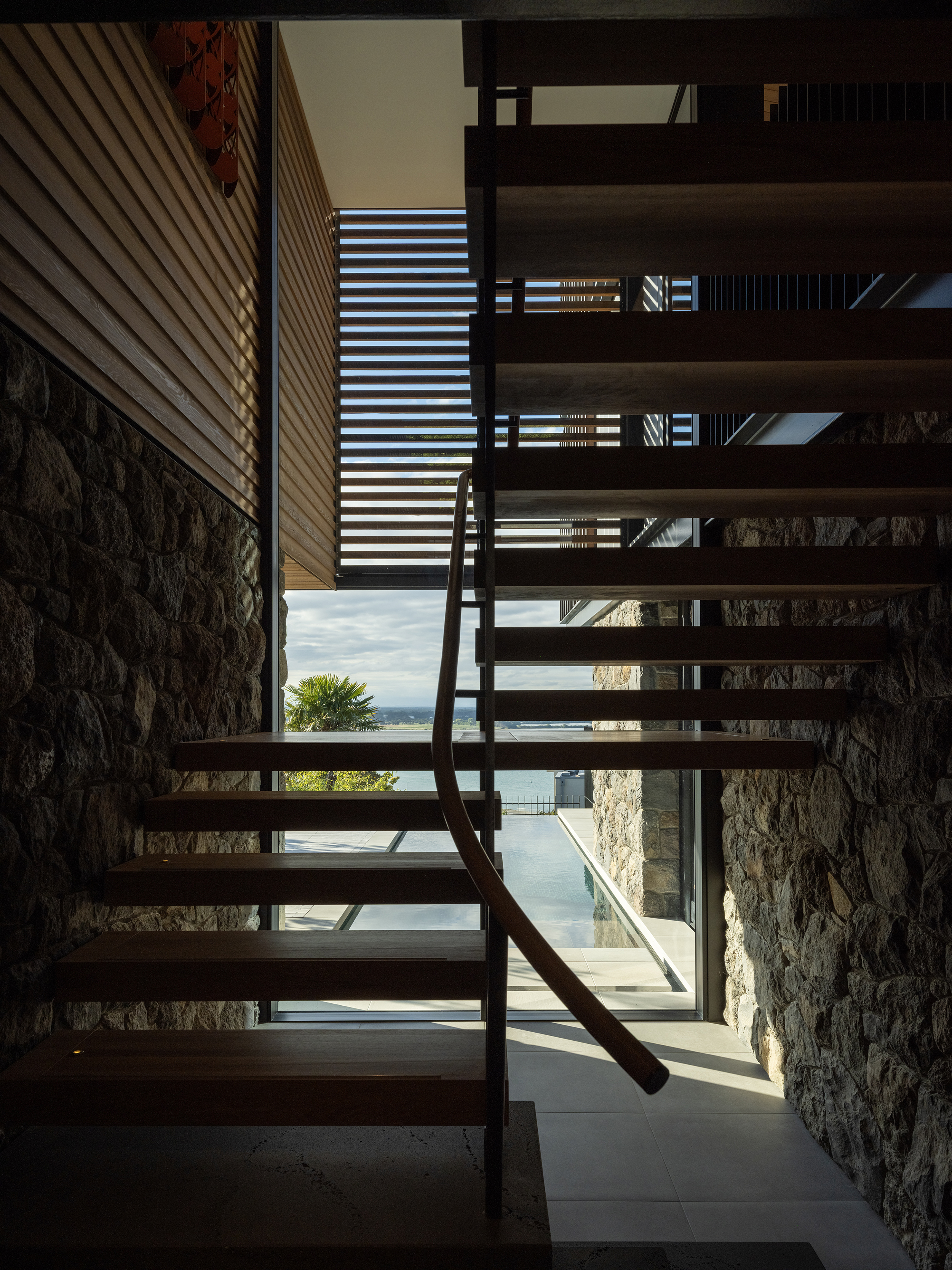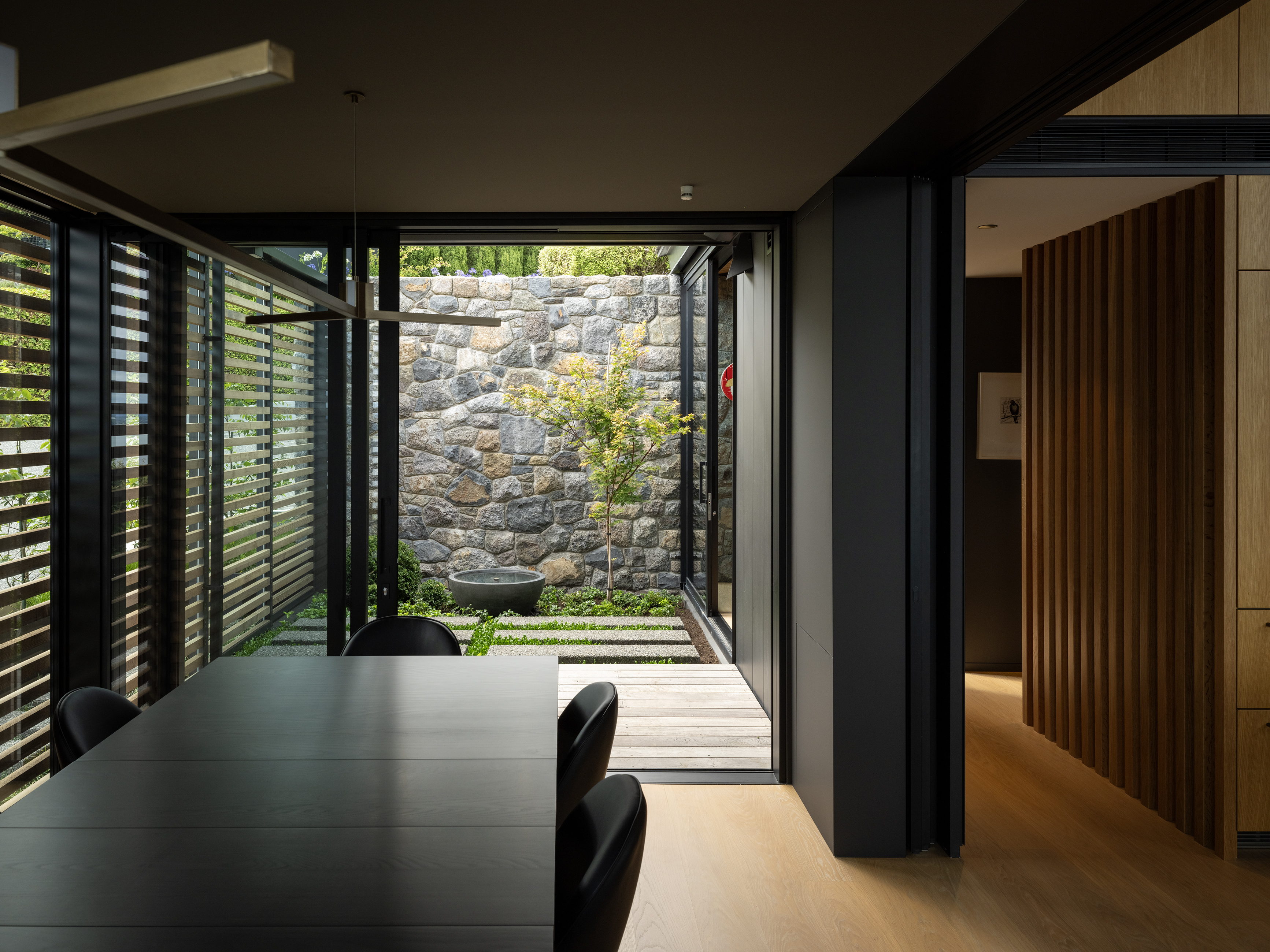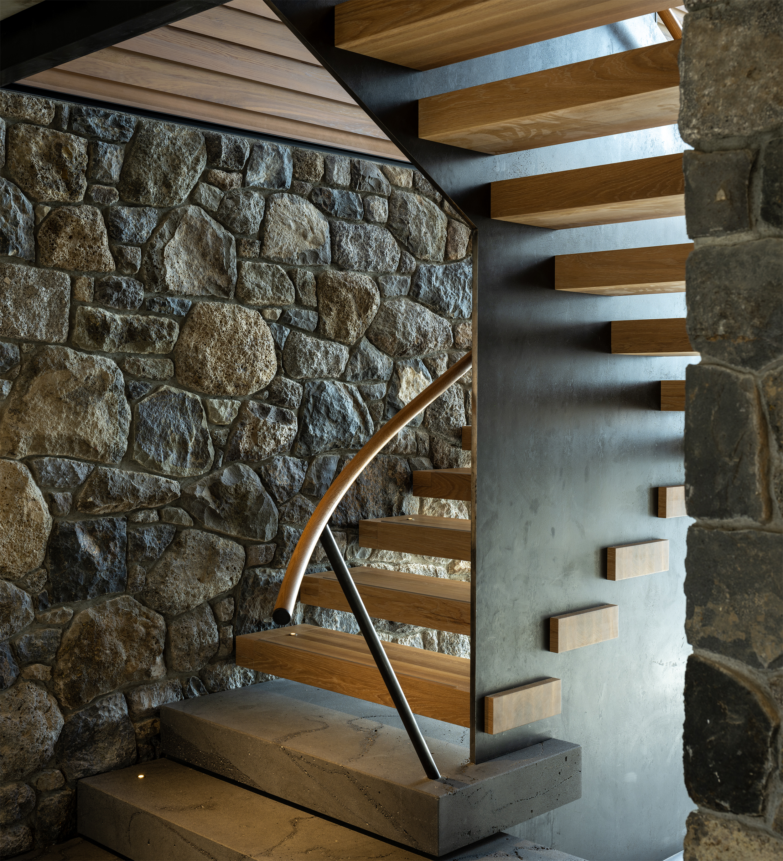This thoughtfully composed home is anchored to its site through the use of excavated volcanic rock. The restrained material palette and purposeful planning result in a sequence of connected, elegant spaces. Upon arrival, the view is intentionally concealed, then revealed through a central stair that separates living, sleeping, and service areas. A series of fixed and sliding screens manage light, privacy, and solar gain with finesse. Outdoor terraces and courtyards extend the interior into the landscape, creating a seamless dialogue between inside and out, and a living experience shaped by material integrity and spatial clarity.