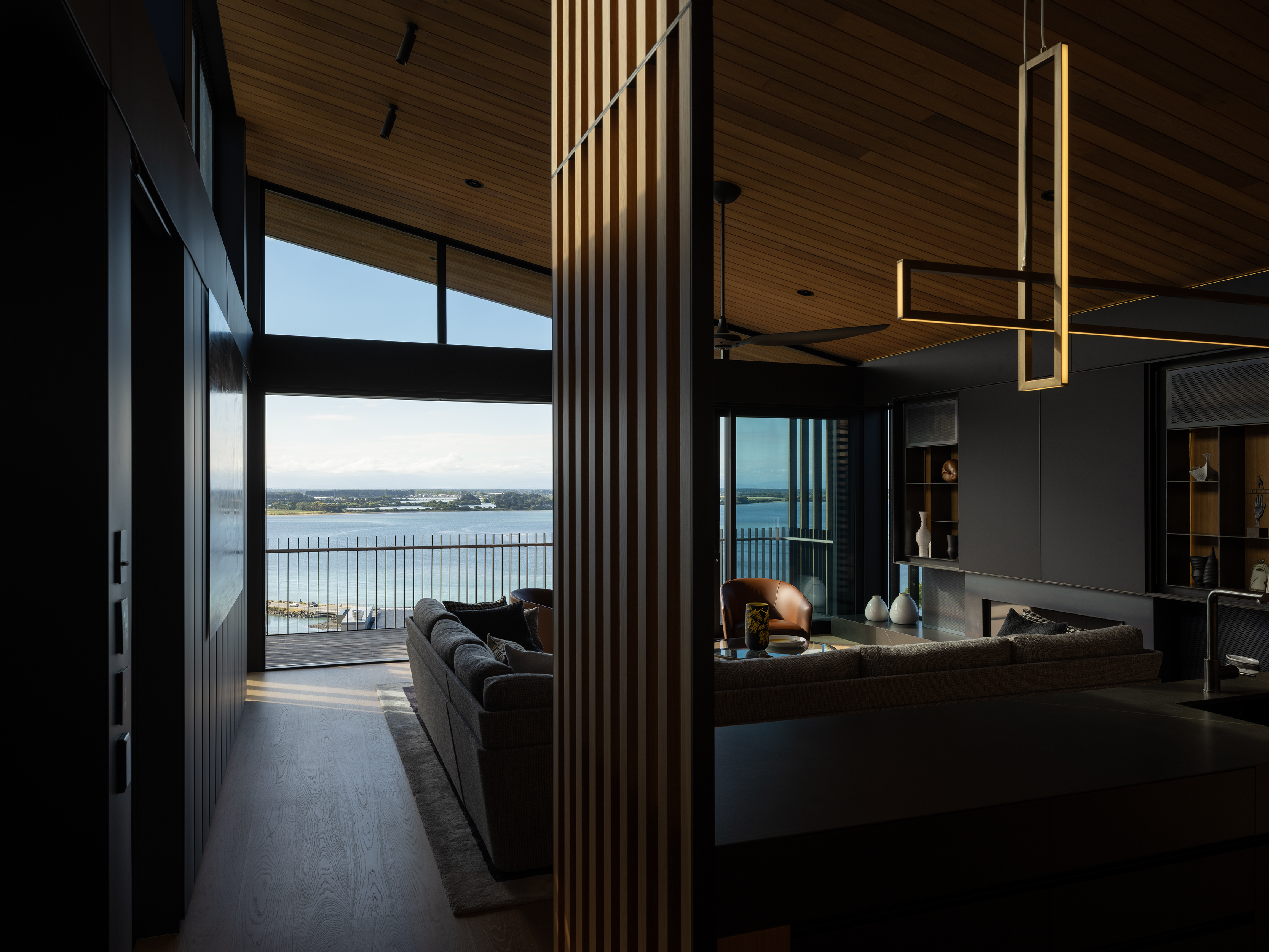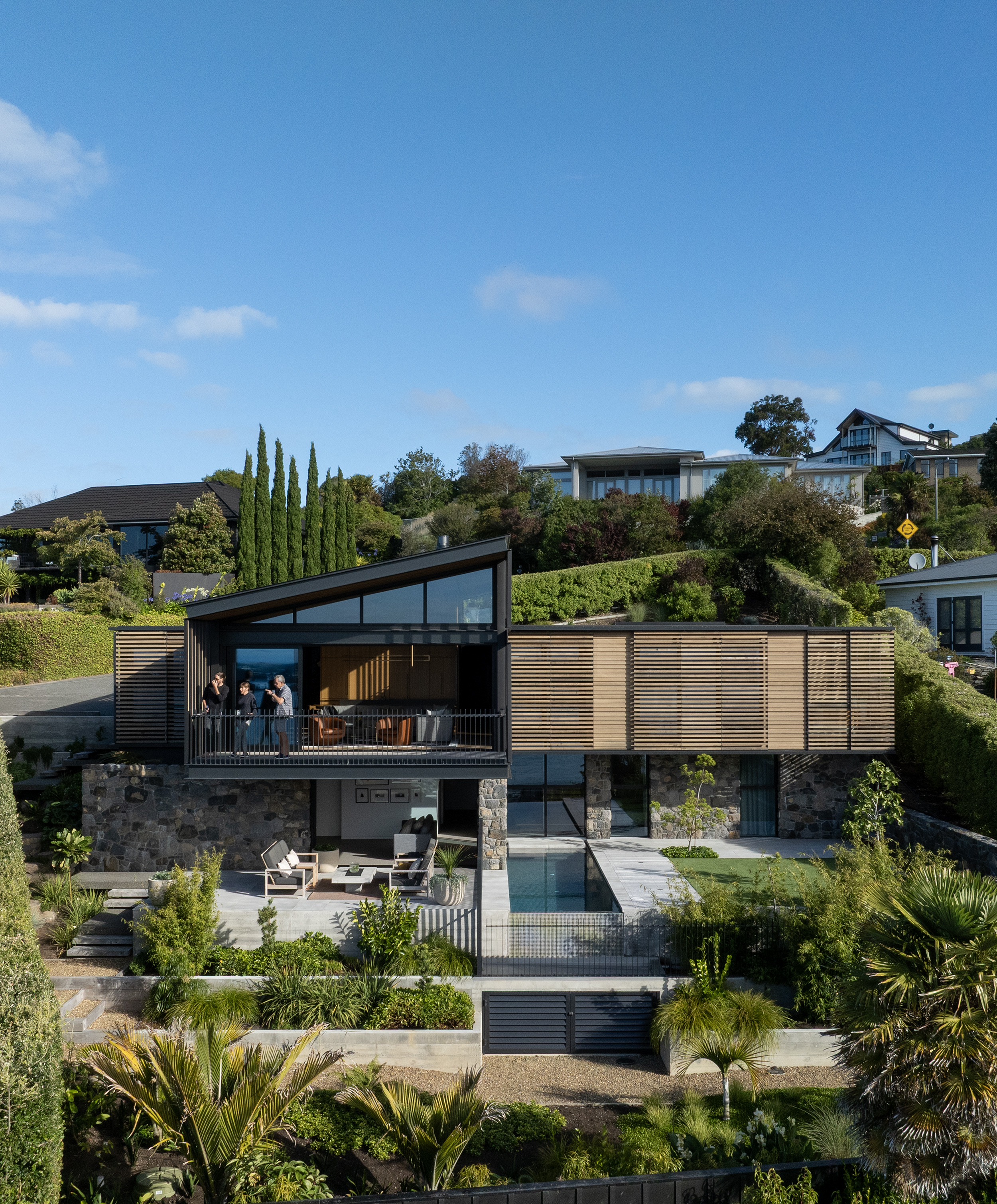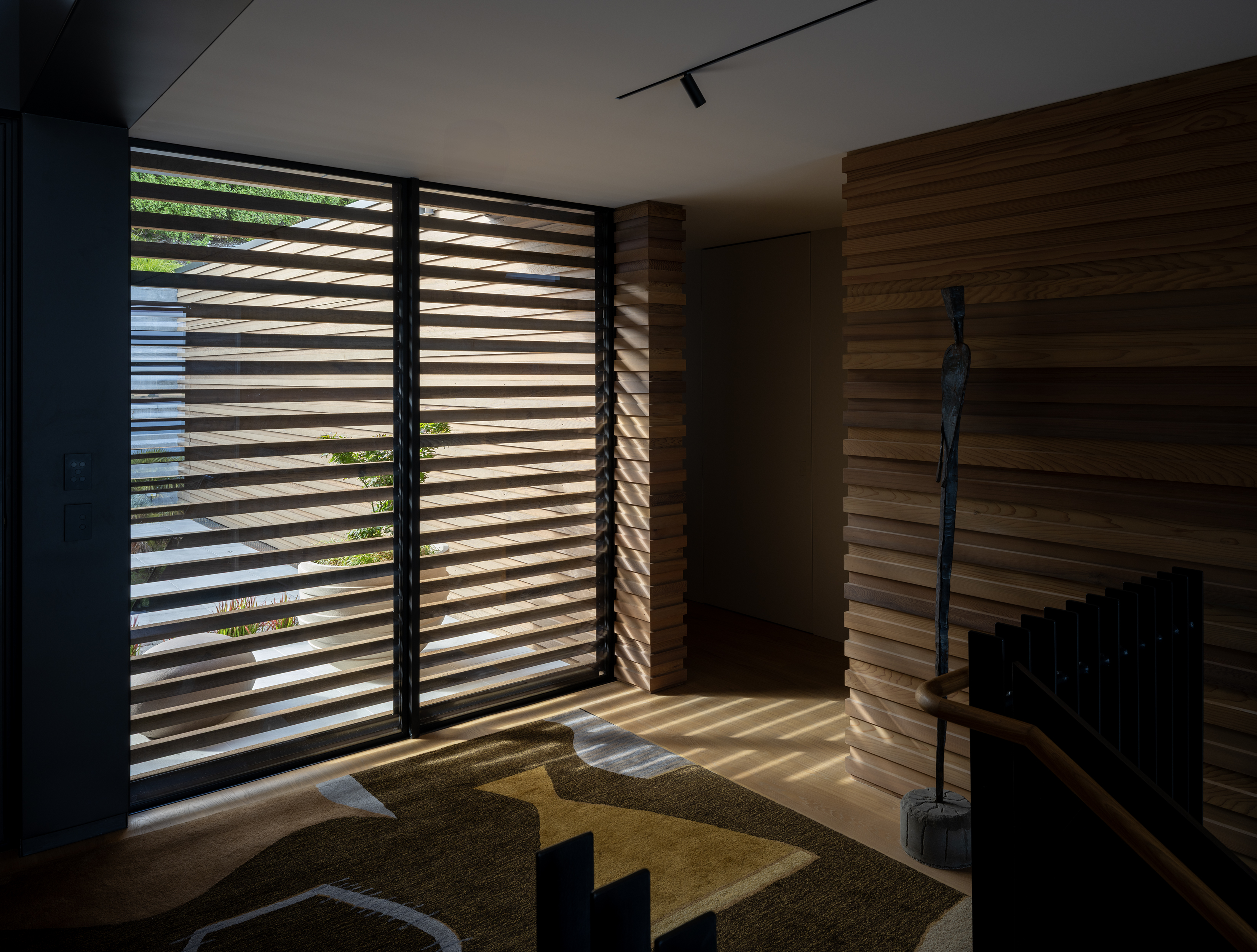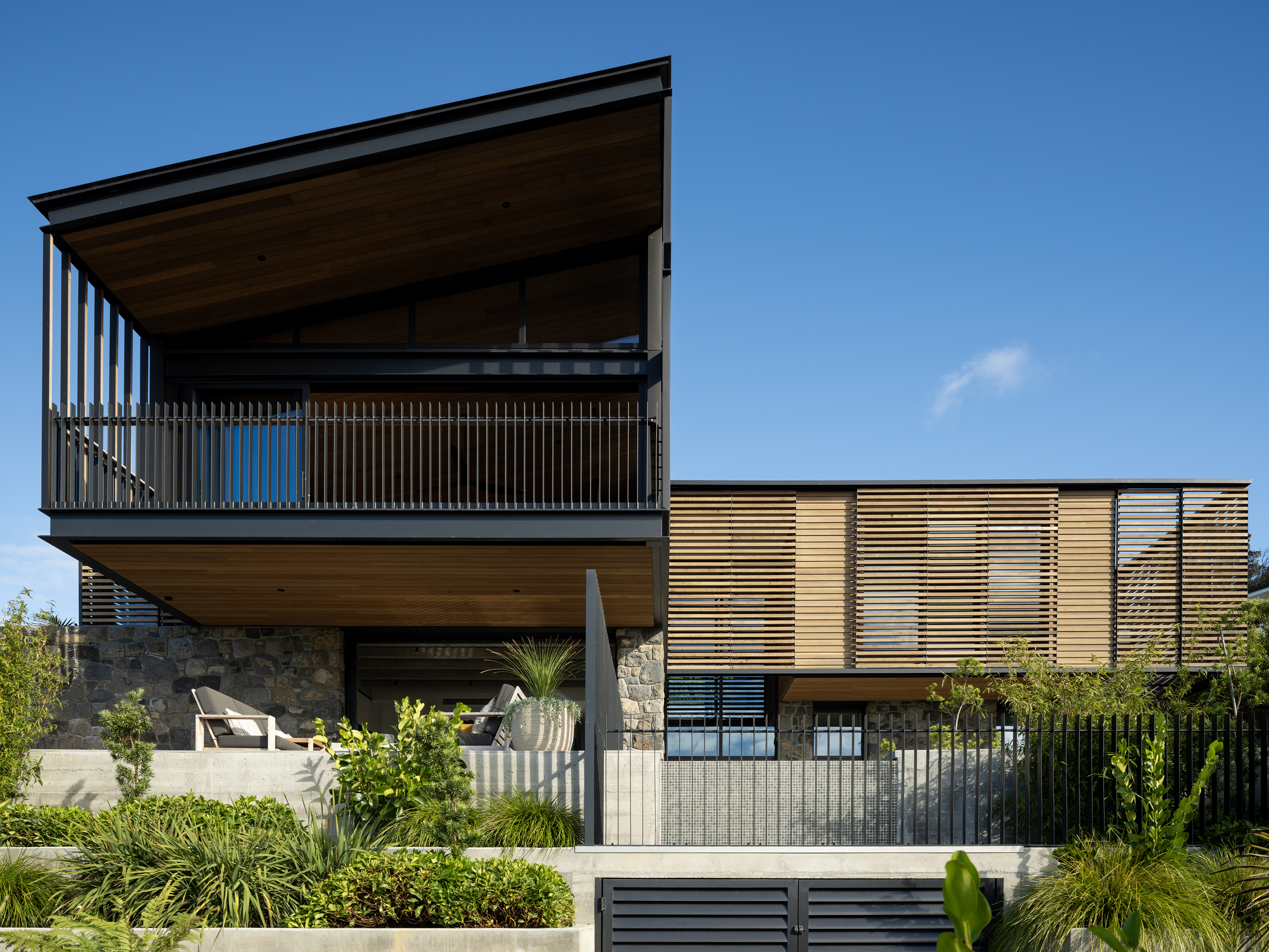 This thoughtfully composed home is anchored to its site through the use of excavated volcanic rock. The restrained material palette and purposeful planning result in a sequence of connected, elegant spaces. Upon arrival, the view is intentionally concealed, then revealed through a central stair that separates living, sleeping, and service areas. A series of fixed and sliding screens manage light, privacy, and solar gain with finesse. Outdoor terraces and courtyards extend the interior into the landscape, creating a seamless dialogue between inside and out, and a living experience shaped by material integrity and spatial clarity.