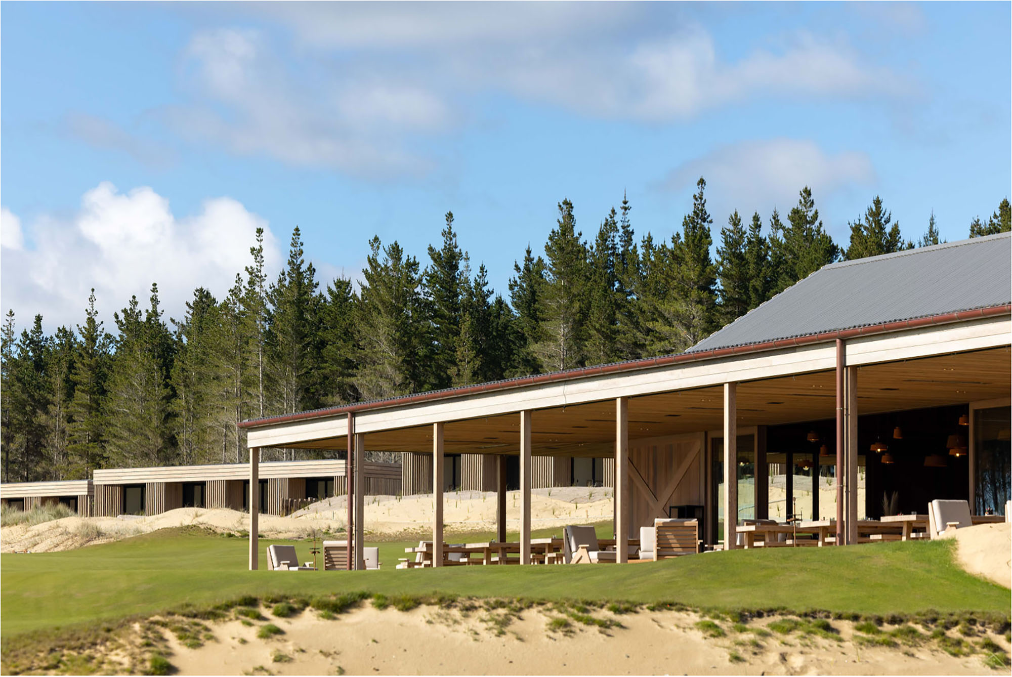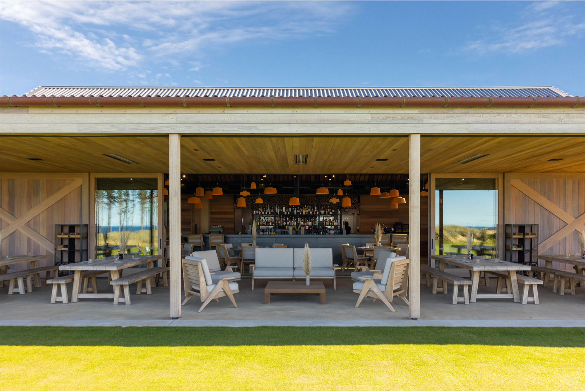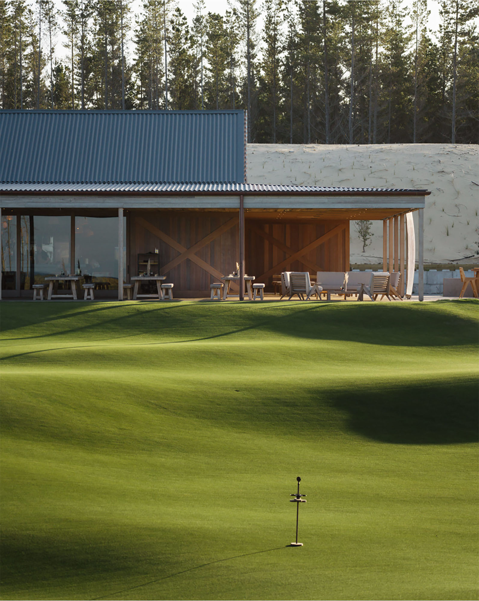 Quietly unassuming under a corrugate mantle, Ric’s café is a treat. Strong and simple timber construction and details evoke a contemporary coastal-rural vernacular. Carefully sited in the dunes adjacent to Te Arai Links golf course, the café overlooks the 12-hole putting green, beyond the beach to Taranga and Marotiri islands. This is quintessential New Zealand, but beautifully elevated. Irving has created a facility at once rugged and sophisticated, with his use of exquisitely detailed oversized elements: cedar barn doors, six-metre-deep verandahs, steel bar and copper pizza oven. The polished concrete floor reads as large-format tiles. Befitting the development’s ethos, the café optimises the highly attractive coastal setting without overpowering the natural landscape character.
