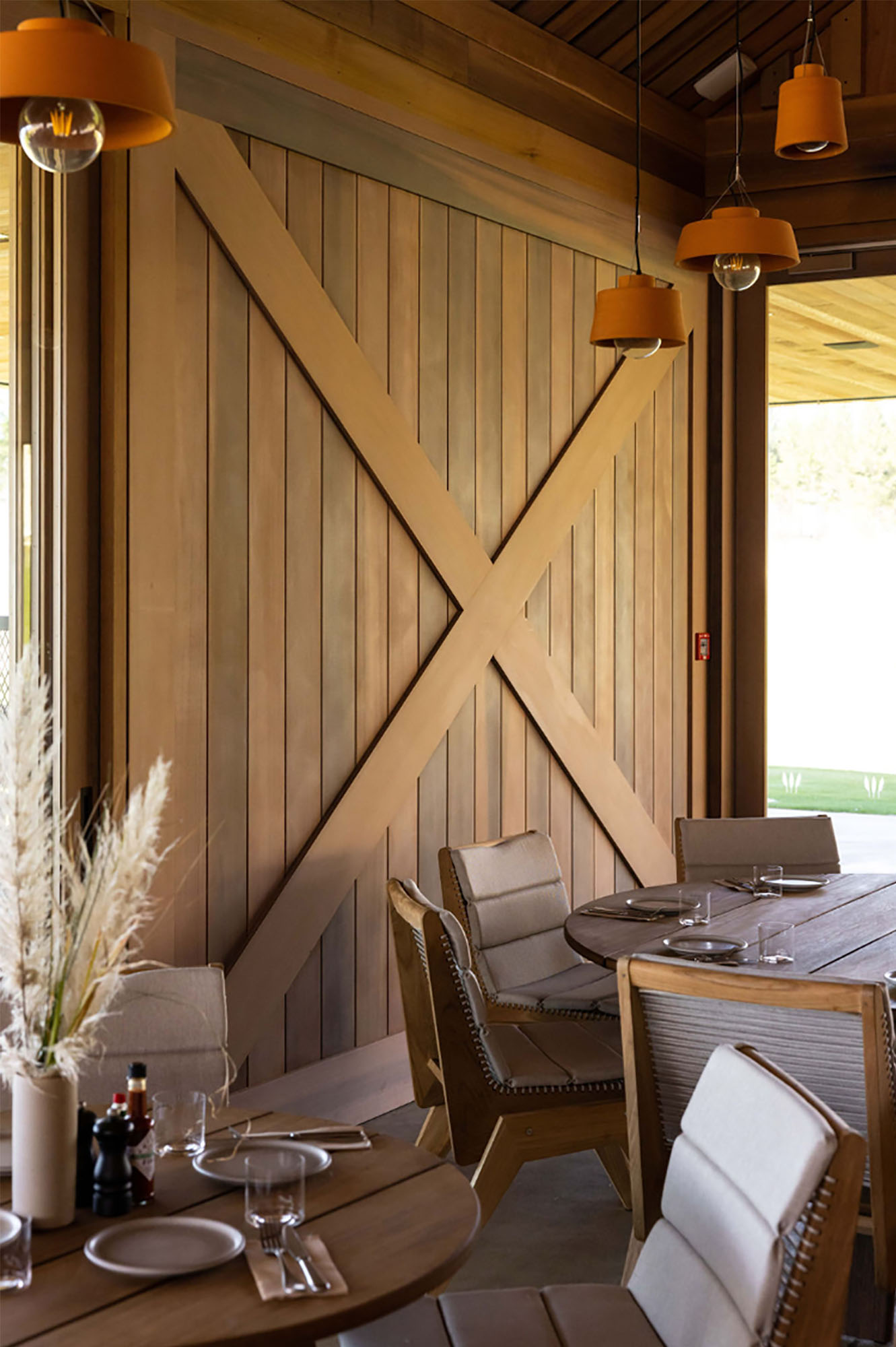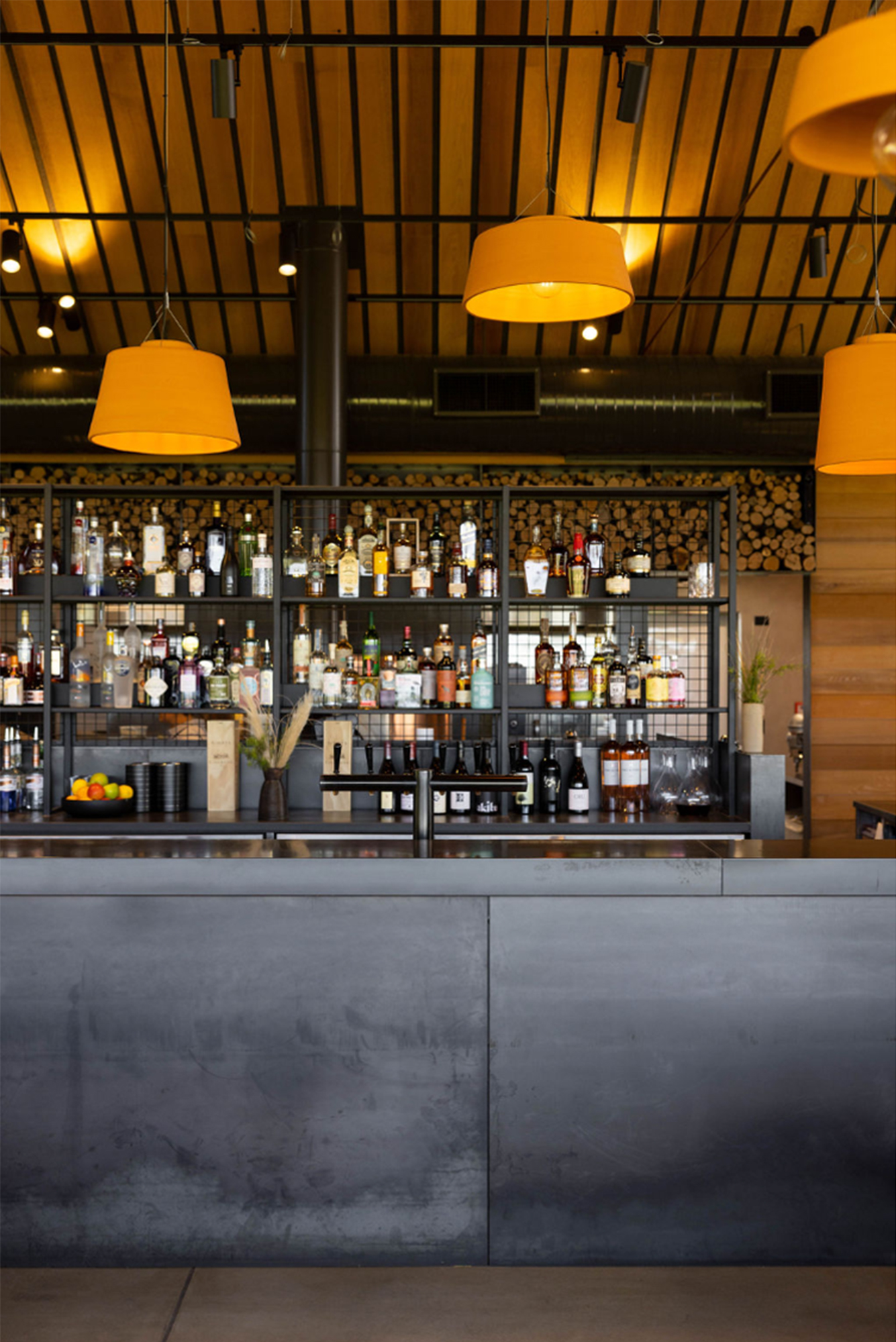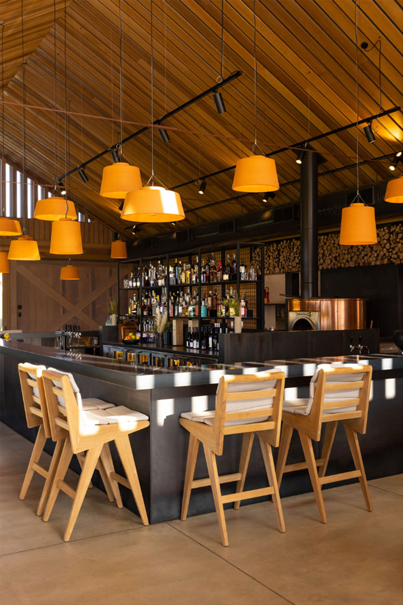 Quietly unassuming under a corrugate mantle, Ric’s café is a treat. Strong and simple timber construction and details evoke a contemporary coastal-rural vernacular. Carefully sited in the dunes adjacent to Te Arai Links golf course, the café overlooks the 12-hole putting green, beyond the beach to Taranga and Marotiri islands. This is quintessential New Zealand, but beautifully elevated. Irving has created a facility at once rugged and sophisticated, with his use of exquisitely detailed oversized elements: cedar barn doors, six-metre-deep verandahs, steel bar and copper pizza oven. The polished concrete floor reads as large-format tiles. Befitting the development’s ethos, the café optimises the highly attractive coastal setting without overpowering the natural landscape character.