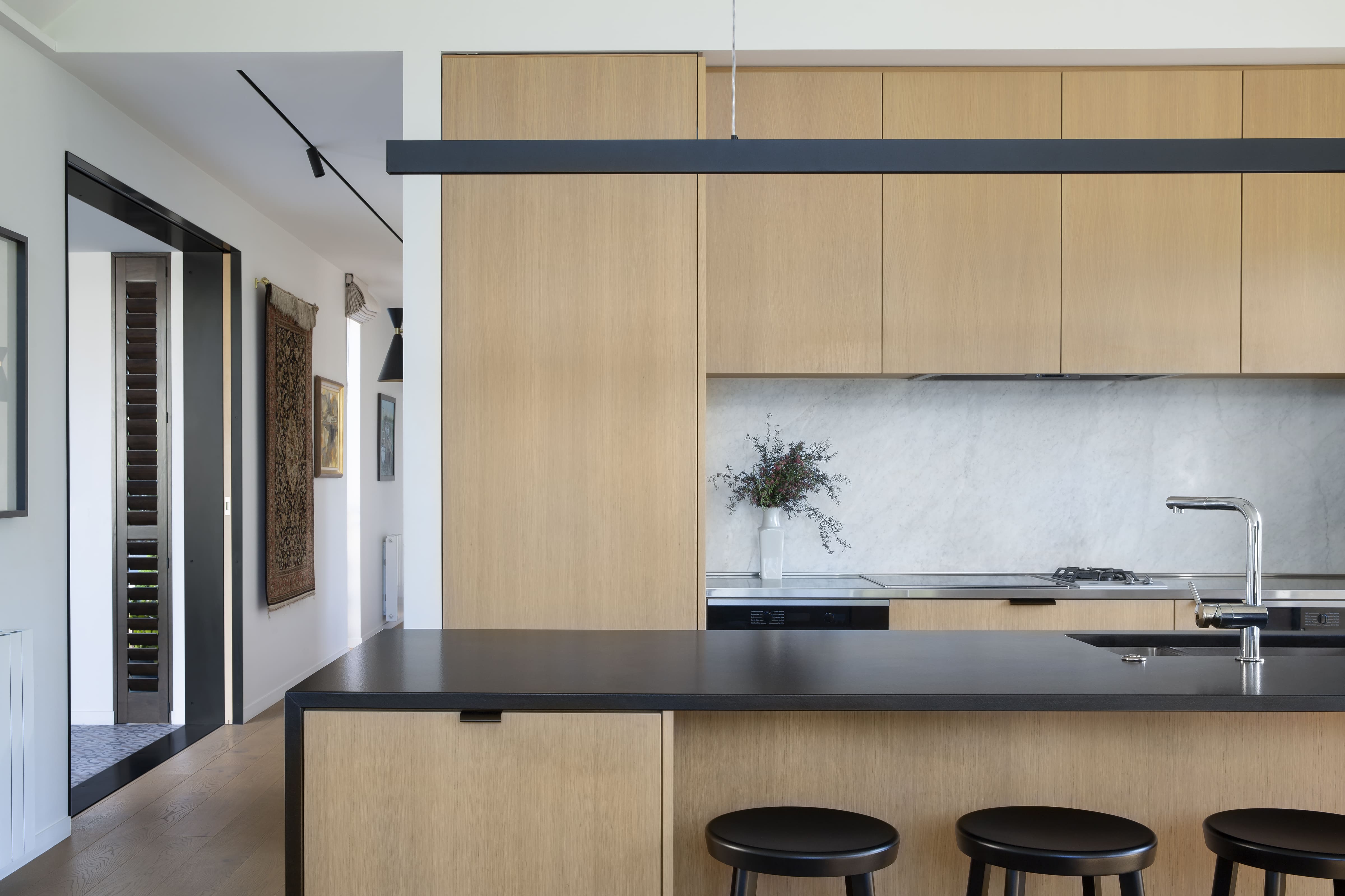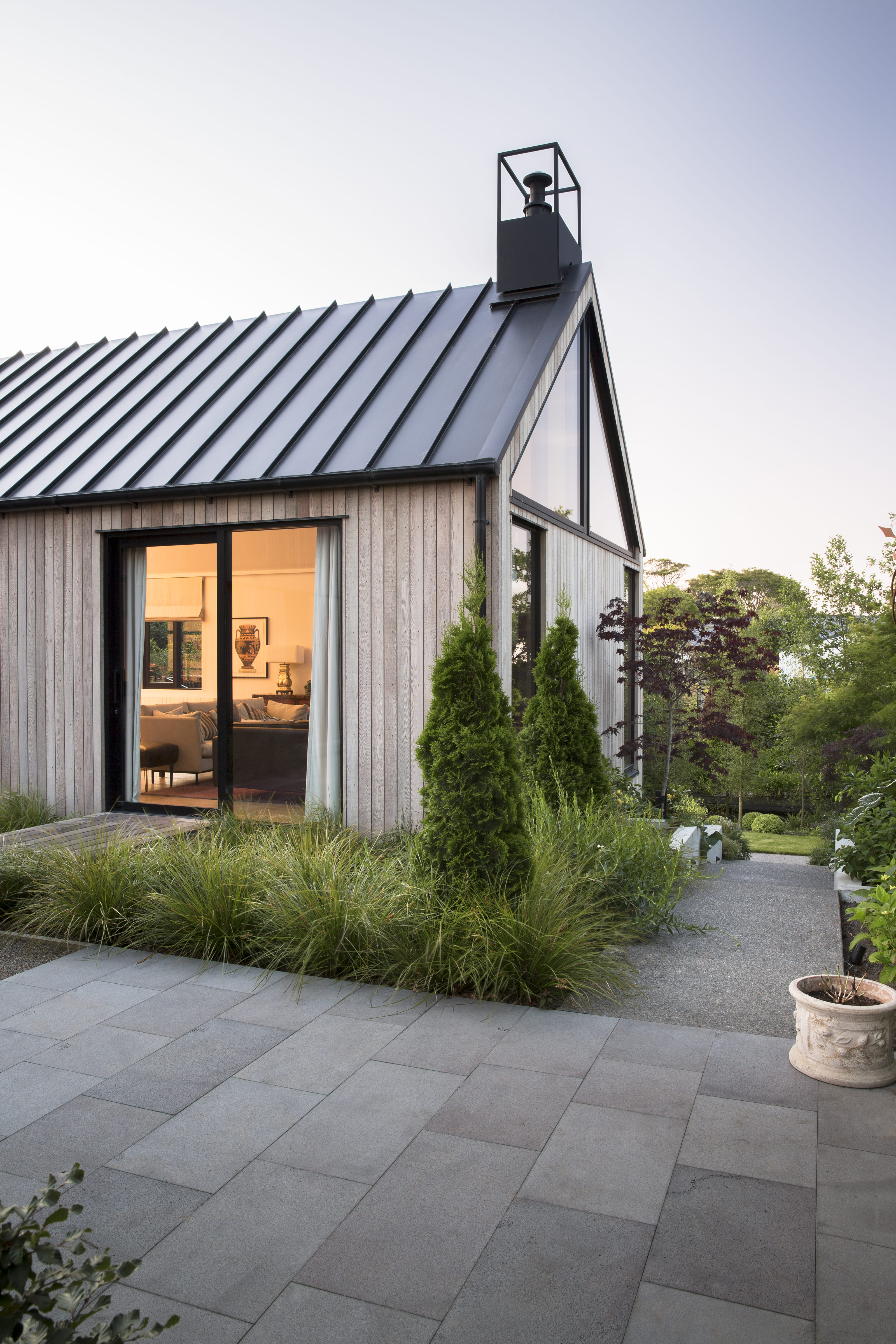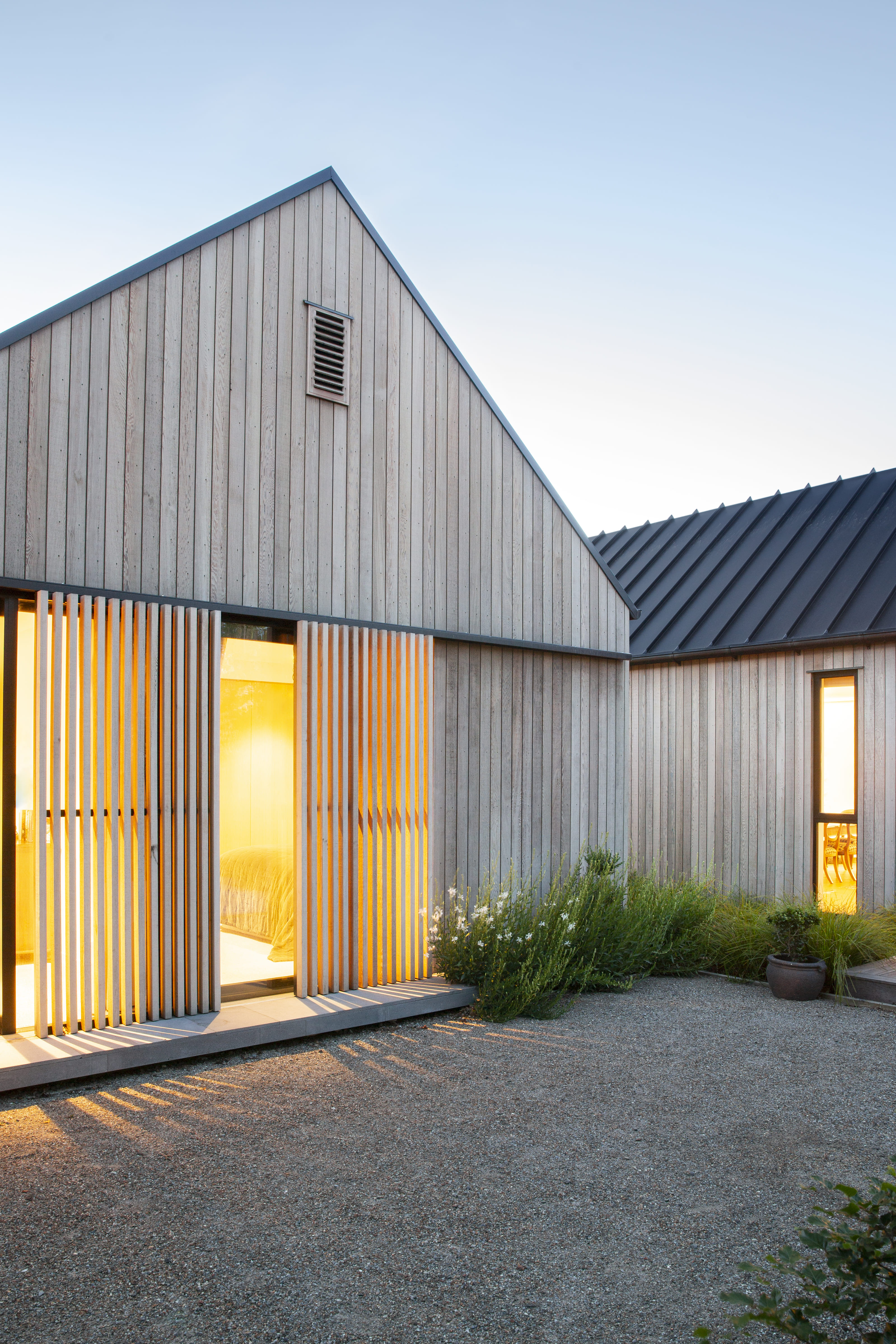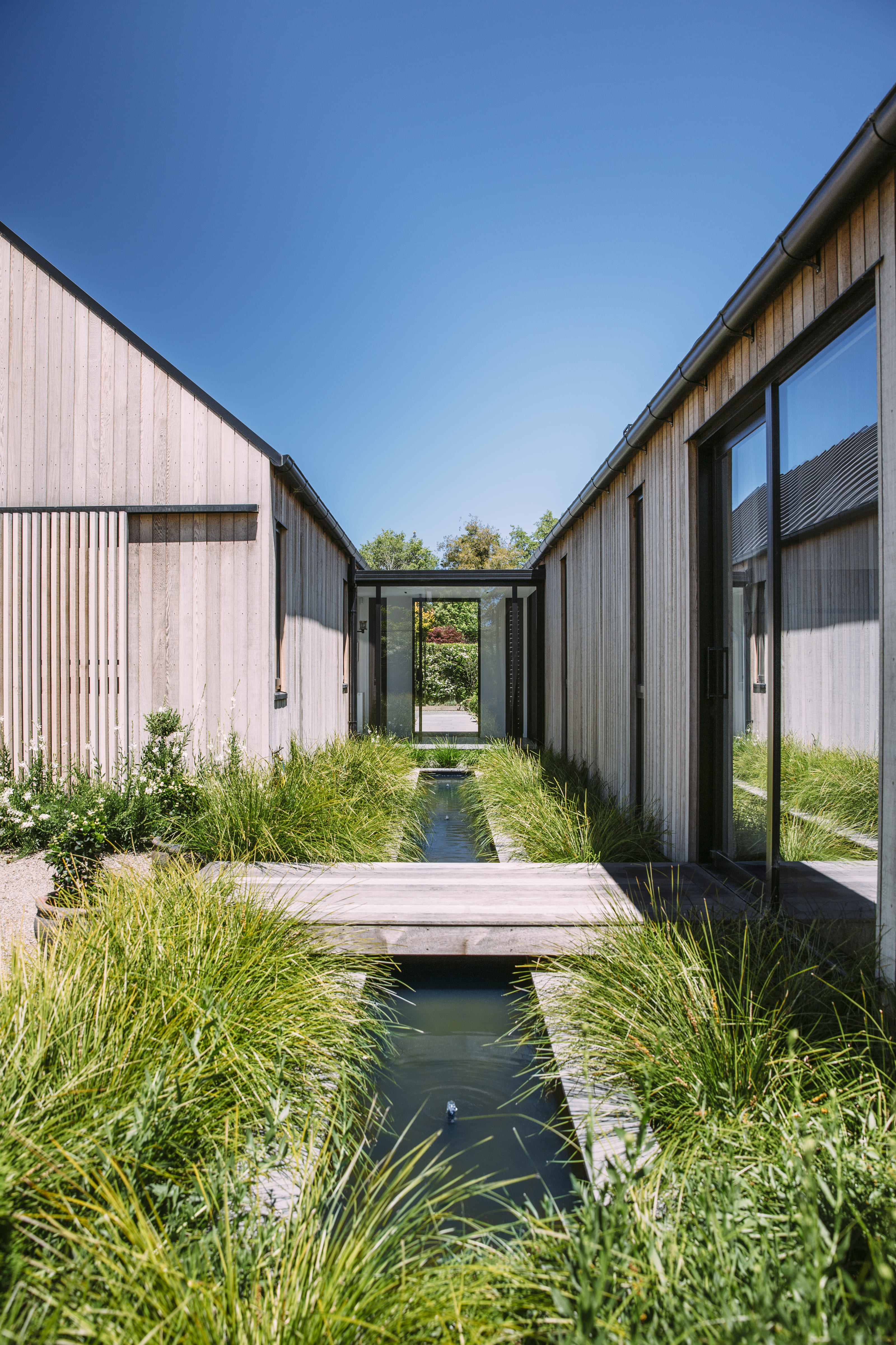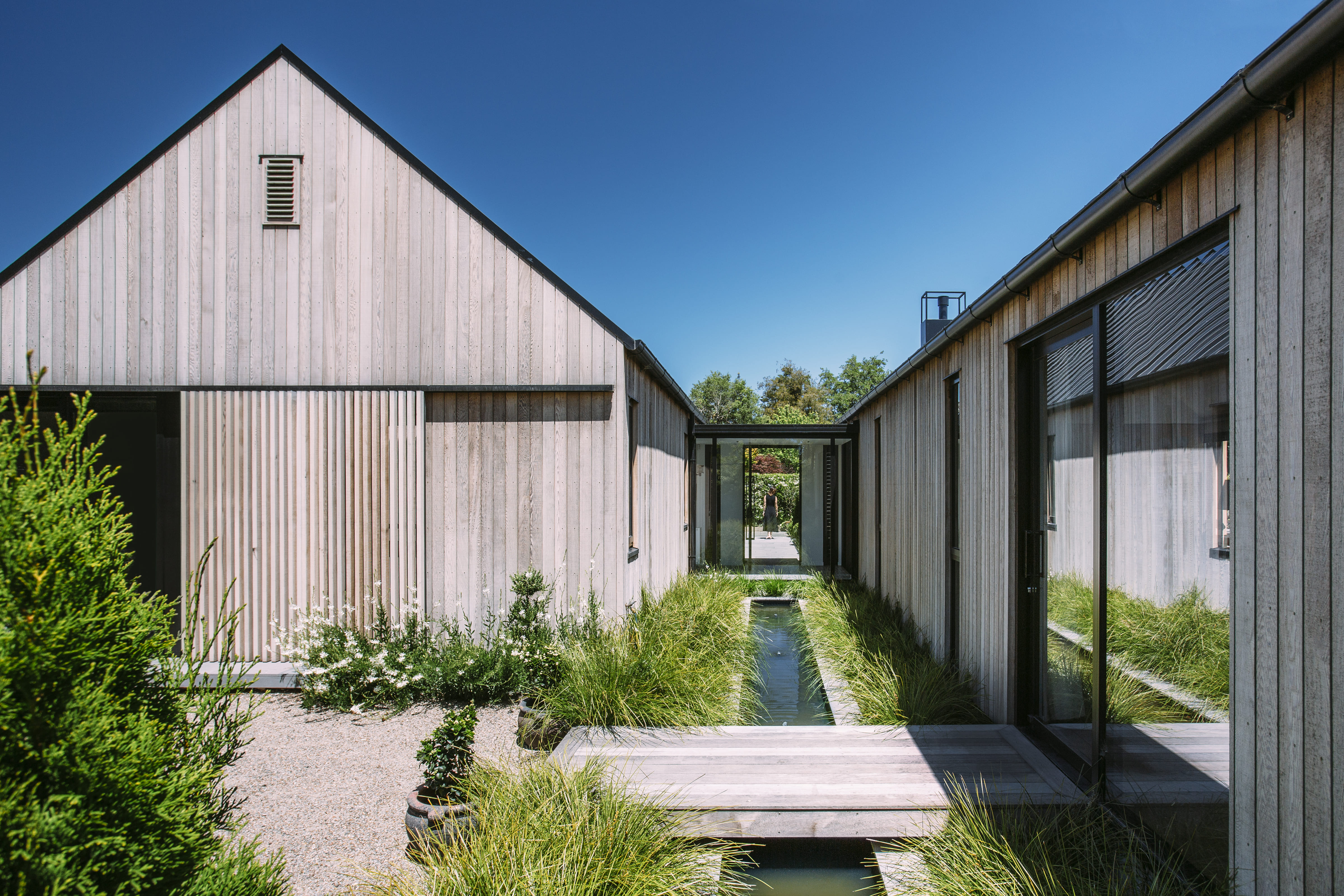 A private, rear section alongside the Wairarapa Stream provides a tranquil setting for this serene new home. Two offset gabled forms, joined by a glazed entranceway, create a connection to the stream environment to the west and a garden courtyard to the north, ensuring its owners have multiple options for entertaining, relaxing, and gardening. The natural cedar exterior complements the home’s riparian setting, while large, slatted sliders allow owners to close-off-from, or open-out-to their green surrounds at different times of day, or year. With a high standard of design detailing, material use and moments of surprise within, the architect has created a relaxing, calm and warm home for his clients to enjoy.